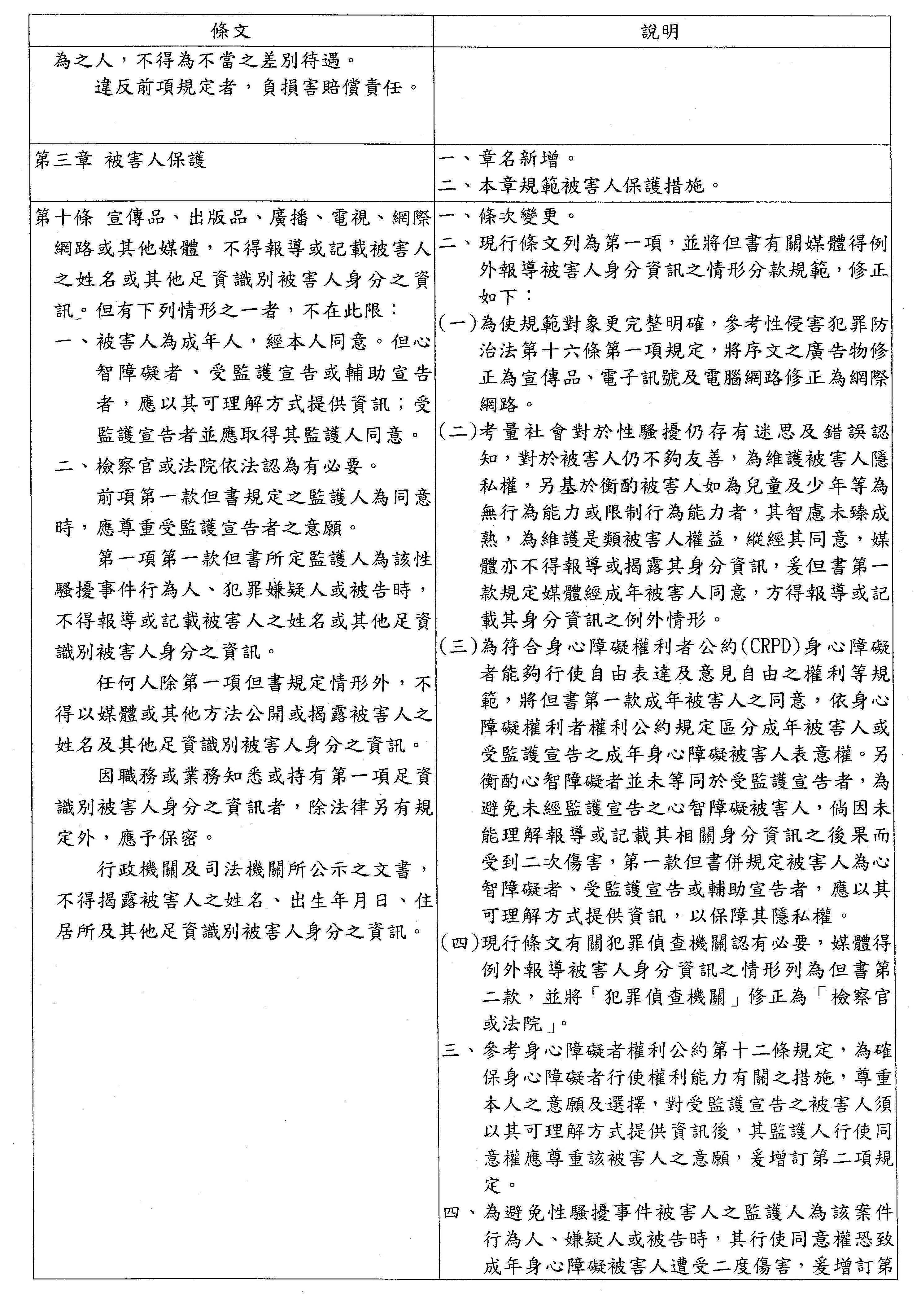 第 十 條 宣傳品、出版品、廣播、電視、網際網路或其他媒體,不得報導或記載被害人之姓名或其他足資識別被害人身分之資訊。但有下列情形之一者,不在此限: