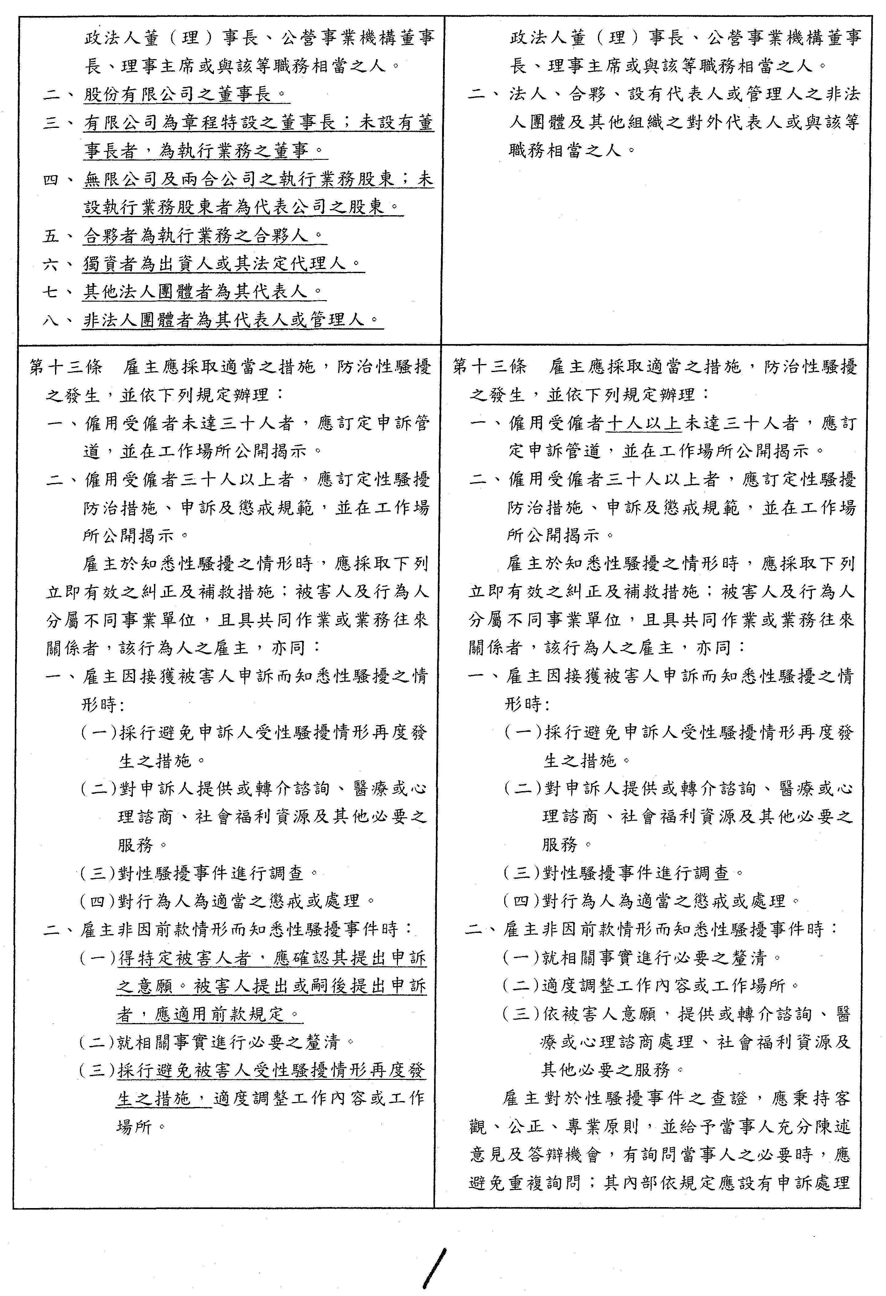 陳委員椒華:謝謝院長,關於第十三條時力之前的修正意見,今天我們也有提修正動議,我們的意見不知道可不可以參採?主要包括第一項的部分,針對採取適當措施防治性騷擾發生,還有僱用受僱者十人以上,請問有修正了嗎?是不是都改成三十人以下?