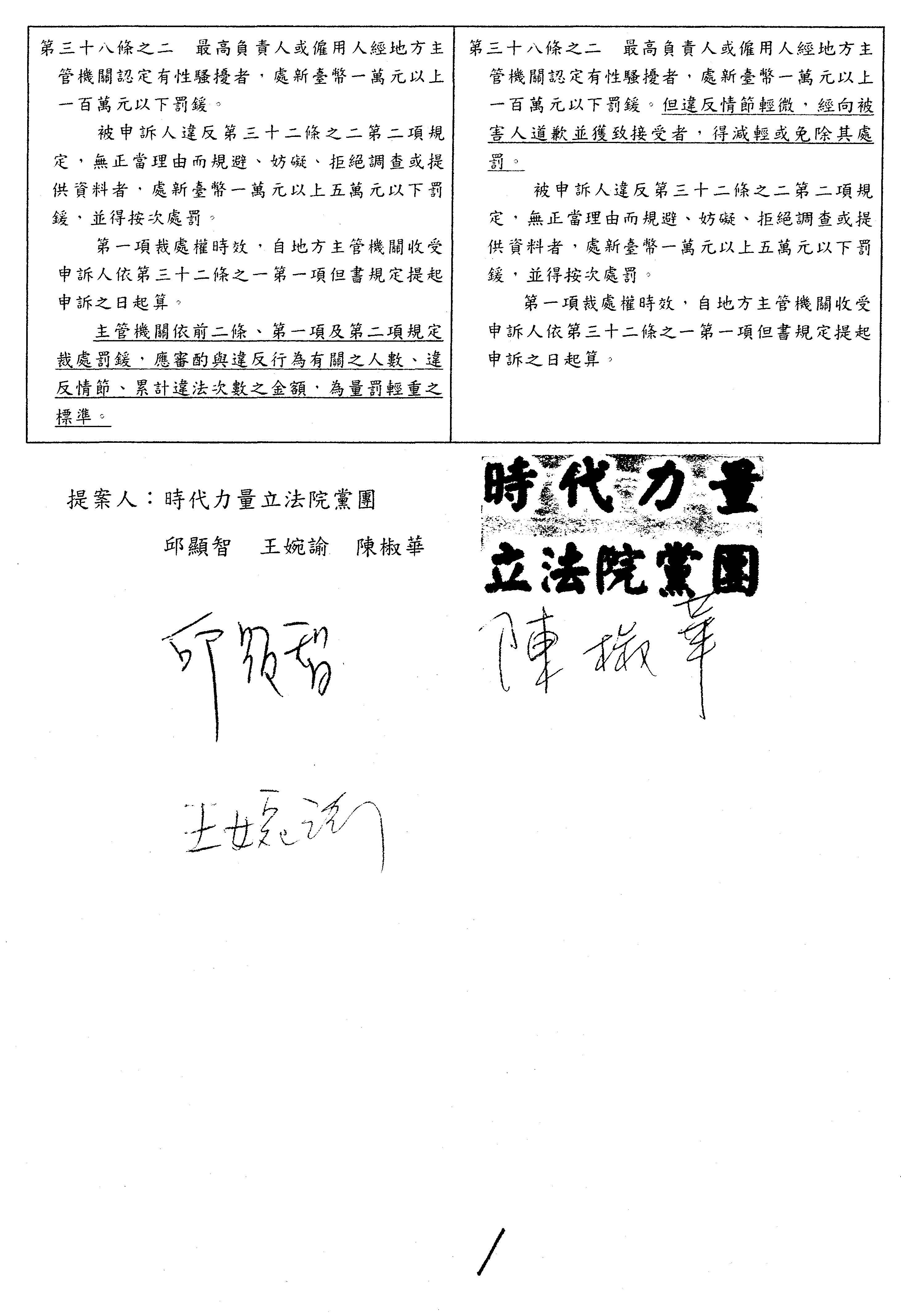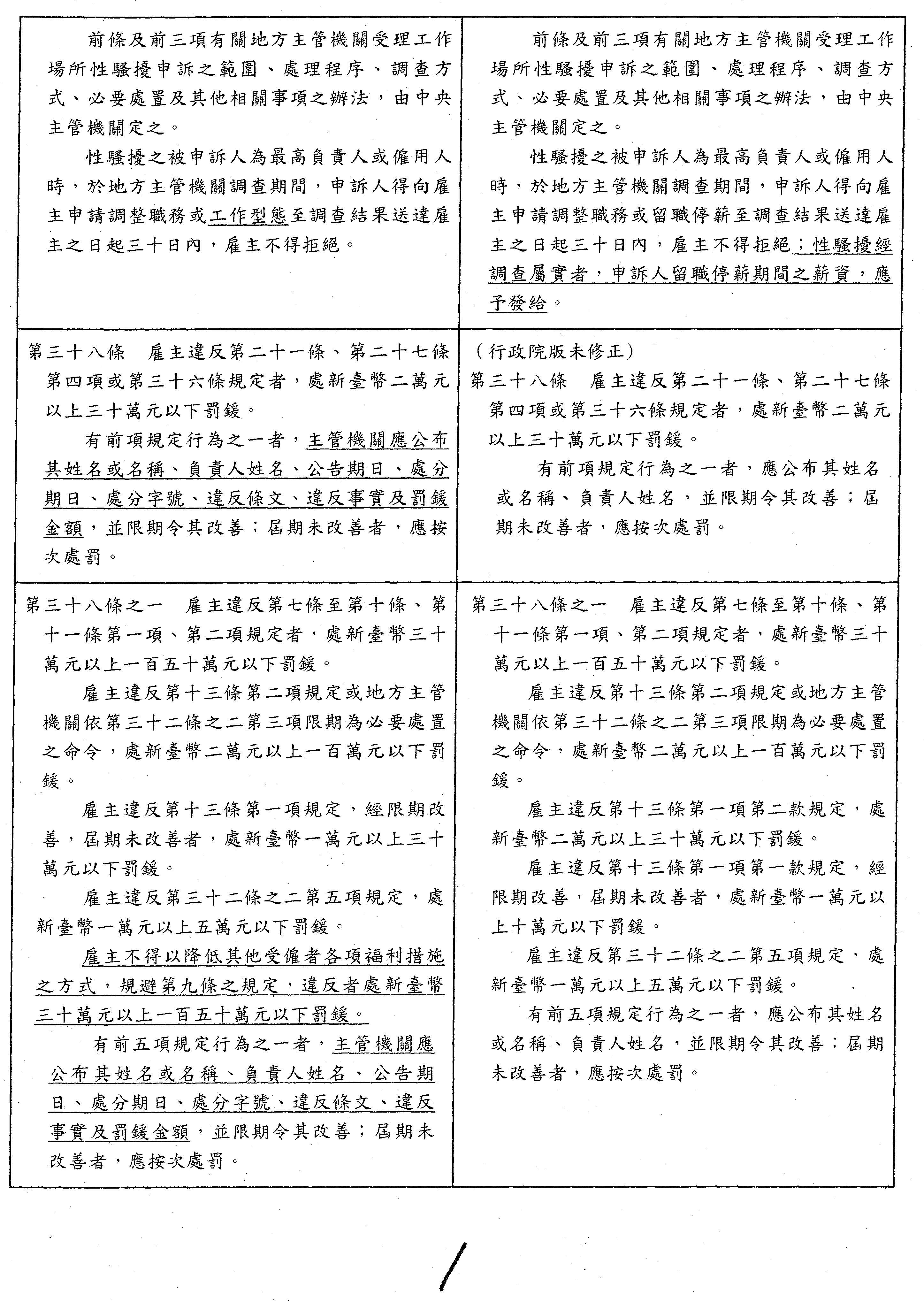 陳委員椒華:這一條在處罰的罰鍰裡面,我們認為還是應該要增加,時力提的修正動議包括我們有增加雇主不得以降低其他受僱者各項福利措施之方式,規避第九條規定,違反者處新臺幣,就是增加罰鍰到30萬元以上150萬元以下。另外主管機關在公布加害人的姓名、名稱、負責人姓名、公告日期等等,相關的規定我們也希望能夠入法,這條如果勞動部沒辦法接受,我們是建議要保留,以上。