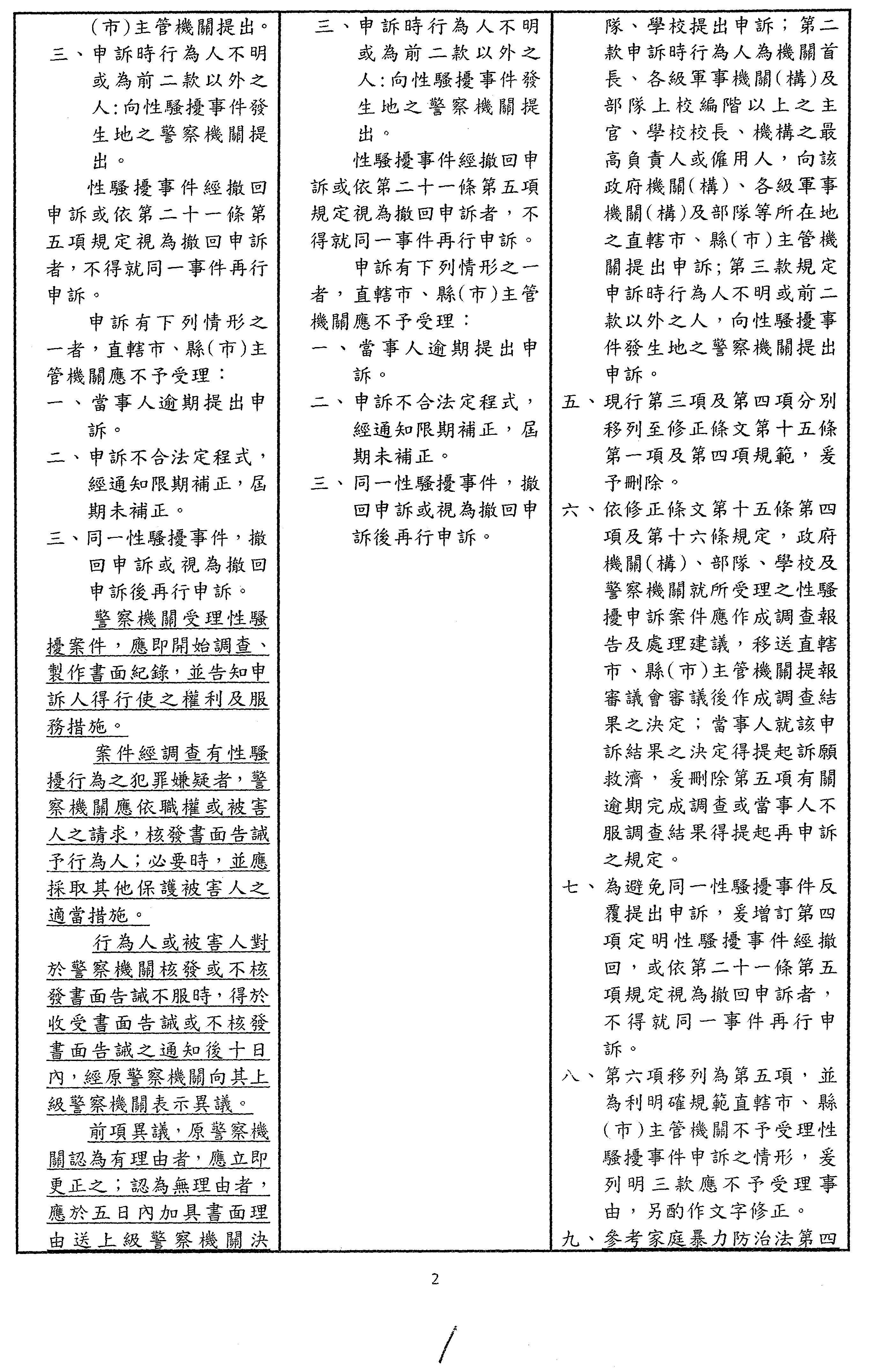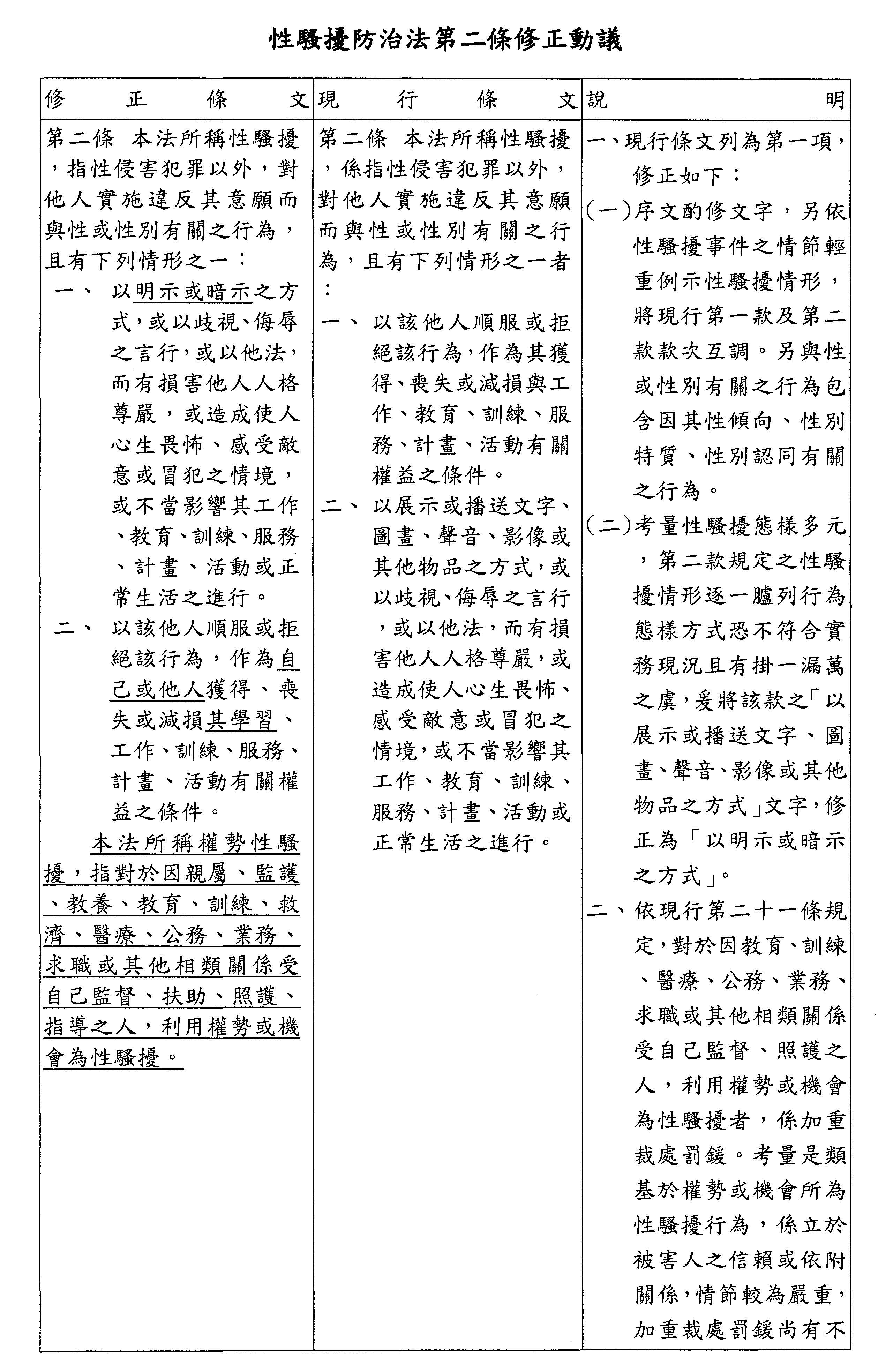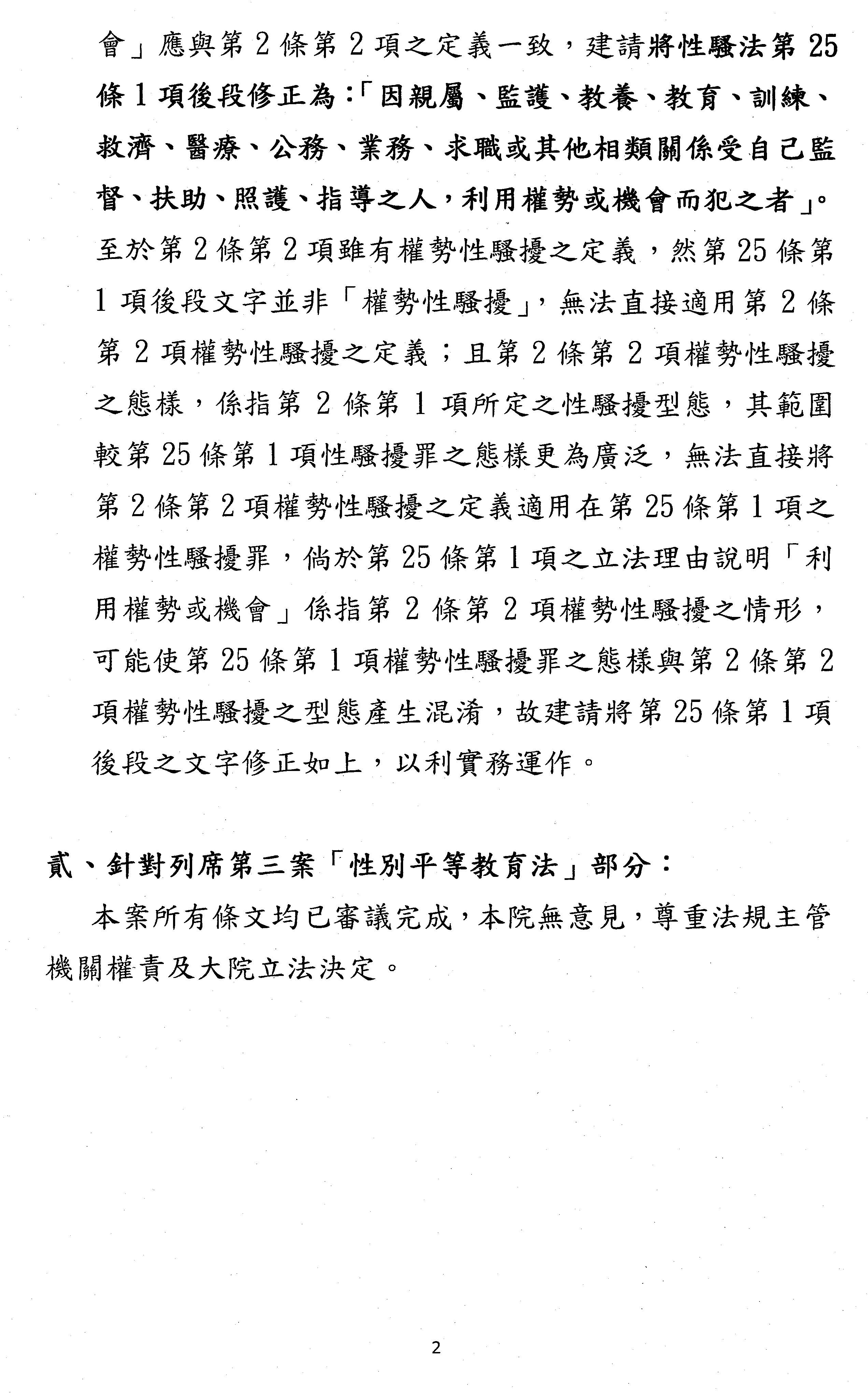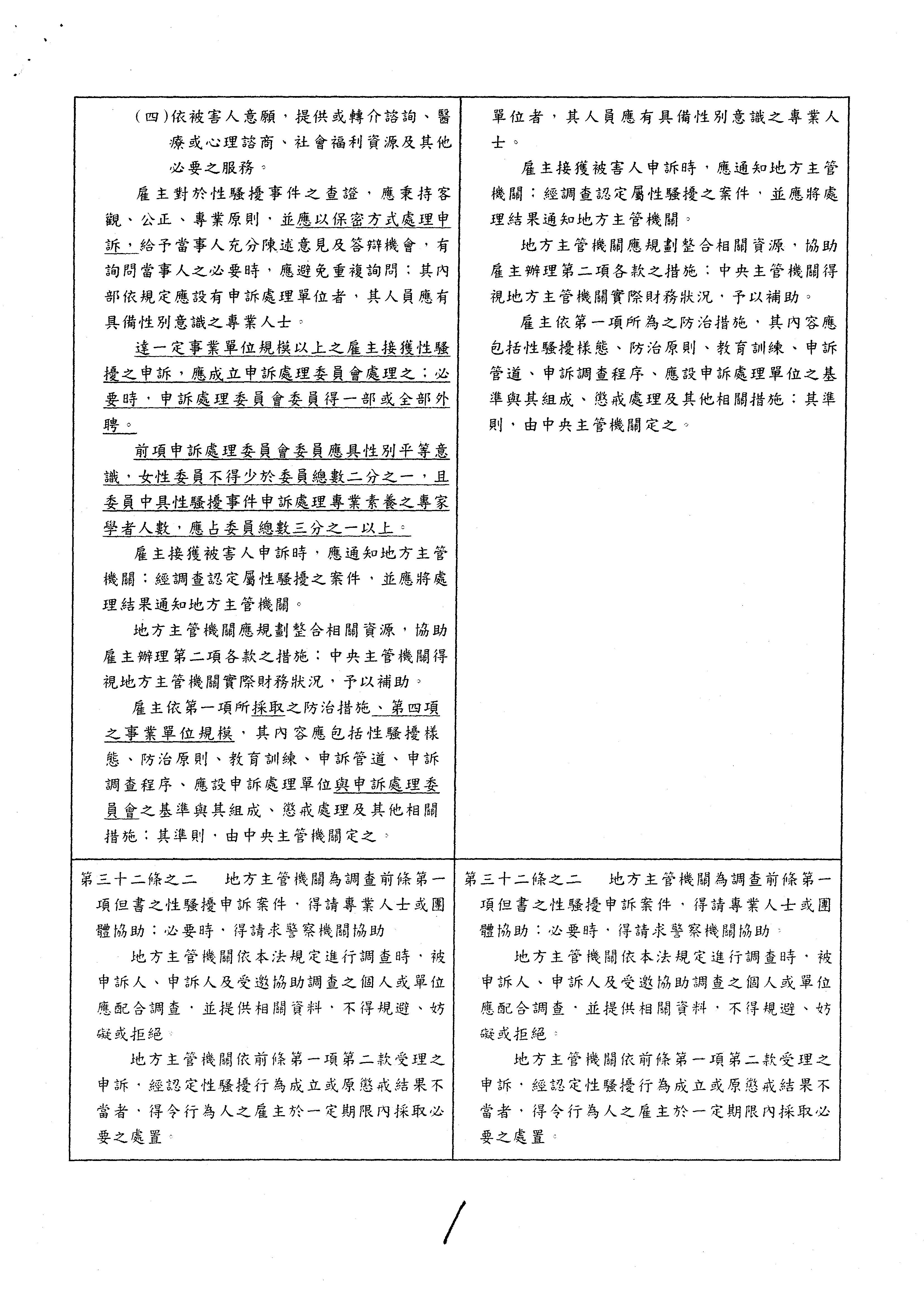 許部長銘春:第三十二條之二,現在是有說性騷擾的申訴案件可以請專業人士或團體來協助調查,而且是實質調查,未來我們在準則裡面也會要求主管機關它要怎麼做,其實一些大原則都已經有按照委員討論時的意見列進去了。