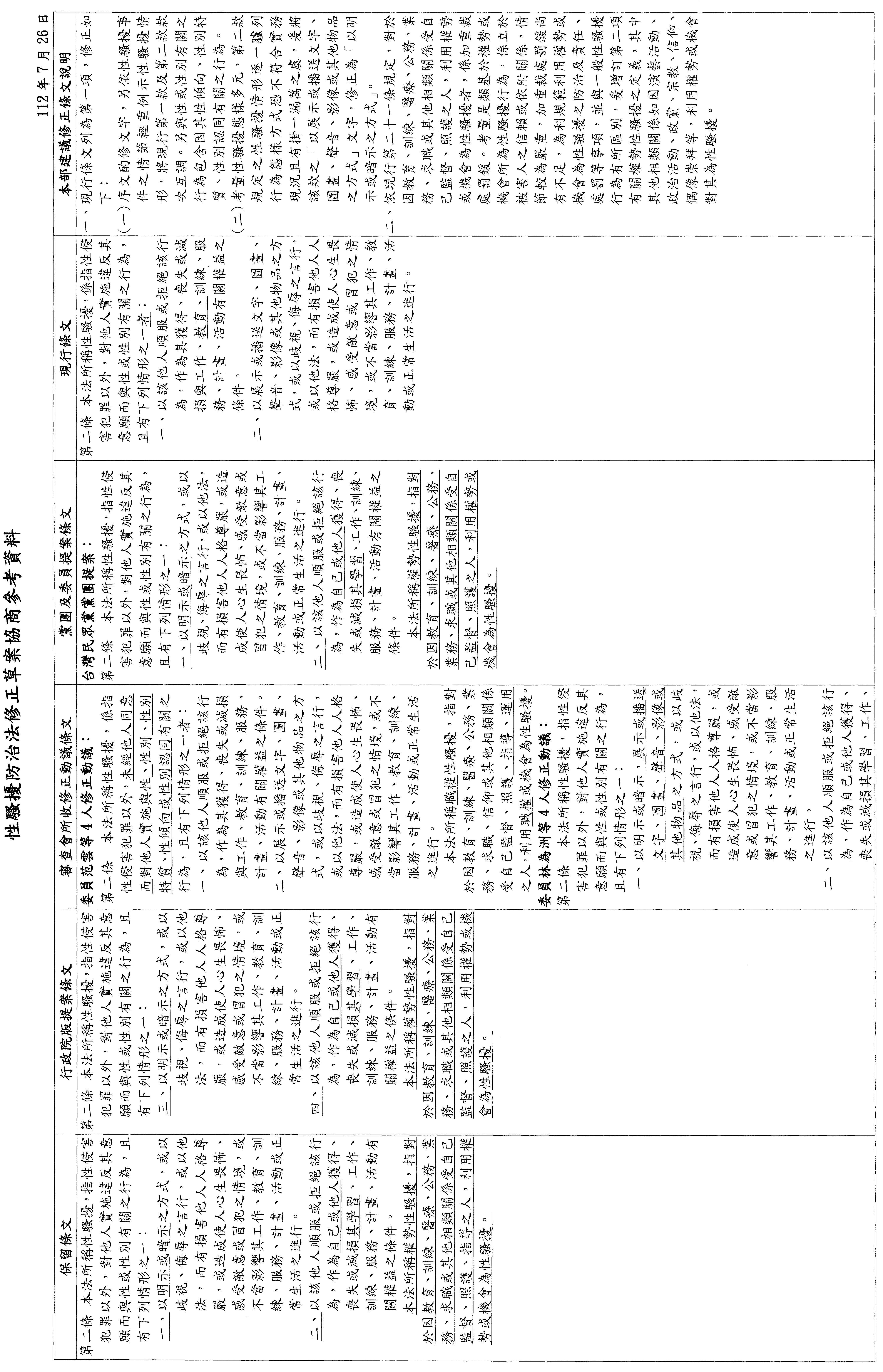 主席:各位先進、各位部會首長、各位女士先生,現在開始開會。立法院黨團協商會議今天開會的事由是要研商「性別工作平等法」、「性騷擾防治法」及「性別平等教育法」案相關事宜。我在這邊先跟大家報告,今天的議程第三案「性別平等教育法修正草案」案已經於112年7月24日由召集委員張其祿先生召集黨團協商,協商結論各黨團代表都已經簽名,所以本案就不必再處理,與本案有關的教育部等各部會代表可以先行離席。
