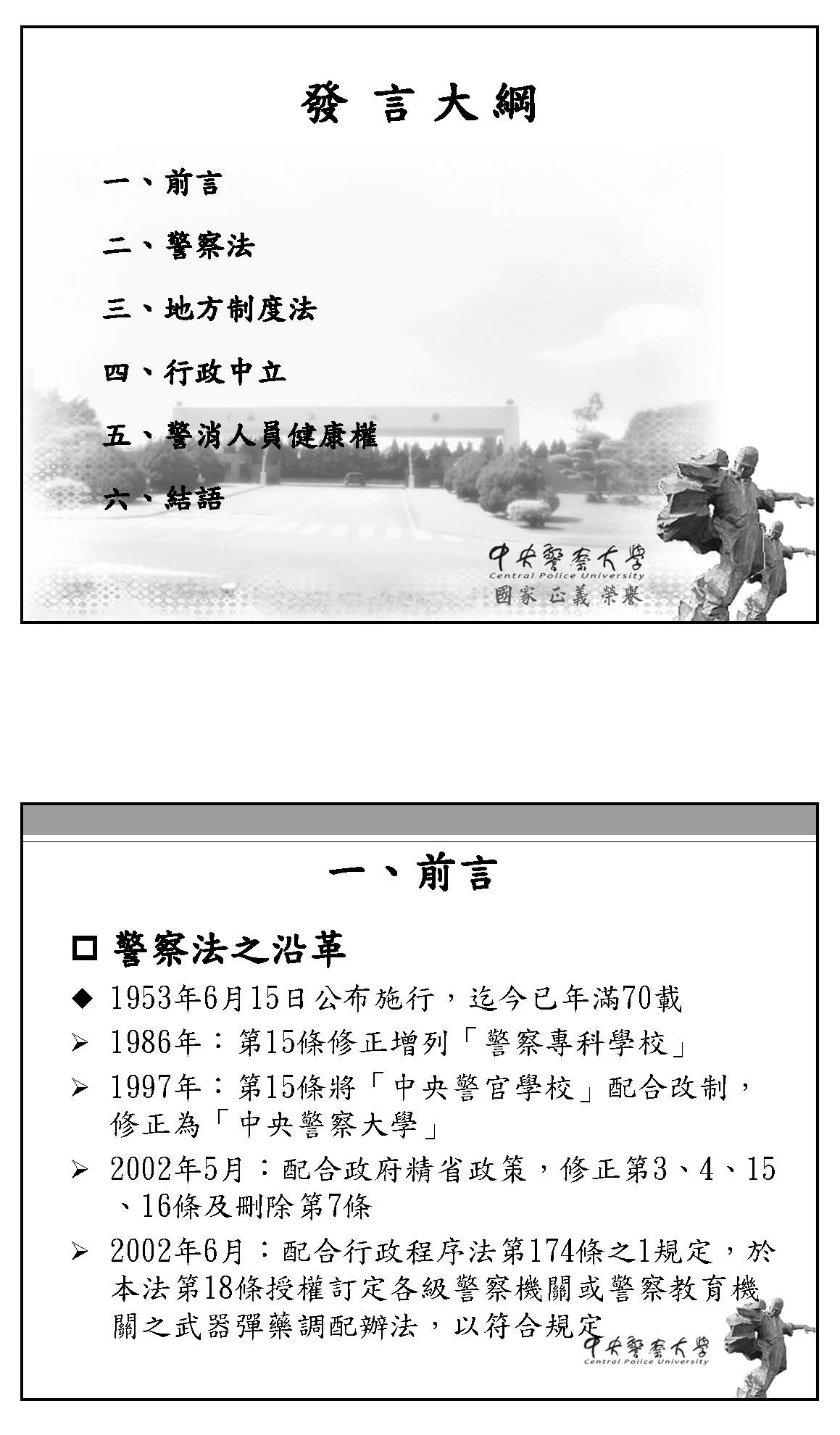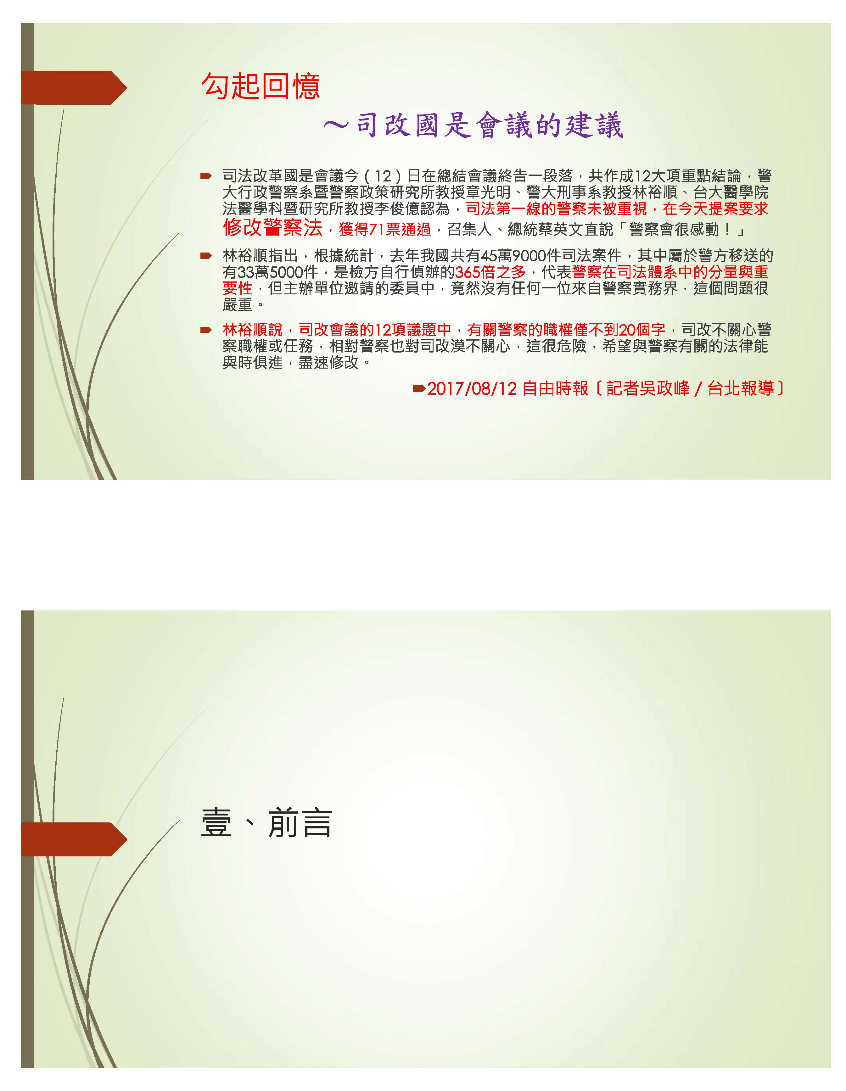 我今天來開會的時候,我看了一下資料,其中有警察法第五條跟第九條的修法,我以前不太注意,今天來就看一下,我看第九條就覺得怎麼有這種立法?它寫警察依法行使左列職權,第三個叫做什麼?協助偵查犯罪。以臺灣來講,一般人民對警察的印象是什麼?所以我覺得警察你自己本身要有自信,你要把你的主體性、獨立性建立起來。我今天來的一個重點是要鼓勵警察,你要肯定自己,你要對自己有信心,你不要看到檢察官就矮一半,這個觀念是錯的,這個是錯誤觀念,對臺灣也不會有進步,反而會對臺灣有不好的影響。