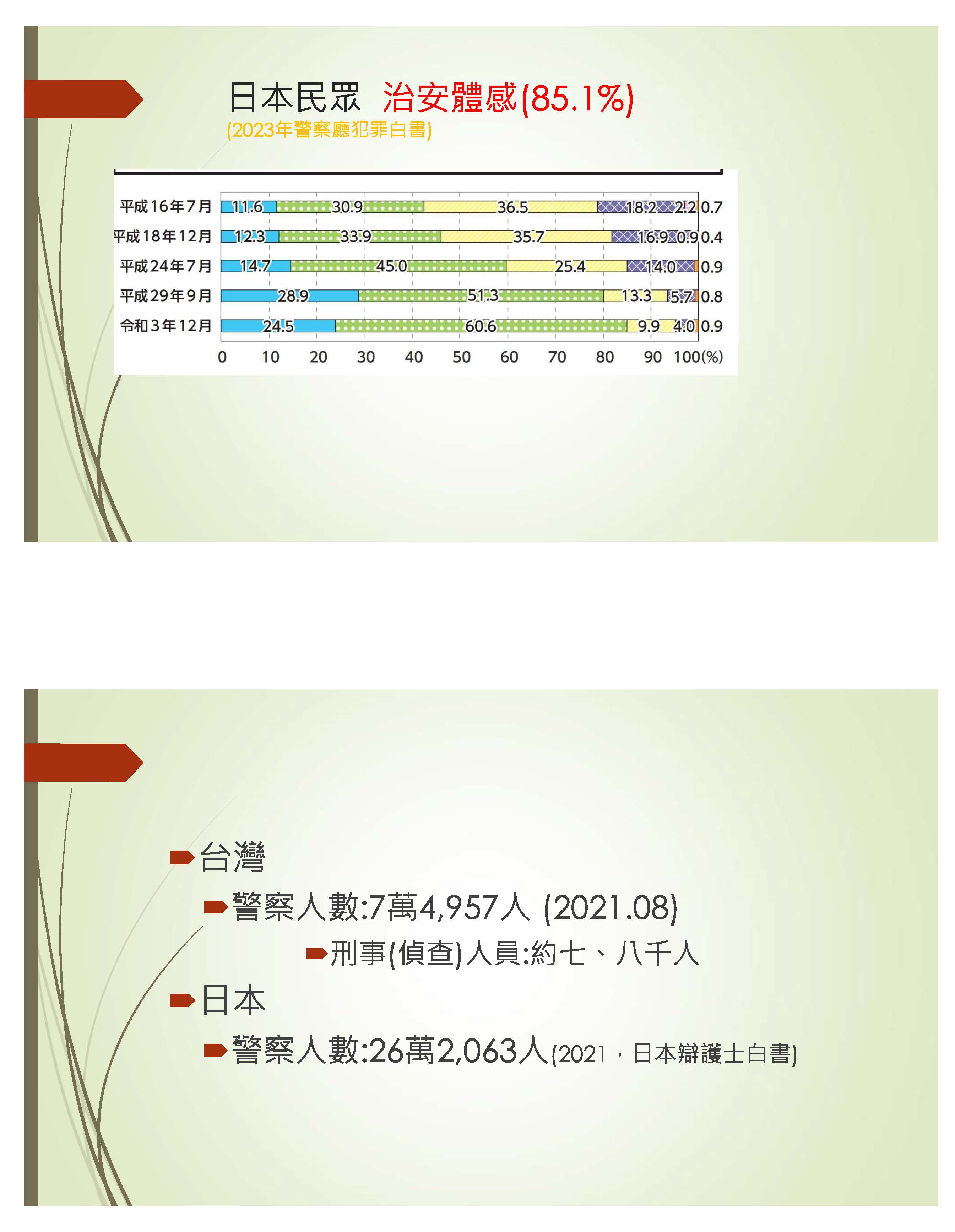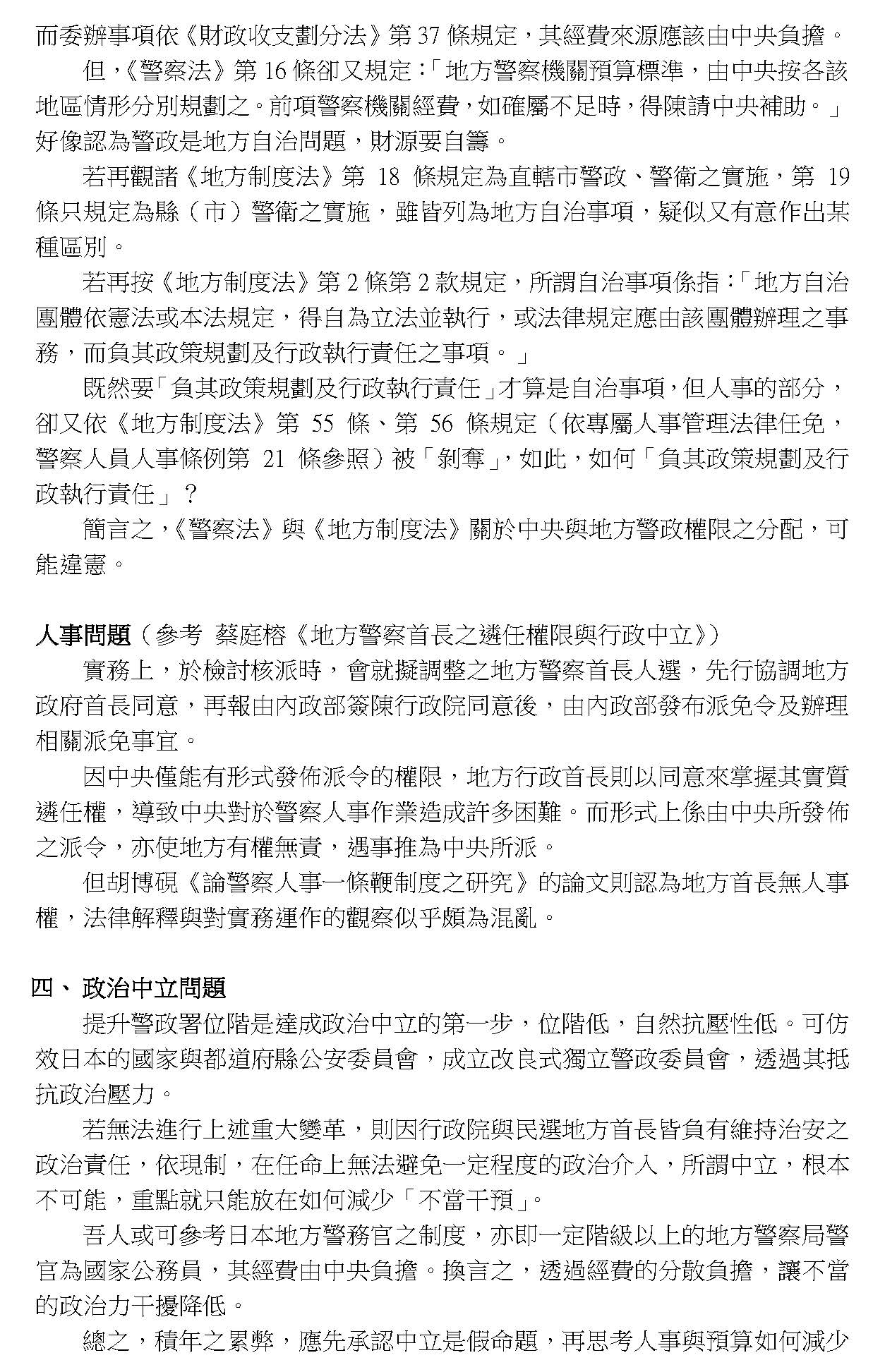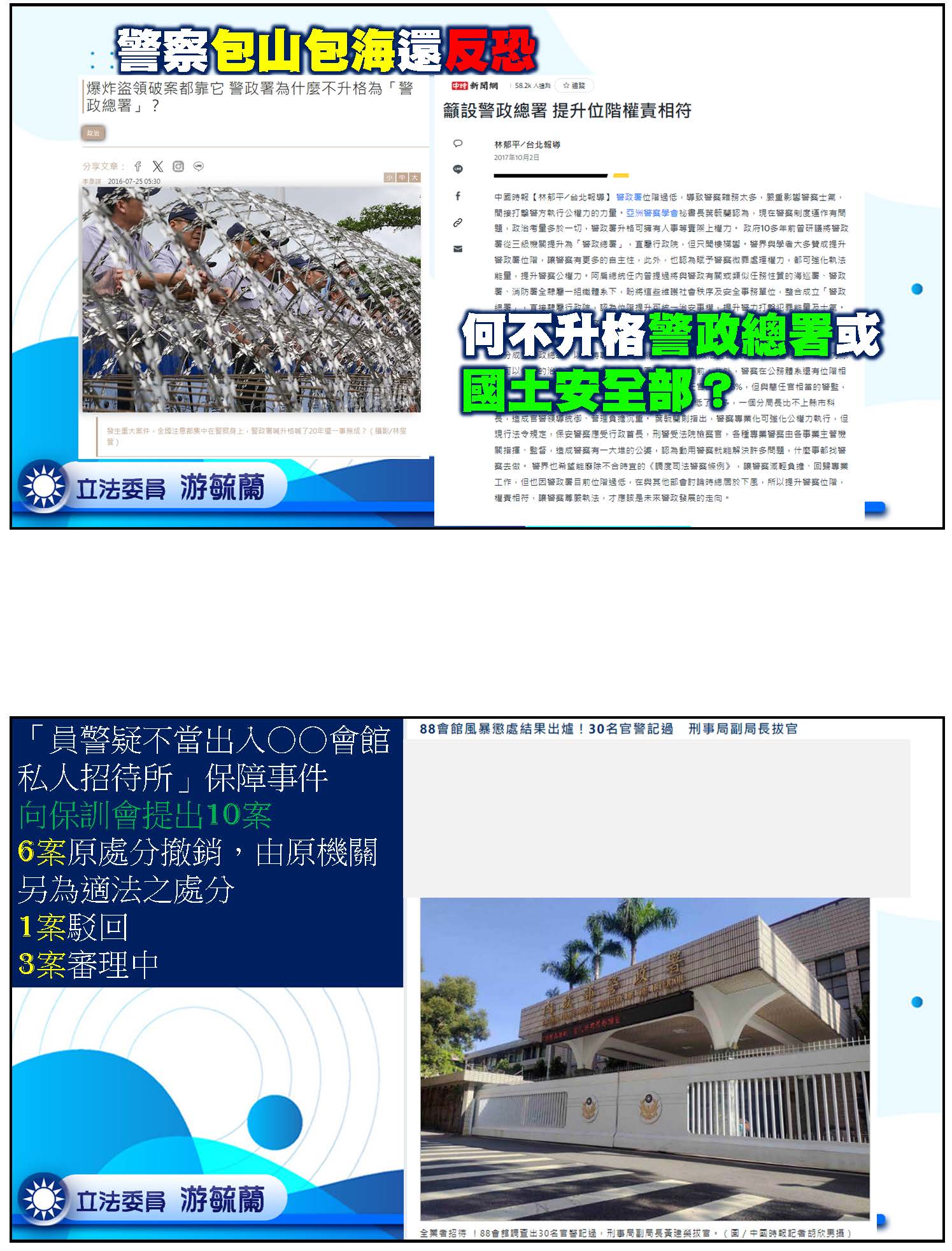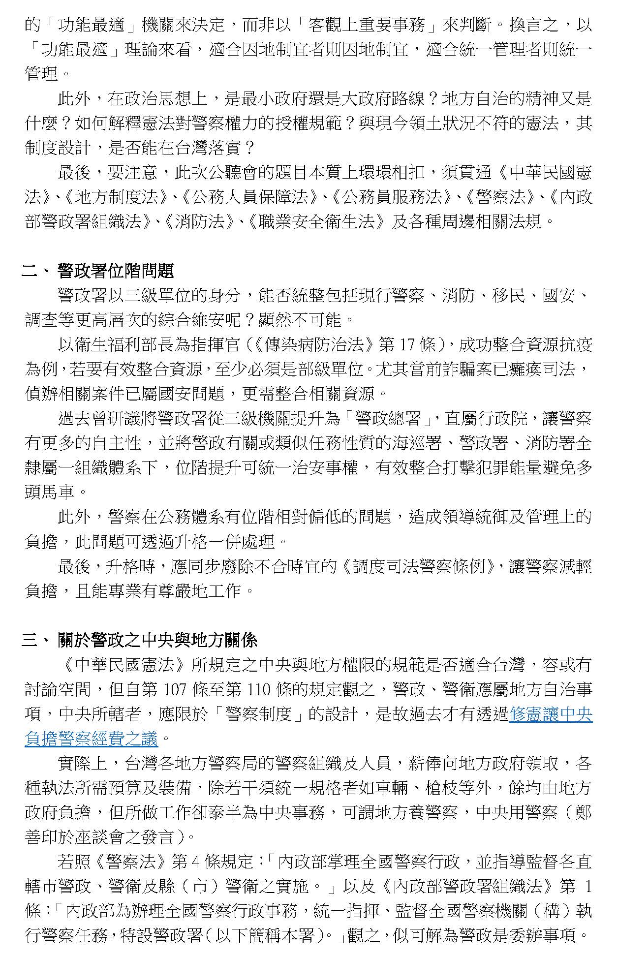 最後是要不要設計?如果像游委員提到的,他都可以想像是國土安全部,我們從頭去改,再去思考一下要不要設置類似日本的一個獨立的警政治安委員會,然後包括我們的法制、制度、人事相關懲處,都能以一個獨立的、比較客觀中立的第三者的立場去考核的話,我想對於我們臺灣警察地位的提升會有幫助。