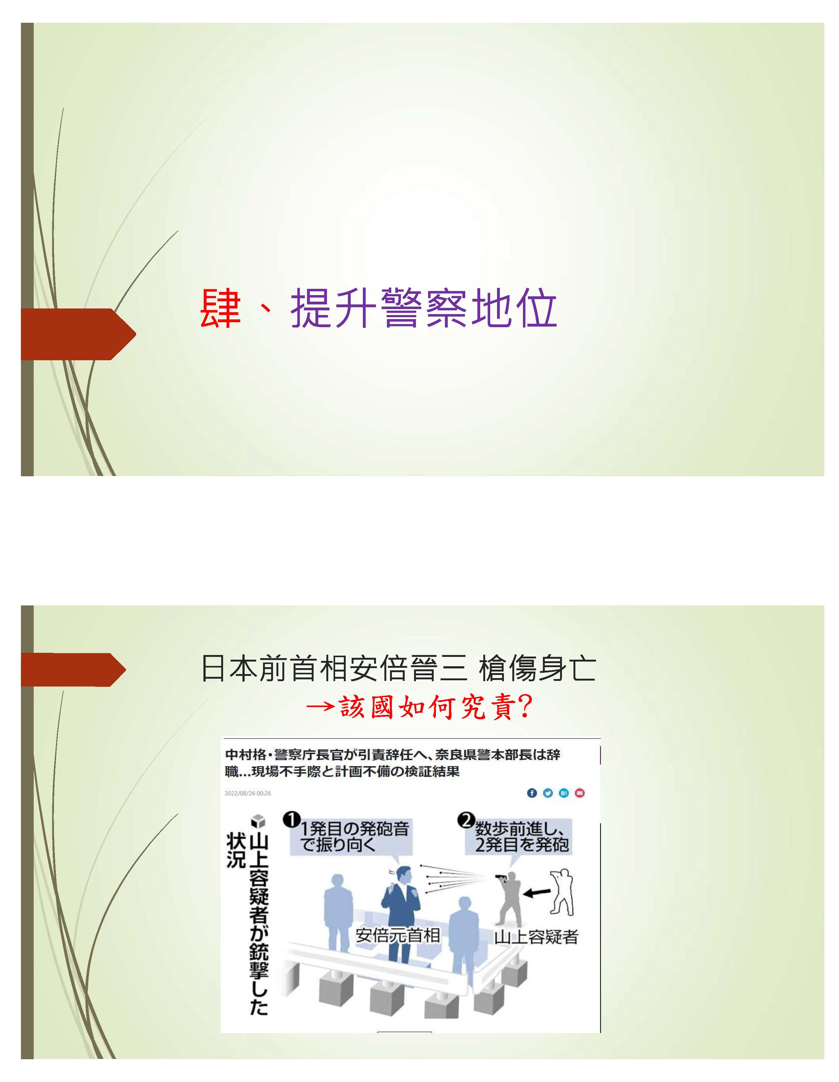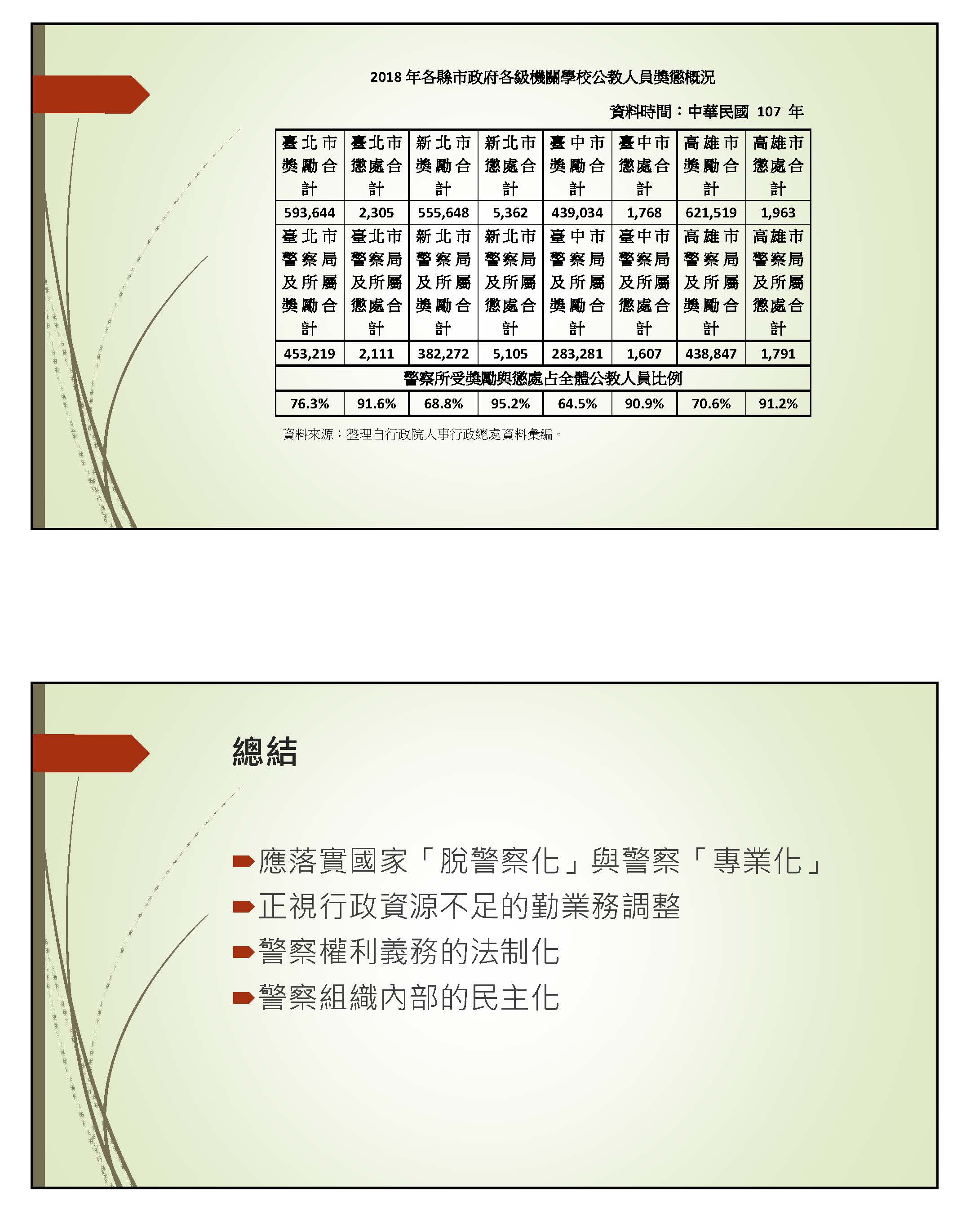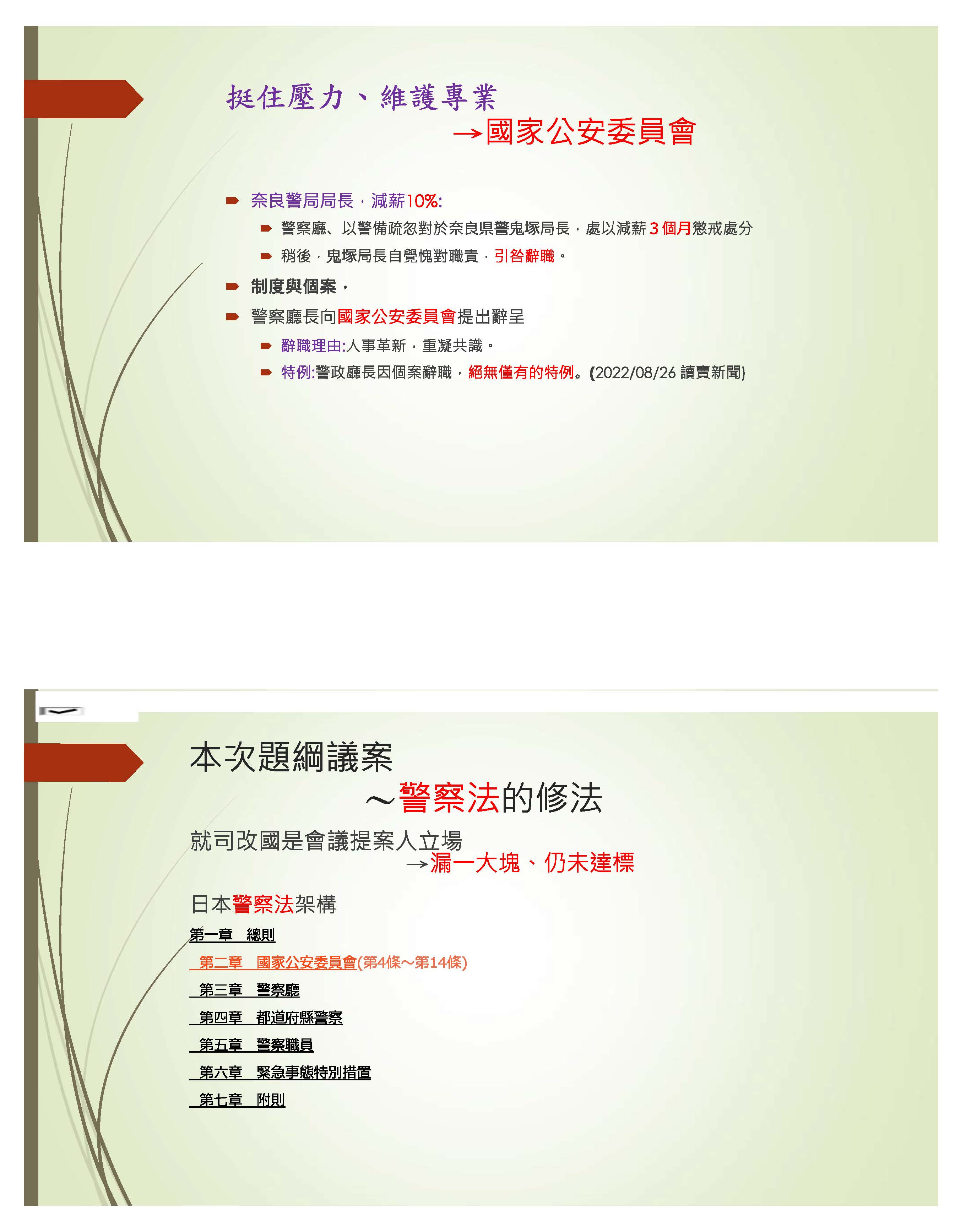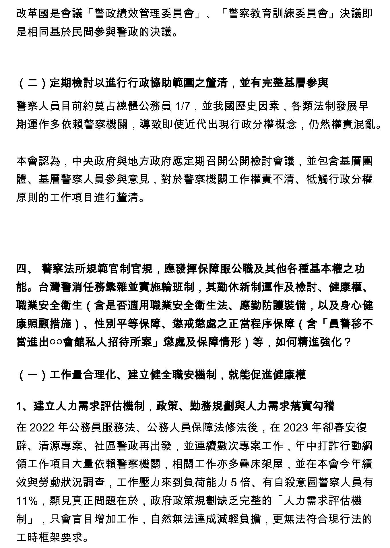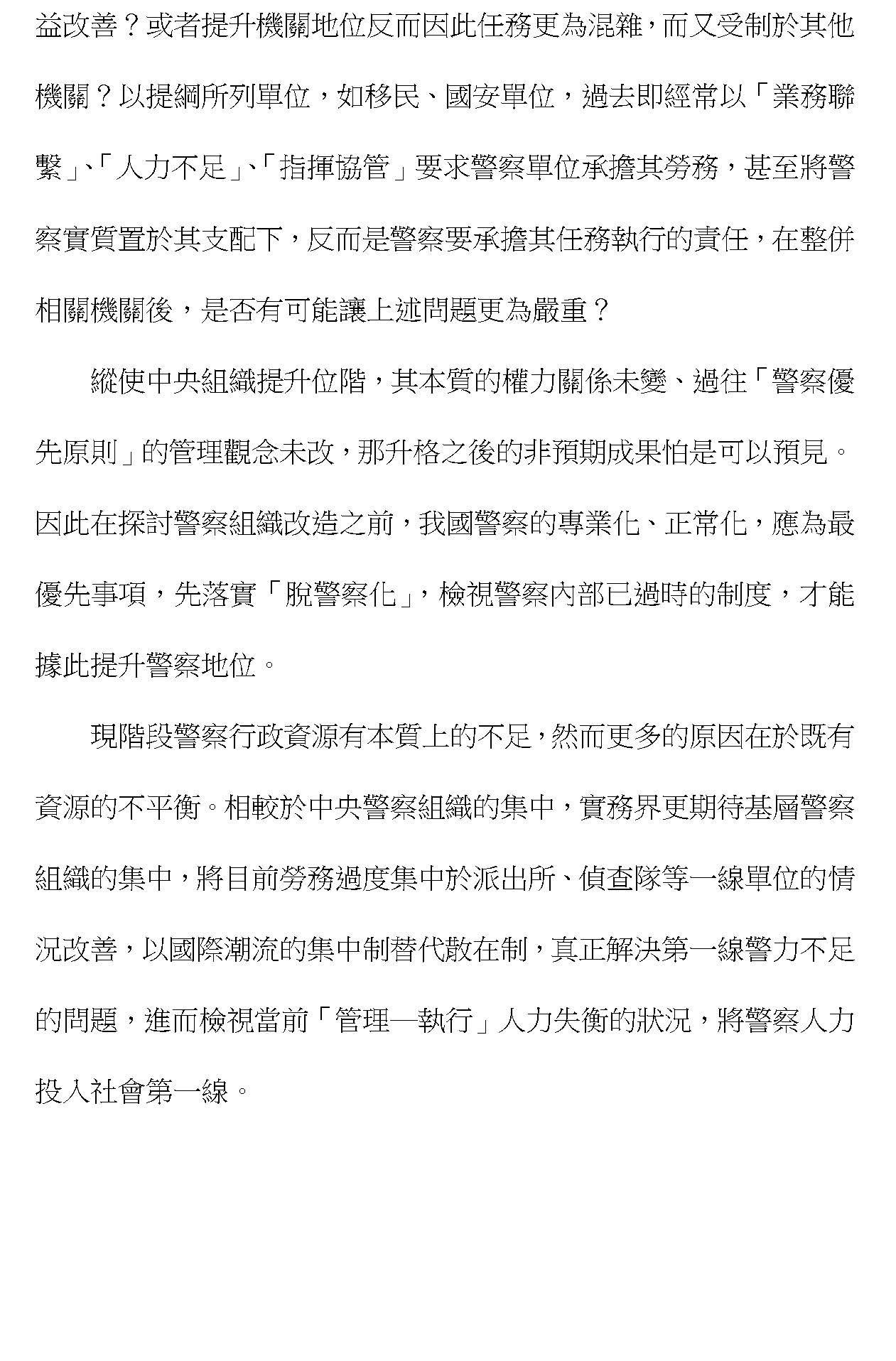 最後是要不要設計?如果像游委員提到的,他都可以想像是國土安全部,我們從頭去改,再去思考一下要不要設置類似日本的一個獨立的警政治安委員會,然後包括我們的法制、制度、人事相關懲處,都能以一個獨立的、比較客觀中立的第三者的立場去考核的話,我想對於我們臺灣警察地位的提升會有幫助。