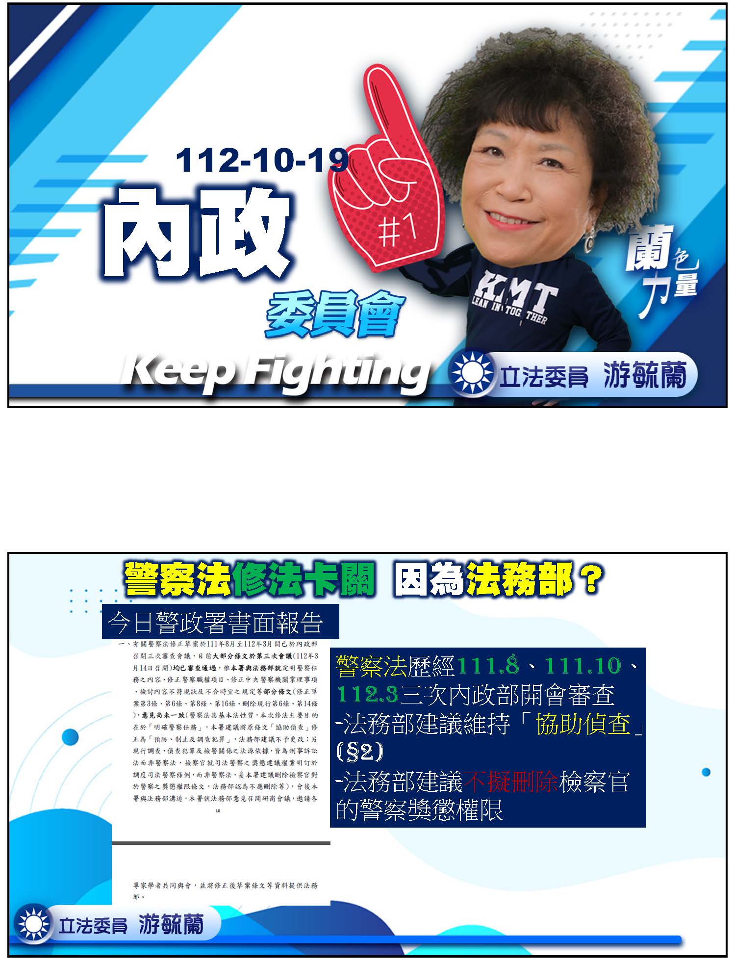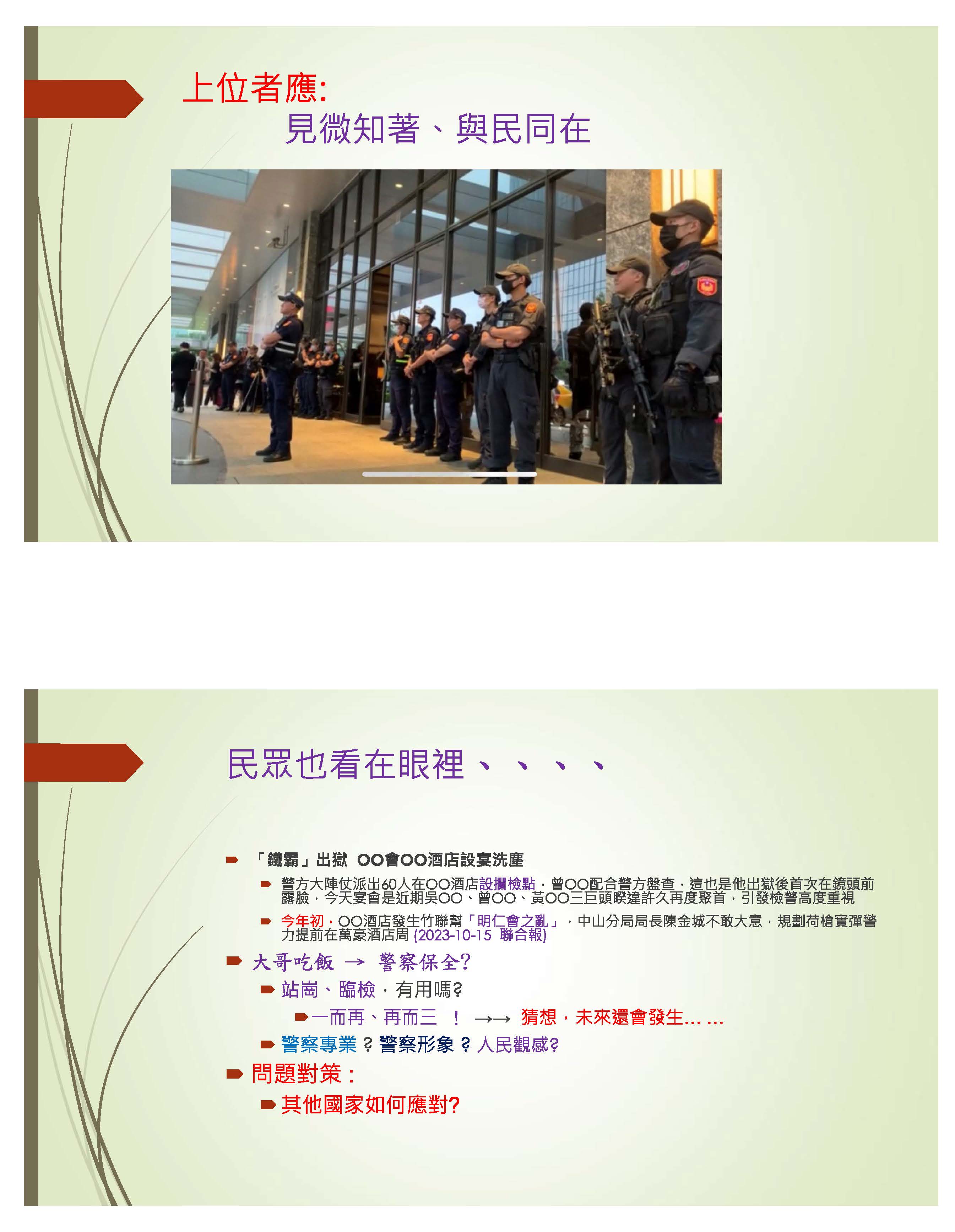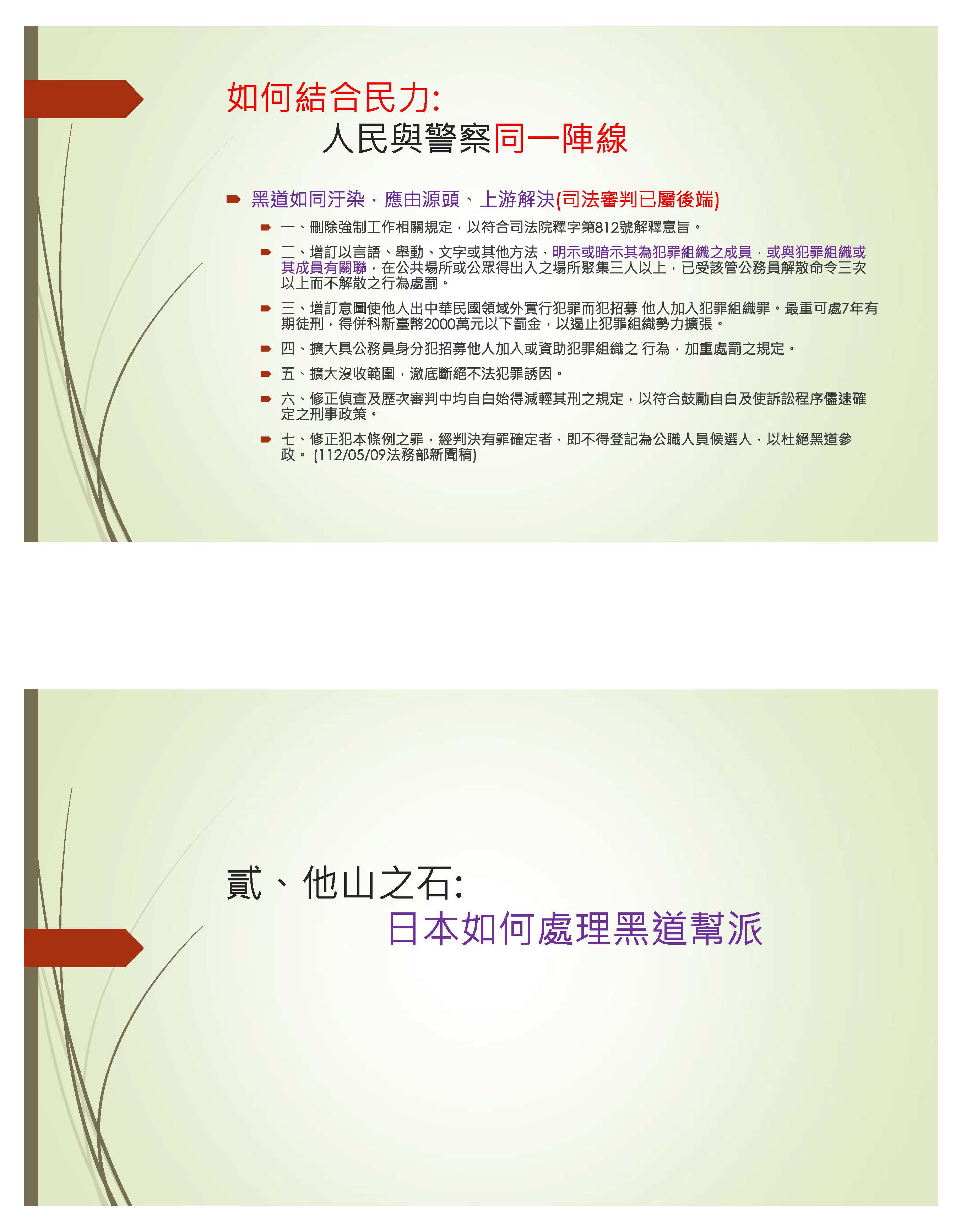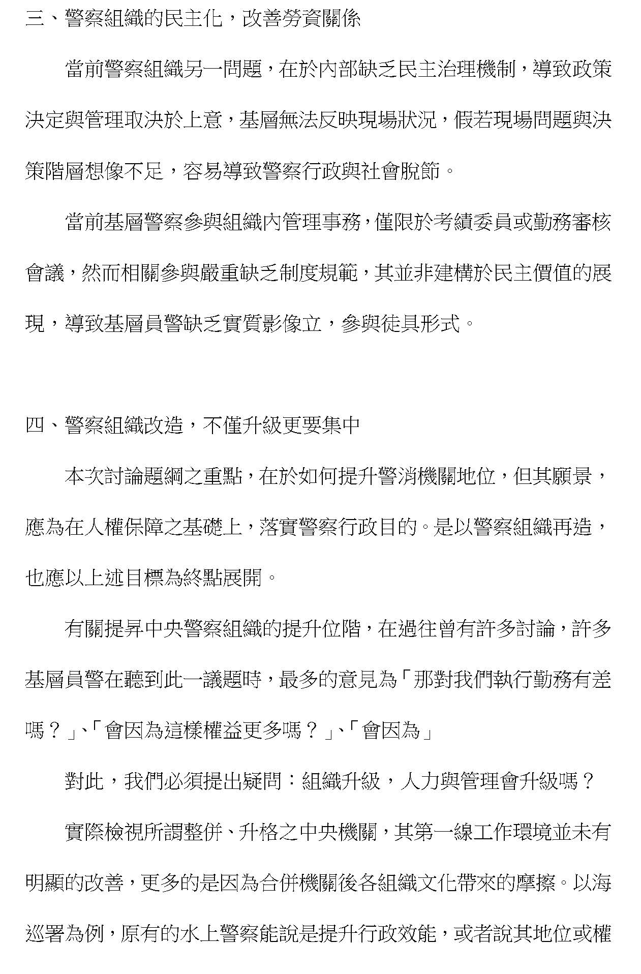 最後是要不要設計?如果像游委員提到的,他都可以想像是國土安全部,我們從頭去改,再去思考一下要不要設置類似日本的一個獨立的警政治安委員會,然後包括我們的法制、制度、人事相關懲處,都能以一個獨立的、比較客觀中立的第三者的立場去考核的話,我想對於我們臺灣警察地位的提升會有幫助。