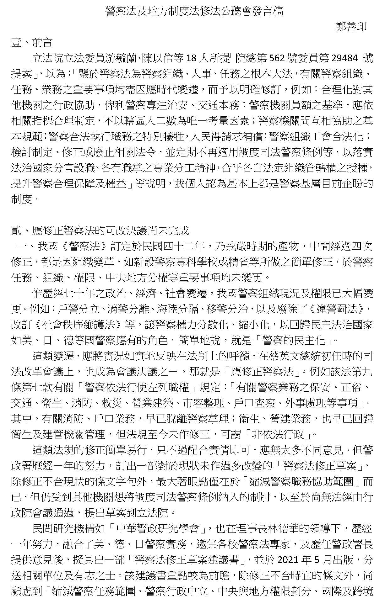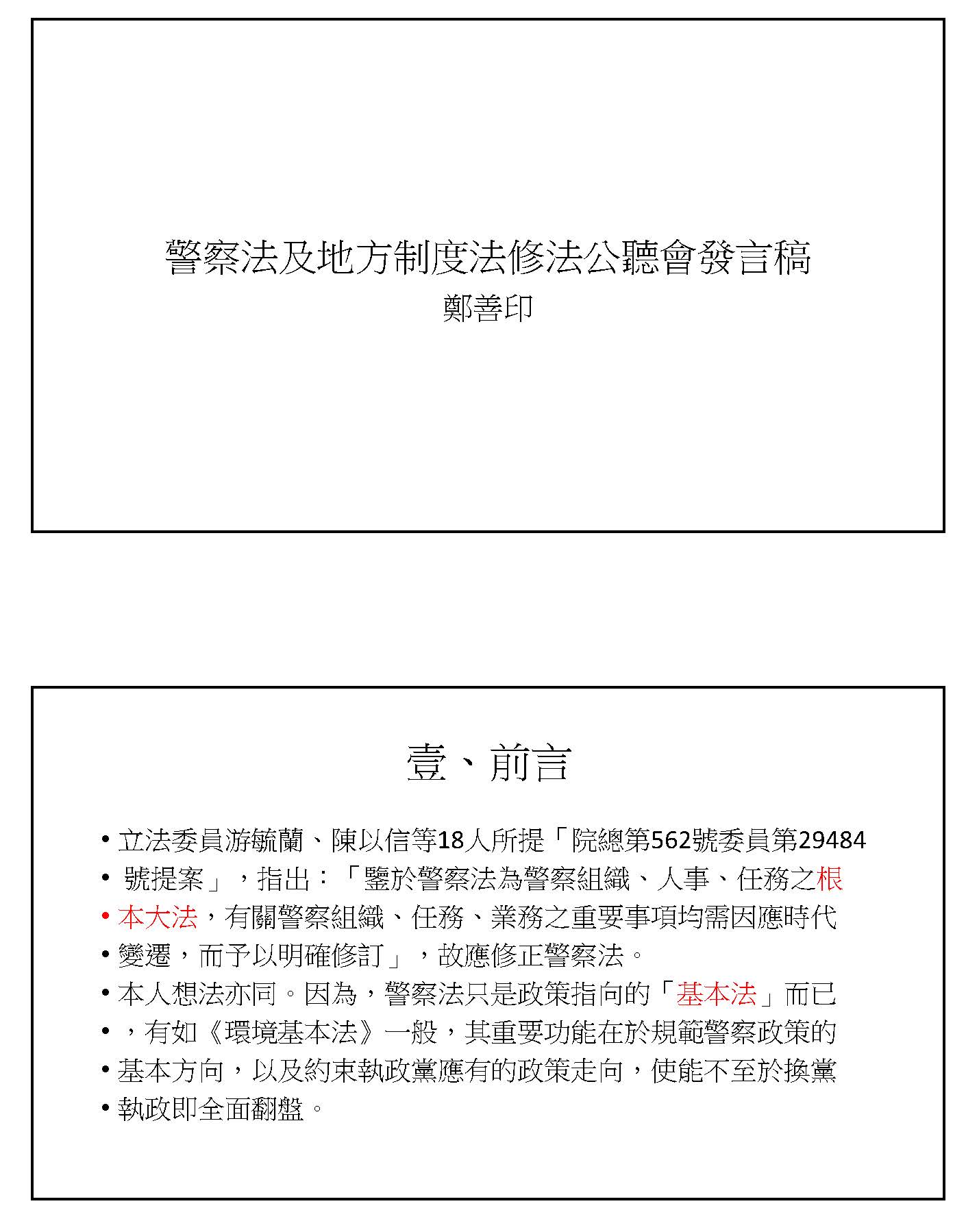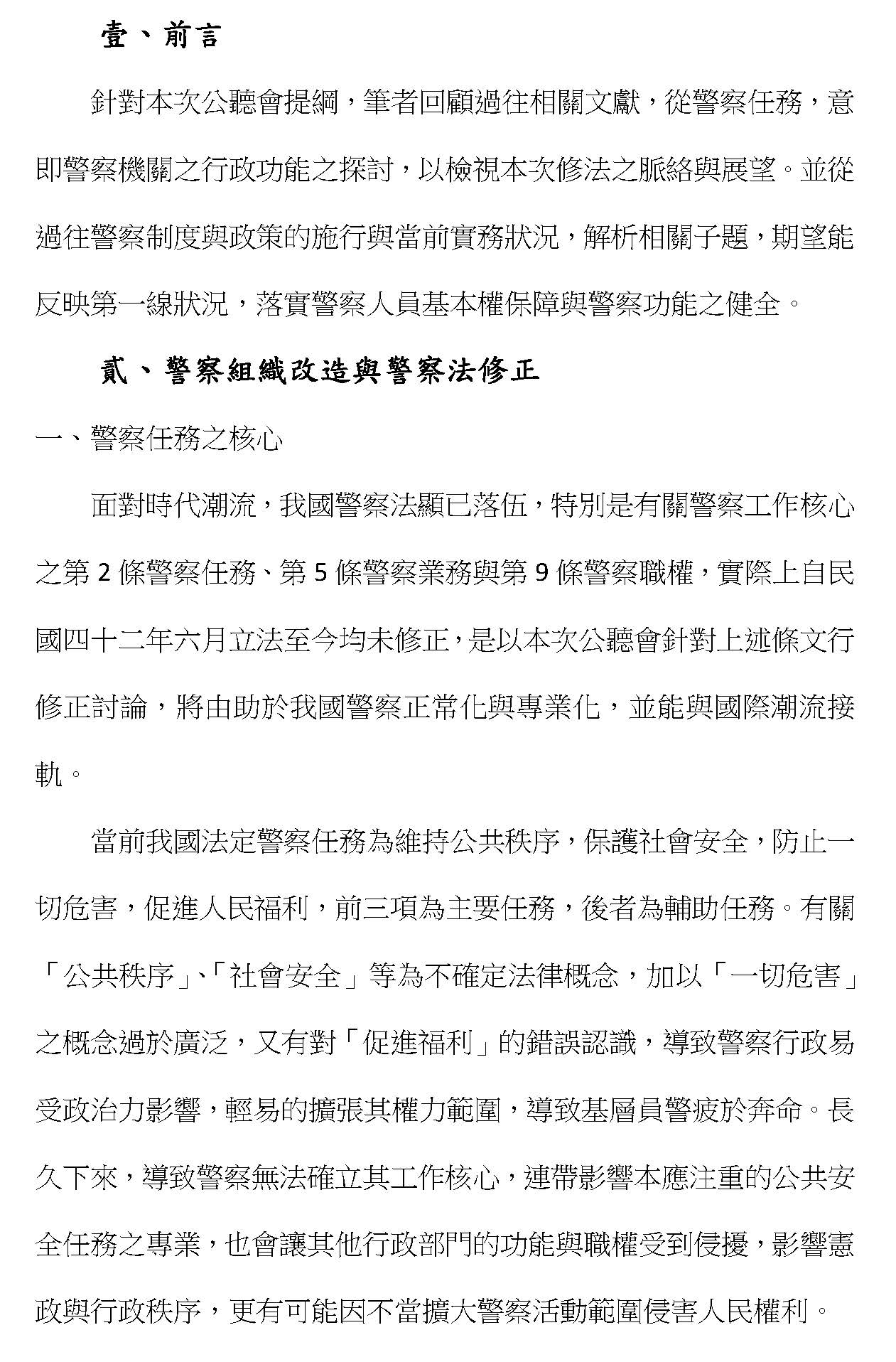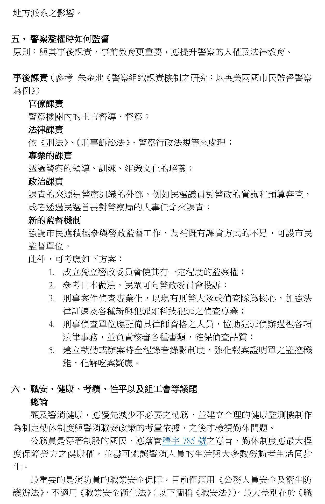 再次地感謝游委員今天舉辦這個公聽會,就把這個相關的問題列了五點,我看起來原則上面就是希望從警察的獨立性去確保他的專業性,同時要給警消人員合理的勞動權保障,目的就是要讓警察的功能極大化。但畢竟我們對這個領域的認知有限,我比較是從整個刑事偵查的角度來看警察系統怎麼樣做到獨立性、怎麼樣做到專業化來看。剛剛鄭律師大概有提到了,相對於警政單位,法務部、法務系統是一個從威權時代到現在,從日本時代歷經國民政府、到民進黨政府,檢察系統基本上沒有做任何的更動,只有權力不斷地擴張,到現在為止都還保有法官應該才有的強制處分權,比如說他可以強制你驗尿、強制採尿、強制採血液,在國外都不可能讓檢察官擁有這樣的權力,他甚至可以指揮警察。所以他同時擁有在外國是法官的權力,還有他檢察官自己的權力,他甚至還擁有警察權。