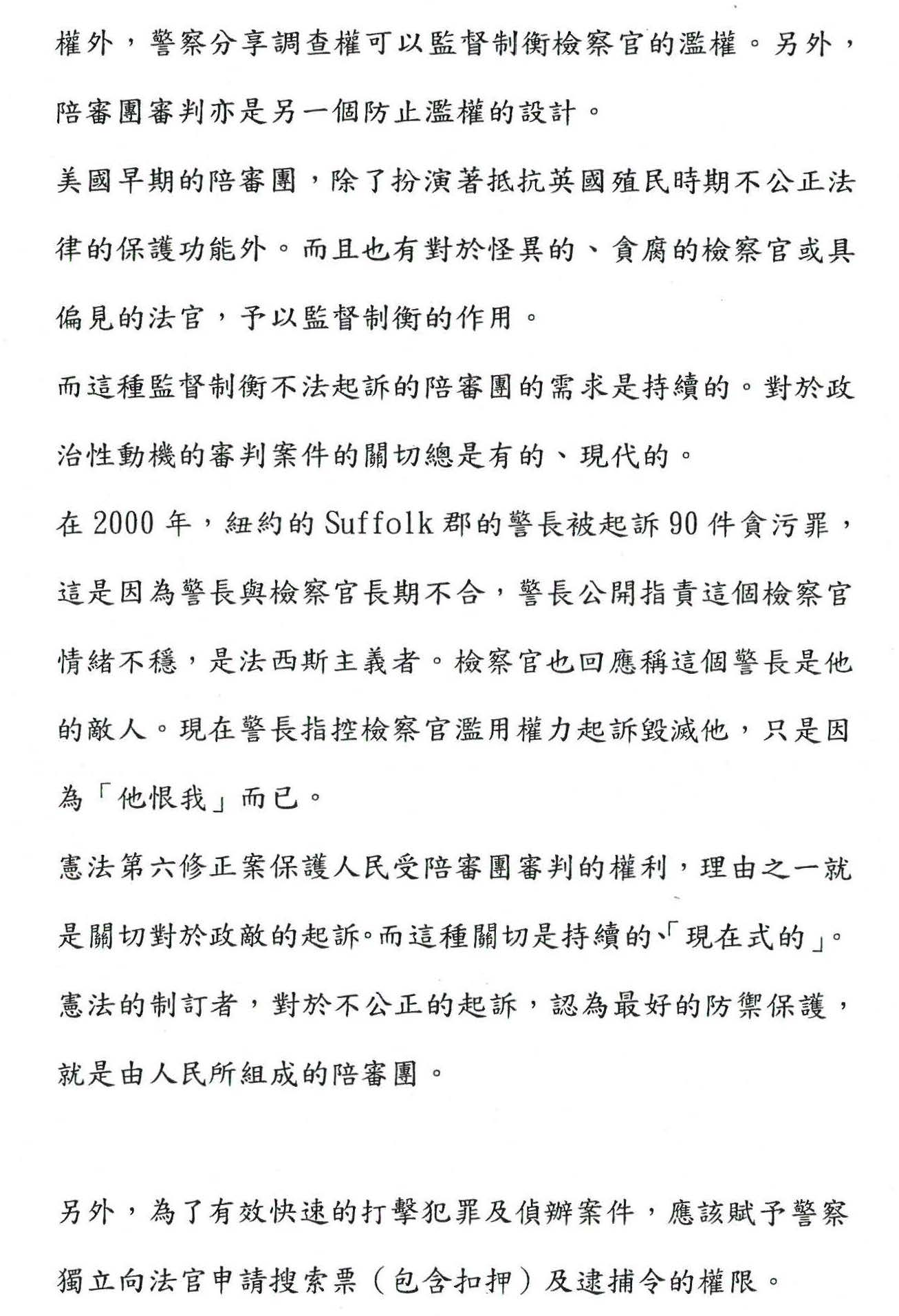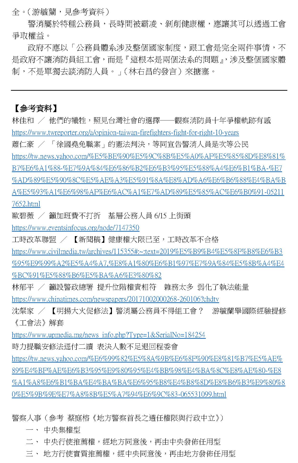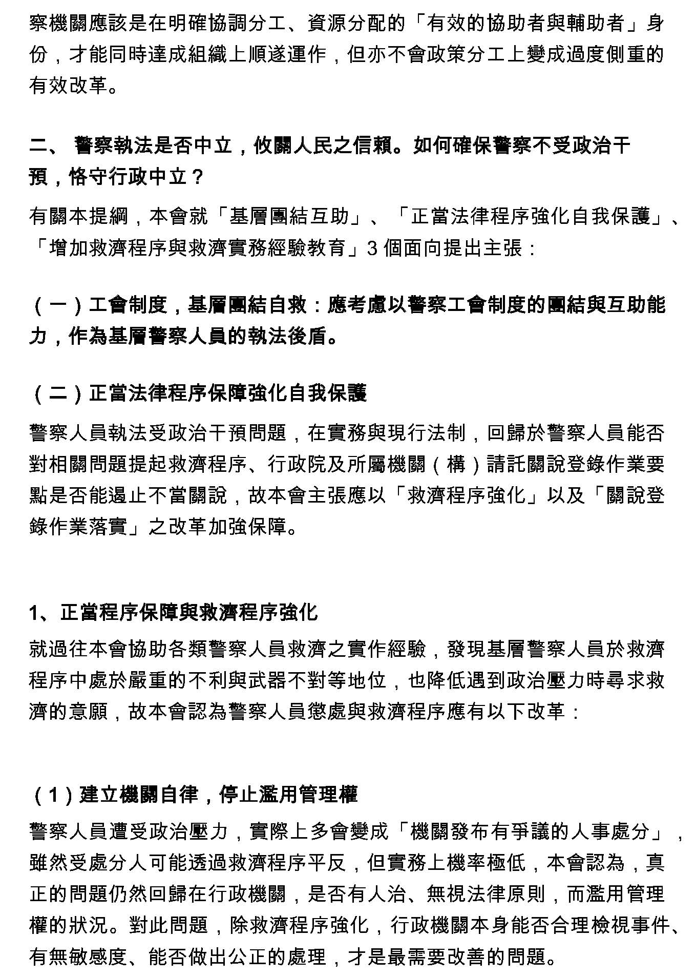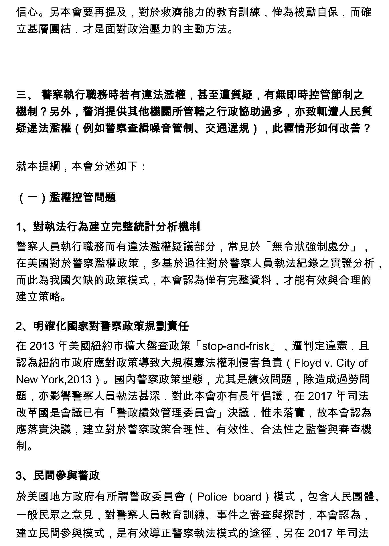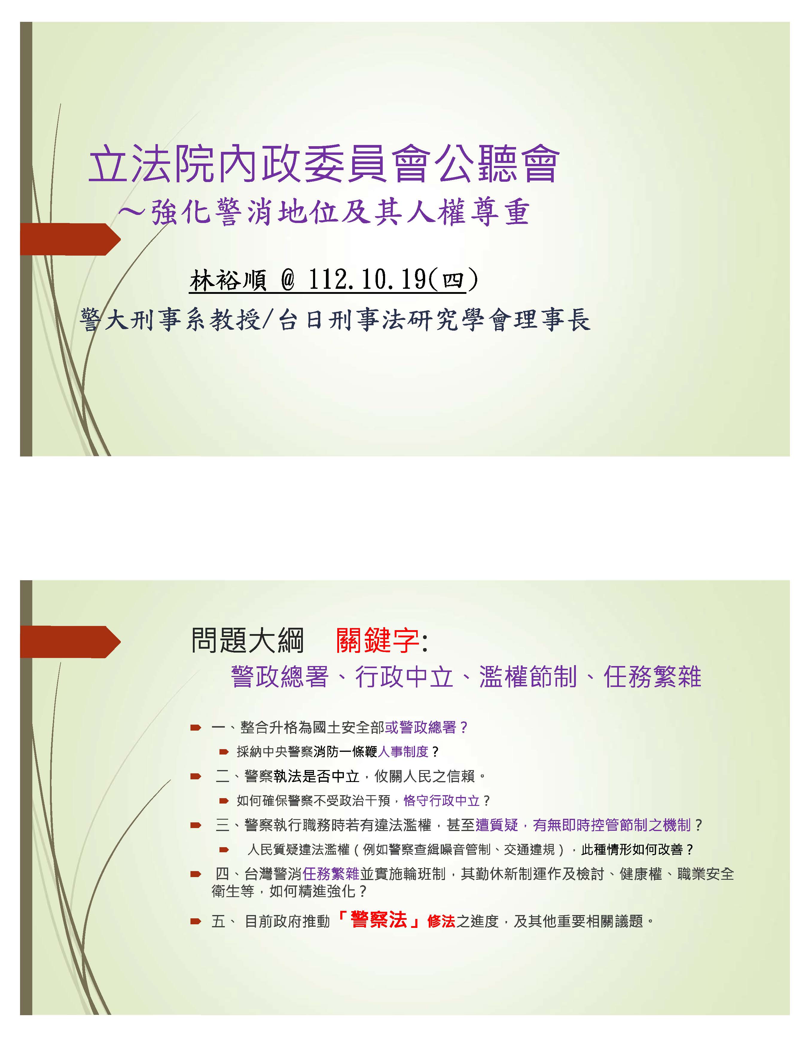 再次地感謝游委員今天舉辦這個公聽會,就把這個相關的問題列了五點,我看起來原則上面就是希望從警察的獨立性去確保他的專業性,同時要給警消人員合理的勞動權保障,目的就是要讓警察的功能極大化。但畢竟我們對這個領域的認知有限,我比較是從整個刑事偵查的角度來看警察系統怎麼樣做到獨立性、怎麼樣做到專業化來看。剛剛鄭律師大概有提到了,相對於警政單位,法務部、法務系統是一個從威權時代到現在,從日本時代歷經國民政府、到民進黨政府,檢察系統基本上沒有做任何的更動,只有權力不斷地擴張,到現在為止都還保有法官應該才有的強制處分權,比如說他可以強制你驗尿、強制採尿、強制採血液,在國外都不可能讓檢察官擁有這樣的權力,他甚至可以指揮警察。所以他同時擁有在外國是法官的權力,還有他檢察官自己的權力,他甚至還擁有警察權。