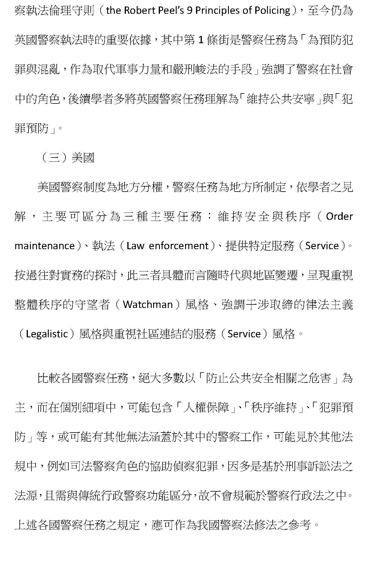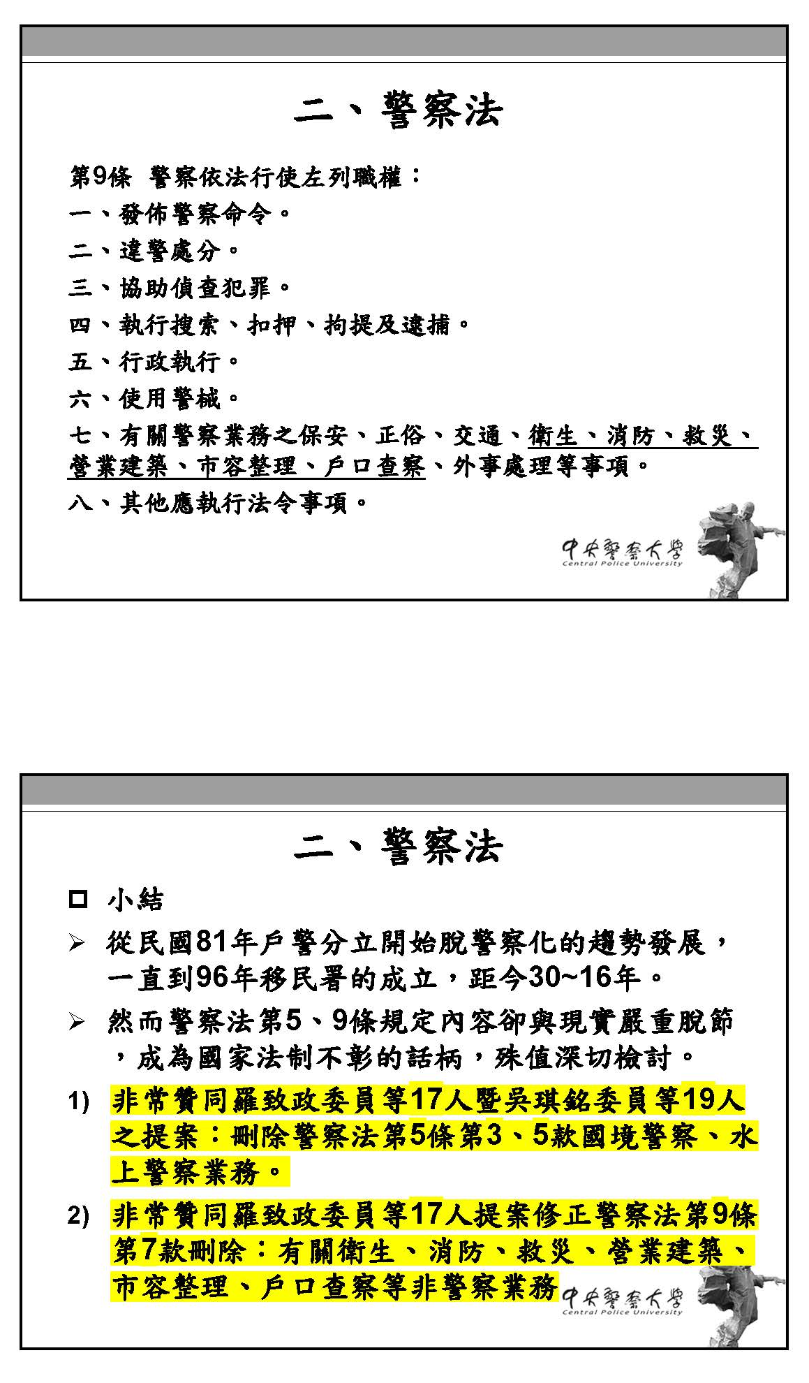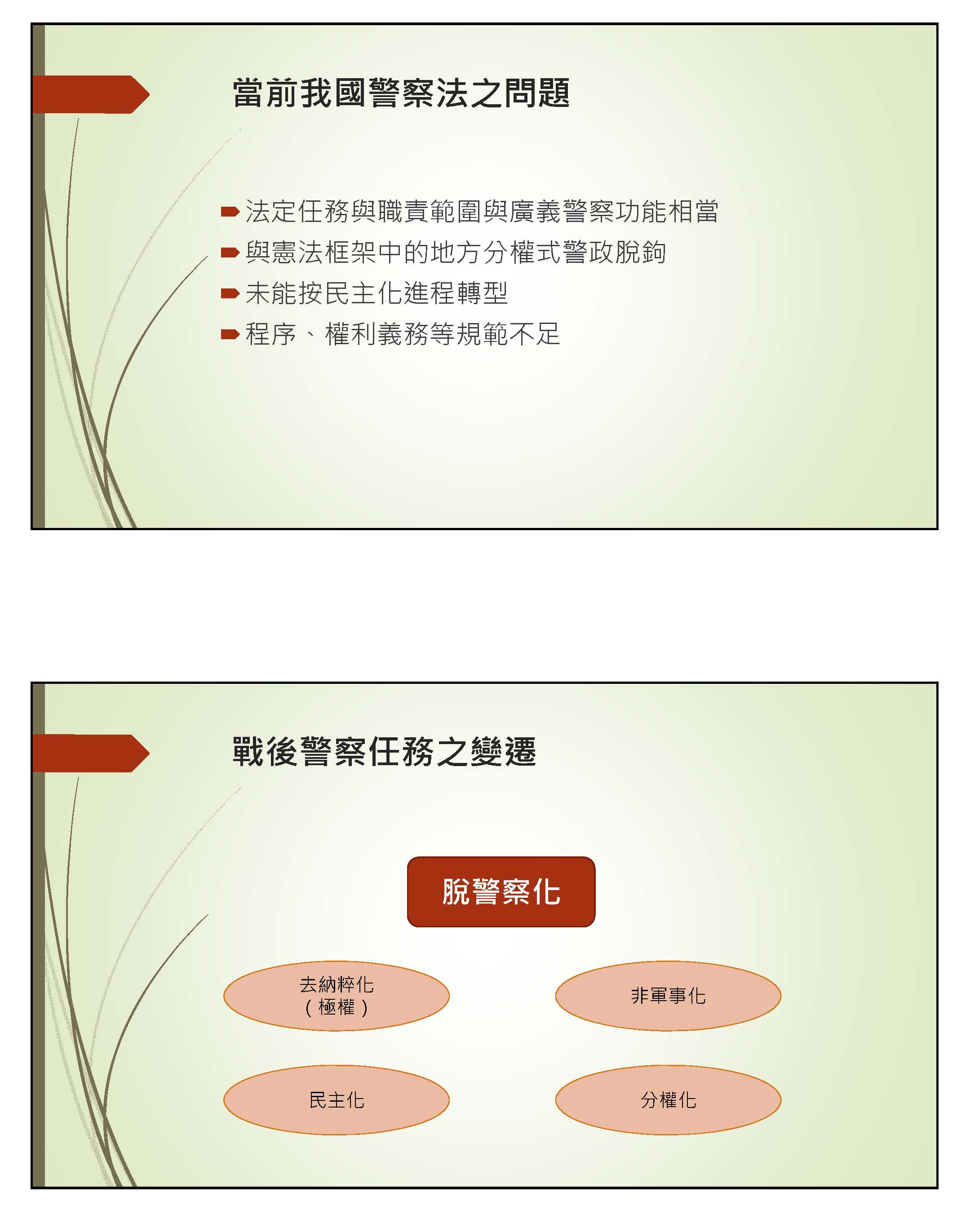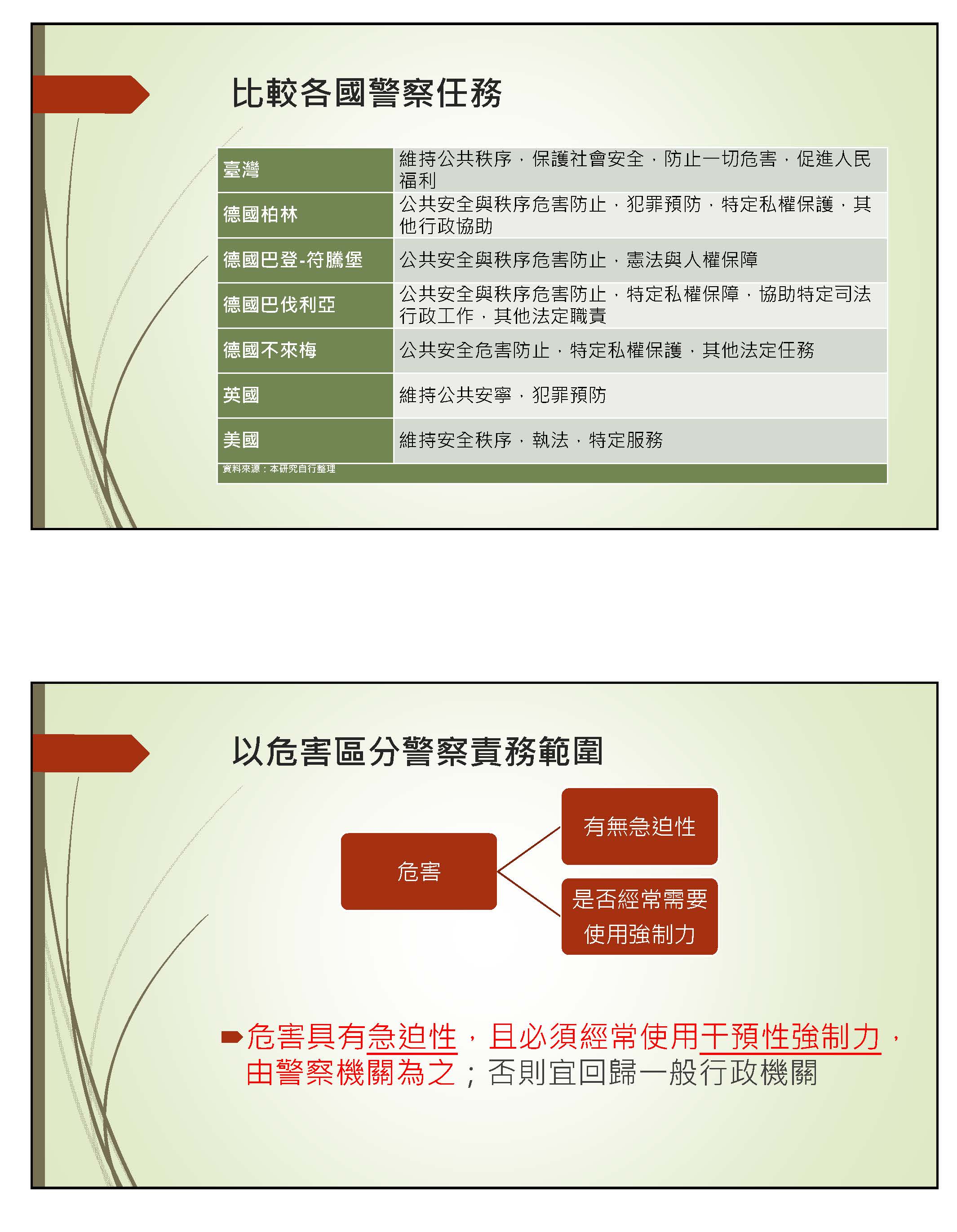 探討到警察法有關警察任務的修法,其實我們的警察任務已經很久沒有變了,從民國42年(1953年)的時候就是這樣的東西,那時候是什麼年代?是一個言論非常嚴格壓制以及國家集權的時代,這個法源已經很久沒有修正了。所以我這邊提議的是,如果要真的落實到所謂戰後警察任務變遷,應該要執行的是以下四個原則:除了國家的脫警察化之外,就是警察的去極權化、非軍事化、民主化以及分權化。尤其像臺灣現在很多警察的業務其實都是過去舊警察法的框架,但其實在國外來說,像德國,他們在情報行政方面早已把它排除在警察的職權範圍,另外再去成立專門機構,但在國內還是把它納入其中,所以我認為真的要去落實的話,應該是從這幾個原則去落實警察的專業化及一般化。