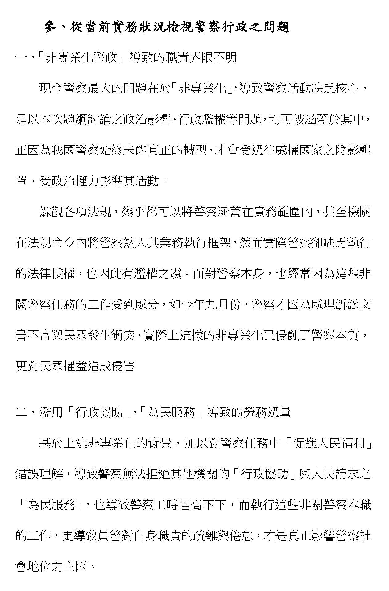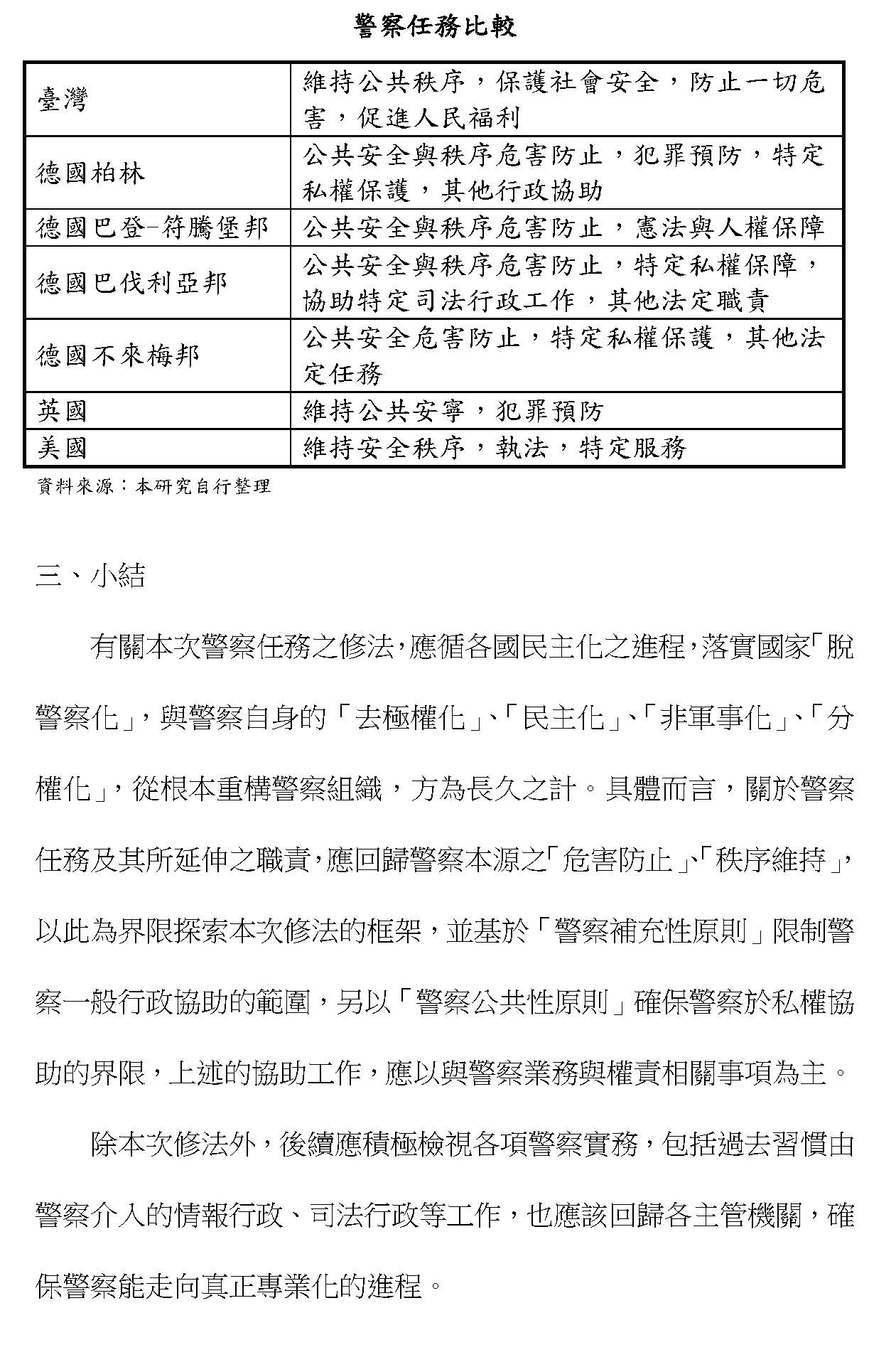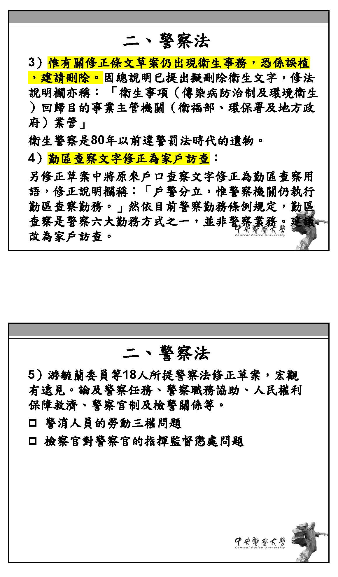 探討到警察法有關警察任務的修法,其實我們的警察任務已經很久沒有變了,從民國42年(1953年)的時候就是這樣的東西,那時候是什麼年代?是一個言論非常嚴格壓制以及國家集權的時代,這個法源已經很久沒有修正了。所以我這邊提議的是,如果要真的落實到所謂戰後警察任務變遷,應該要執行的是以下四個原則:除了國家的脫警察化之外,就是警察的去極權化、非軍事化、民主化以及分權化。尤其像臺灣現在很多警察的業務其實都是過去舊警察法的框架,但其實在國外來說,像德國,他們在情報行政方面早已把它排除在警察的職權範圍,另外再去成立專門機構,但在國內還是把它納入其中,所以我認為真的要去落實的話,應該是從這幾個原則去落實警察的專業化及一般化。
