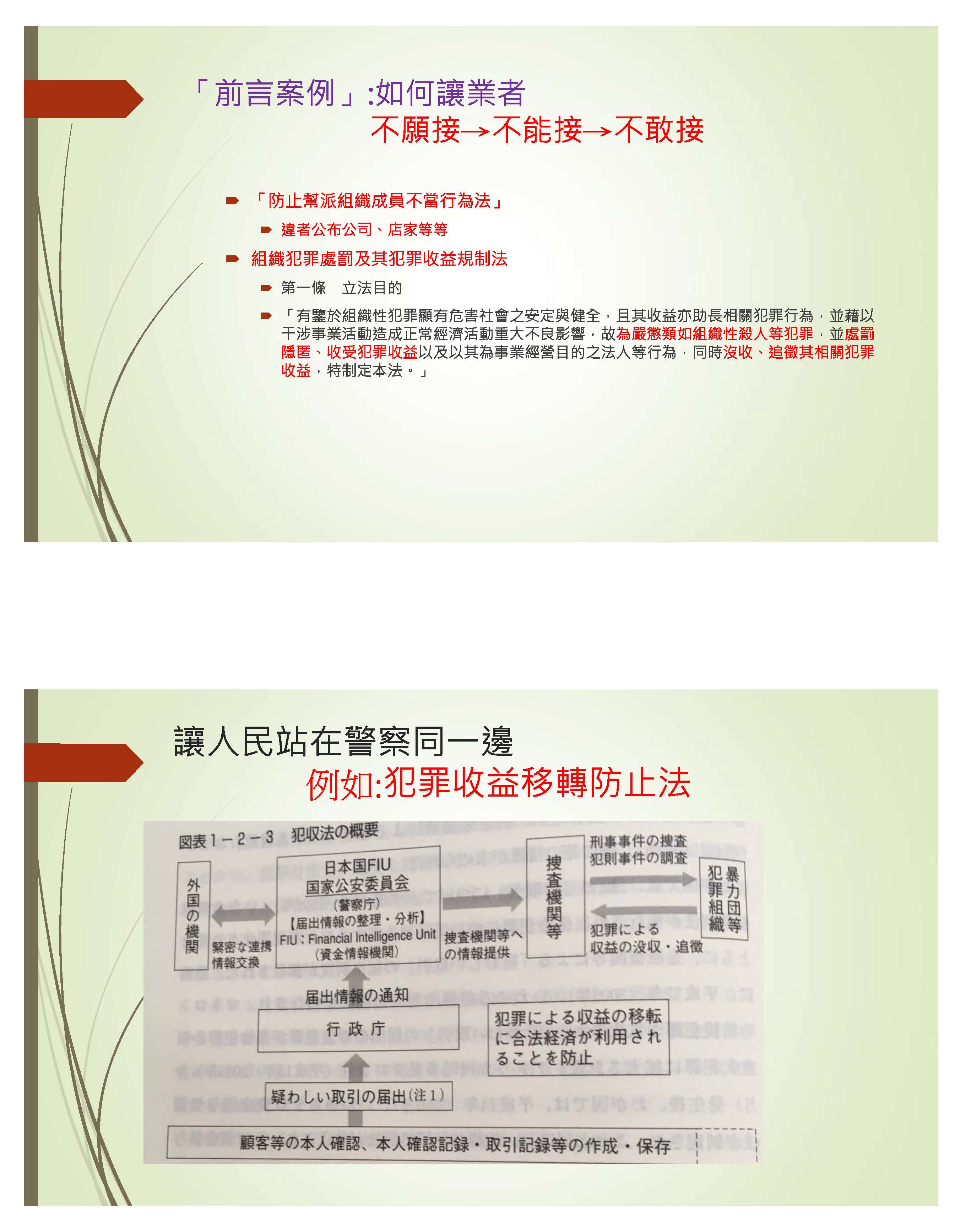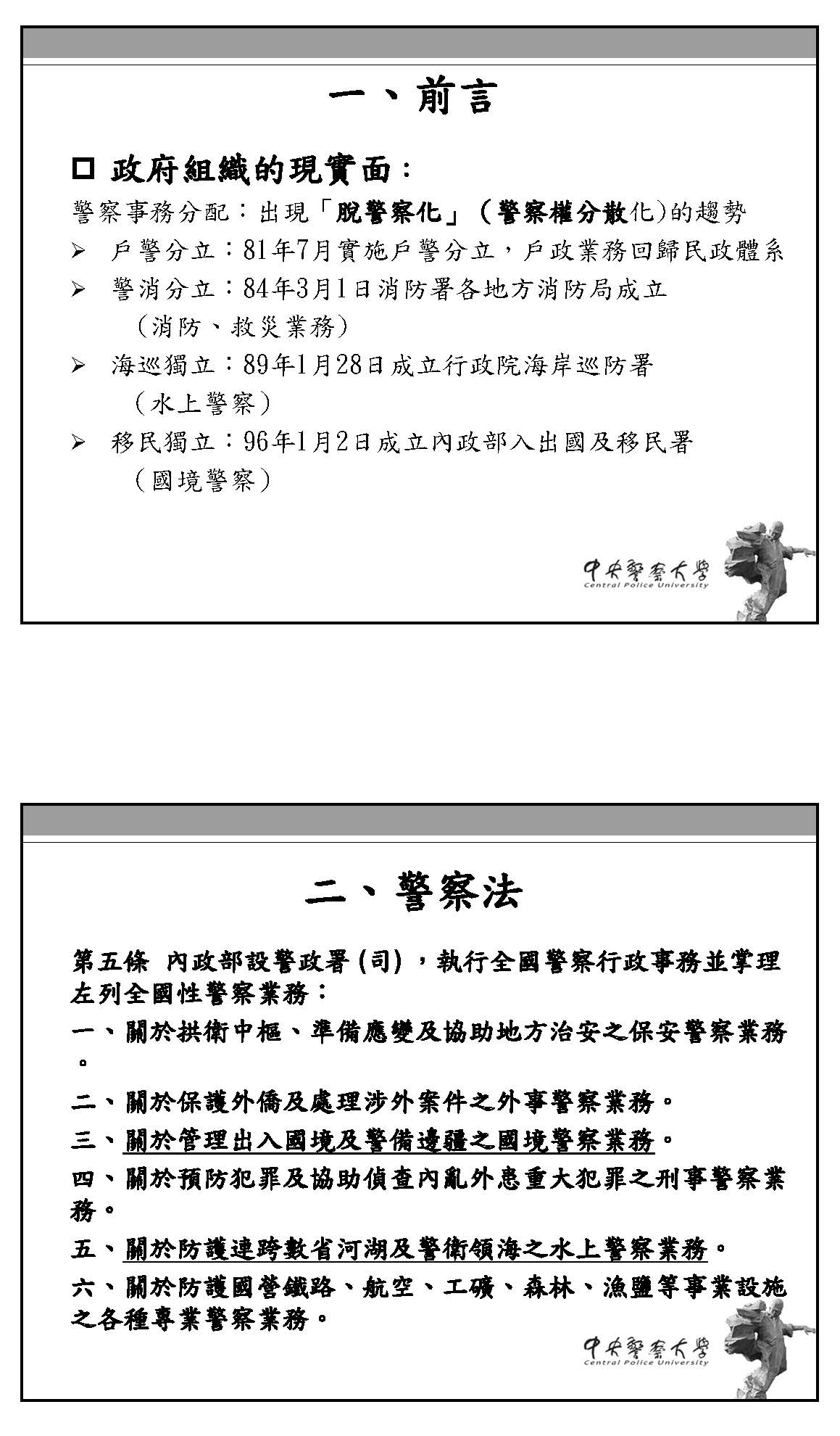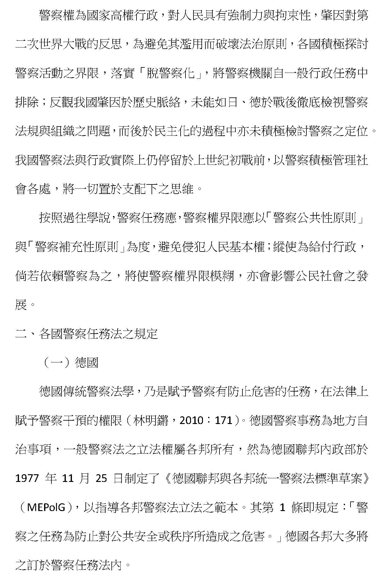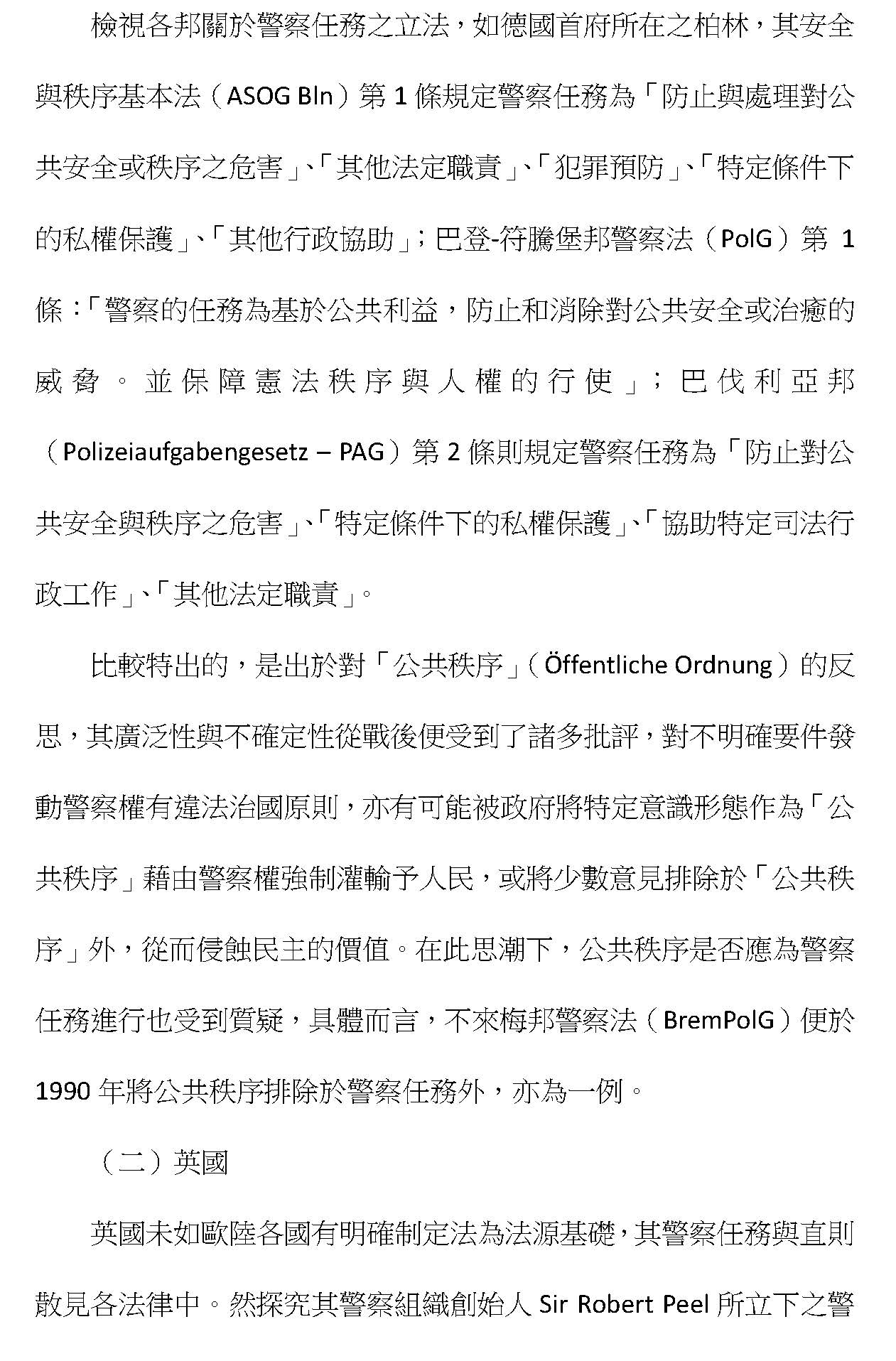 探討到警察法有關警察任務的修法,其實我們的警察任務已經很久沒有變了,從民國42年(1953年)的時候就是這樣的東西,那時候是什麼年代?是一個言論非常嚴格壓制以及國家集權的時代,這個法源已經很久沒有修正了。所以我這邊提議的是,如果要真的落實到所謂戰後警察任務變遷,應該要執行的是以下四個原則:除了國家的脫警察化之外,就是警察的去極權化、非軍事化、民主化以及分權化。尤其像臺灣現在很多警察的業務其實都是過去舊警察法的框架,但其實在國外來說,像德國,他們在情報行政方面早已把它排除在警察的職權範圍,另外再去成立專門機構,但在國內還是把它納入其中,所以我認為真的要去落實的話,應該是從這幾個原則去落實警察的專業化及一般化。