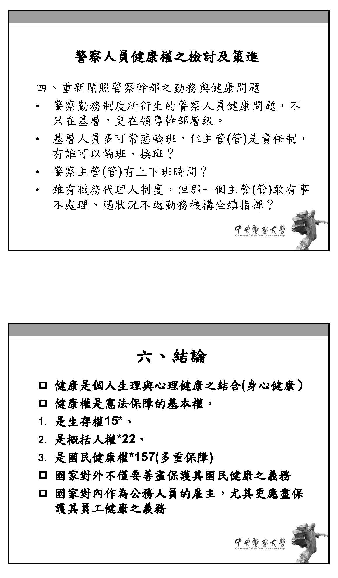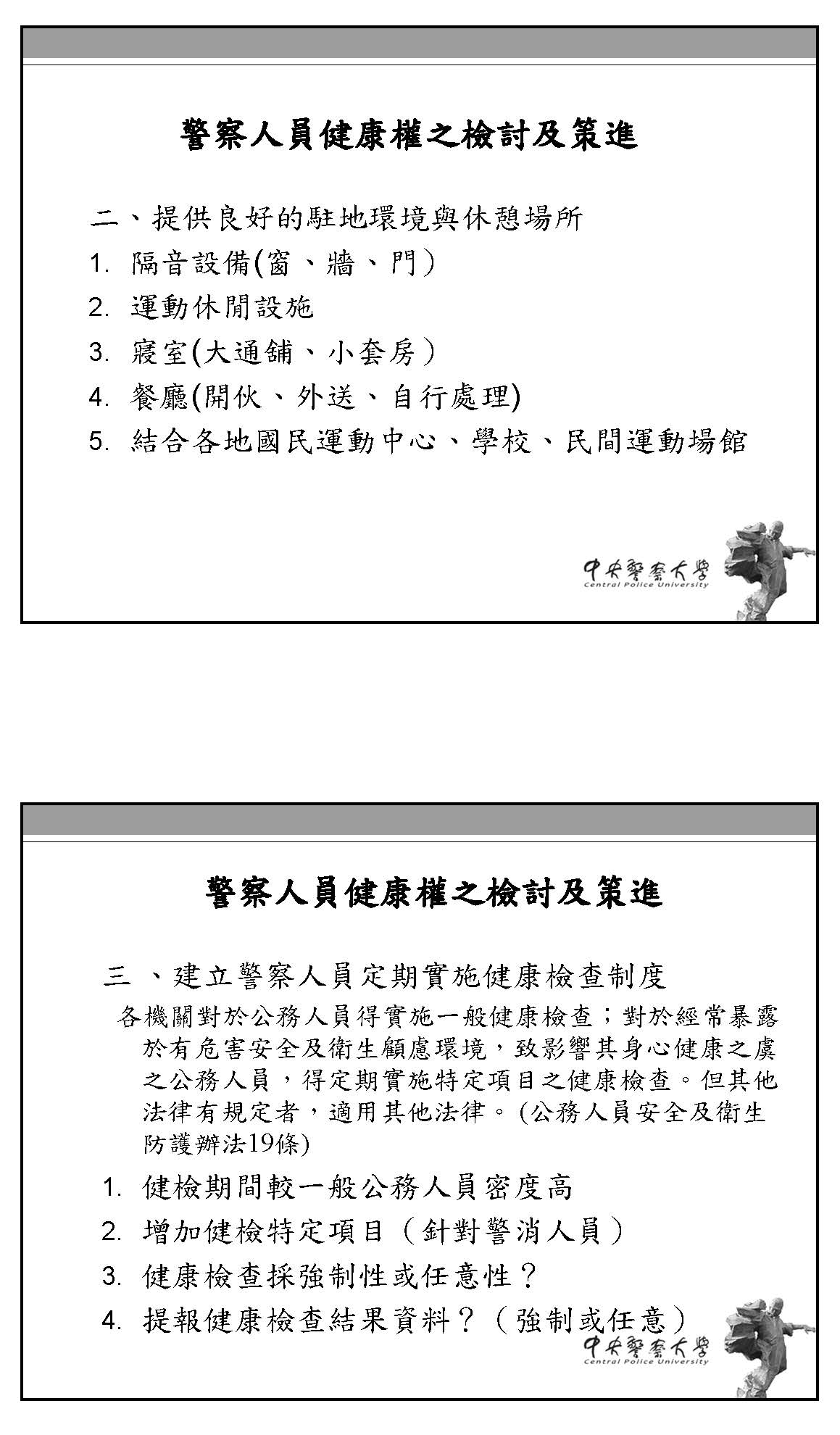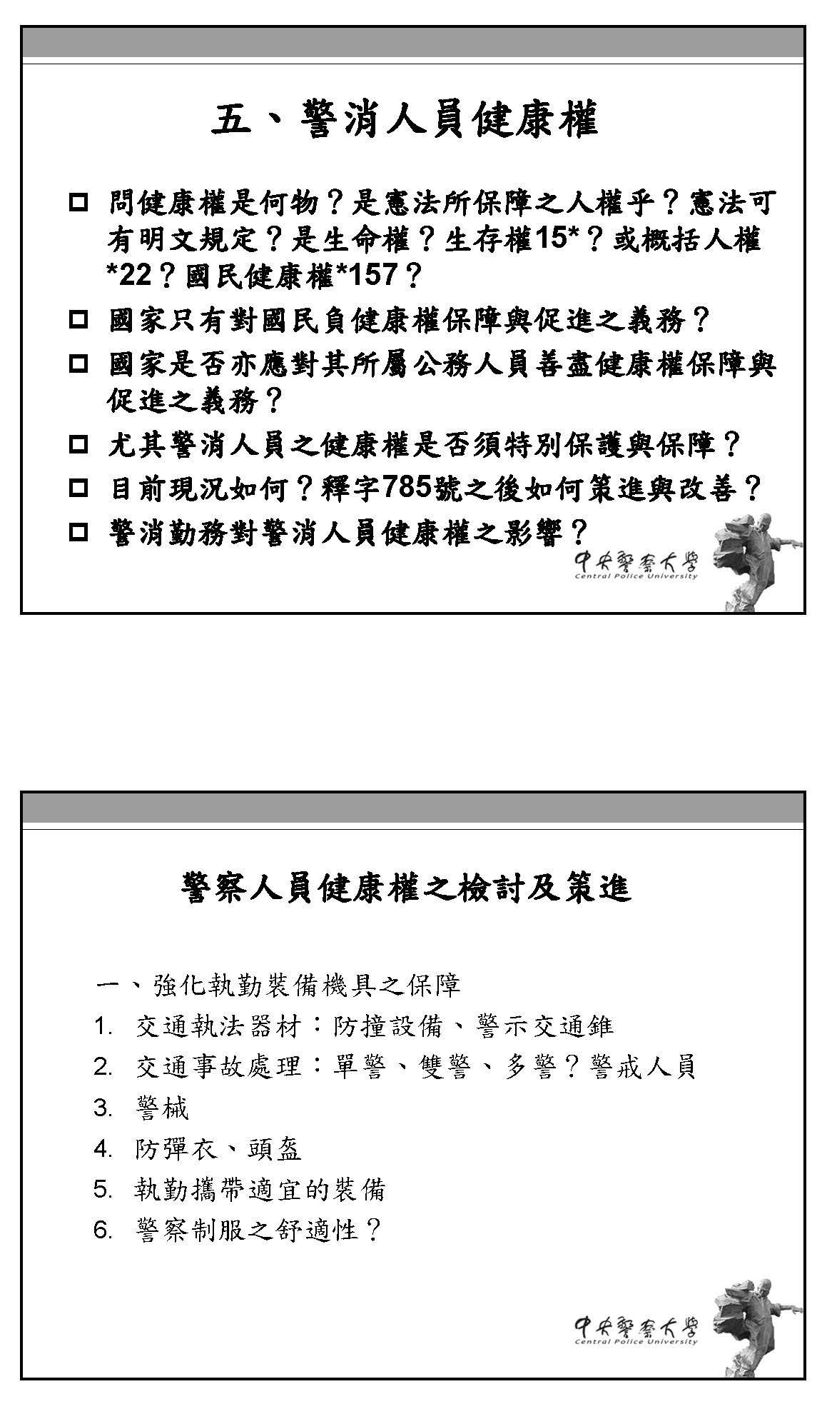 有關同仁健康權的部分,事實上在第785號解釋以後,行政院還有相關部會都訂定相關規定,警政署事實上在今年上半年也訂定規定,執行以後也發現一些問題,所以我們就滾動式檢討,新的規定在今年9月1號要開始。前一陣子,行政院人事總處跟內政部的長官也到苗栗縣警察局實地瞭解,這一部分如果有可以再精進之處,我們一定會持續就實際發生的問題或者困難之處來精進。