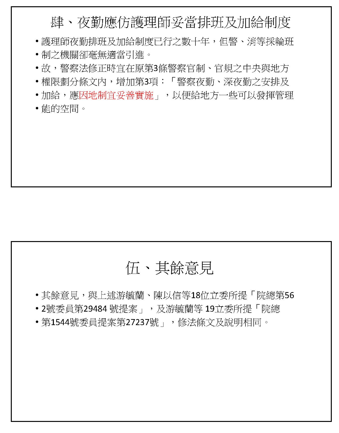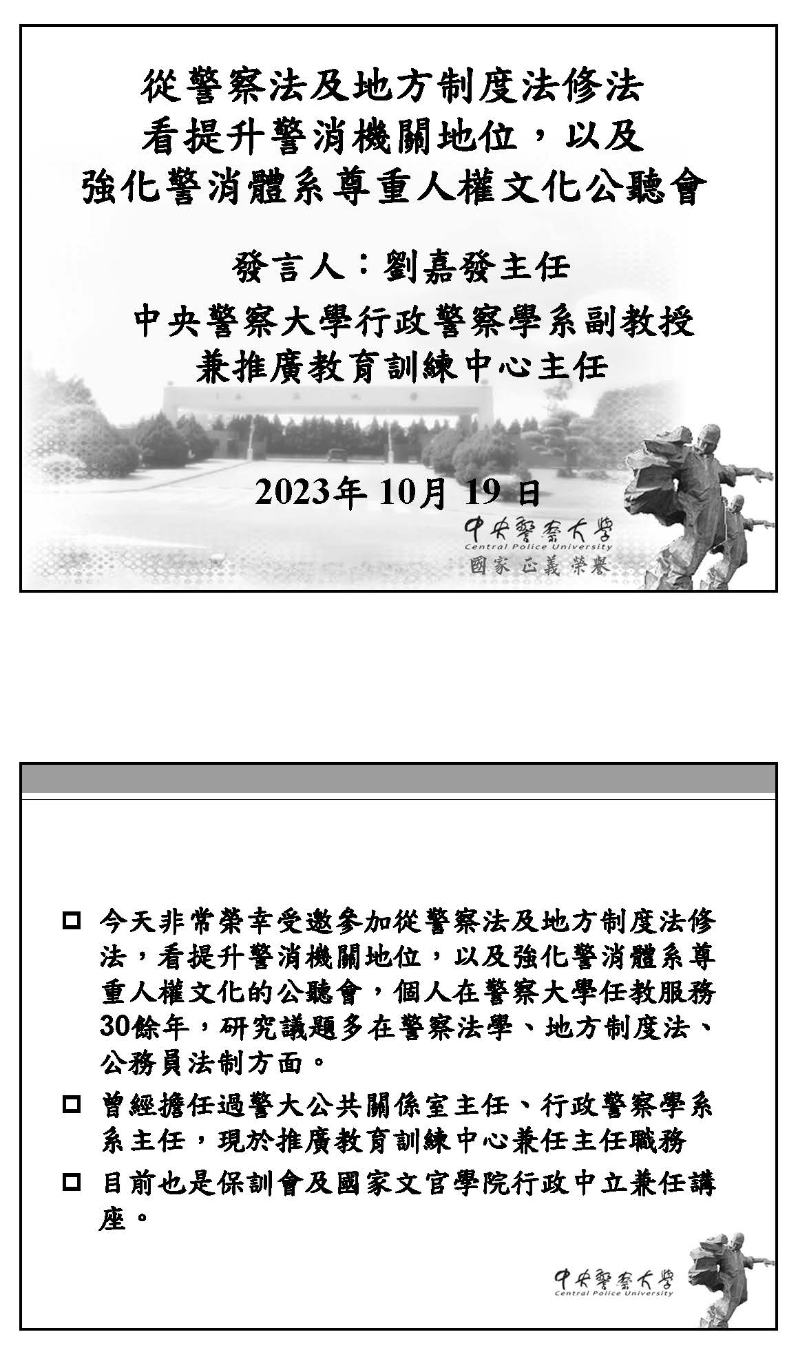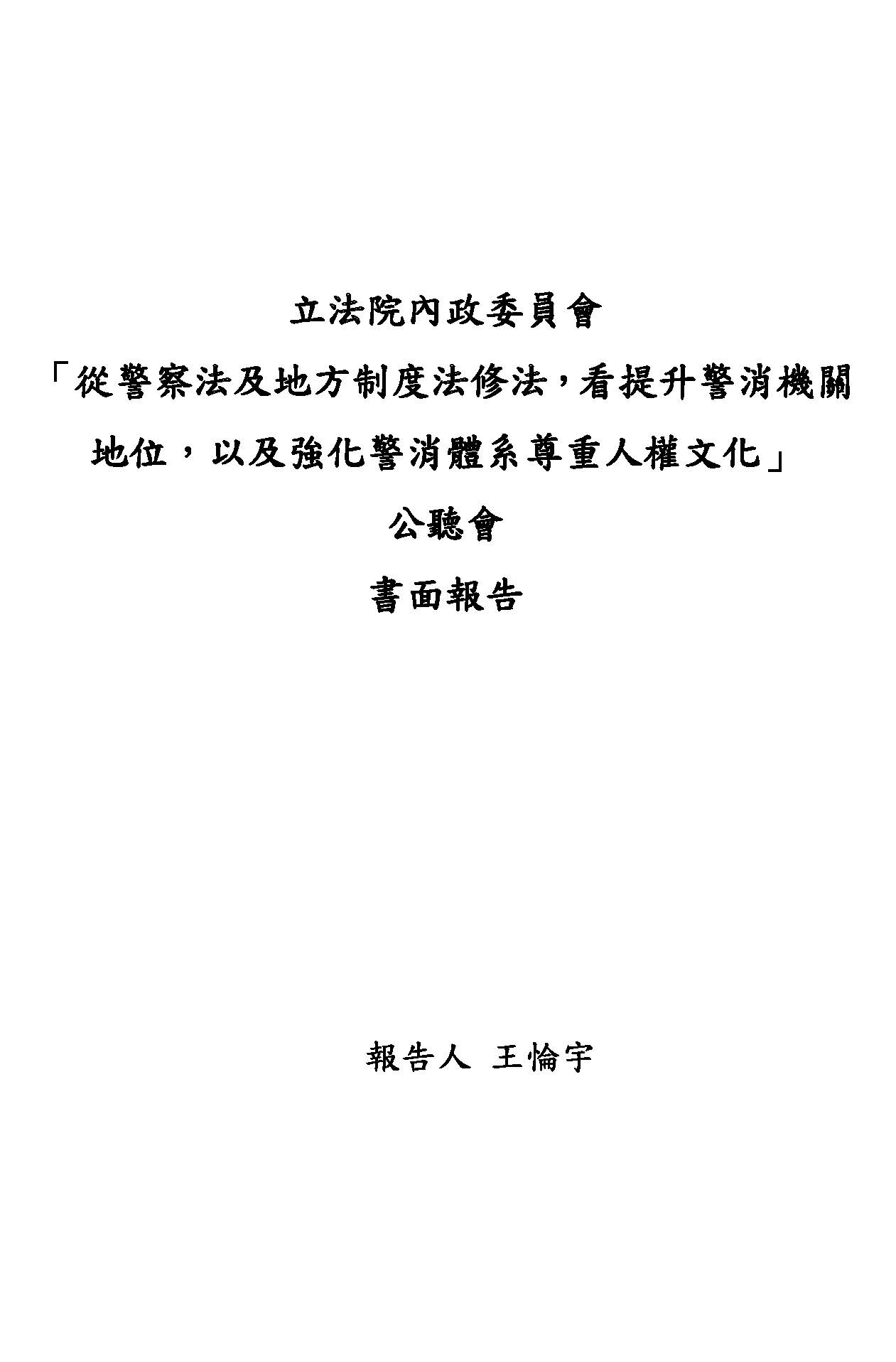 陳副署長永利:主席、各位委員、各位先進。今天貴委員會召開「從警察法及地方制度法修法,看提升警消機關地位,以及強化警消體系尊重人權文化」公聽會,本署奉邀前來列席深感榮幸。謹就本次公聽會討論提綱,報告如下,敬請指教: