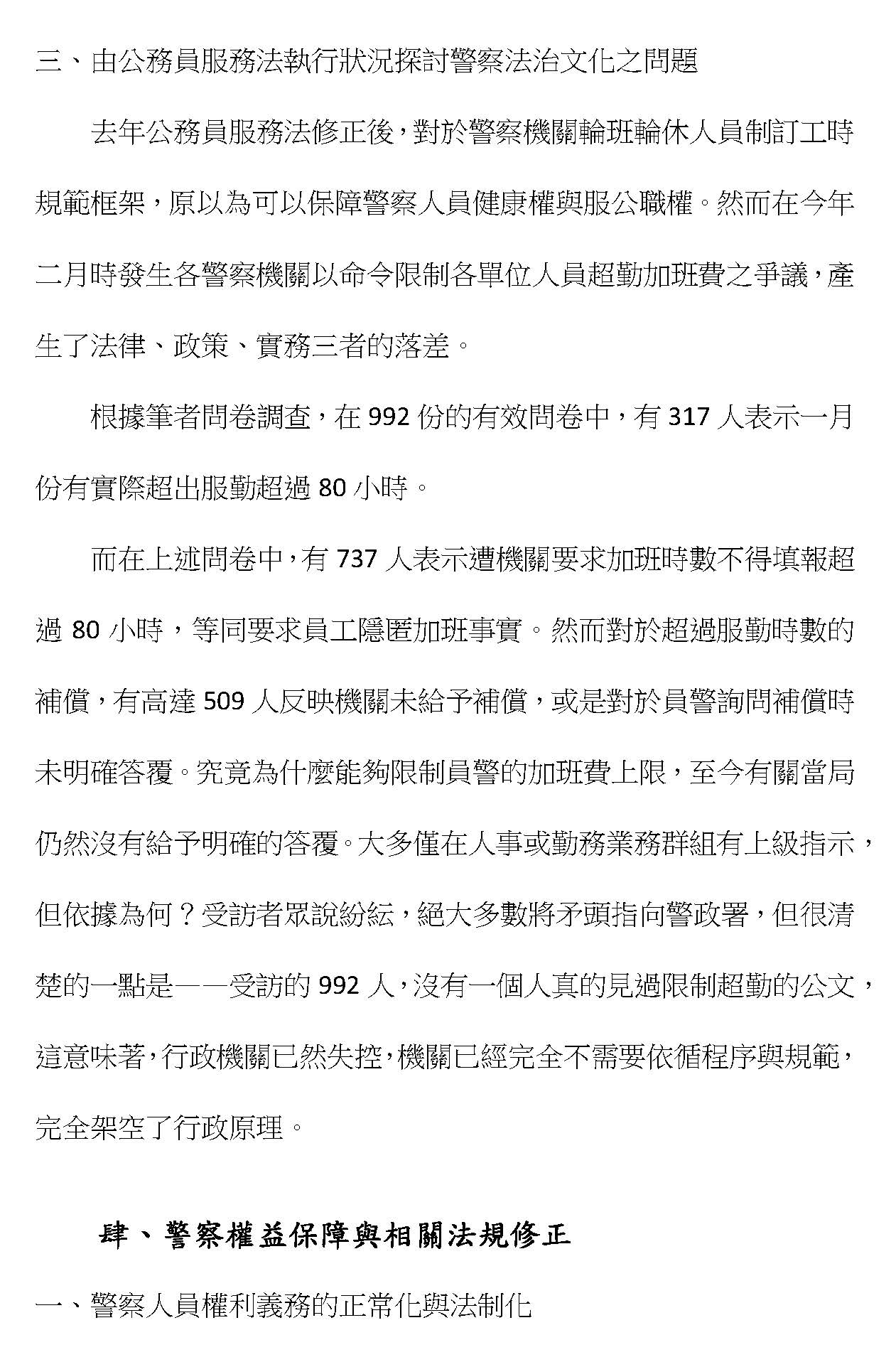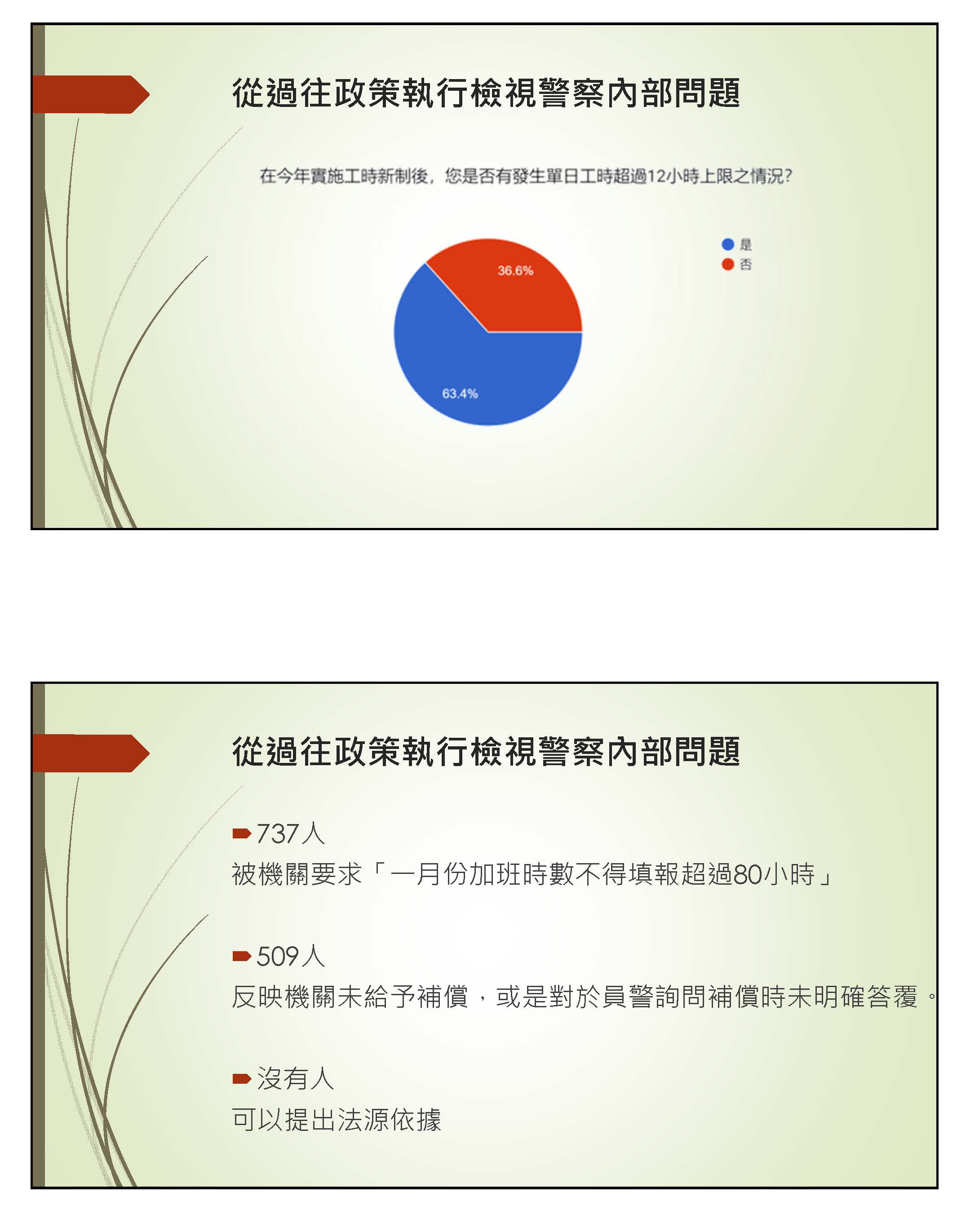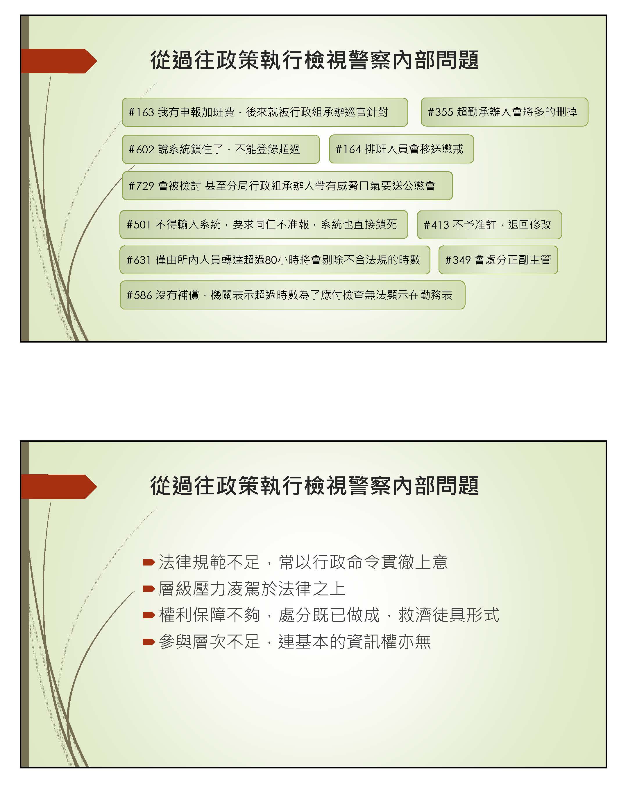 我再回到一個實務上的狀況,銓敘部的人也在場,我要做一個公服法的回顧。今年我曾經對公服法修正以後的施行狀況做了一個實證調查,我蒐集到九百多份問卷,反映第一線人員的執勤狀況,發現目前加班時數仍然普遍偏高,今年初仍然有非常多人加班超過12小時,而這些東西是法律禁止的,但是反過來講,法律有課予主管這些責任以及違法的後果嗎?這個法律的修訂變成,按照勞基法的概念去解釋的話,是給雇主權限,自己制定工時上限,然後自己監督自己,這個是非常𢎨詭的。在這個調查裡面,這麼多人被機關要求不能填報超過80小時上限的加班時數,他們是被要求虛報超時工時的!結果沒有人知道法源是什麼!這份問卷的調查對象包括二線三星的高階人員,大家都沒有聽過到底為什麼有這樣的法源可以禁止自己報加班費!這表示什麼?這表示我們行政機關慣常使用行政命令去架空立法院的職權。今天就算立法院真的從法源建構一個完整的母法,我們把任務、業務都正常化之後,執行是怎麼樣的?會是什麼樣的階段?所以我自己認為的是,要如何真的去建構正常的體系,還包括像剛剛講到的正常勞資參與架構,如果今天在法律規範不足的情況之下,要去保障警察人員權利的話,就要讓考核制度正常,考核、行政處分等相關程序都要明確,讓員警有救濟的權利以及參與層次的提高。最基本的資訊透明權是必要的,就如同前大法官湯德宗提到的,資訊公開是一個民主的基本,如果我們要增進組織內部的民主化,這應該是我們要去落實的,要能夠讓員警知道目前的相關規範,讓他們參與制定,甚至是勤務的規劃也會讓員警有進一步的參與空間,避免那些所謂高層不正當或是無效益的勤務分派,甚至是違法的政策,都應該能夠讓基層有相應的保障權限去做參與。以上是我的報告,謝謝大家。
