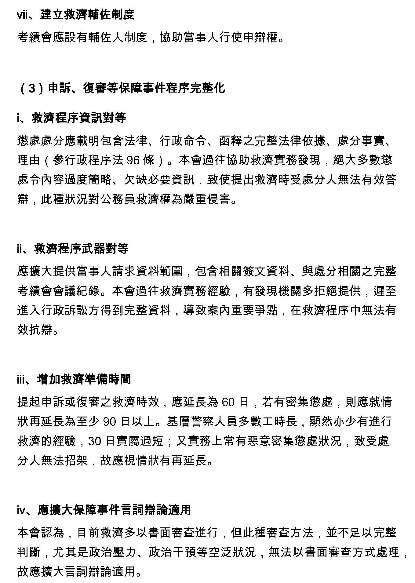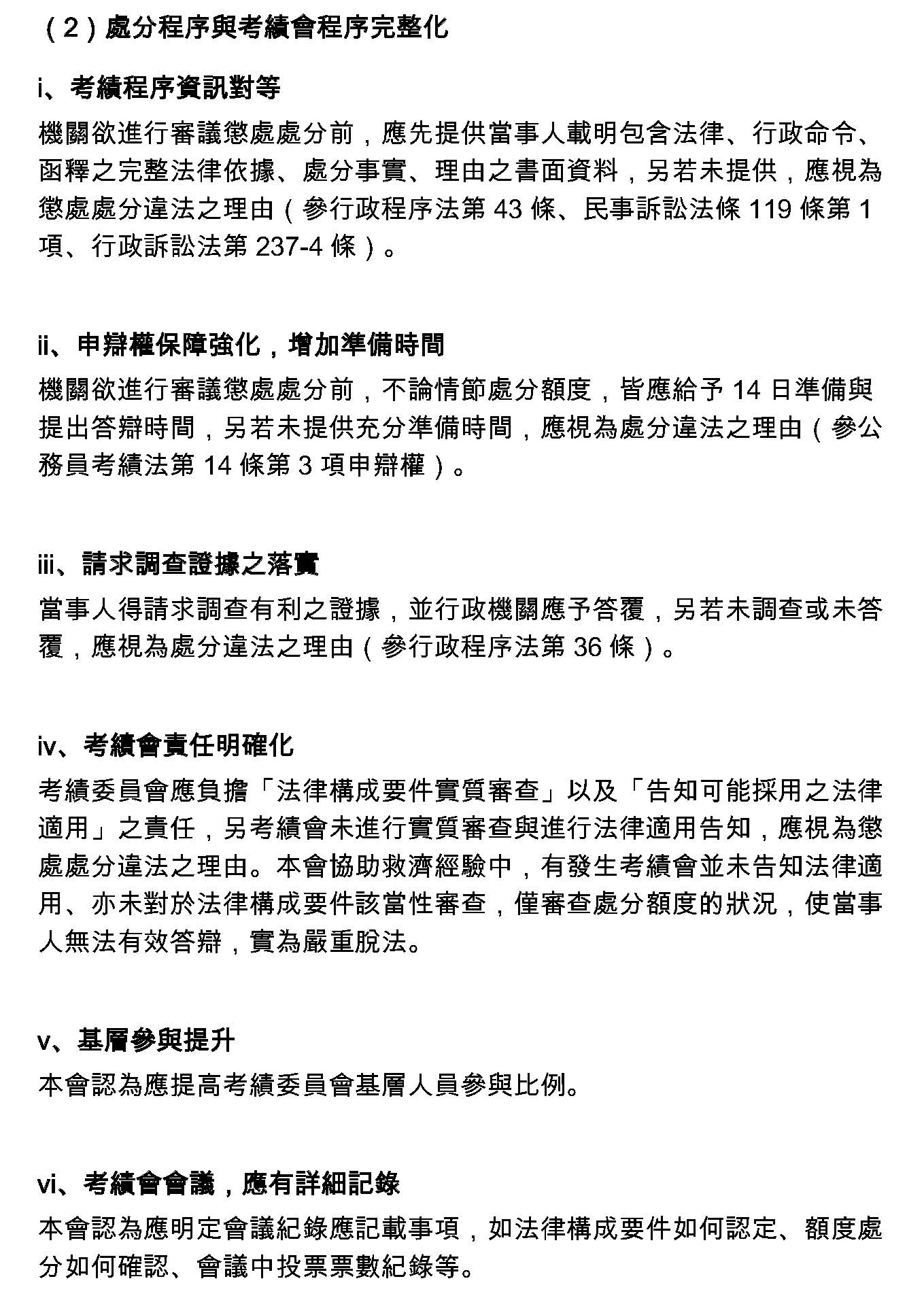 另外,剛剛有特別提到111年憲判9號這個部分,它是涉及公務人員考績法和公務人員懲戒法。有關懲戒懲處並行的這個問題,剛剛何理事長提到的就是,是不是可以針對違失行為的性質做區隔,然後再作不同的懲戒懲處方式?這部分跟部裡目前規劃的方向頗為一致,但是這部分因為同時涉及懲處權,也就是行政權的完整性和司法懲戒的權限,所以我們跟司法院行懲廳、人事總處也組成了工作圈,現在三邊意見在交集、取得共識當中,所以剛剛何理事長的建議我們之後也會一併納入考量。