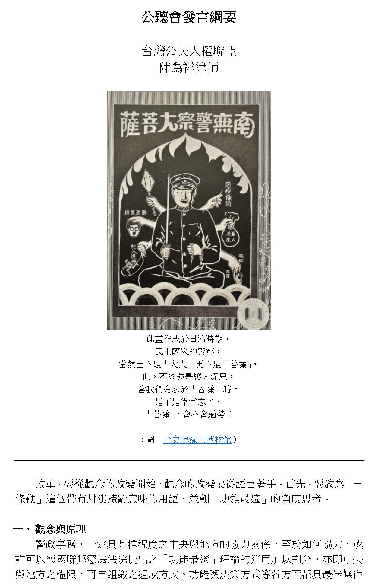 陳為祥常務理事:主席、游委員以及在座所有的先進大家早,不過也快接近中午了。其實我的很多話都被鄭文龍講過了,我想先請大家看一下我事先準備給公聽會來用的一張圖,從這個就可以很確切地表達出整個臺灣警察的處境。這是在日本時代人家畫的,這個叫什麼?南無警察大菩薩,裡面就是一個著警裝的警察,一手拿劍,一手拿念珠,表示警察是握有武力,但是他又要慈悲為懷,扮演一個所謂的菩薩,看起來是一個非常有武力、非常強大的系統才對。可是現實上我們都知道,剛剛很多先進都講了,臺灣可能因為制度上以及各種原因,導致警察其實在所有行政部門已經被弱化了,大家都想要掌握,因為這是除了軍隊以外唯一合法的國家武力,又掌握犯罪、消防等等,所以大家都想要來掌握。所以現實上面就導致警察變成是最弱的,他本來應該是最強化的,結果他被弱化了。