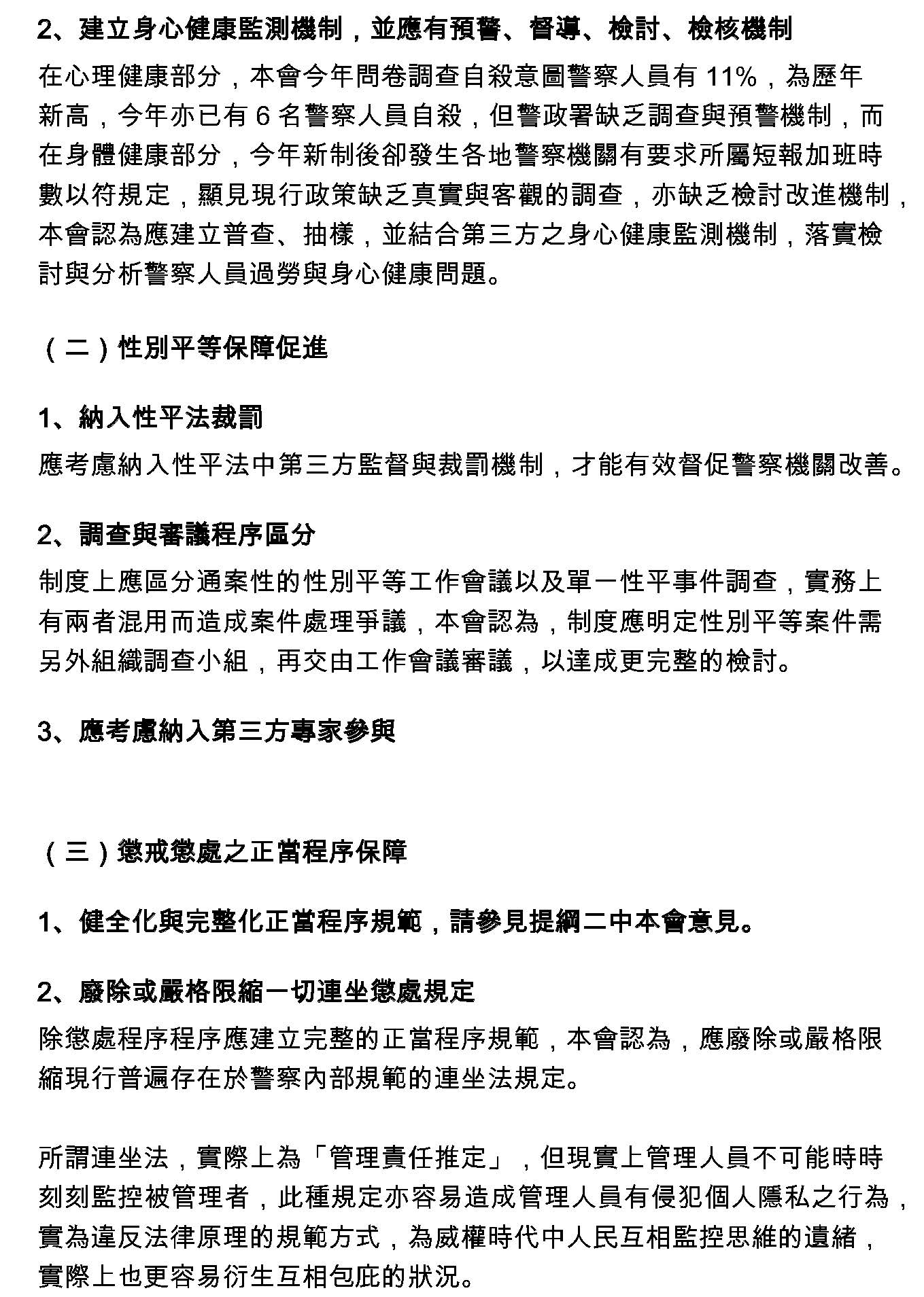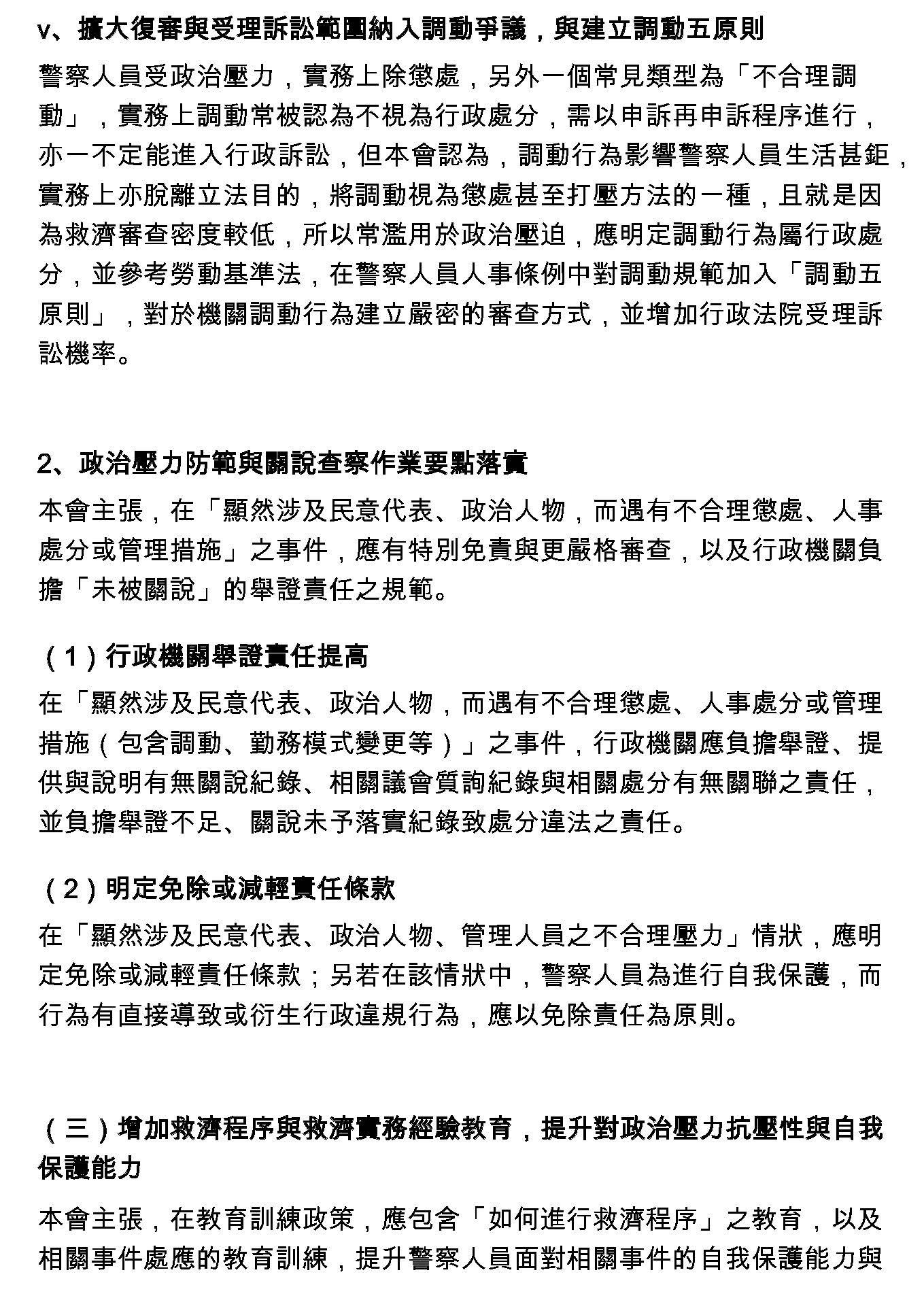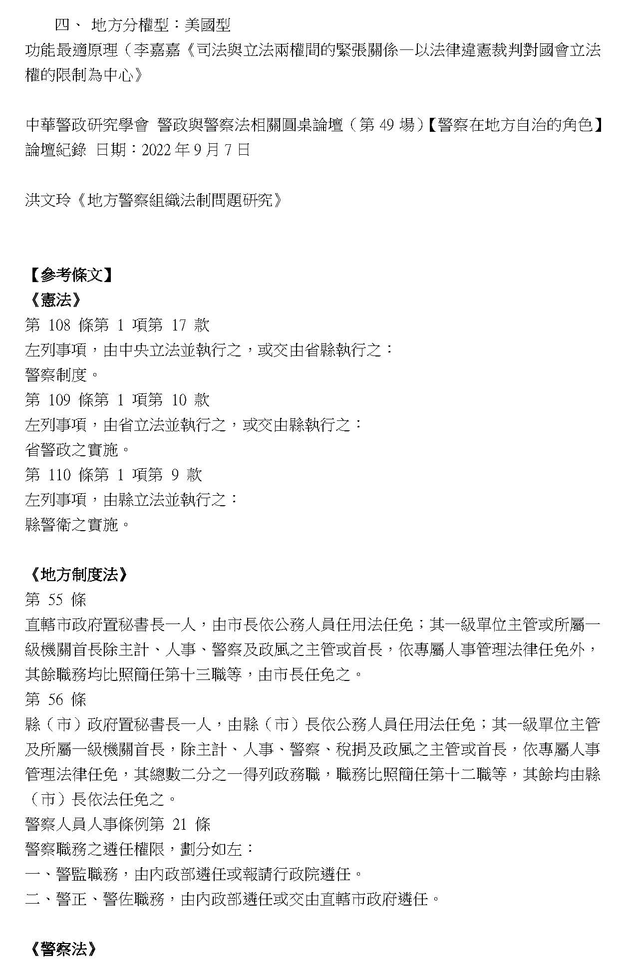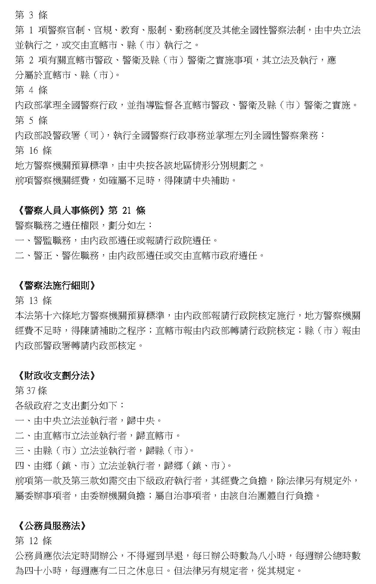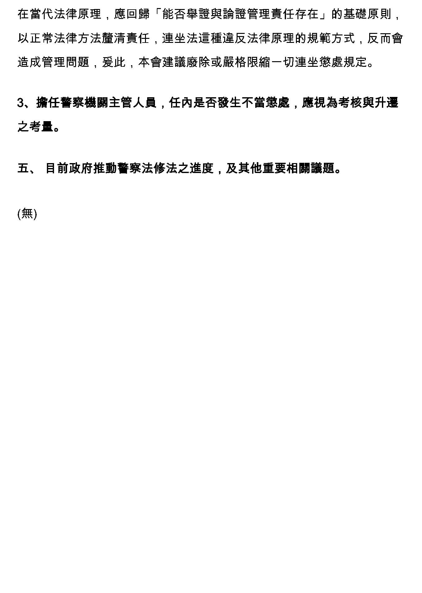 (四)本次討論議題涉及警察機關組織調整、人事制度、行政中立、職務規劃、警察法規定等,涉及其他相關部會專業權責,本部尊重貴委員會討論結果。