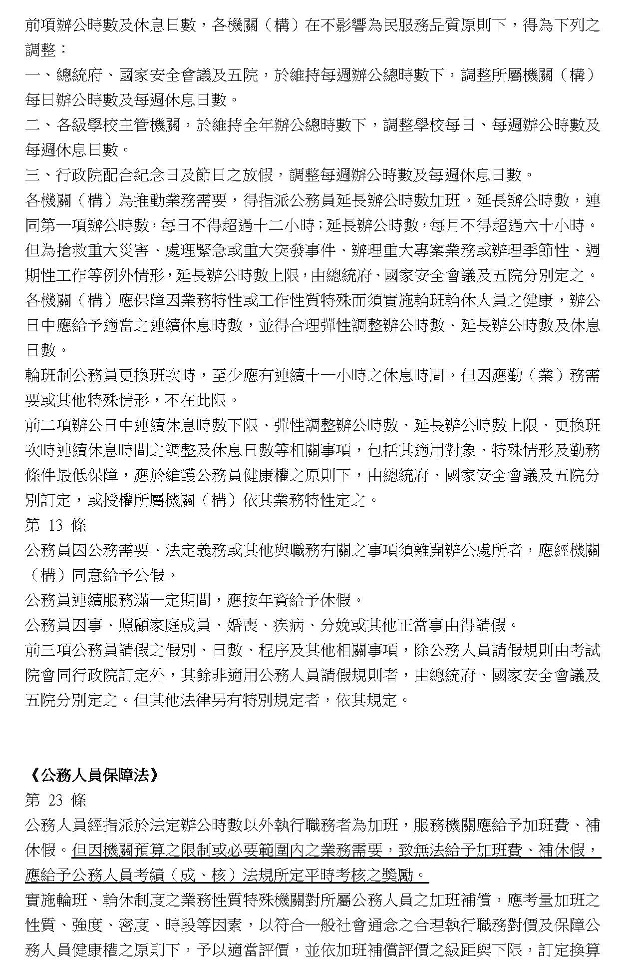 提到公務員服務法的部分,大概是在勤休制第十二條的規範,服務法第十二條對於勤休方式基本框架式的規範,其實最主要是針對一般公務人員,因為勤休制、輪班輪休制的公務人員種類非常多,每一個業務性質不同、執勤方式迥異,所以在服務法十二條的設計是授權由各主管院做進一步的細部規範,在本法的條文上面只有針對換班的時候基本要有11個小時的休息時間。剛才提到的加班或是細部的服勤方式都在各個主管院訂定的服勤辦法裡,或是再進一步授權到各主管機關訂定詳細規定。今天人事總處主管處的周處長也在場,所以等一下周處長大概也會有一個適足的回應。我們都尊重各主管院和授權各主管機關訂定的一些框架式規範,但是最基本的原則,我們在服務法上授權的時候有要求,要在符合維護公務人員健康權的前提之下去做細部的規定,這是第一點回應。