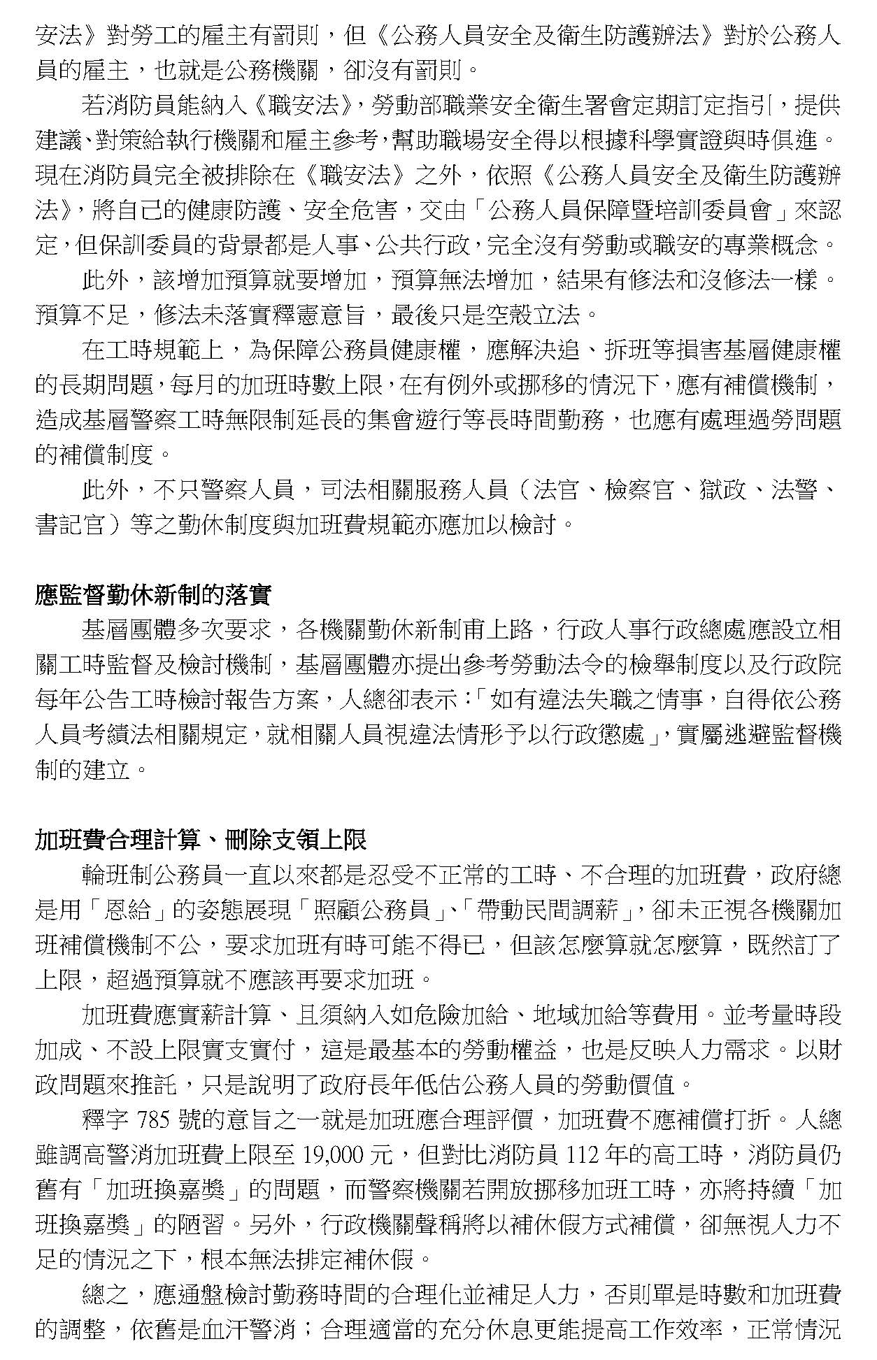 一、健康權部分,為保障公務人員健康權,銓敘部主管之公務員服務法第12條已明定每日、每週工時上限,本會基於保障公務人員於法定辦公時數以外時間加班工作之權益,業依司法院釋字第785號解釋意旨,就加班補償制度建立合理框架性規範,落實補償方式實質化、值班制度加班化、加班補償合理化、補休結算覈實化及授權框架彈性化等五大政策目標。對於實施輪班、輪休制度之業務性質特殊機關人員(如警消人員)之加班費,尚得由行政院訂定之「各機關加班費支給辦法」訂定其加班費評價換算基準。本會將持續關注警消人員健康權益事項,適時滾動檢討調整。