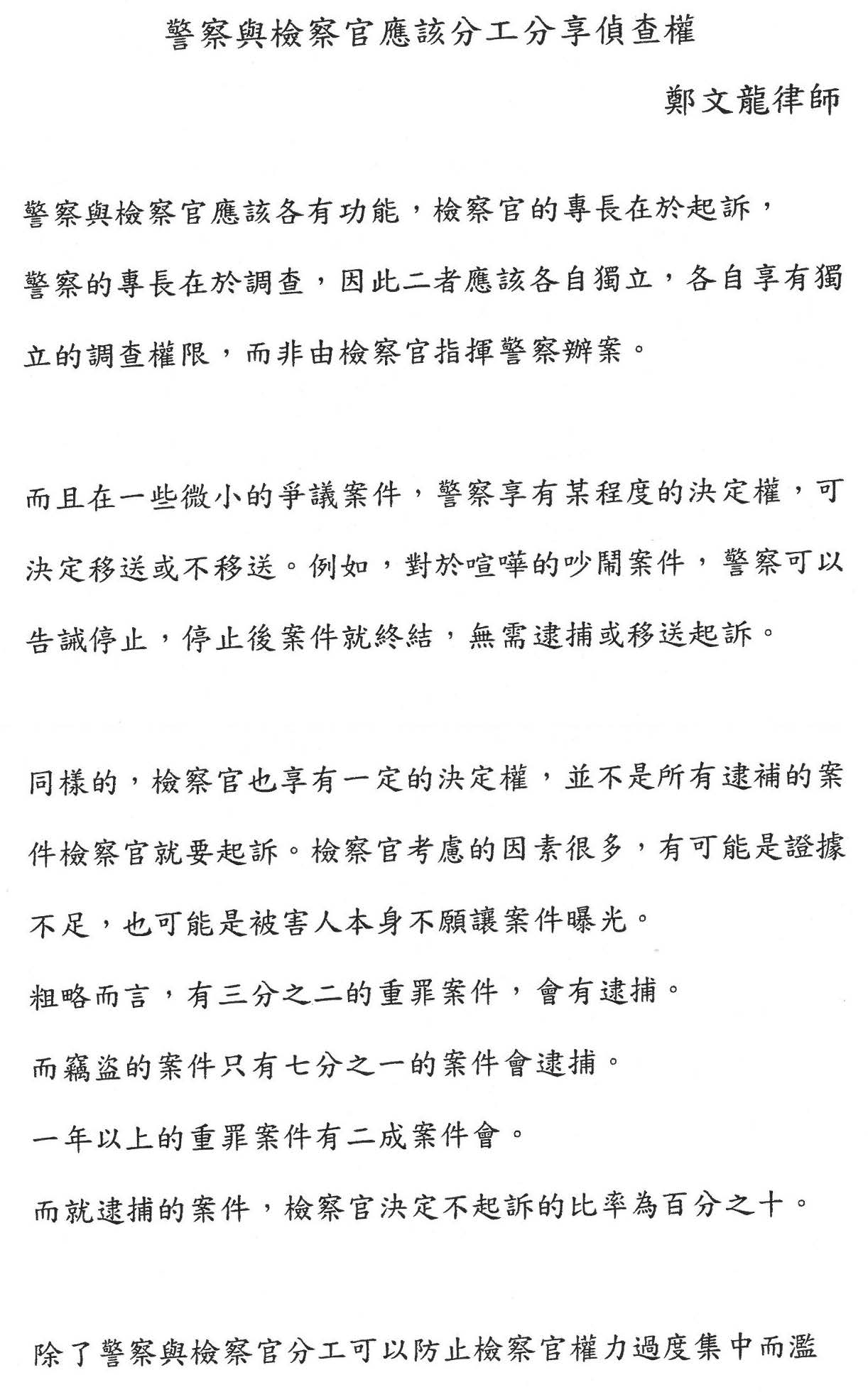 我常常講臺灣的檢察系統是一個三位一體的龐大系統,所以我們才會一直覺得怎麼警察系統在偵查犯罪裡面變成小弟了?但是坦白講,檢察官不就跟律師一樣,都是大學法律系的,從來也沒有念過犯罪偵查,怎麼他一旦考試進去了以後,就變成犯罪偵查專家,可以來指揮警察了?問題是以個案的指揮來講,現在犯罪的型態很多都是持續性的,很多都是組織性的,必須有持續性的偵防,這個都不是檢察官的專長。所以我們認為比較合理的,就像剛剛鄭律師講的,我們應該回到讓檢察官發揮專長,他的專長就是到法院去攻防,他是蒞庭的、公訴人的角色;而警察應該是偵查犯罪的專家,所以他應該著重在整個犯罪的偵查。也就是說,我們要慢慢從現在由檢察官獨占偵查權,過渡到讓警察真正恢復偵查權。
