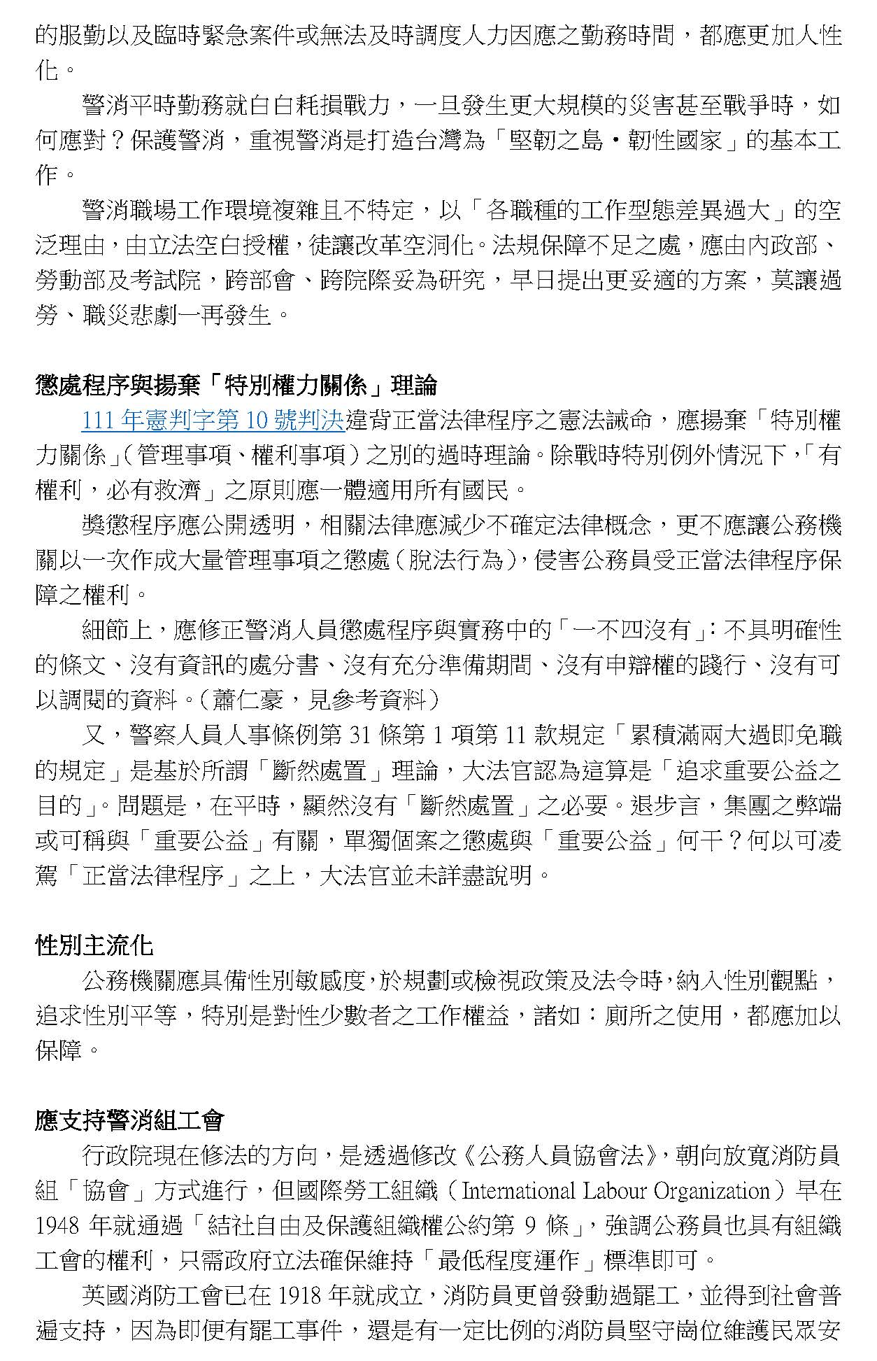 警察法所規範官制官規,應發揮保障服公職及其他各種基本權之功能。臺灣警消任務繁雜並實施輪班制,其勤休新制運作及檢討、健康權、職業安全衛生(含是否適用職業安全衛生法、應勤防護裝備,以及身心健康照顧措施)、性別平等保障、懲戒懲處之正當程序保障(含「員警疑不當進出○○會館私人招待所案」懲處及保障情形)等,如何精進強化?