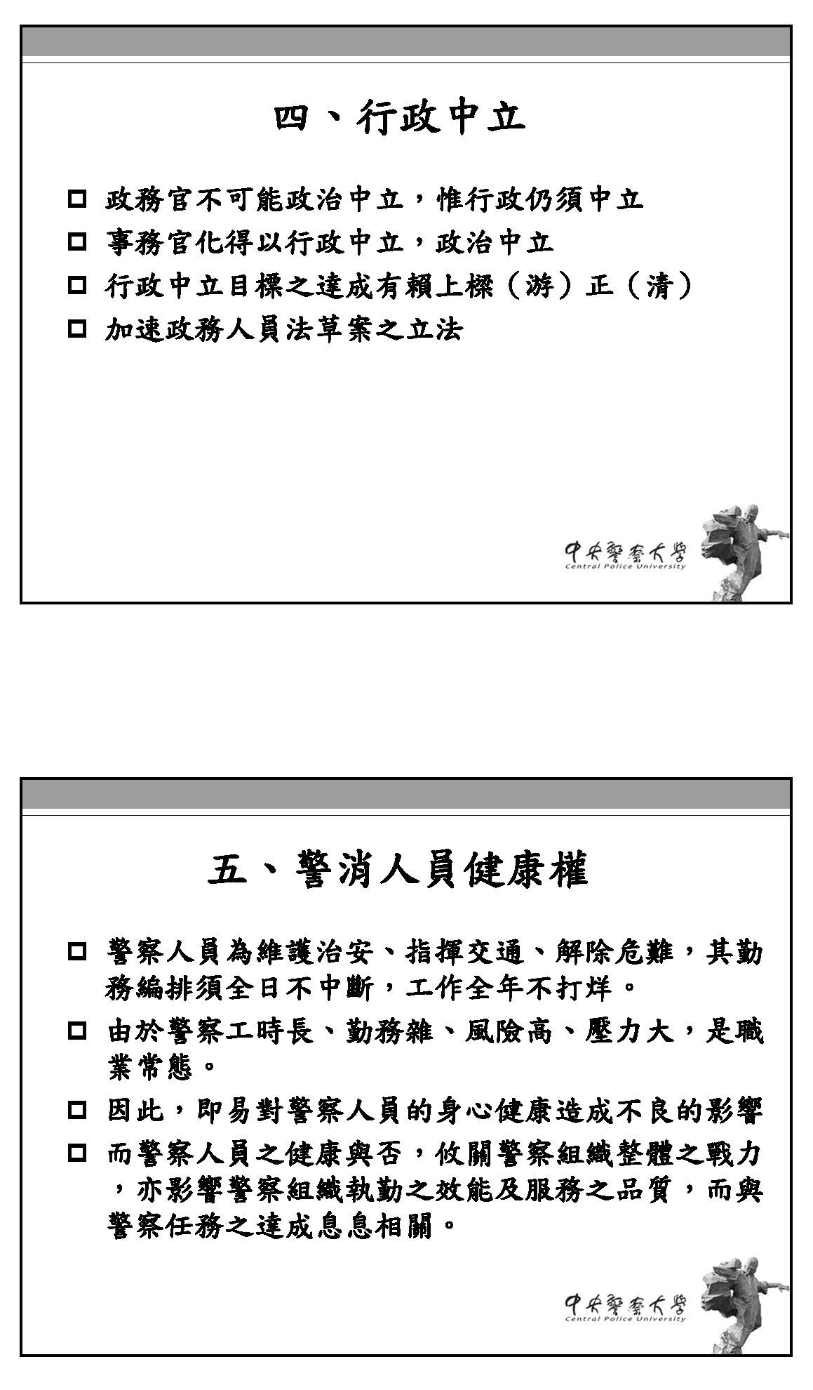 依據公務員服務法相關規定,公務員應謹慎勤勉,且非因職務之需要,不得動用行政資源。又依公務人員行政中立法相關規定,公務人員不得為支持或反對特定政黨或公職候選人,利用職權或動用行政資源從事相關政治活動或行為,亦不得要求他人對於公職人員之選舉不行使投票權或為一定之行使。本署均配合主管機關宣導及轉知公務人員行政中立相關規定,並督屬落實及嚴守行政中立。有關行政中立,一向是我們警政署的要求重點,不論在選舉前或選舉中等等,或者我們平常執行職務等。至於議題之一的修正警察法,我們未來也將行政中立的精神納入修正草案之中。