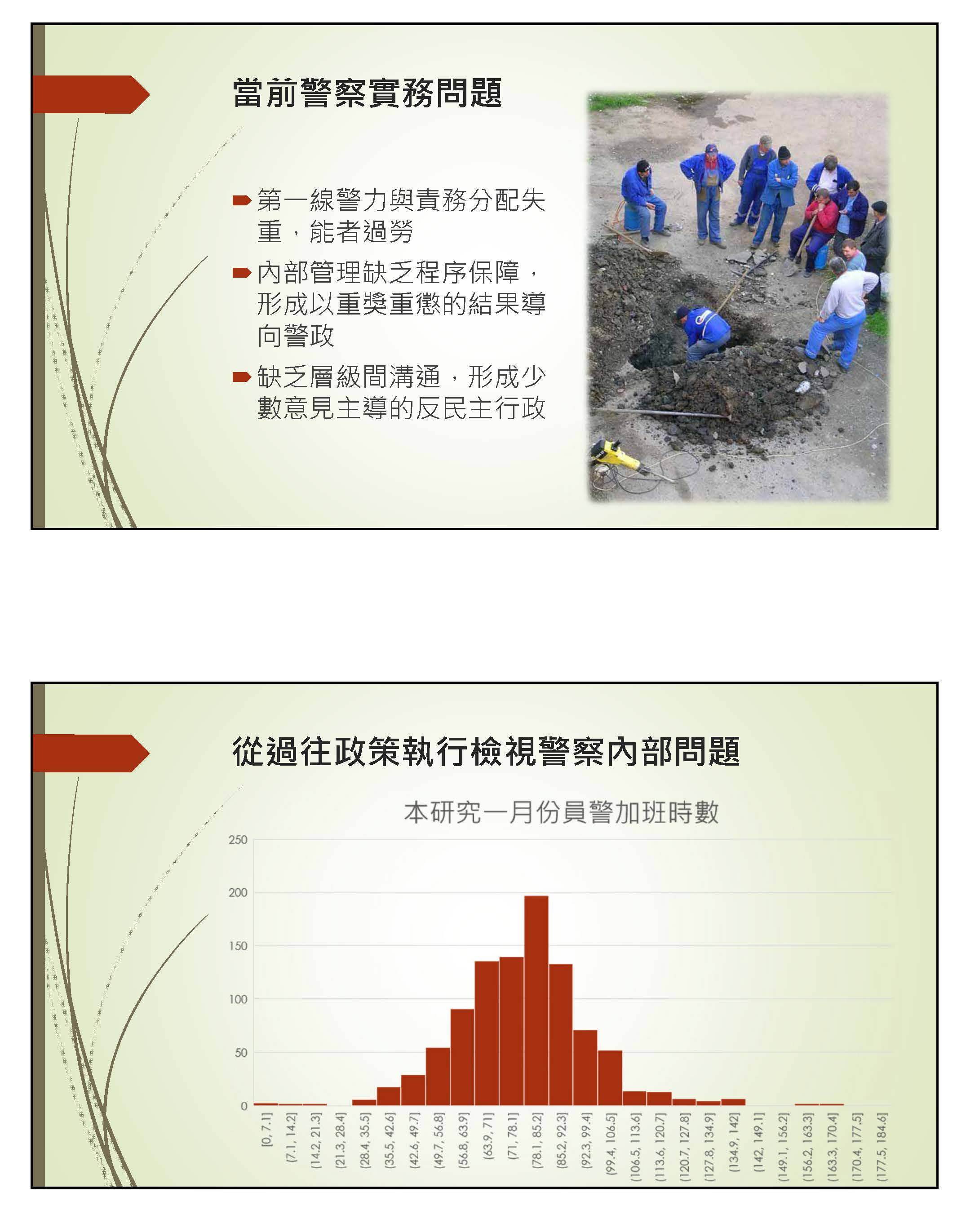 再來是像前面先進所提到的考核程序的建立,以及我所要提到的一點──現在是事權分配不均。以剛剛的臨檢為例好了,現在來說,臨檢假如派個8組人,那我們可能會有十幾個督導人員在上面,這是一個非常奇怪的人員配置方式。但是像剛剛提到的,督查組是一個非常龐大的組織,有很多人力放在上面,所以我們是一個腳輕、頭輕、腹部肥大的組織架構。但是實際上來說應該這樣子嗎?最早巡官這個職位其實他是「巡」官,是外勤員警,而不是內勤業務人員,所以我們現階段的組織配置有很多地方並不符合當初設計的架構,這些都是未來修法時要一併從法源去探討的問題。