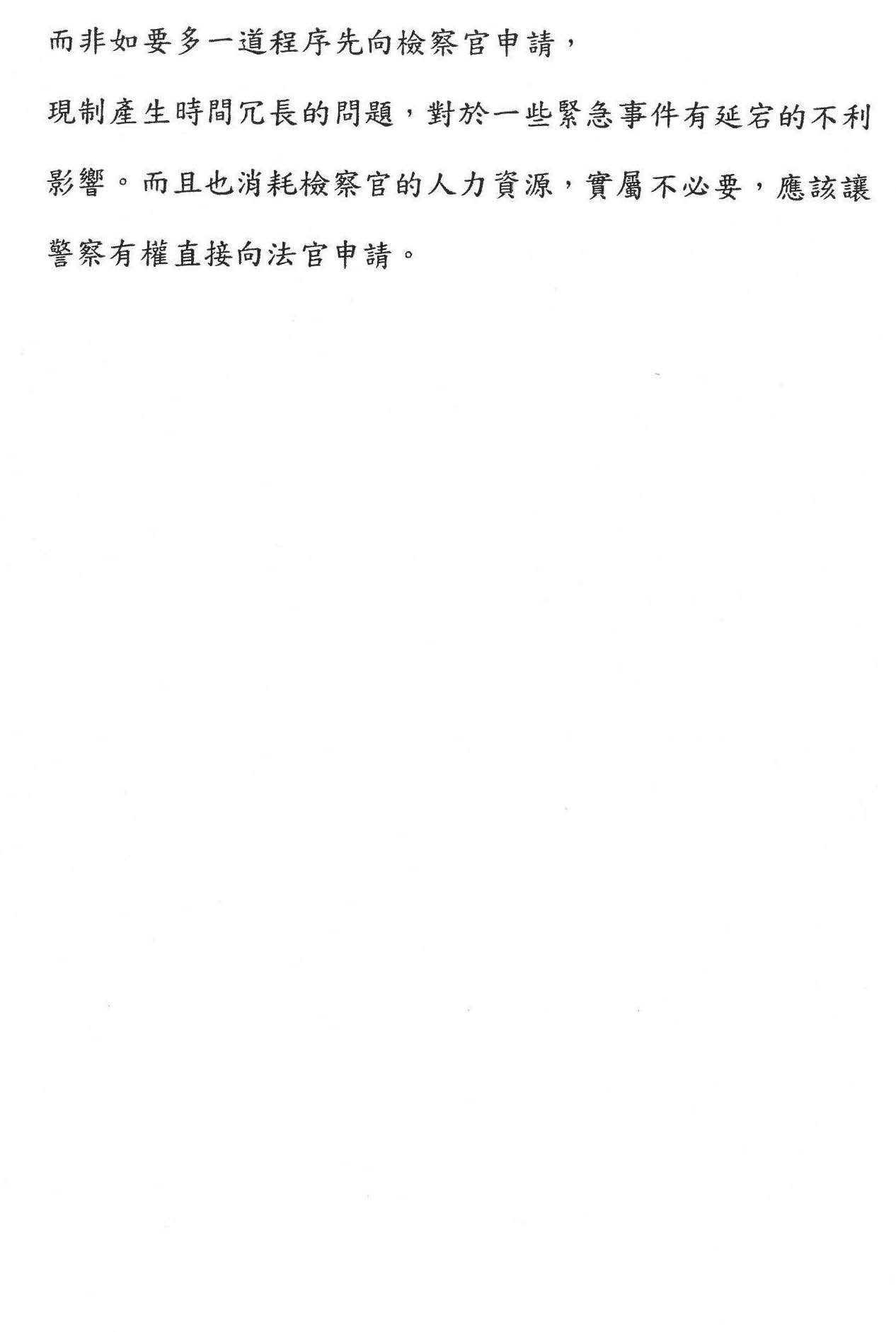 在這個過渡階段裡面,我們事實上也有跟游委員報告,也有提供我們的建議,就是我們可以先小幅度地修正刑事訴訟法,把微罪的譬如五年以下大概都是一些酒駕、竊盜、詐欺很例行性、一般市民生活會碰到的犯罪,不是非常複雜,本來就是警察在辦的,是不是讓警察把它辦到比較完整,中間如果需要聲請令狀、要搜索,就直接由警察向法院來聲請?但是現在不是,現在警察因為偵查犯罪要聲請一個搜索票,他要先去拜託檢察官,那檢察官也不是24小時等你來跟他聲請,事實上都有延宕整個犯罪偵查。既然都是法官在控制,為什麼要經過檢察官?其實沒有人想得通,他們自己又說工作很多,既然工作很多,為什麼做這些沒有意義的事情呢?而且警察應該要一個案子辦到已經確信要不要起訴了,甚至在日本,微罪的不起訴處分權要適度地讓警察來,因為有些一看就是完全不可能構成犯罪,為什麼還要全案移送檢察官再重新來一次呢?這個都不大合理。所以我們認為應該是在刑事訴訟法裡面做一個過渡性的局部修正,同時賦予警察也有偵查犯罪主體的權力,讓他可以直接聲請法院令狀。五年以下的人犯也不需要移送,以現在來講,被抓到酒駕,一吹就超值的,在警察局做完筆錄以後也不能回家,還要等檢察官,搞不好搞到明天耶!都非常地不合理。