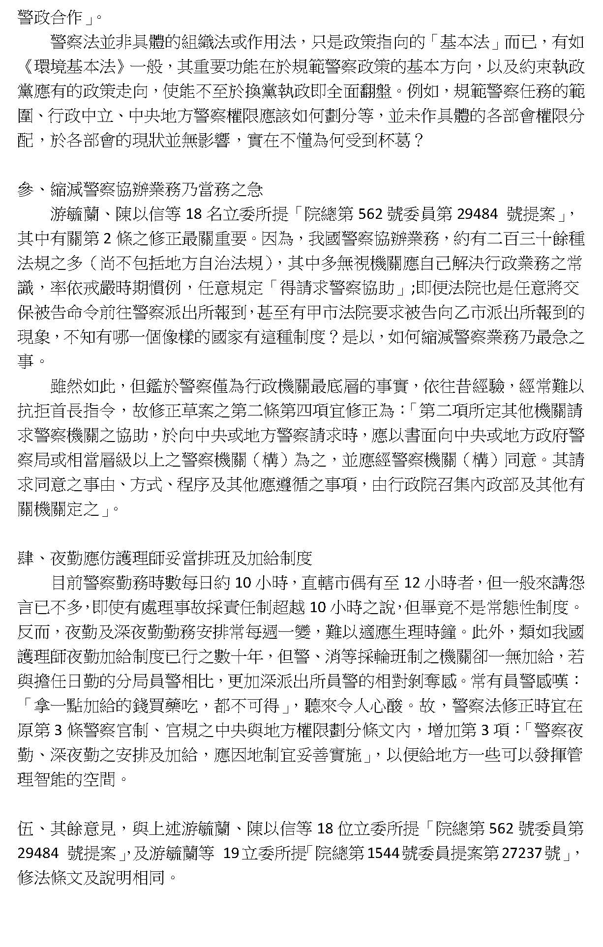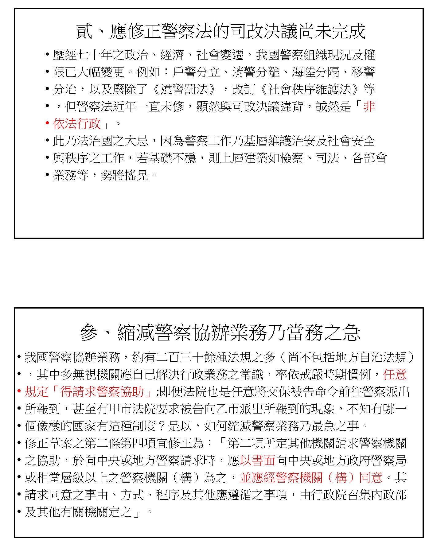 針對警察法之檢討,本部已召開多次研商會議,由於各界意見分歧,本部刻正積極溝通,凝聚各界共識。以上報告,謝謝。