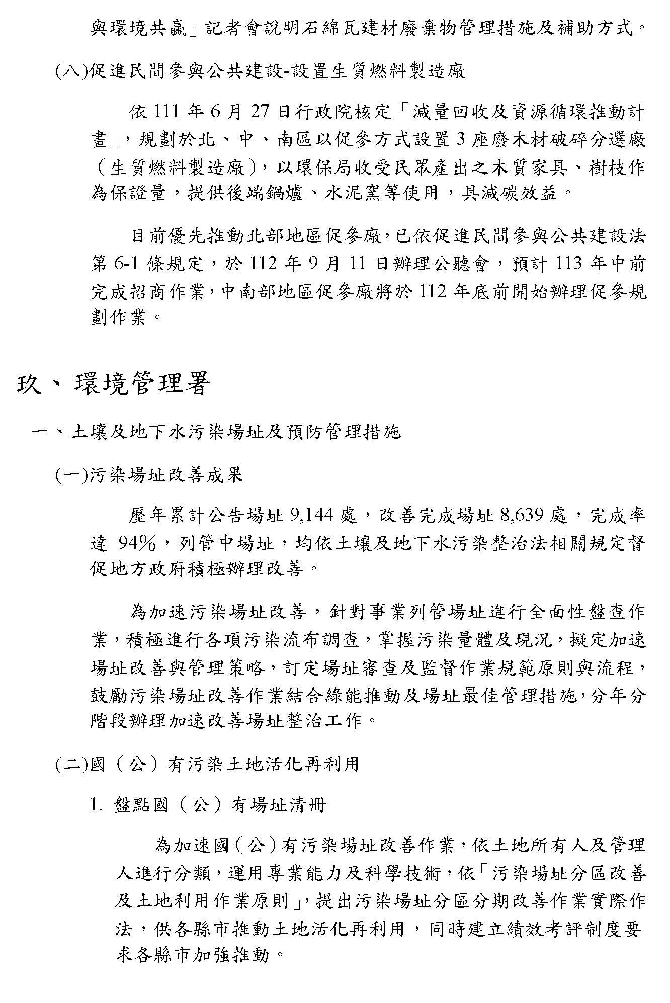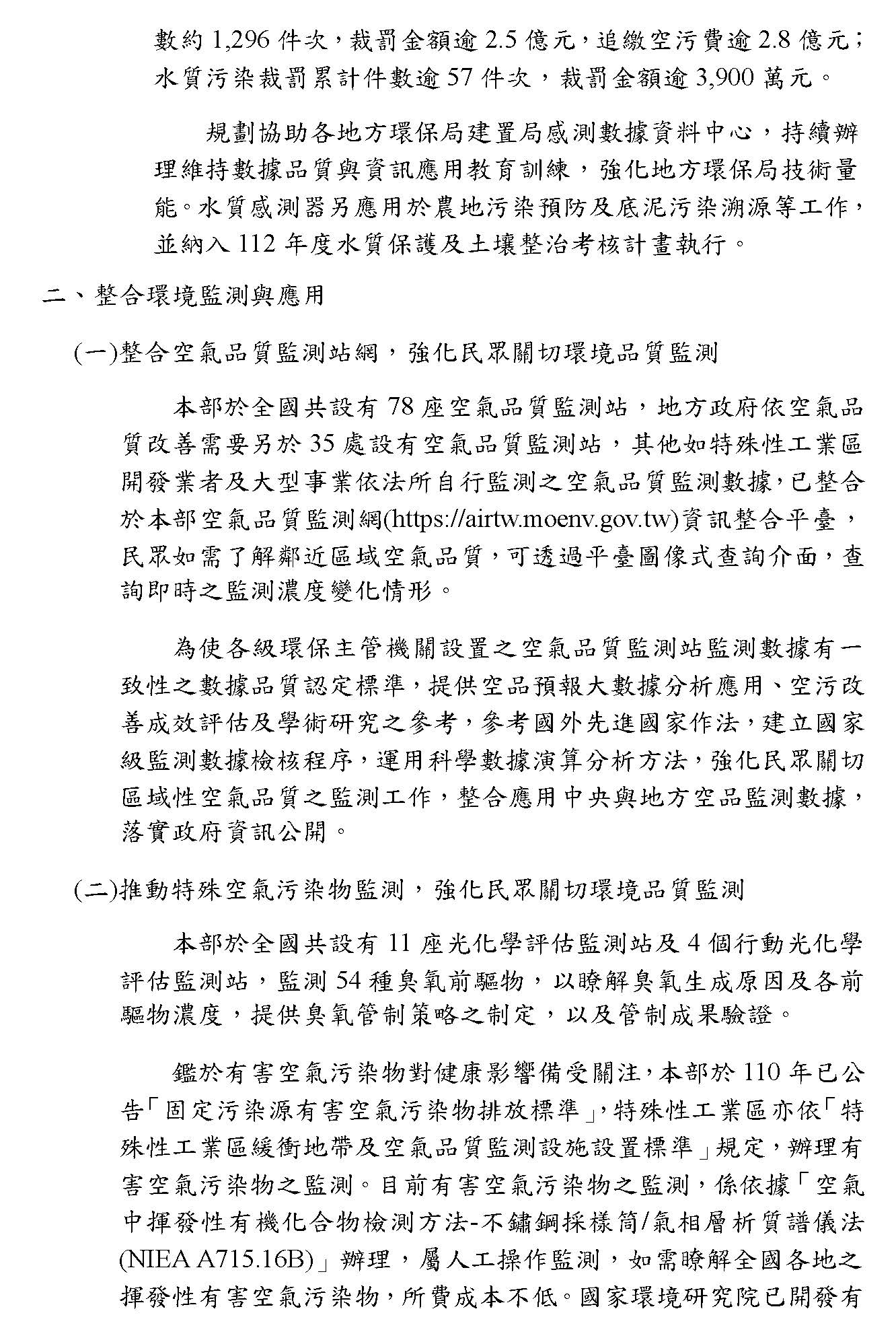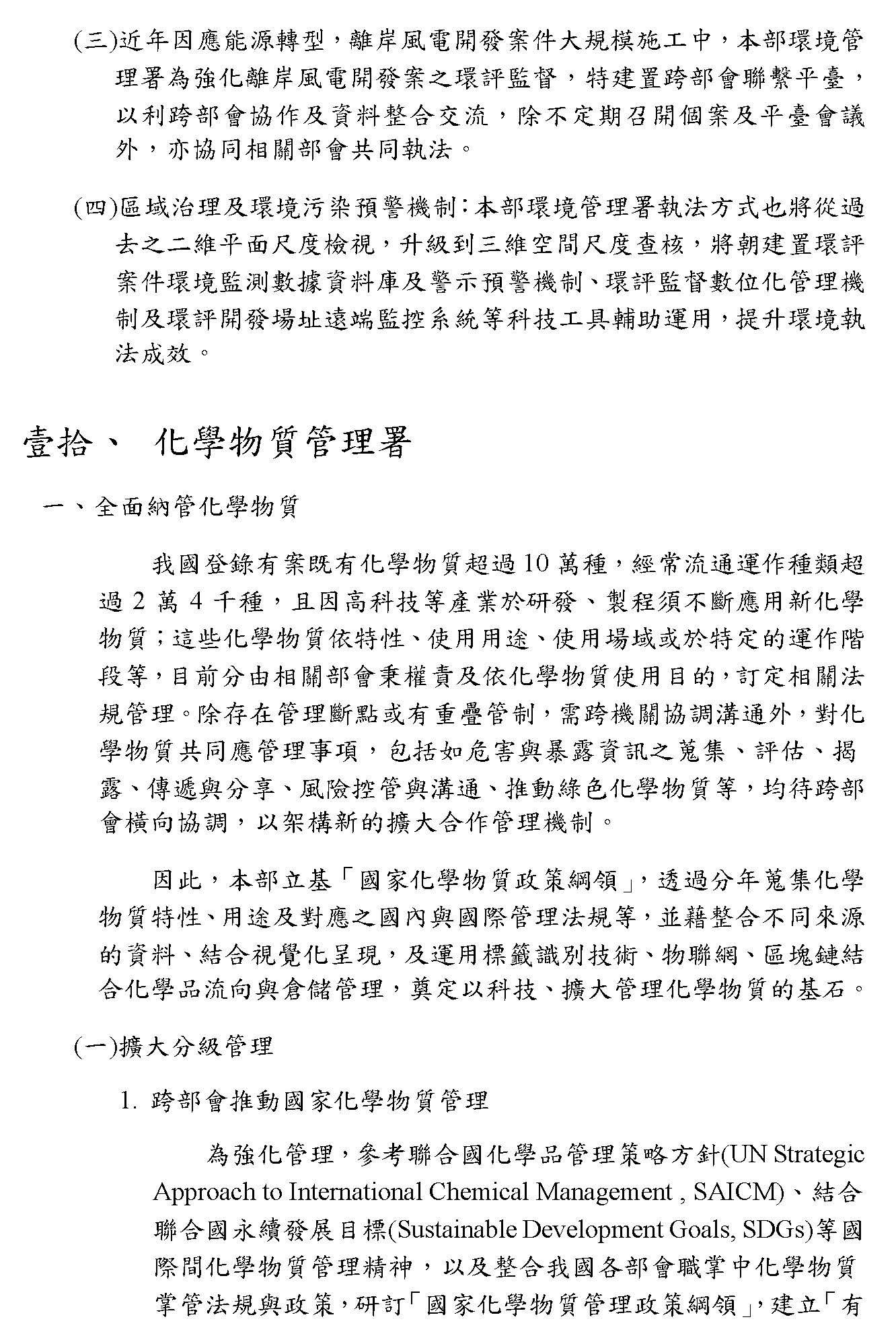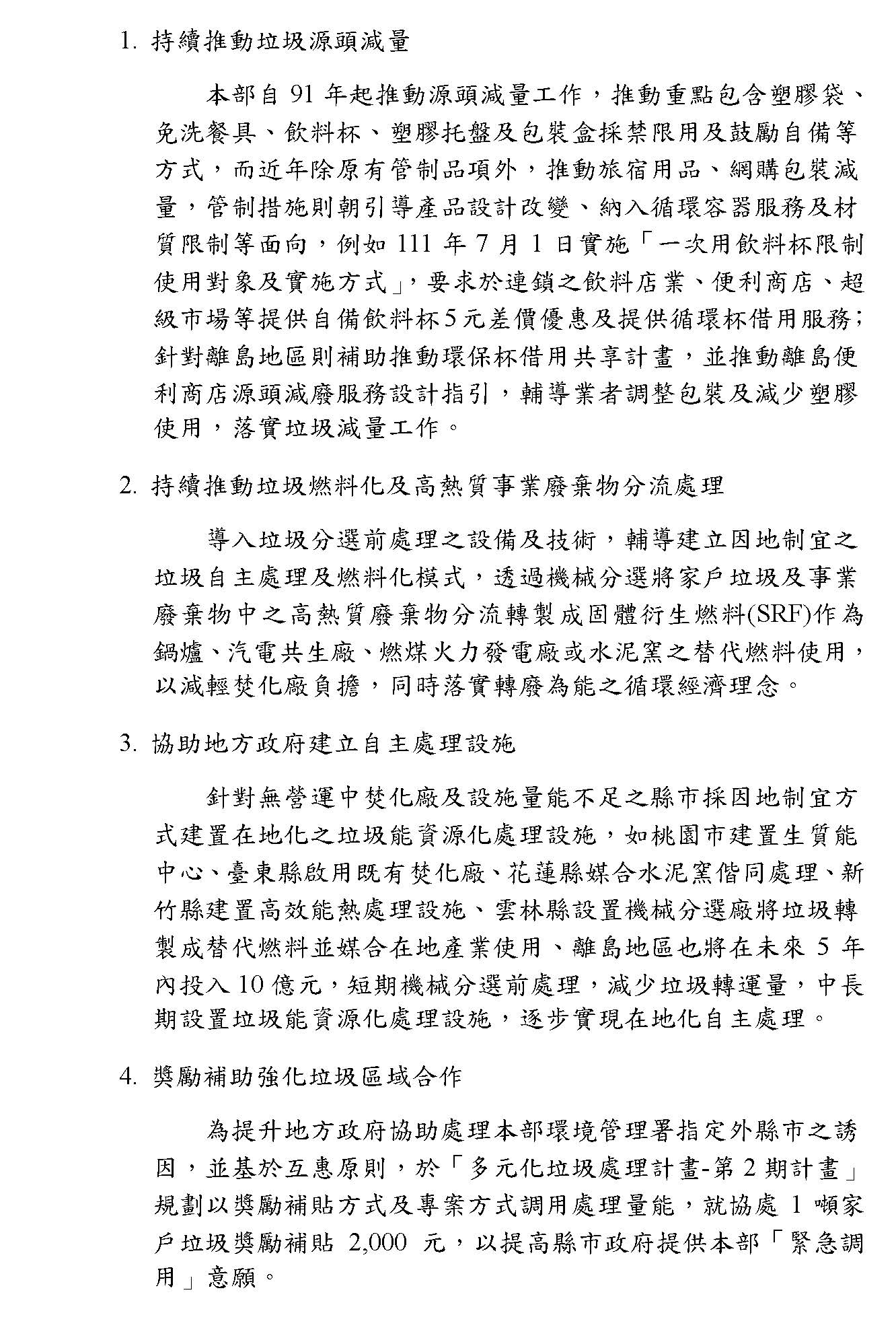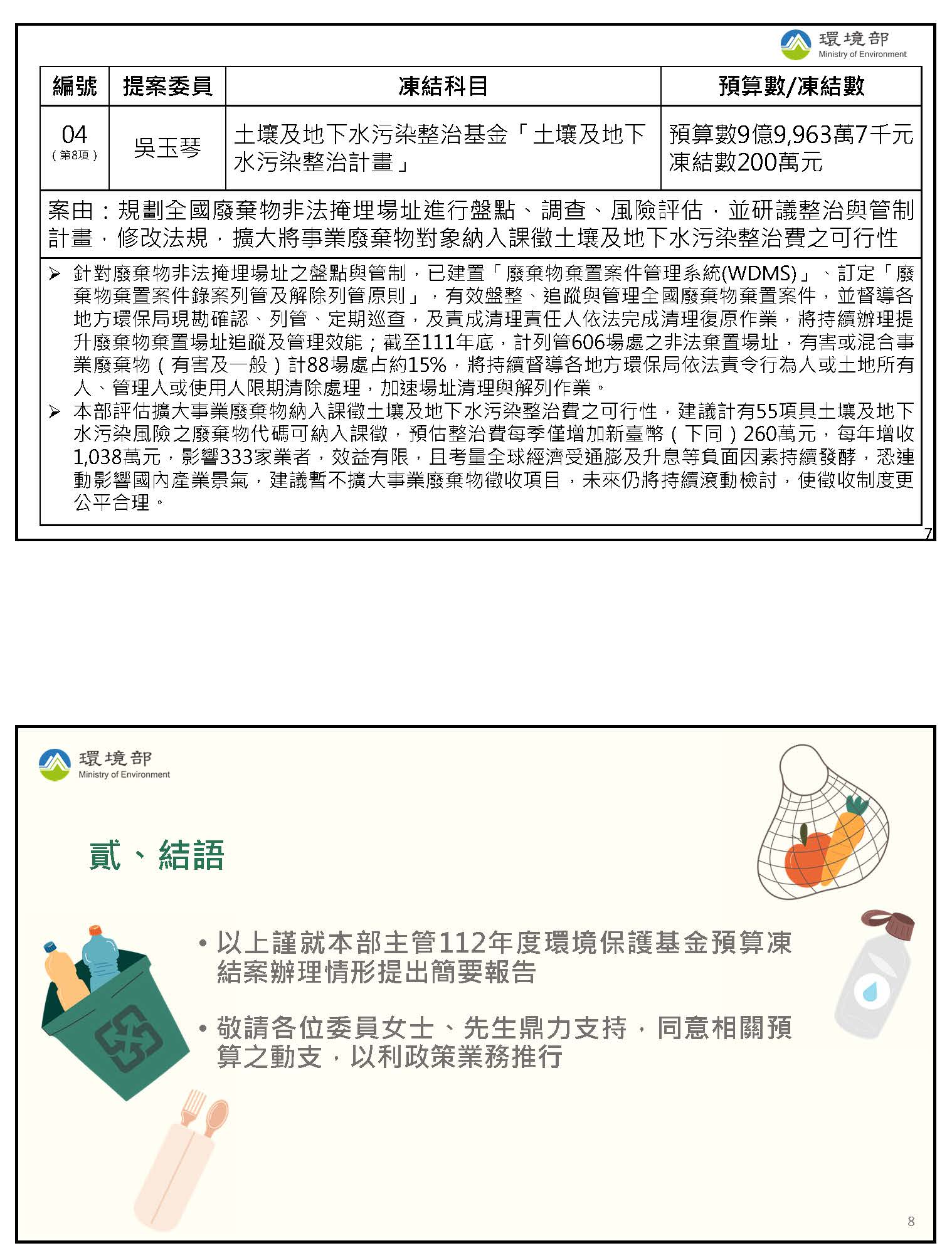 最後,針對環境部在今年度被大院凍結4個預算的部分簡單說明。第一案是吳玉琴、洪申翰及楊曜委員所提,有關燃料燃燒或工業製程溫室氣體降幅有限的問題,淨零排放事實上是一個跨部會的議題,不只是環境部,還包括其他相關部會,特別是委員所提到有關溫室氣體、氣候變遷研究方面的部分,由國科會來主責;有關森林碳匯部分,事實上是農業部規劃,我們也跟農業部在這方面有很密切的合作。另外,第二案是張育美委員所提,有關溫室氣體管理基金因應氣候變遷項下「溫室氣體排放管理」部分,剛剛我在業務報告也大概有跟委員提到,環境部現在就積極在做這一塊。第三案是陳瑩委員所提,有關資源回收的部分,的確網購是我們現在在努力的,目前已經跟23家業者已經有簽合作協議,他們積極推動減塑的工作。最後一個案子是吳玉琴委員所提,有關土壤及地下水污染整治基金的使用,我們非常謝謝吳委員對環境部業務瞭解的非常深入,也非常的專業,他提供我們很多相關的資訊,未來可以作為環境部的參考,至於他所建議有關擴大徵收的範圍,事實上環境部也經過內部的檢討,細節的部分也有跟吳委員報告過。