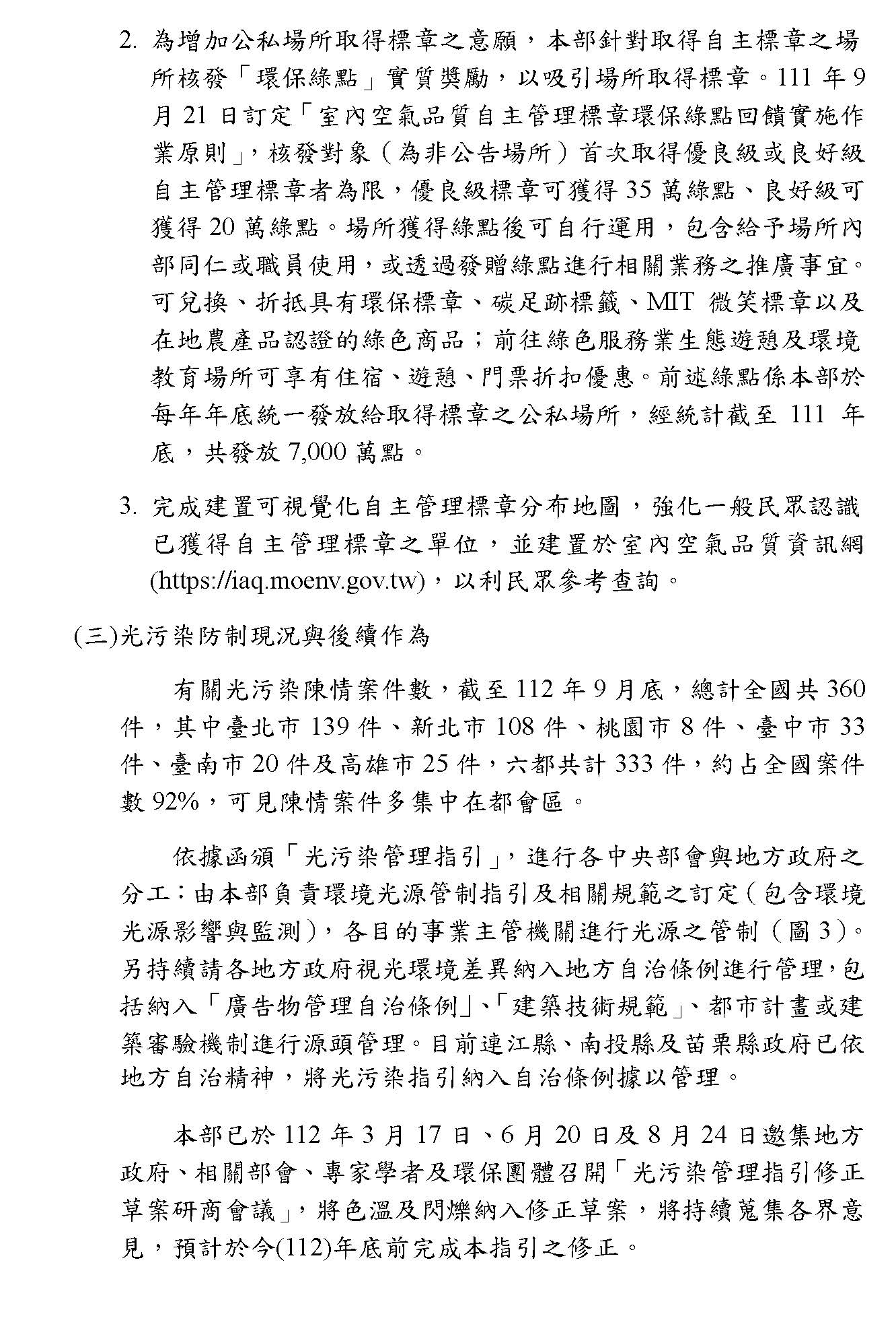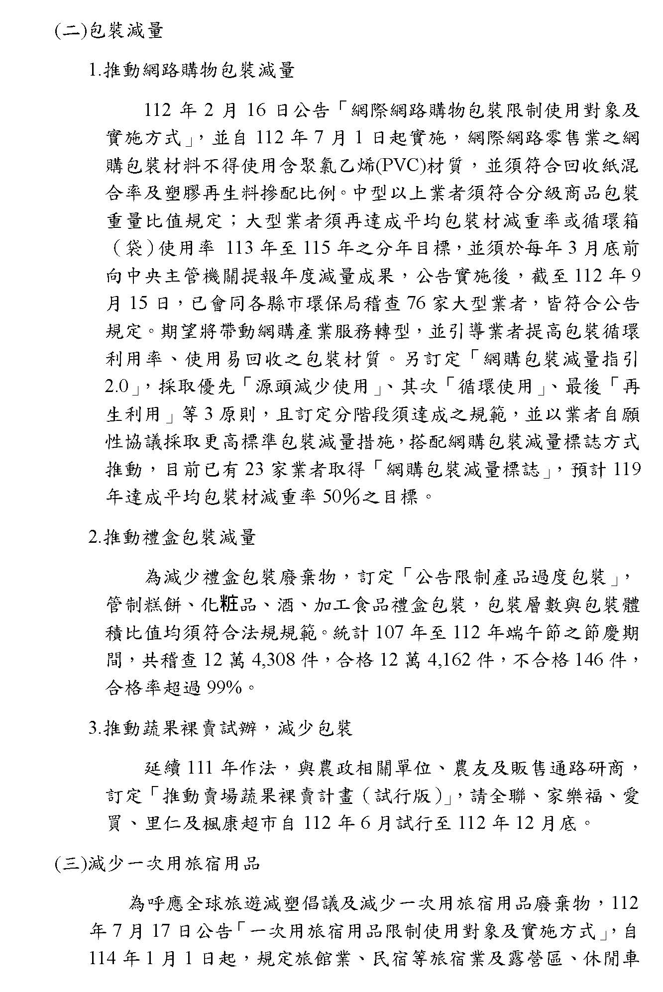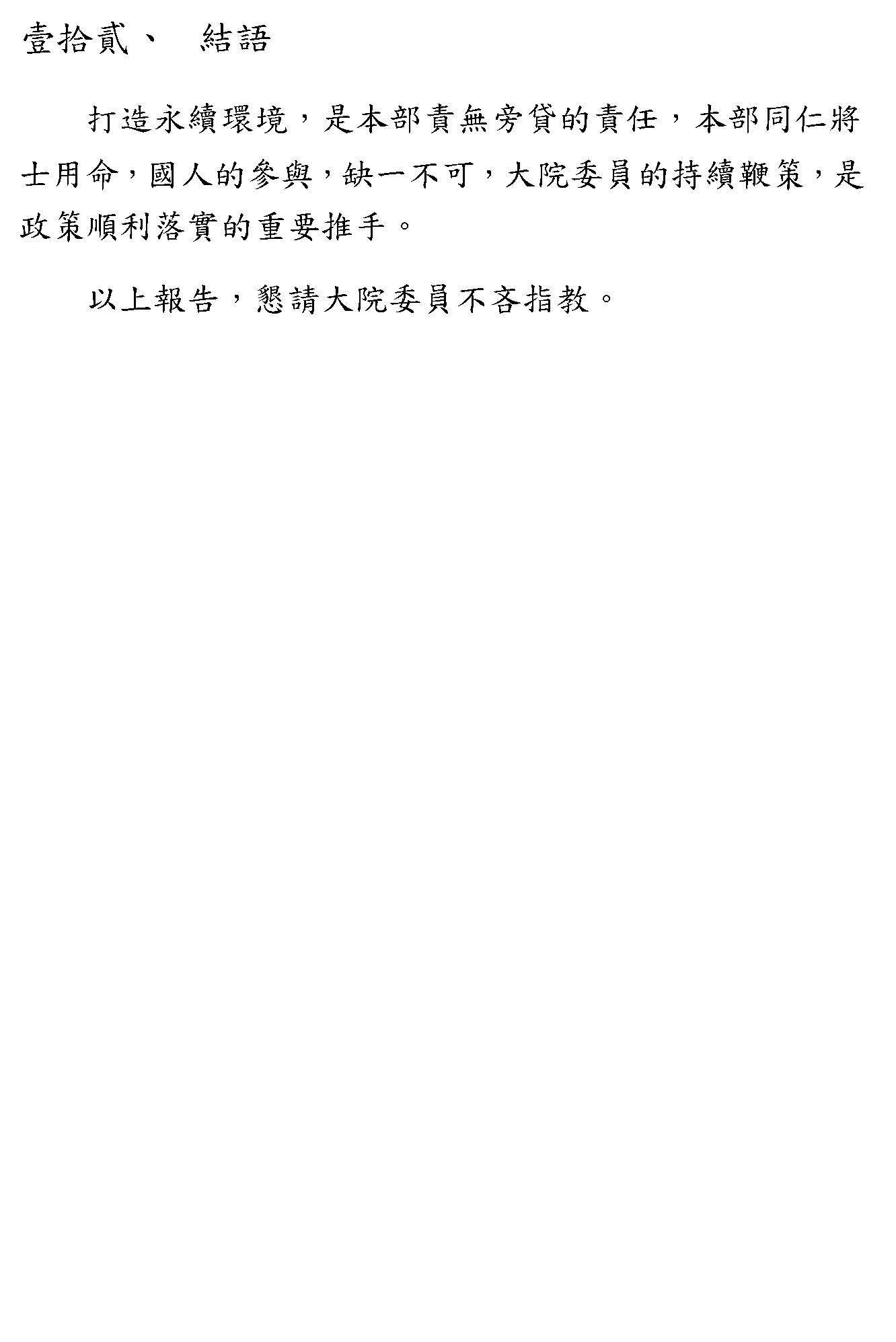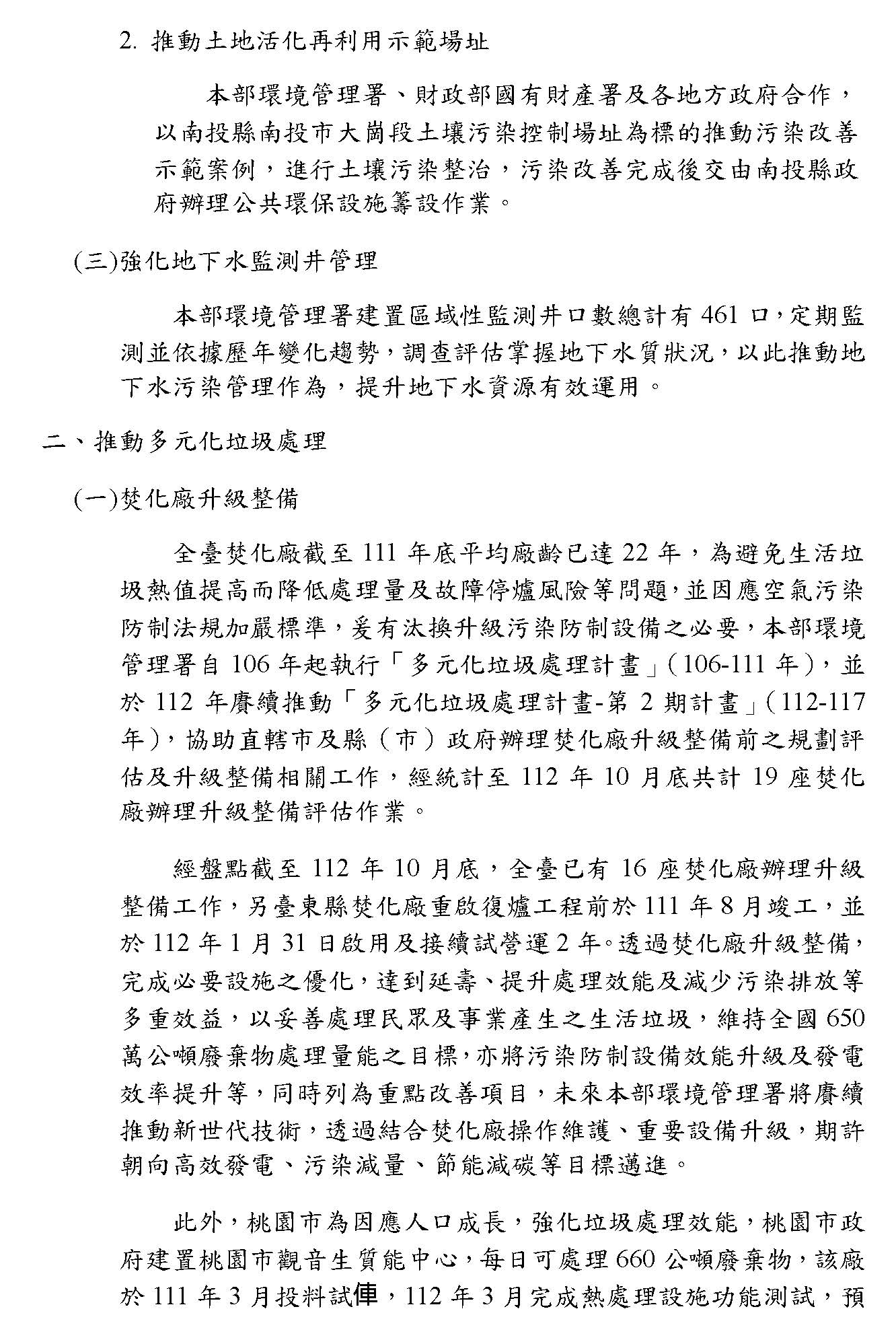最後,針對環境部在今年度被大院凍結4個預算的部分簡單說明。第一案是吳玉琴、洪申翰及楊曜委員所提,有關燃料燃燒或工業製程溫室氣體降幅有限的問題,淨零排放事實上是一個跨部會的議題,不只是環境部,還包括其他相關部會,特別是委員所提到有關溫室氣體、氣候變遷研究方面的部分,由國科會來主責;有關森林碳匯部分,事實上是農業部規劃,我們也跟農業部在這方面有很密切的合作。另外,第二案是張育美委員所提,有關溫室氣體管理基金因應氣候變遷項下「溫室氣體排放管理」部分,剛剛我在業務報告也大概有跟委員提到,環境部現在就積極在做這一塊。第三案是陳瑩委員所提,有關資源回收的部分,的確網購是我們現在在努力的,目前已經跟23家業者已經有簽合作協議,他們積極推動減塑的工作。最後一個案子是吳玉琴委員所提,有關土壤及地下水污染整治基金的使用,我們非常謝謝吳委員對環境部業務瞭解的非常深入,也非常的專業,他提供我們很多相關的資訊,未來可以作為環境部的參考,至於他所建議有關擴大徵收的範圍,事實上環境部也經過內部的檢討,細節的部分也有跟吳委員報告過。