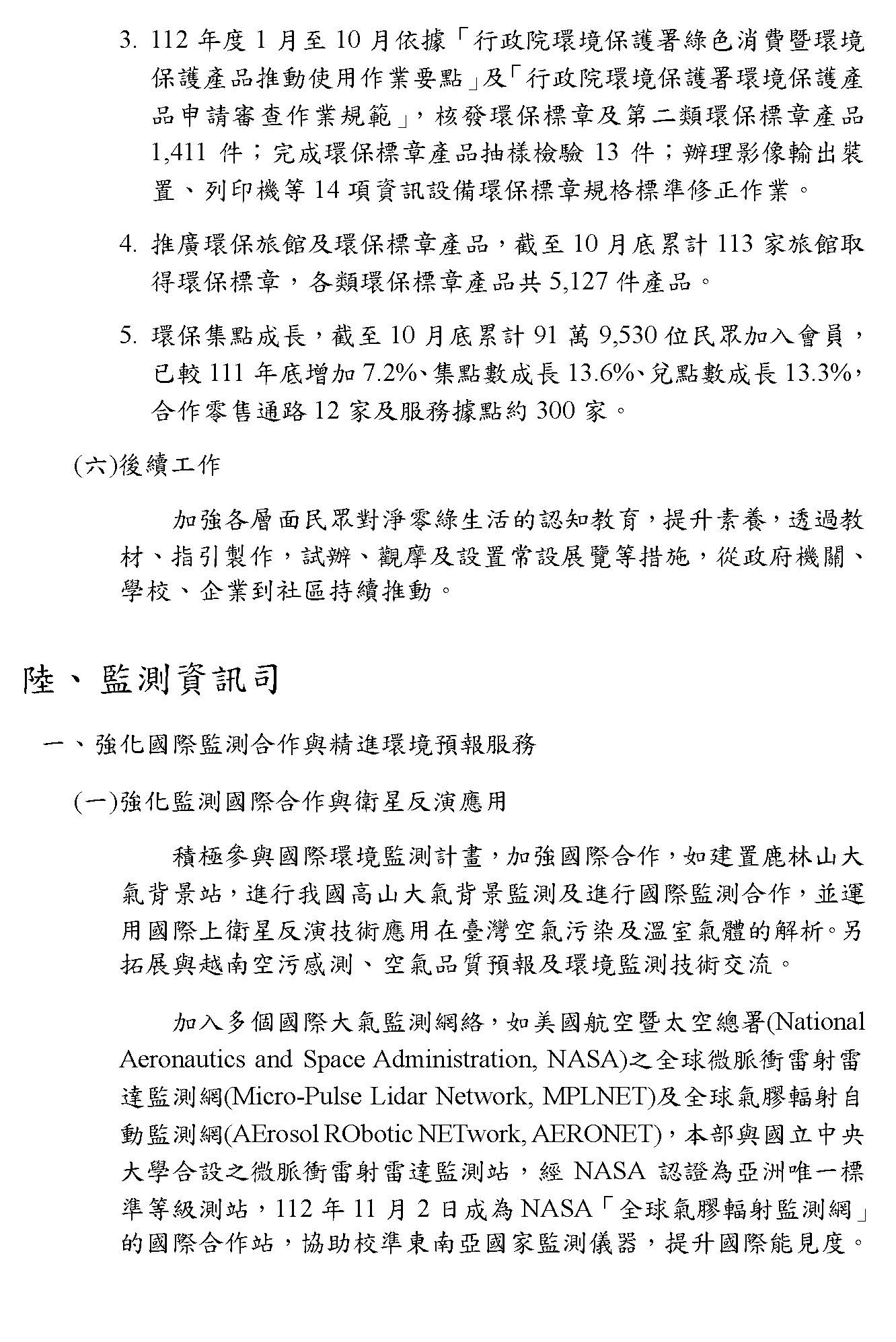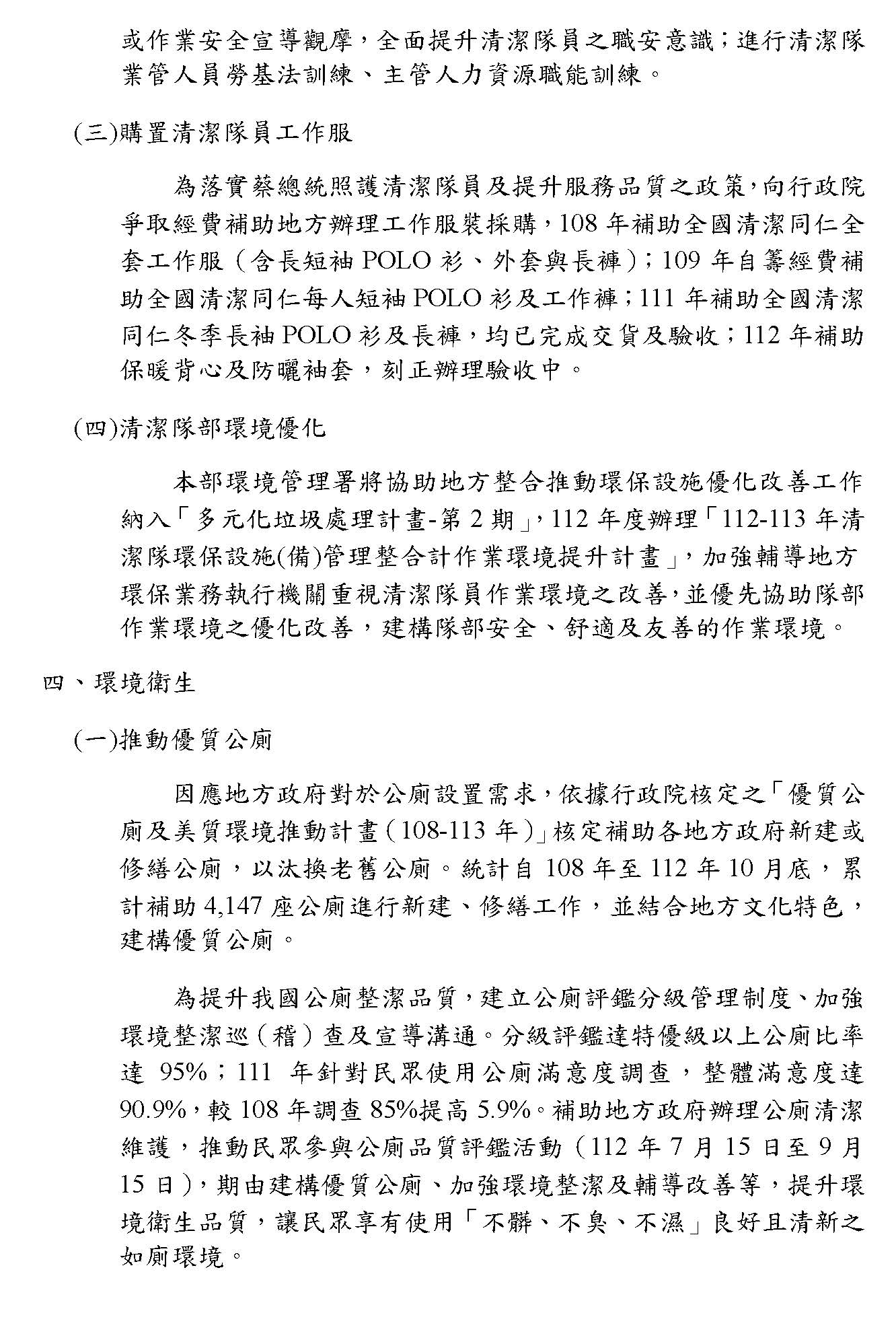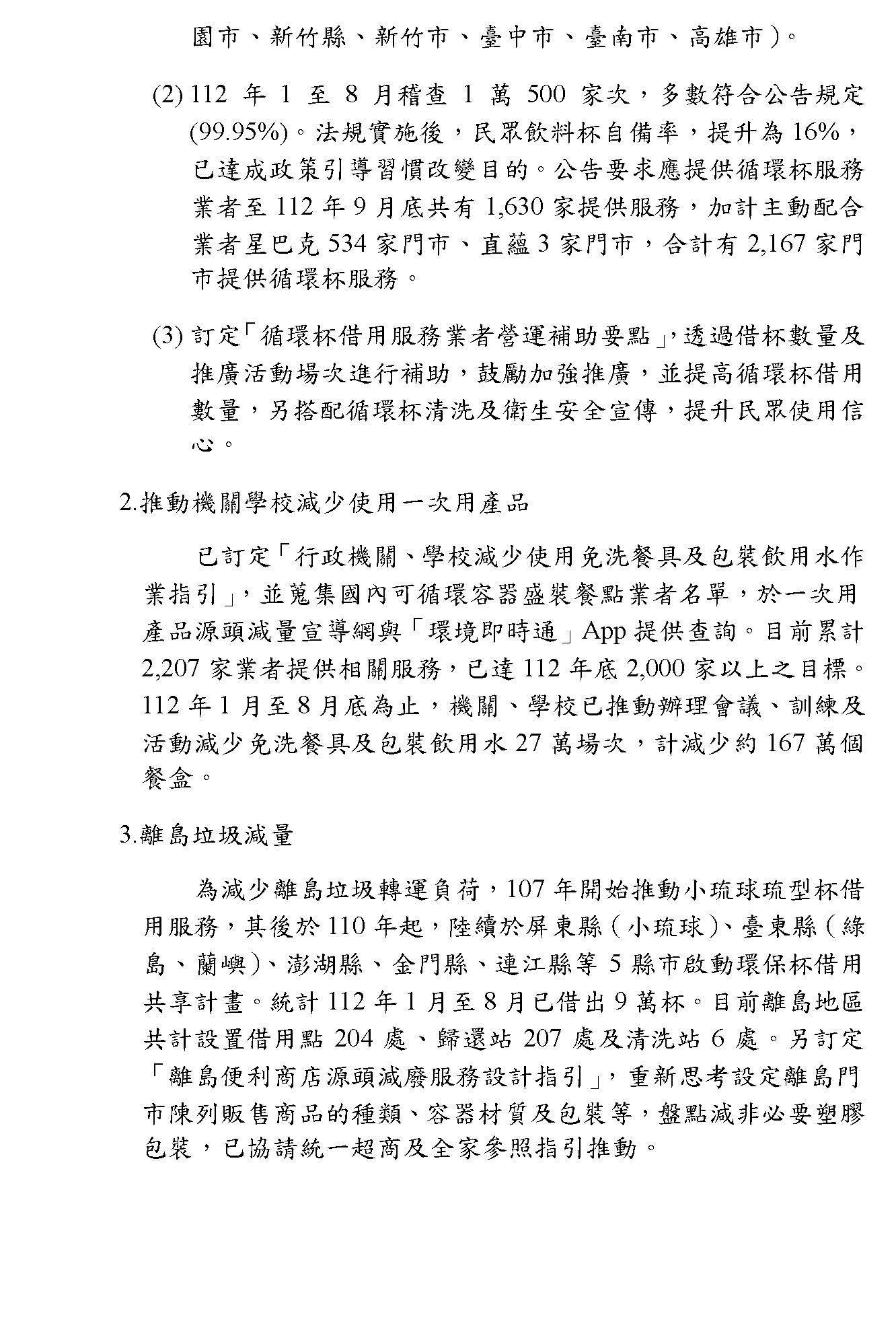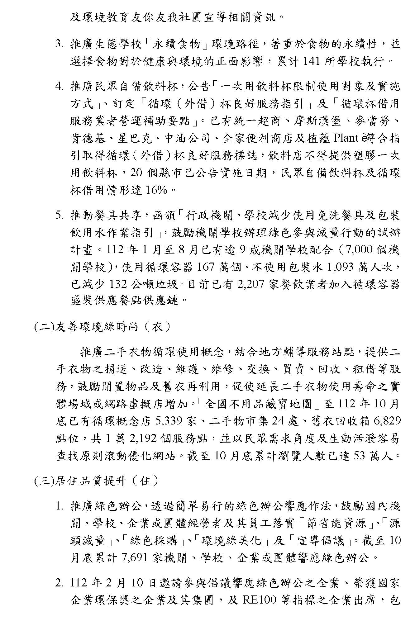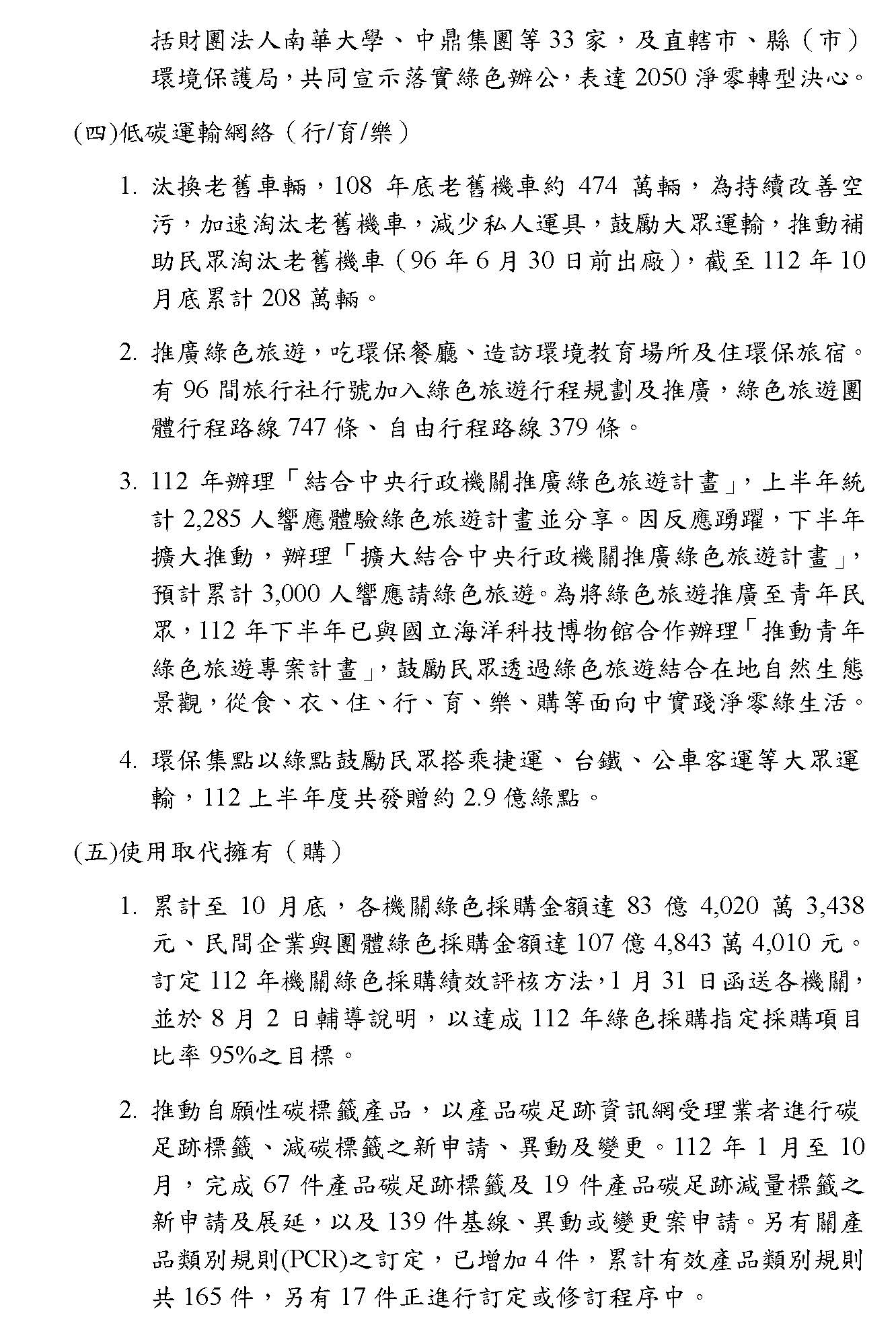 最後,針對環境部在今年度被大院凍結4個預算的部分簡單說明。第一案是吳玉琴、洪申翰及楊曜委員所提,有關燃料燃燒或工業製程溫室氣體降幅有限的問題,淨零排放事實上是一個跨部會的議題,不只是環境部,還包括其他相關部會,特別是委員所提到有關溫室氣體、氣候變遷研究方面的部分,由國科會來主責;有關森林碳匯部分,事實上是農業部規劃,我們也跟農業部在這方面有很密切的合作。另外,第二案是張育美委員所提,有關溫室氣體管理基金因應氣候變遷項下「溫室氣體排放管理」部分,剛剛我在業務報告也大概有跟委員提到,環境部現在就積極在做這一塊。第三案是陳瑩委員所提,有關資源回收的部分,的確網購是我們現在在努力的,目前已經跟23家業者已經有簽合作協議,他們積極推動減塑的工作。最後一個案子是吳玉琴委員所提,有關土壤及地下水污染整治基金的使用,我們非常謝謝吳委員對環境部業務瞭解的非常深入,也非常的專業,他提供我們很多相關的資訊,未來可以作為環境部的參考,至於他所建議有關擴大徵收的範圍,事實上環境部也經過內部的檢討,細節的部分也有跟吳委員報告過。