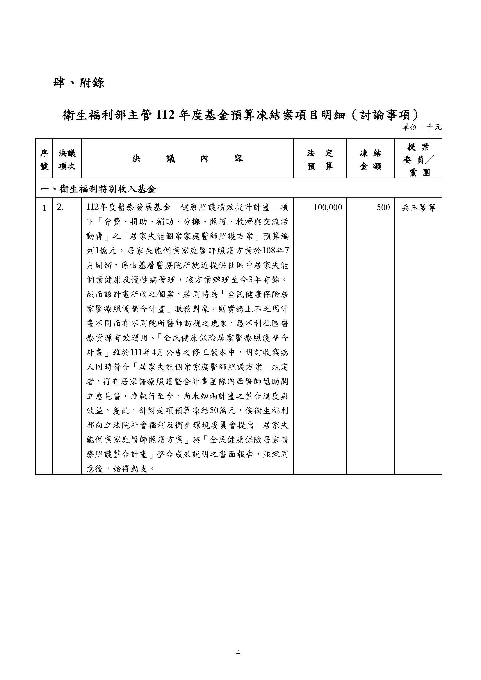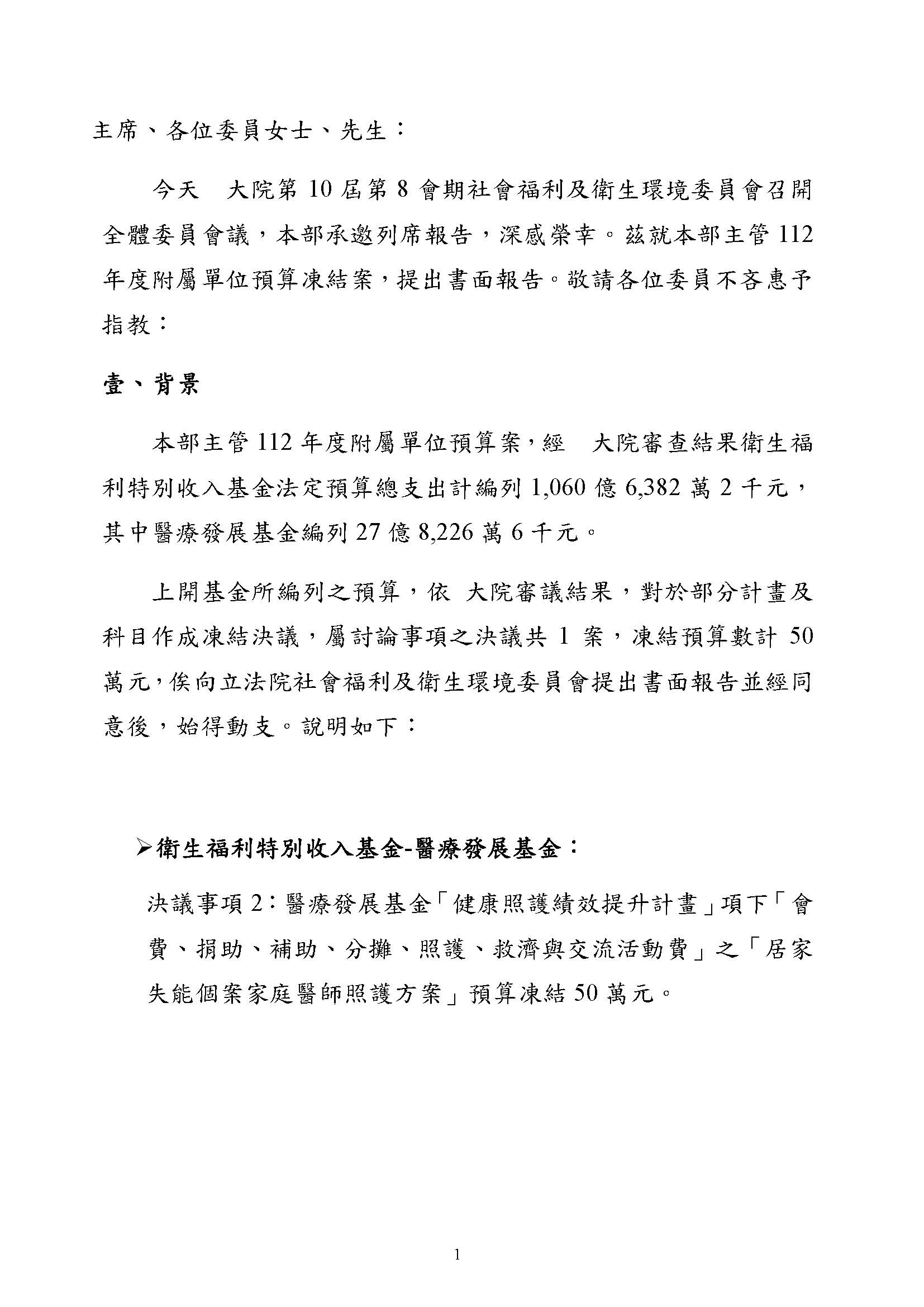 一、衛生福利部主管112年度附屬單位預算凍結案(書面報告)