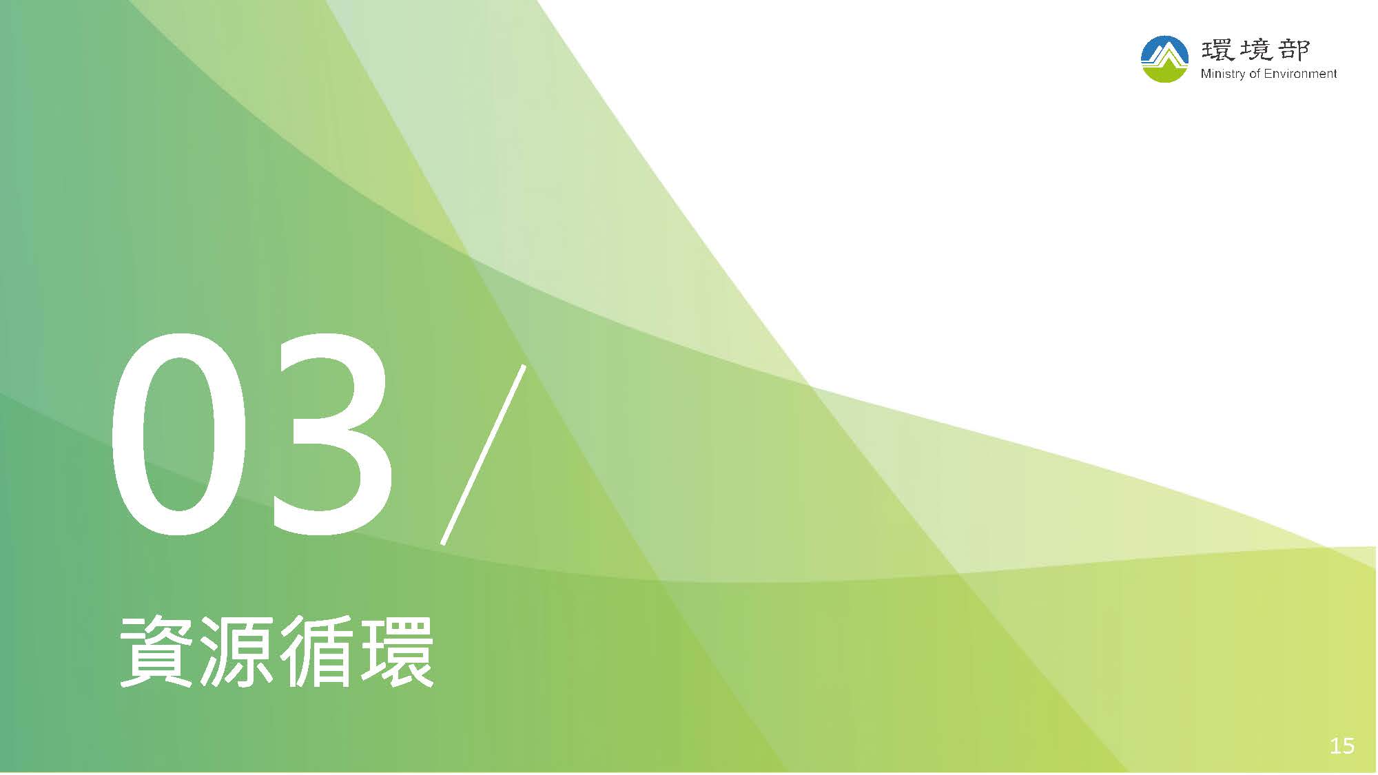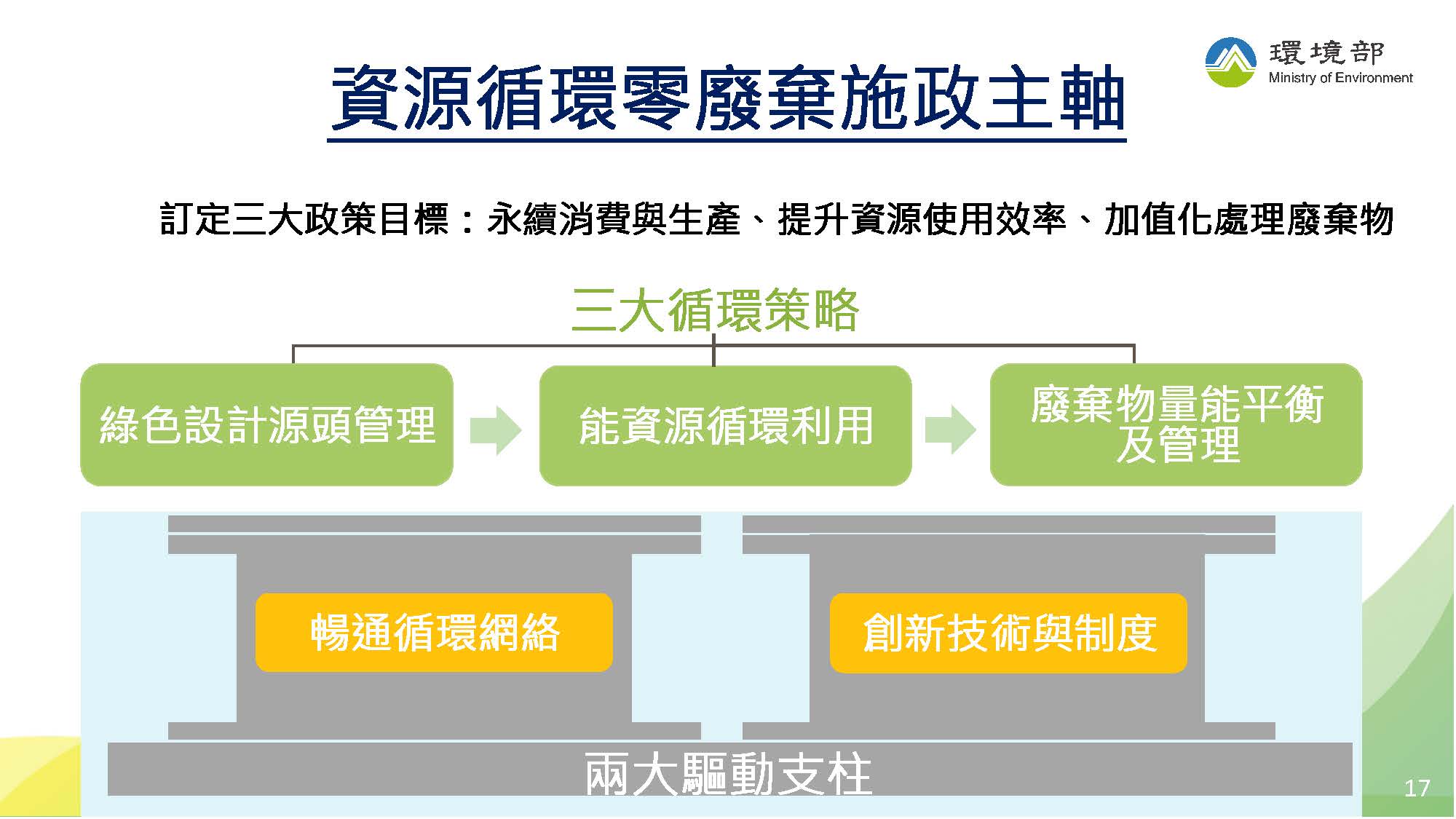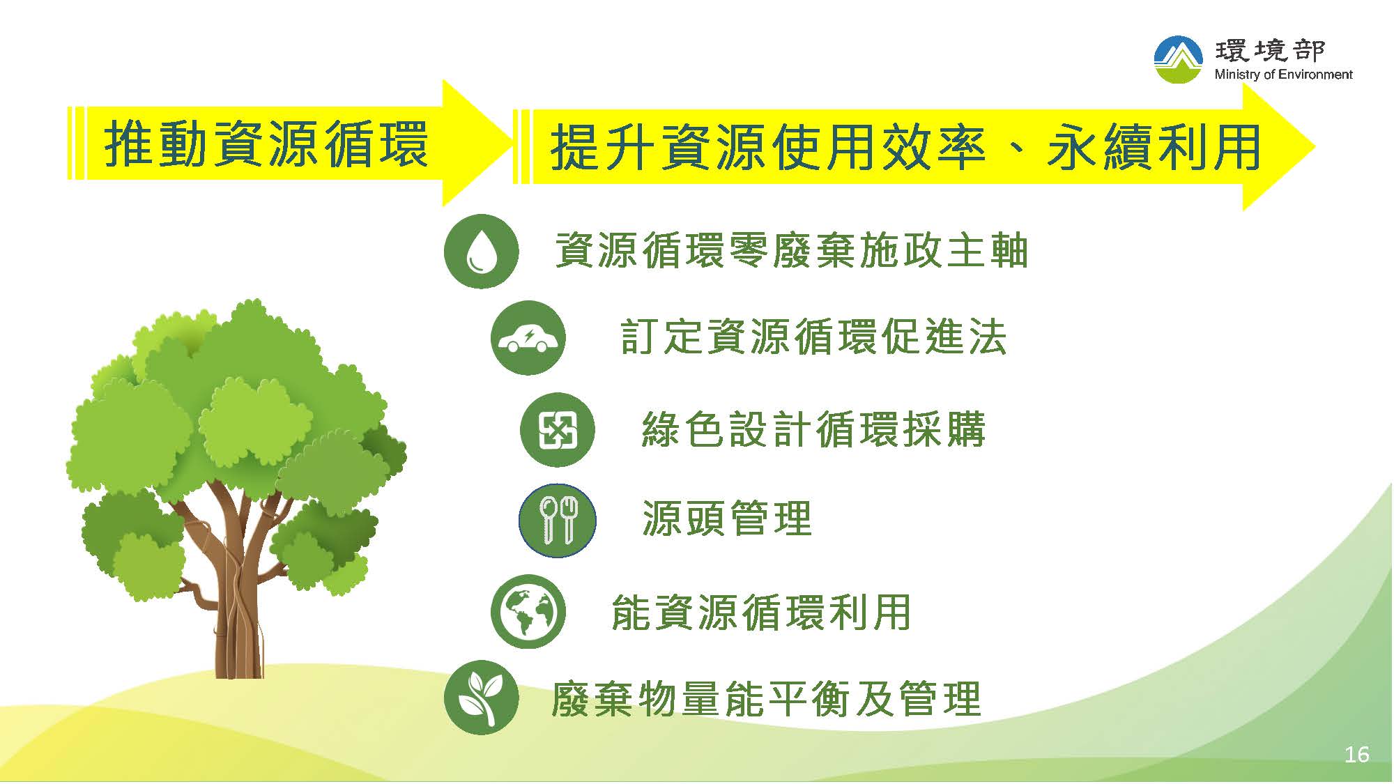 第二個就是有關資源循環的部分。資源循環三大策略包括綠色設計源頭管理,以及能資源循環利用,還有廢棄物量能平衡及管理,這個管理是基於兩大驅動支柱,包括暢通循環網絡以及創新科技的部分。目前環境部積極草擬資源循環促進法,希望在明年上半年可以讓這個法案公告,讓大家共同推動資源循環。我們翻轉以往線性經濟的觀念,把循環經濟這個想法帶入到未來我們對資源的看待,我們希望跟縣市政府密切合作,各縣市的環保局以及環境部大家共同來推動,未來朝向零廢棄的方向。