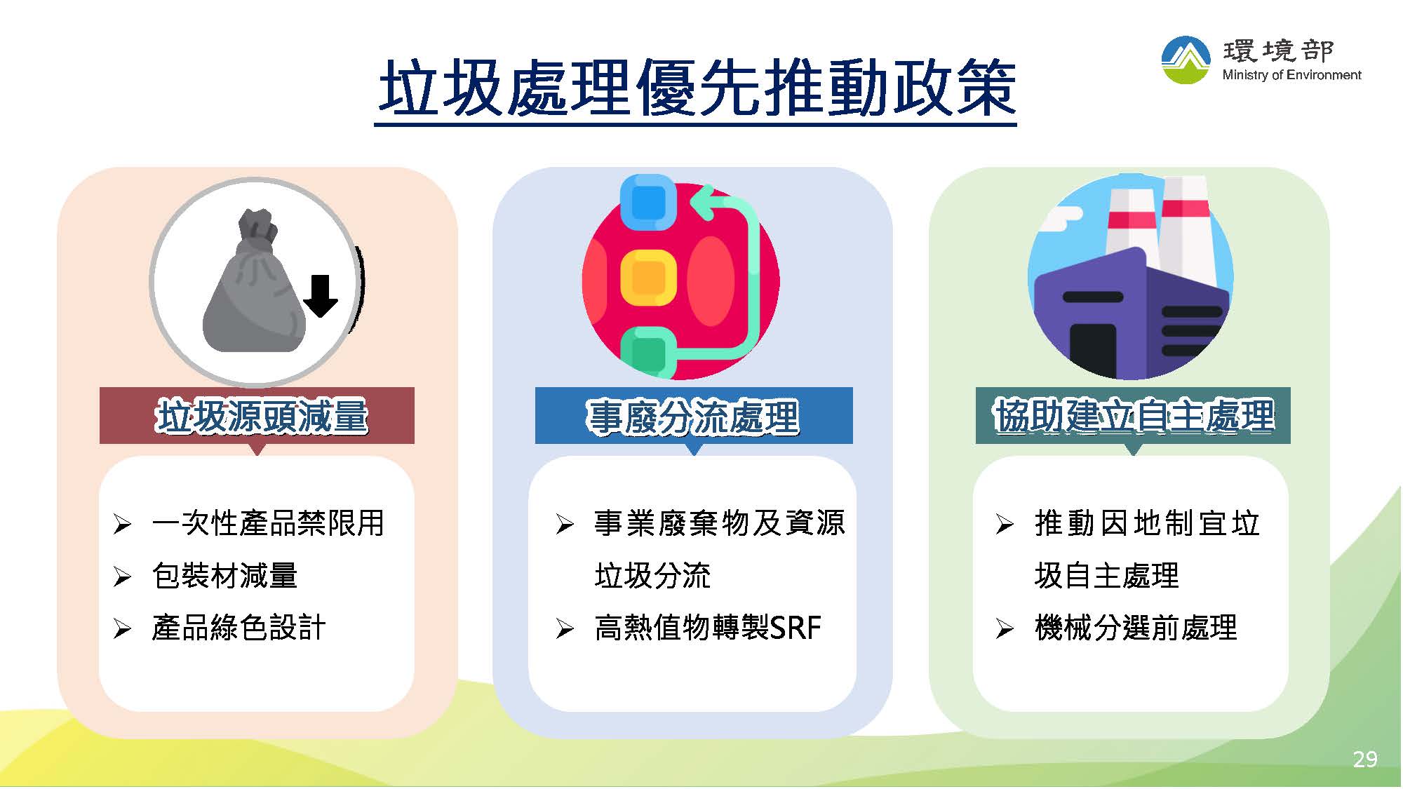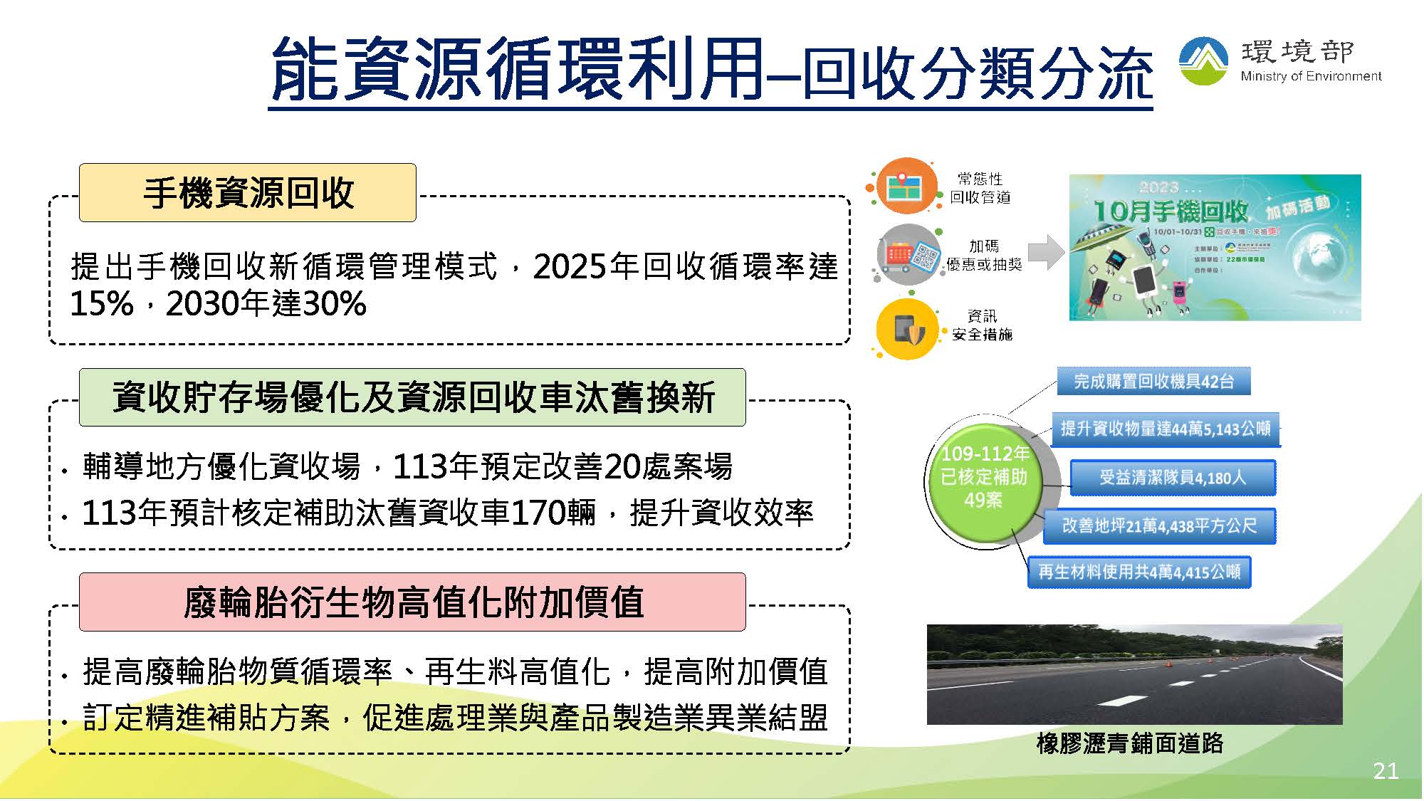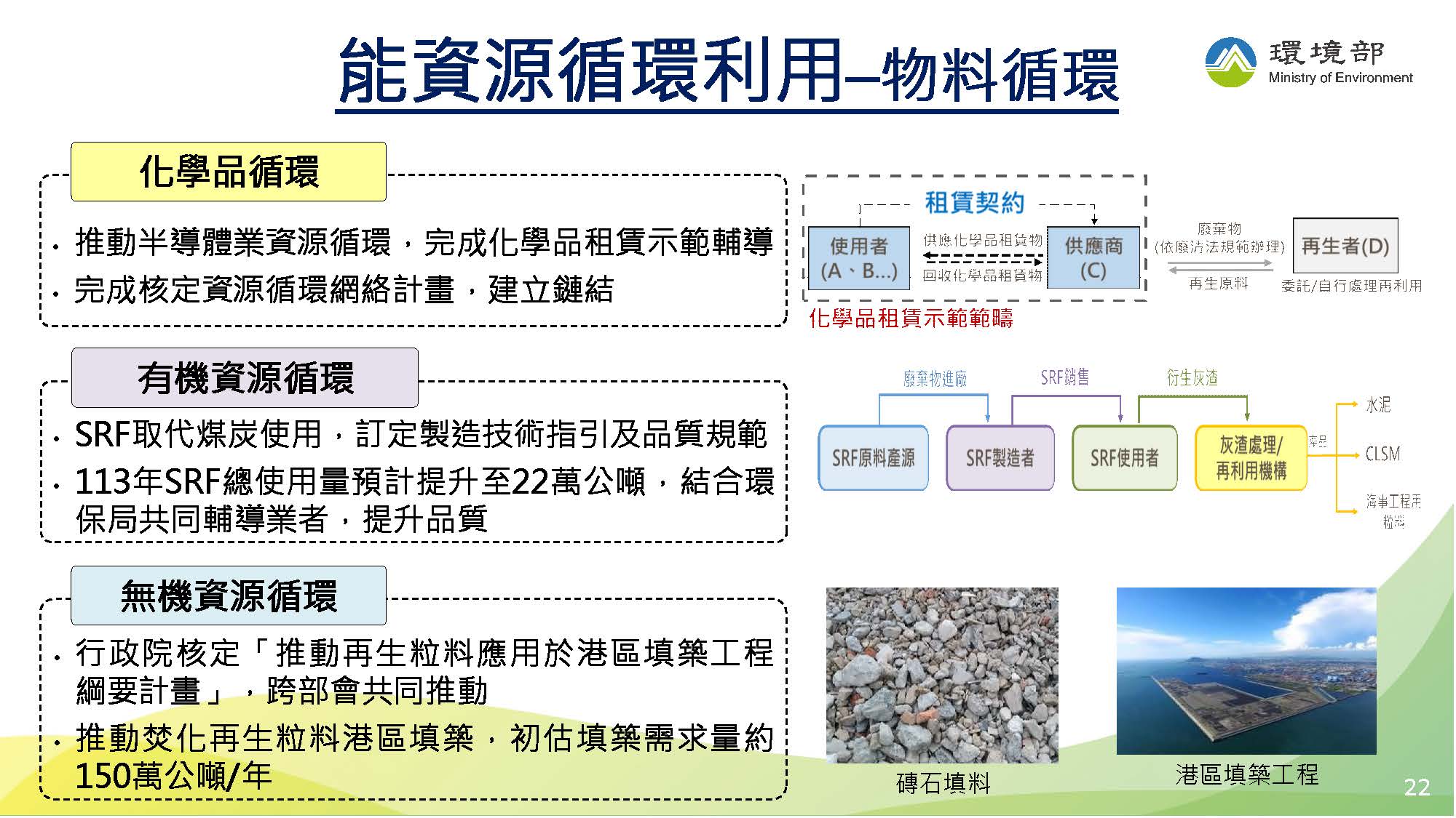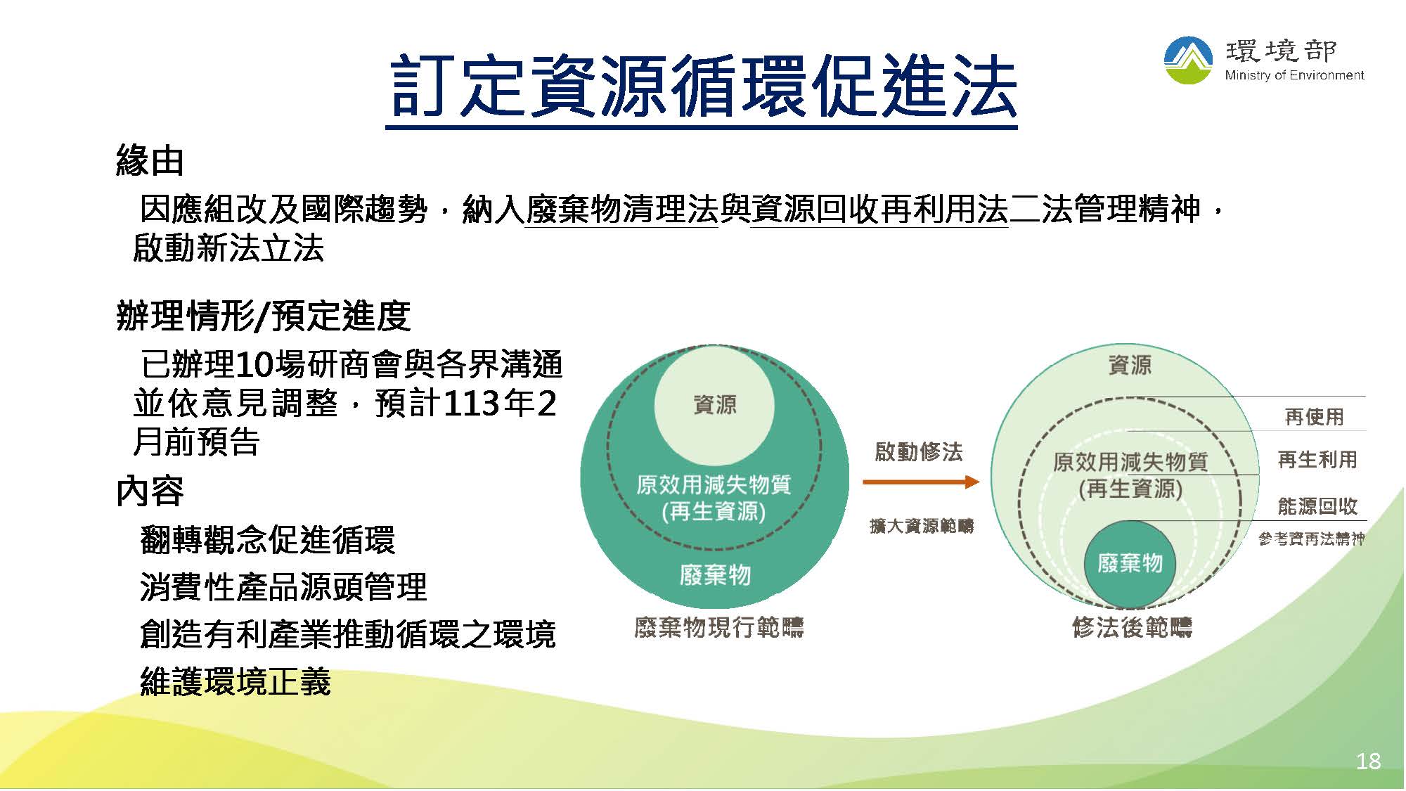 第二個就是有關資源循環的部分。資源循環三大策略包括綠色設計源頭管理,以及能資源循環利用,還有廢棄物量能平衡及管理,這個管理是基於兩大驅動支柱,包括暢通循環網絡以及創新科技的部分。目前環境部積極草擬資源循環促進法,希望在明年上半年可以讓這個法案公告,讓大家共同推動資源循環。我們翻轉以往線性經濟的觀念,把循環經濟這個想法帶入到未來我們對資源的看待,我們希望跟縣市政府密切合作,各縣市的環保局以及環境部大家共同來推動,未來朝向零廢棄的方向。