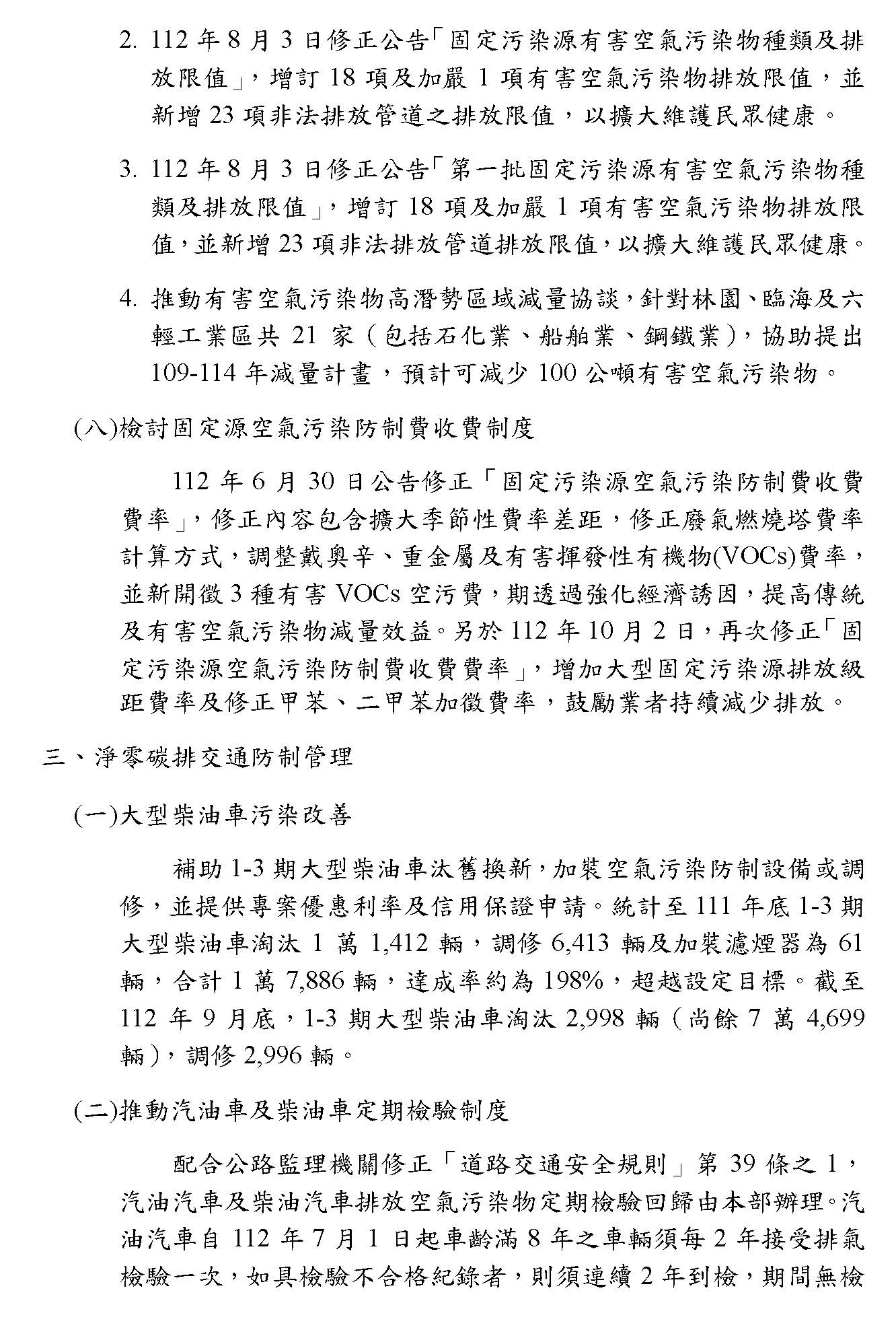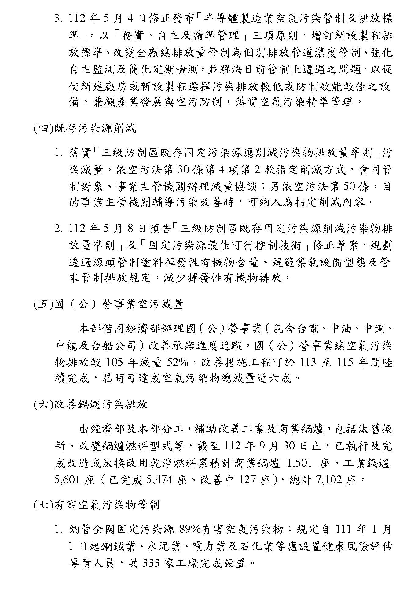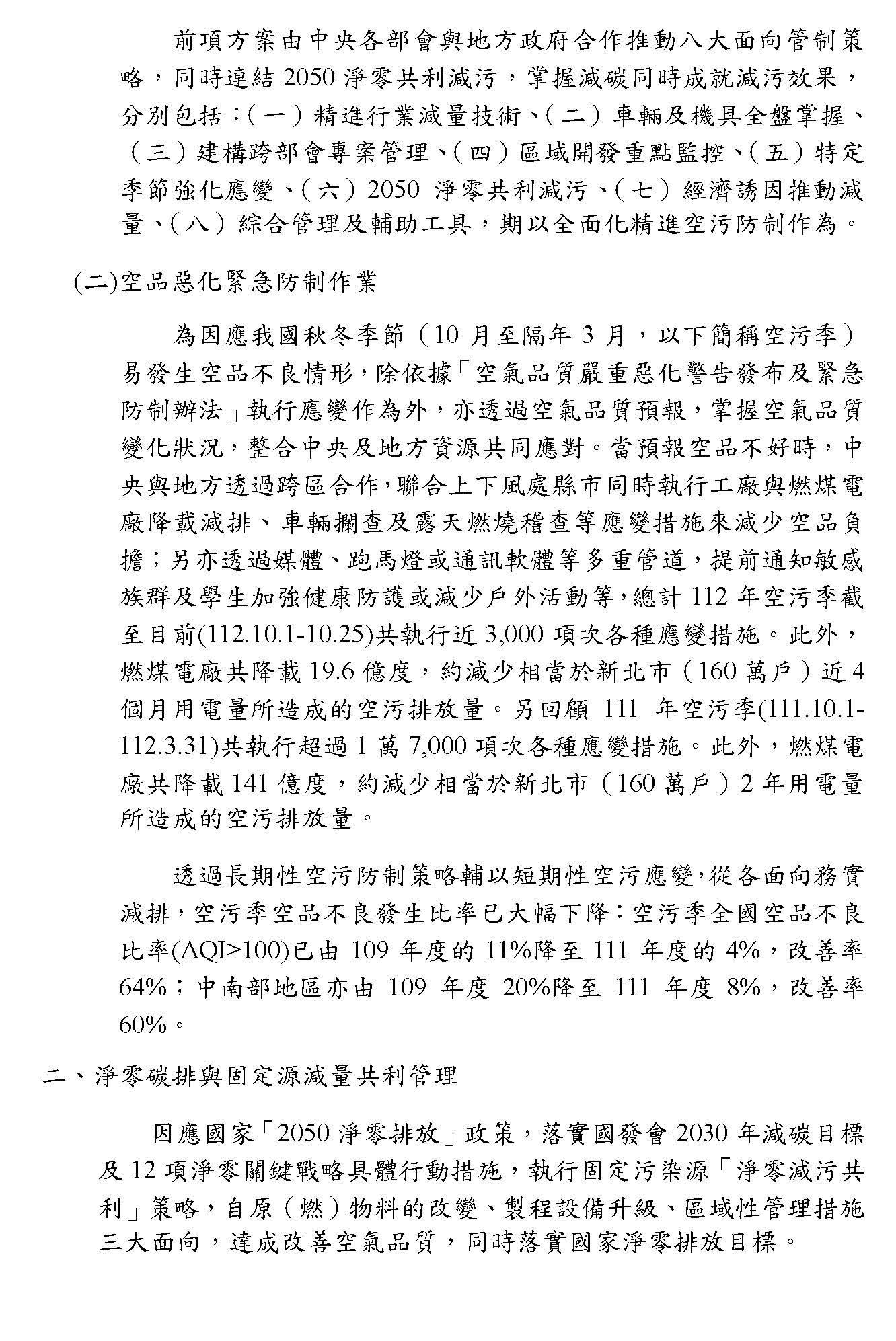 薛部長富盛:我跟委員報告,事實上大氣司在季節轉換或者天氣要變的時候,都會把未來三天所預測的空氣品質在線上即時告知全國民眾。同時我們在109年就開始啟動,只要是因為外在因素的影響,我們就會要求台電,特別是臺中火力發電廠以及六輕,事實上他們會降載,燃煤的部分就會降低,所以用這個方式來彌補可能造成的……