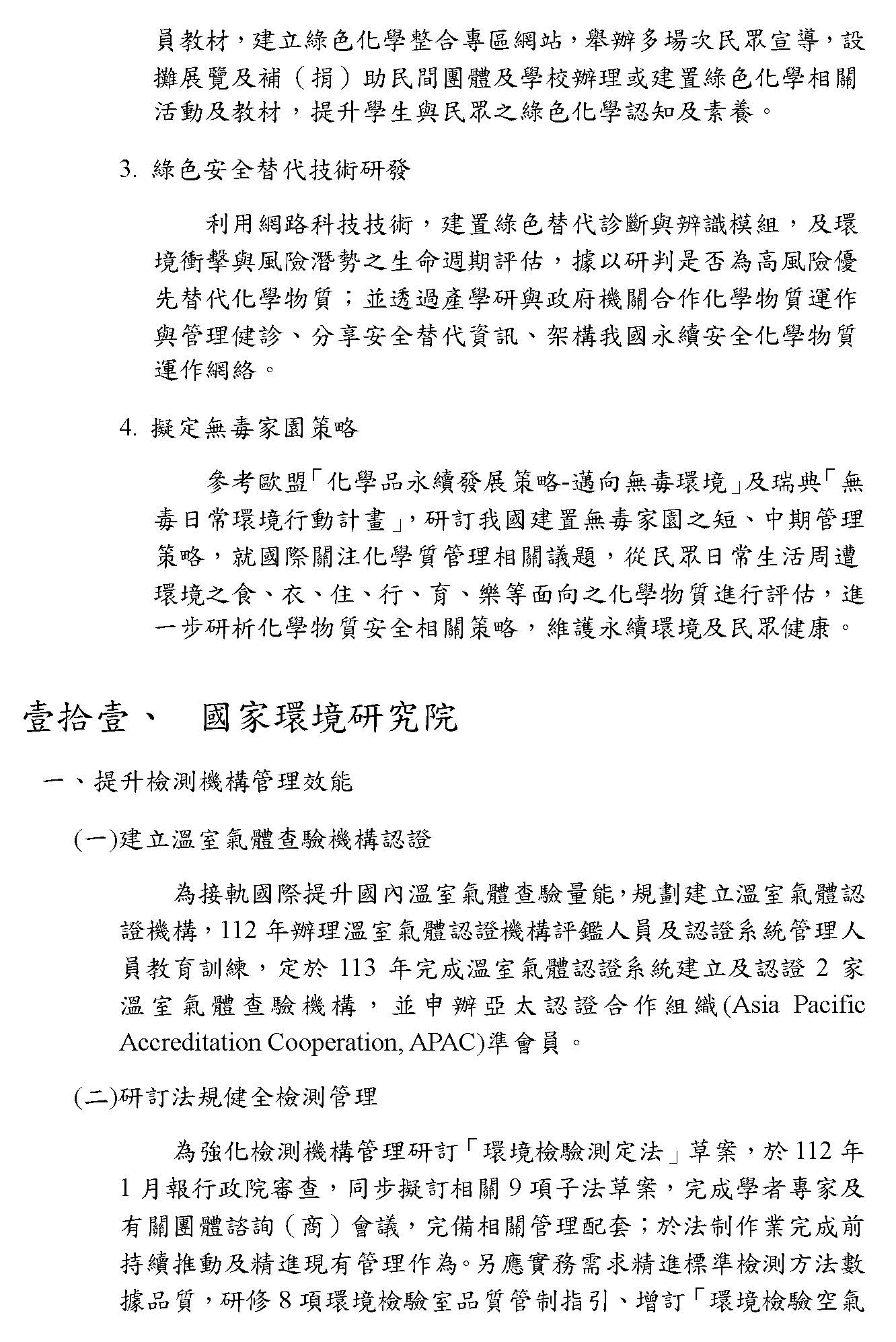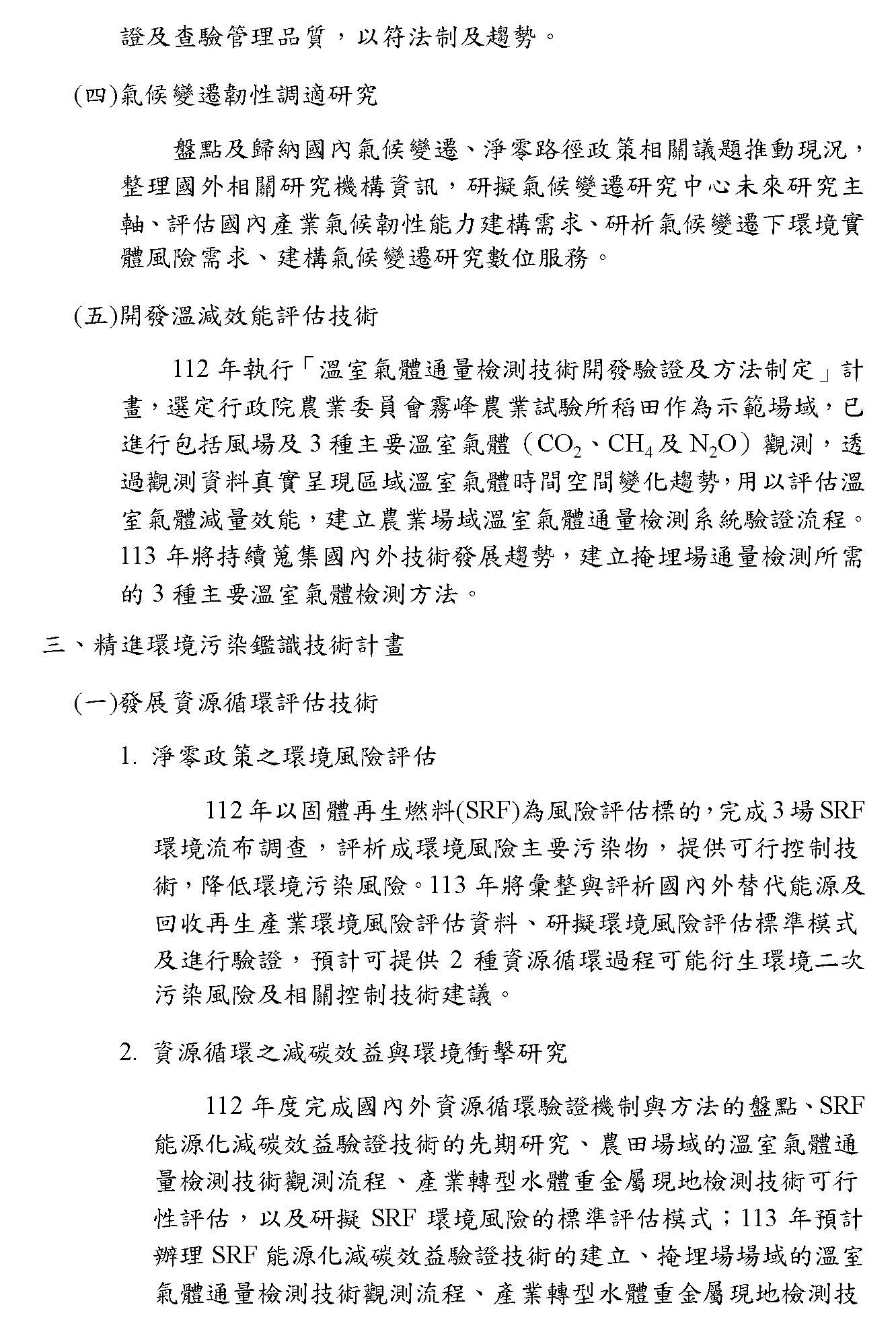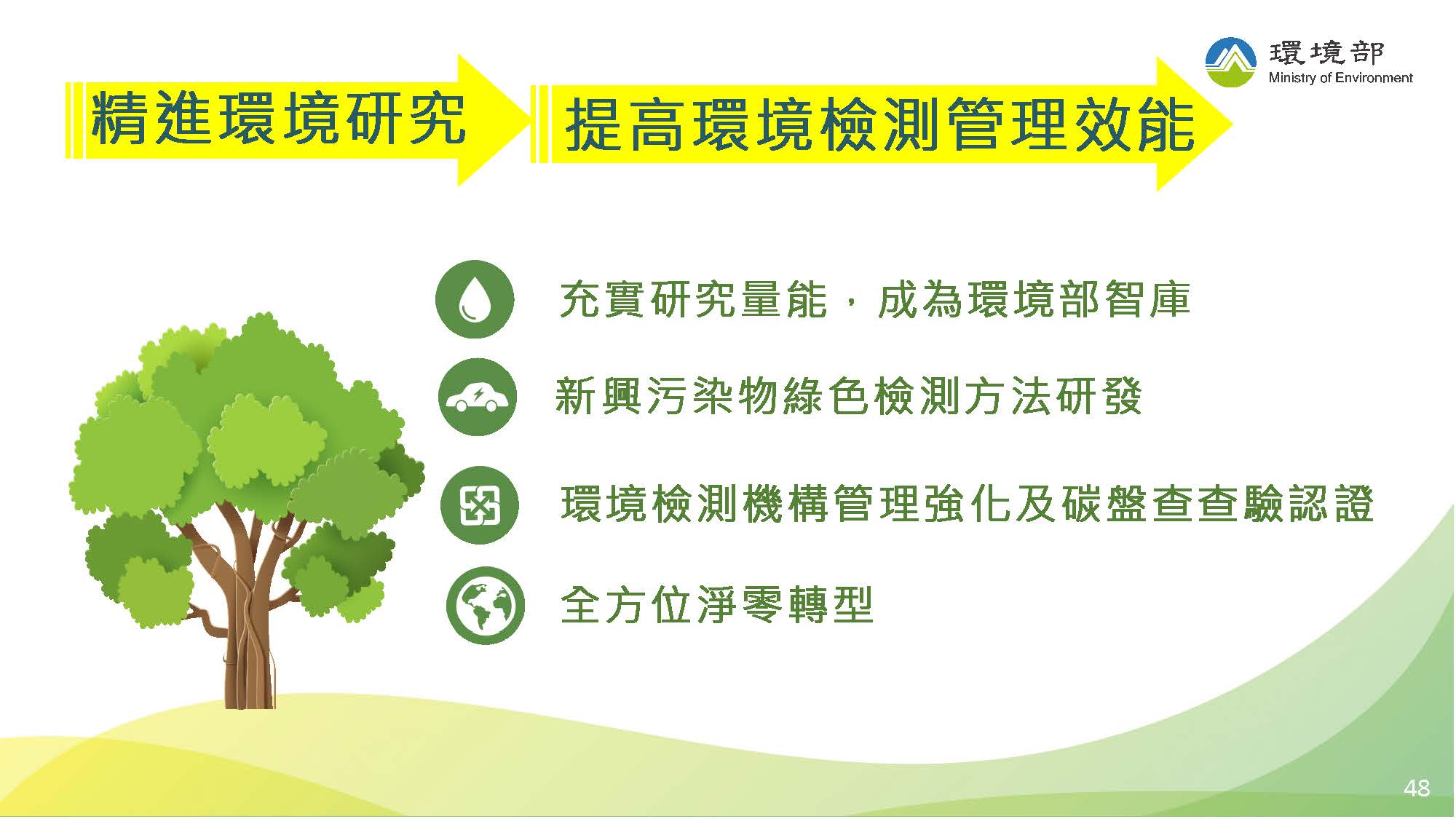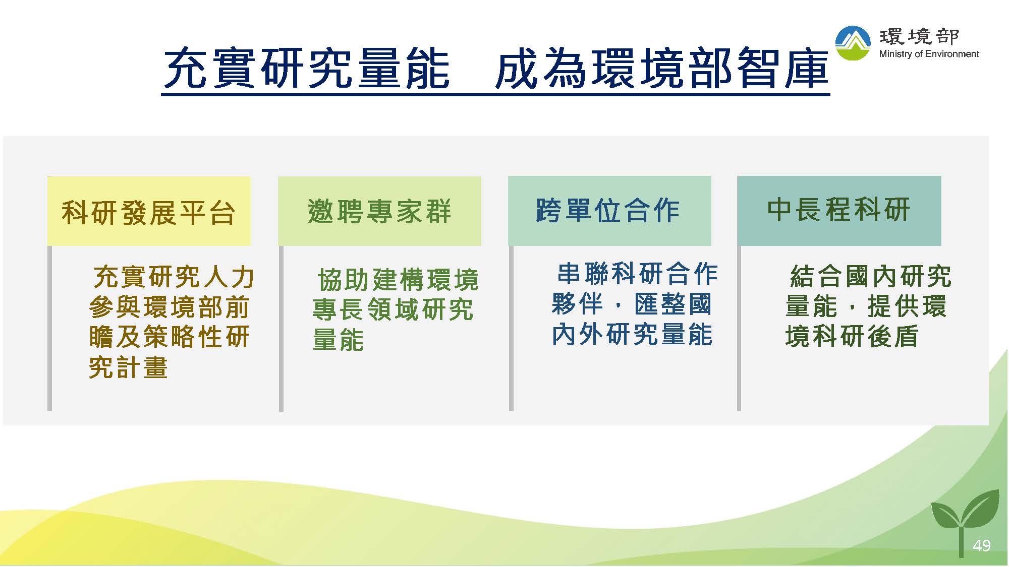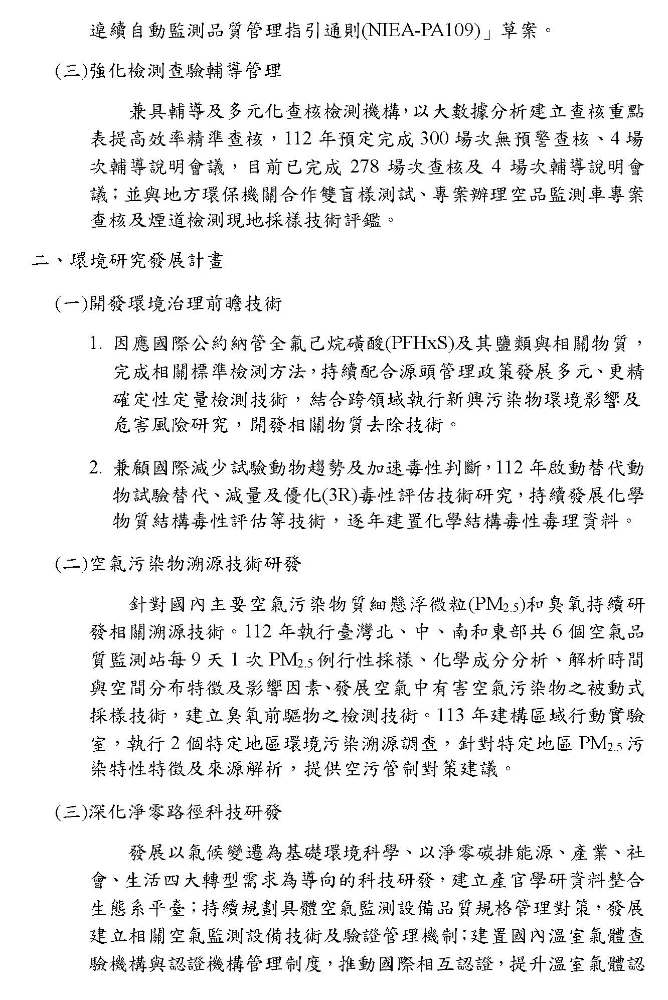 另外,國環院是將原本的環檢所跟環訓所整合,未來希望能夠充實國環院的研發能量,可以跟國內的學術界、研究界,甚至產業界合作,提供更先進有關環境知識的策略規劃。