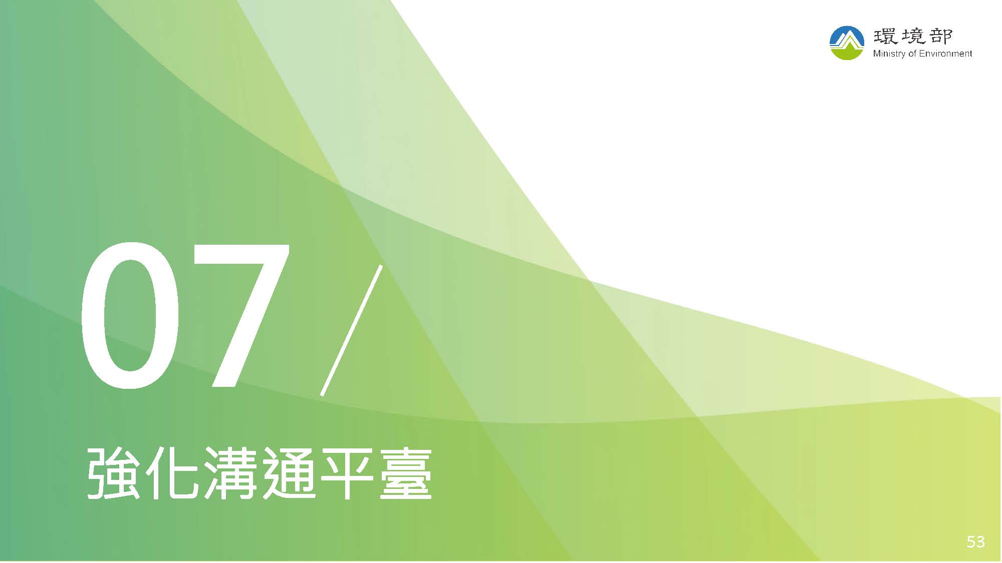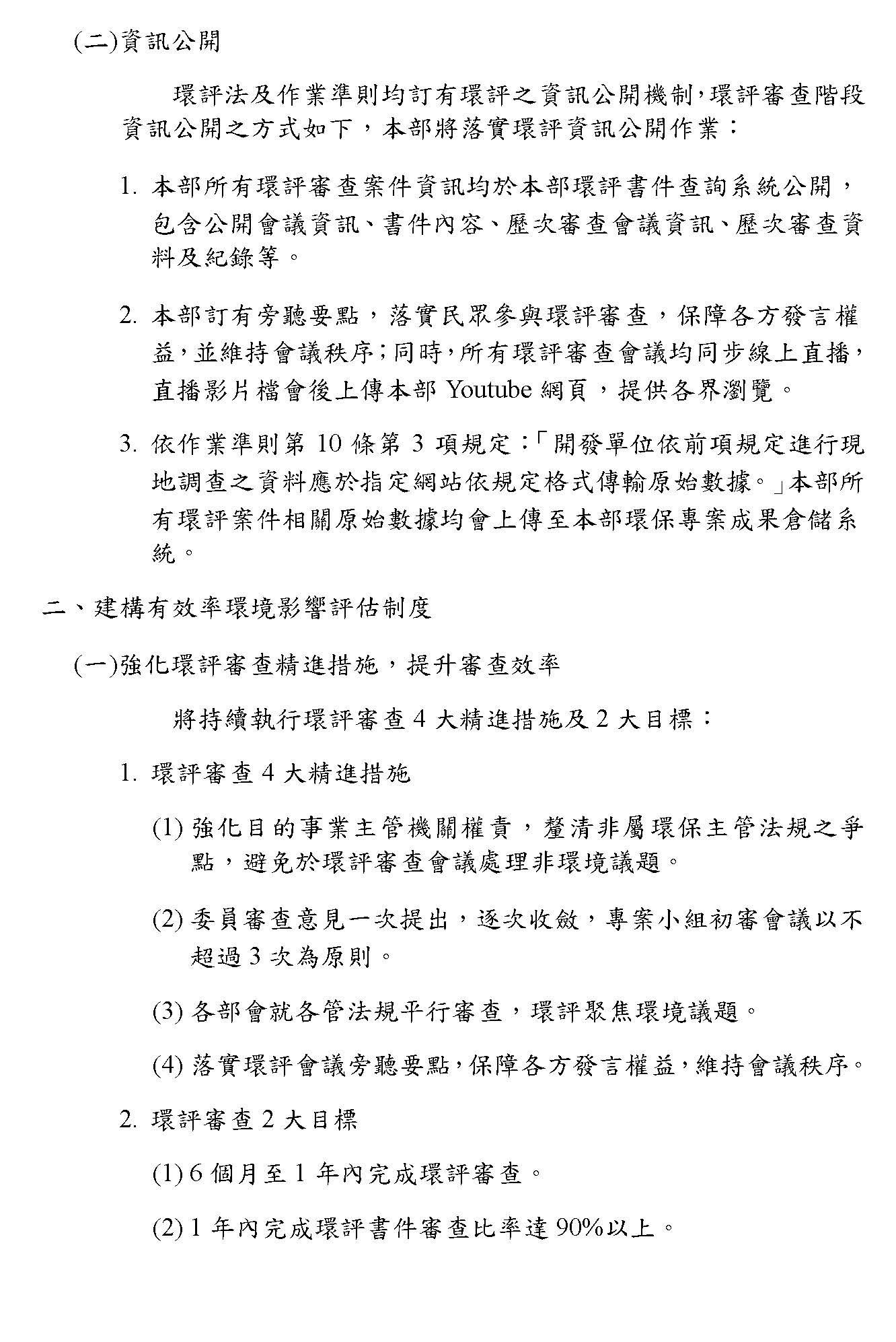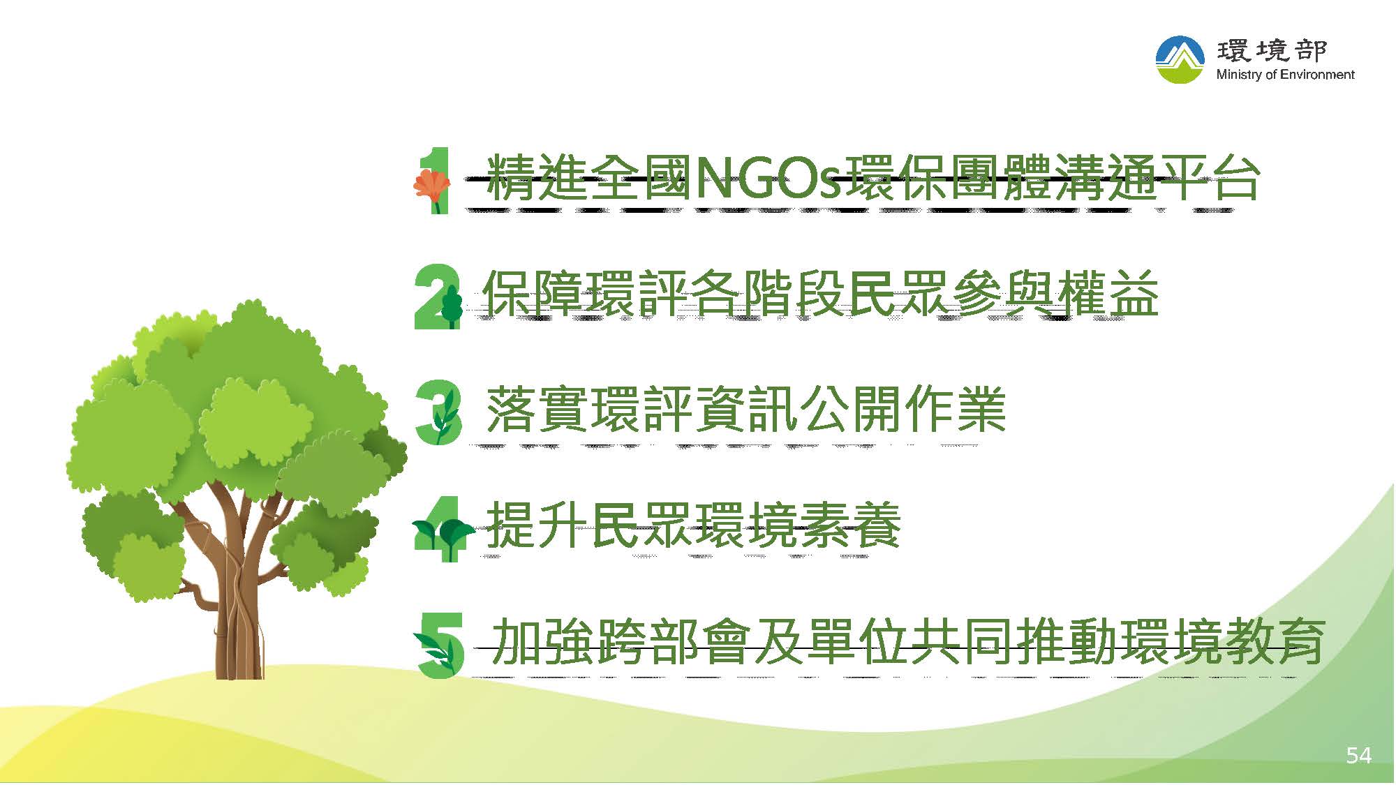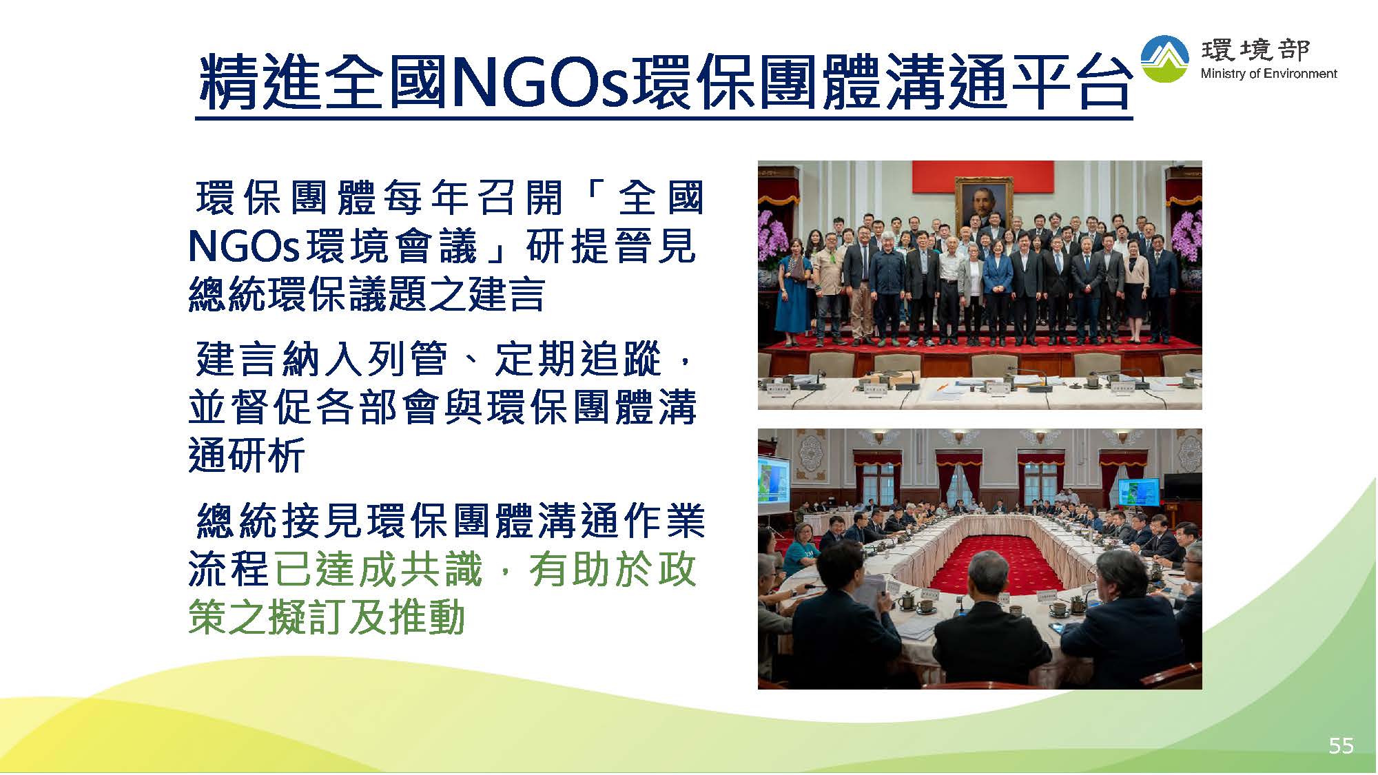 第七點是有關強化溝通平台的部分。我上任到目前為止已經跟環團至少溝通6次以上,特別是在這個禮拜一跟中部地區環團大概將近三十幾位有非常好的溝通,未來也持續會強化溝通面。我覺得環境部應該跟公民團體、跟環保團體,跟社會大眾打開溝通之門,能夠讓我們的政策可以落實,也解決基層民眾的困擾。