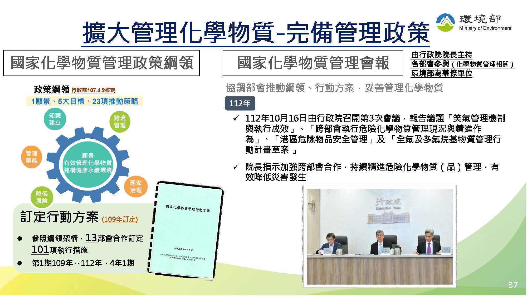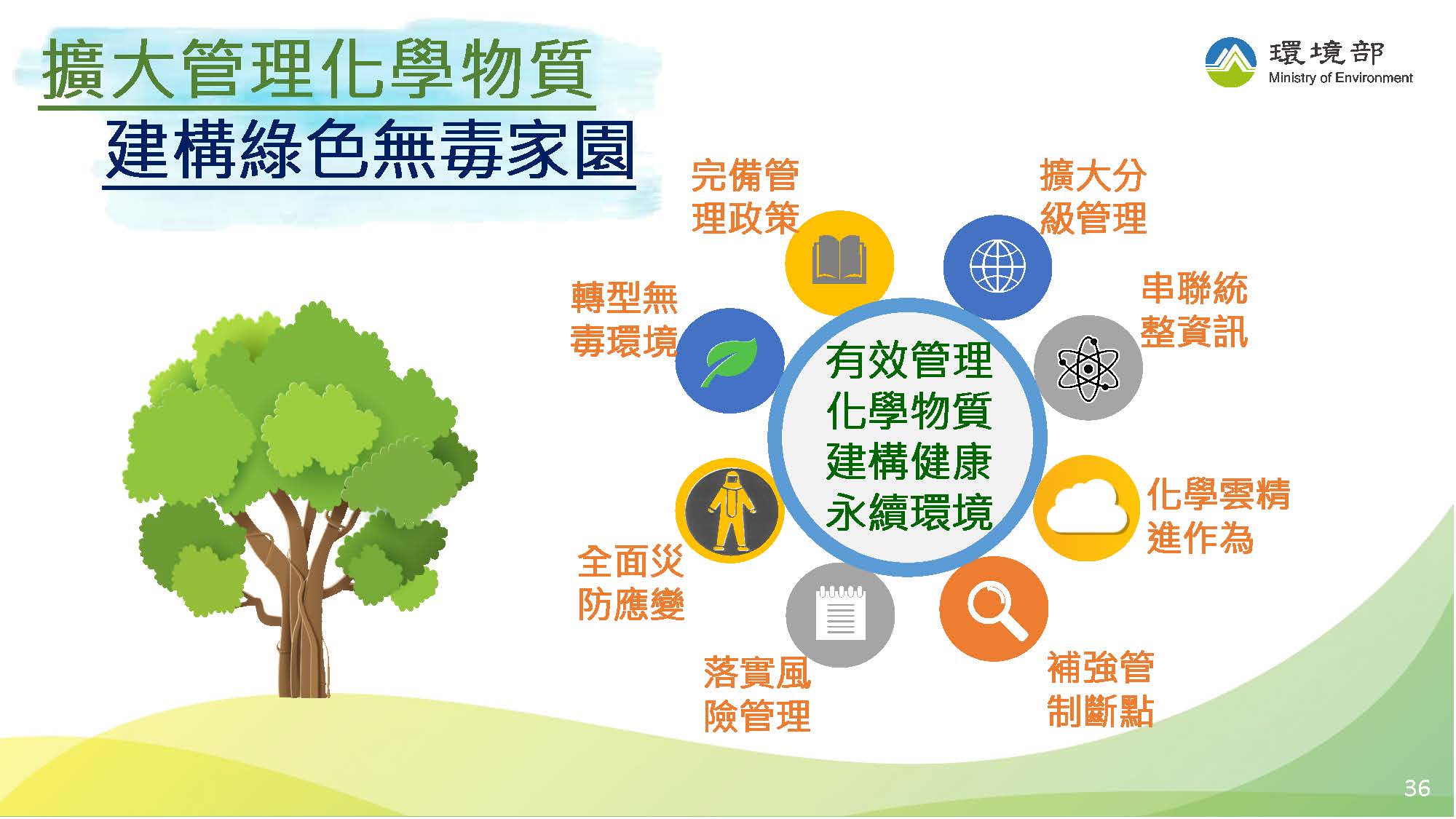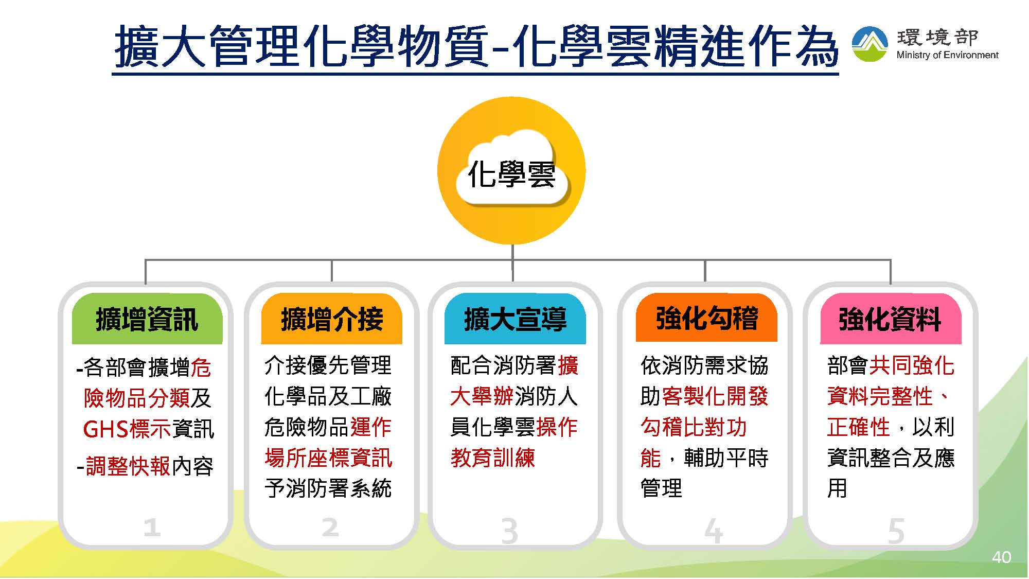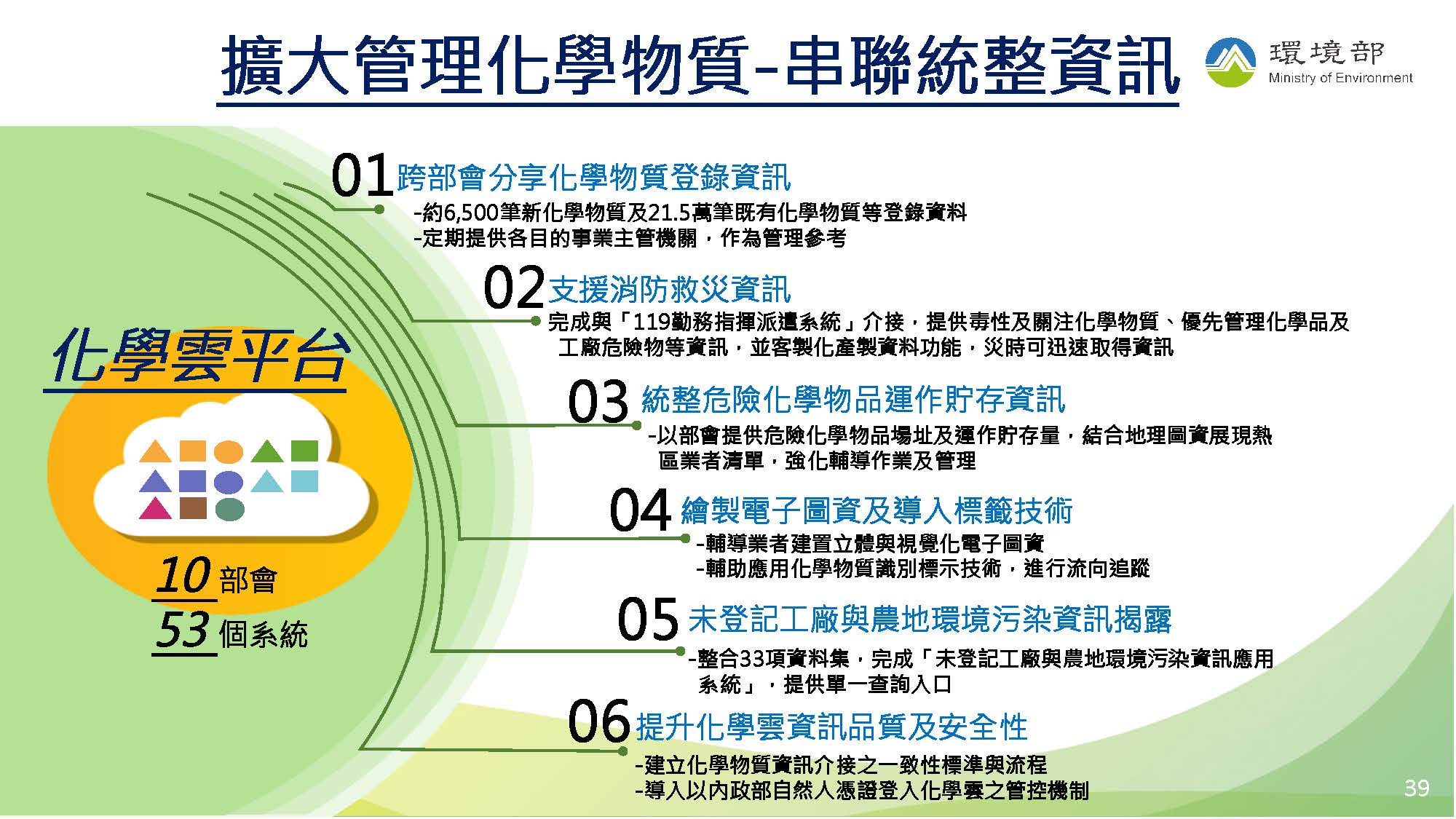 接下來跟各位報告的就是有關化學物質管制部分。我們希望推動健康無毒的家園,所以在化學管理署方面,我們現在也積極跨部會合作來充實化學雲的內容,這個化學雲是各個部會根據相關法規訂定每一種化學物質必須申報的包括時程、包括量能等等,由環境部來統整。今年明揚大火事實上給大家一個很大的教訓,我們也希望業者方面必須要能夠有自主管理的量能,同時它的資料必須隨時更新。也非常謝謝行政院政委吳政委作跨部會的協調,未來我們充實整個化學雲的資料,讓第一線救災人員隨時上網就可以得到最新的資料,這個對於未來在救災、防災方面可以產生很大的功能。