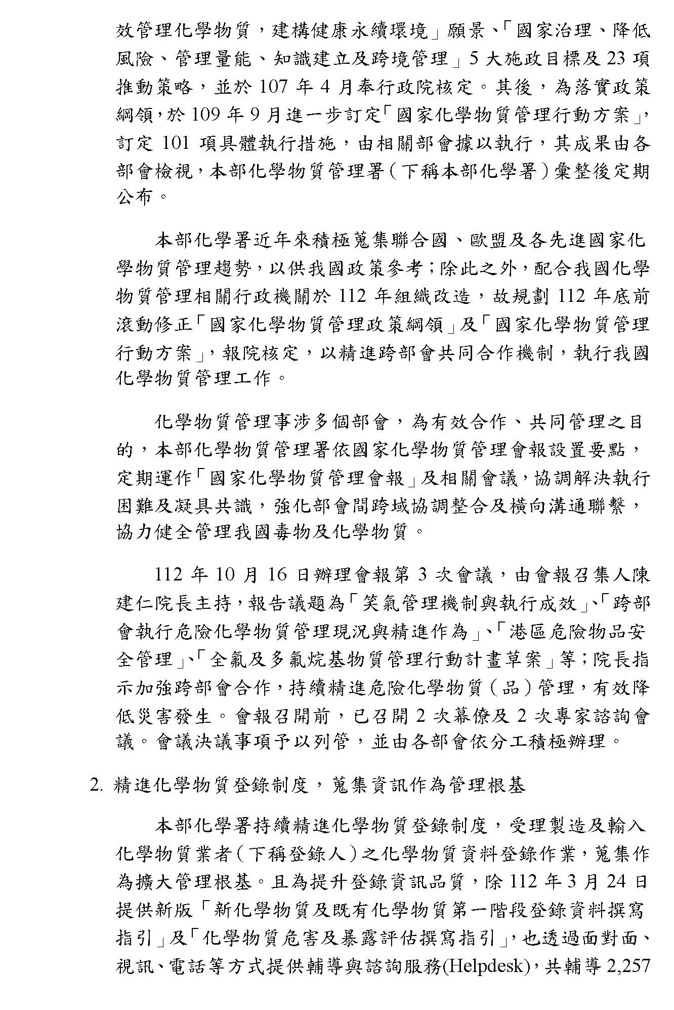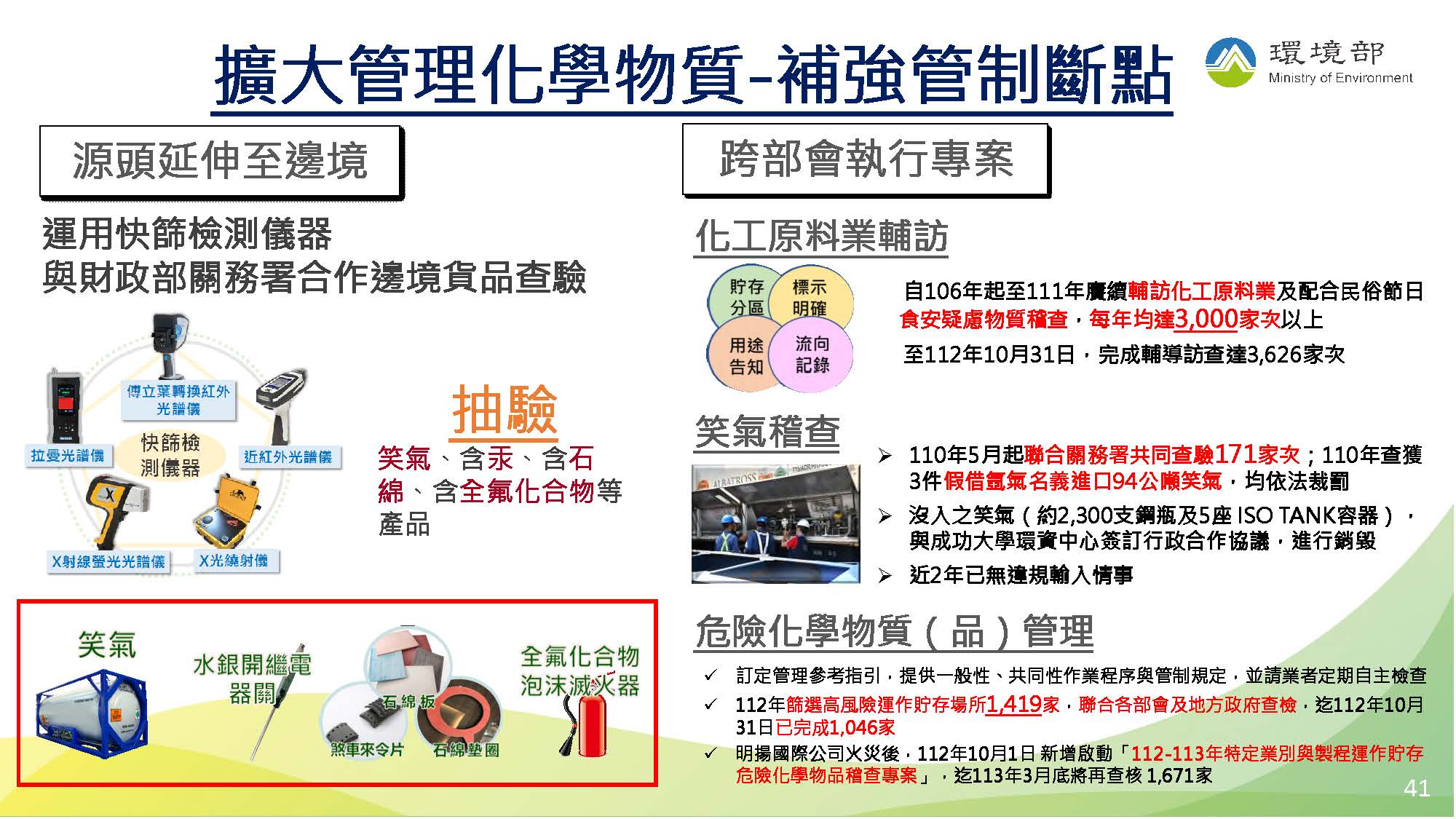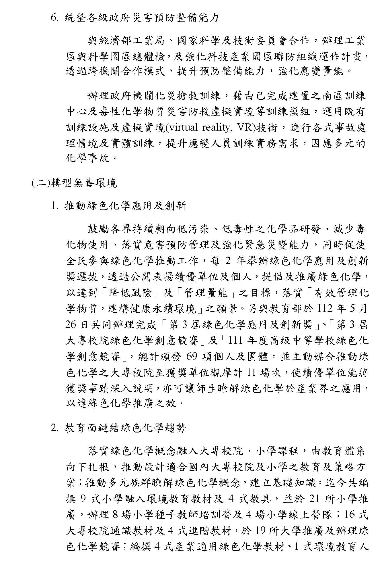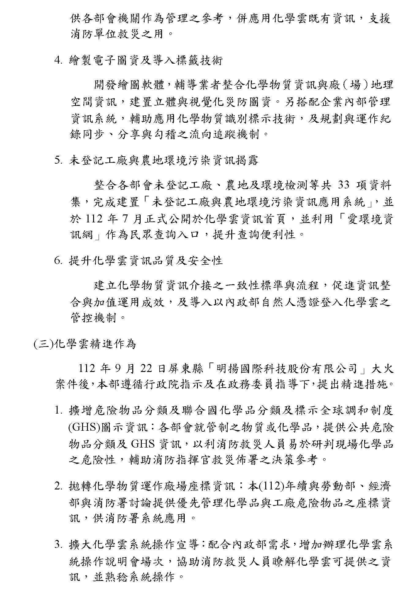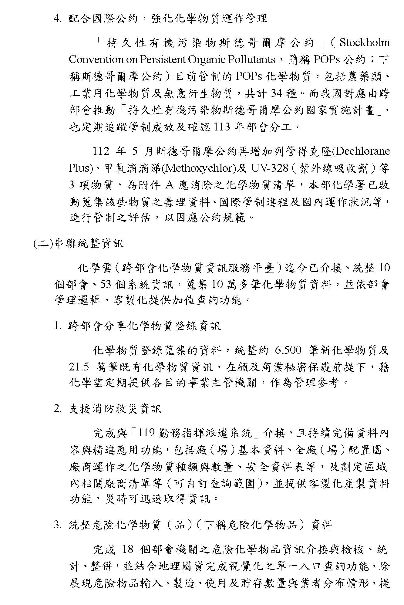 接下來跟各位報告的就是有關化學物質管制部分。我們希望推動健康無毒的家園,所以在化學管理署方面,我們現在也積極跨部會合作來充實化學雲的內容,這個化學雲是各個部會根據相關法規訂定每一種化學物質必須申報的包括時程、包括量能等等,由環境部來統整。今年明揚大火事實上給大家一個很大的教訓,我們也希望業者方面必須要能夠有自主管理的量能,同時它的資料必須隨時更新。也非常謝謝行政院政委吳政委作跨部會的協調,未來我們充實整個化學雲的資料,讓第一線救災人員隨時上網就可以得到最新的資料,這個對於未來在救災、防災方面可以產生很大的功能。