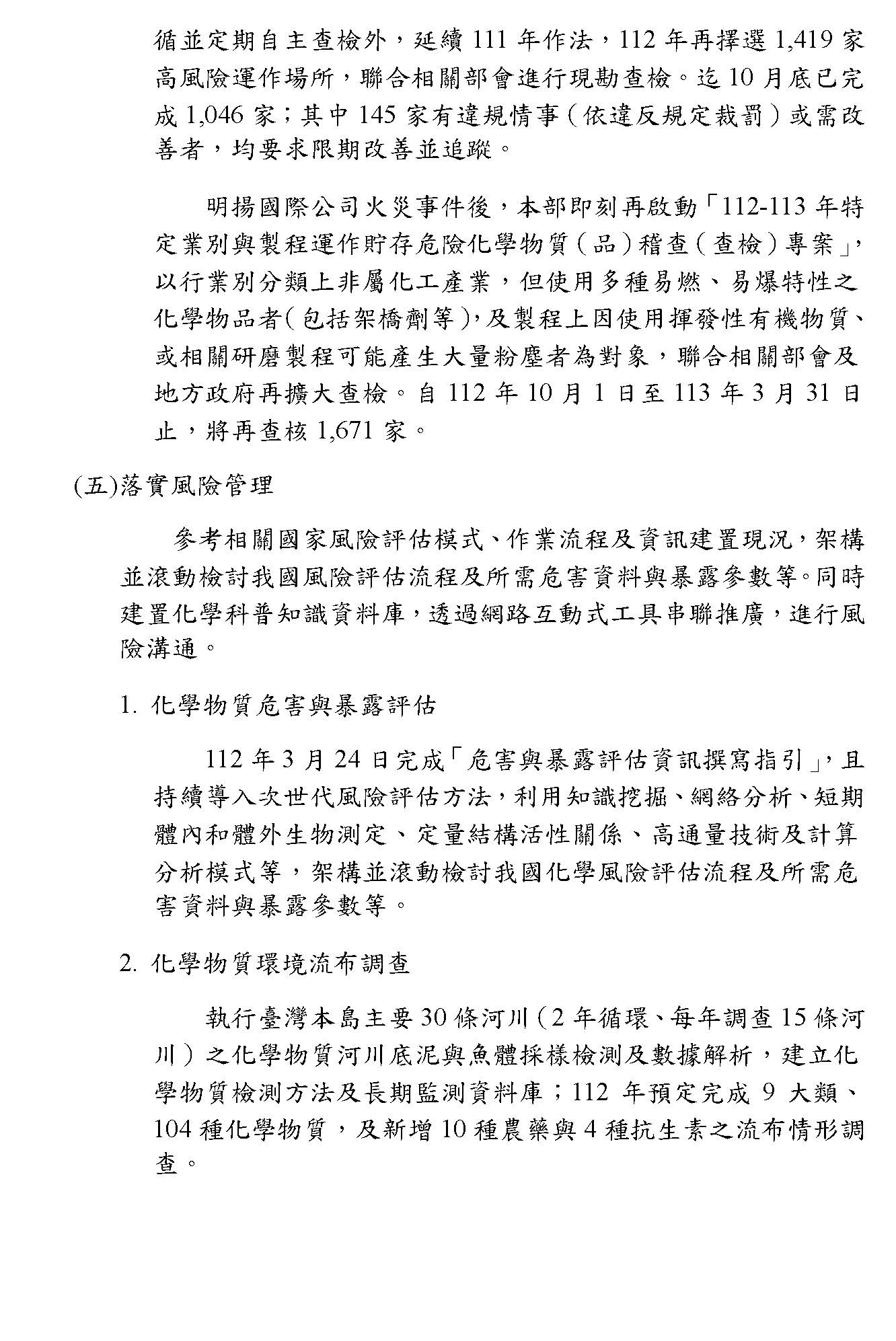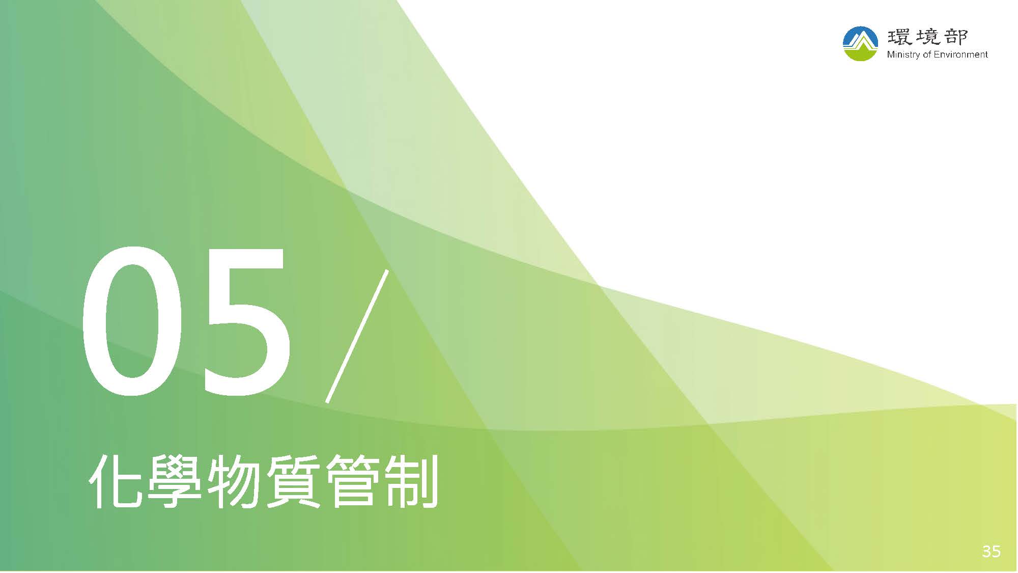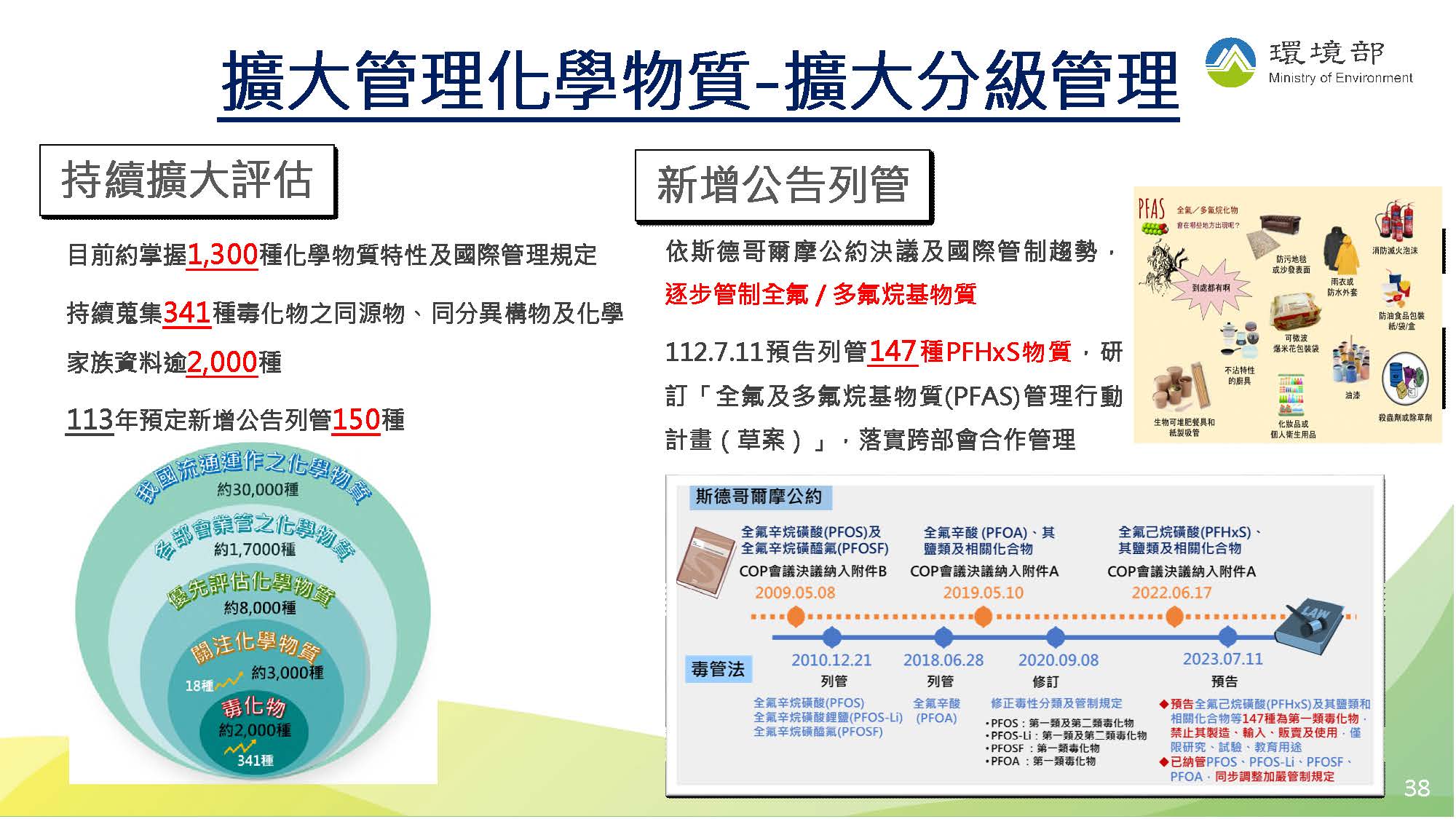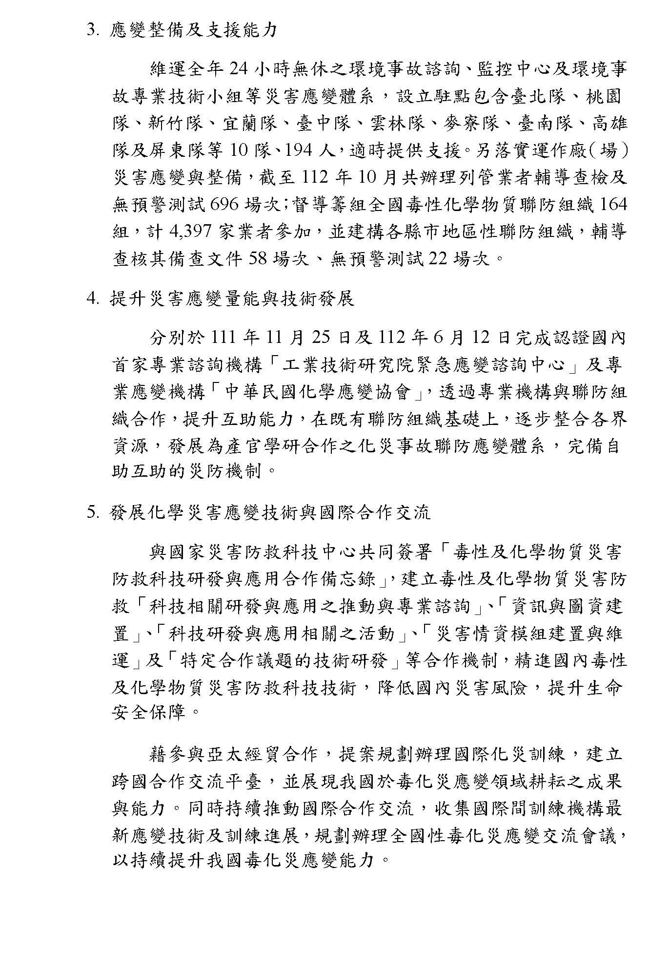 接下來跟各位報告的就是有關化學物質管制部分。我們希望推動健康無毒的家園,所以在化學管理署方面,我們現在也積極跨部會合作來充實化學雲的內容,這個化學雲是各個部會根據相關法規訂定每一種化學物質必須申報的包括時程、包括量能等等,由環境部來統整。今年明揚大火事實上給大家一個很大的教訓,我們也希望業者方面必須要能夠有自主管理的量能,同時它的資料必須隨時更新。也非常謝謝行政院政委吳政委作跨部會的協調,未來我們充實整個化學雲的資料,讓第一線救災人員隨時上網就可以得到最新的資料,這個對於未來在救災、防災方面可以產生很大的功能。