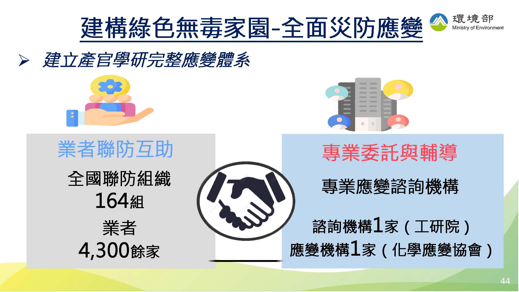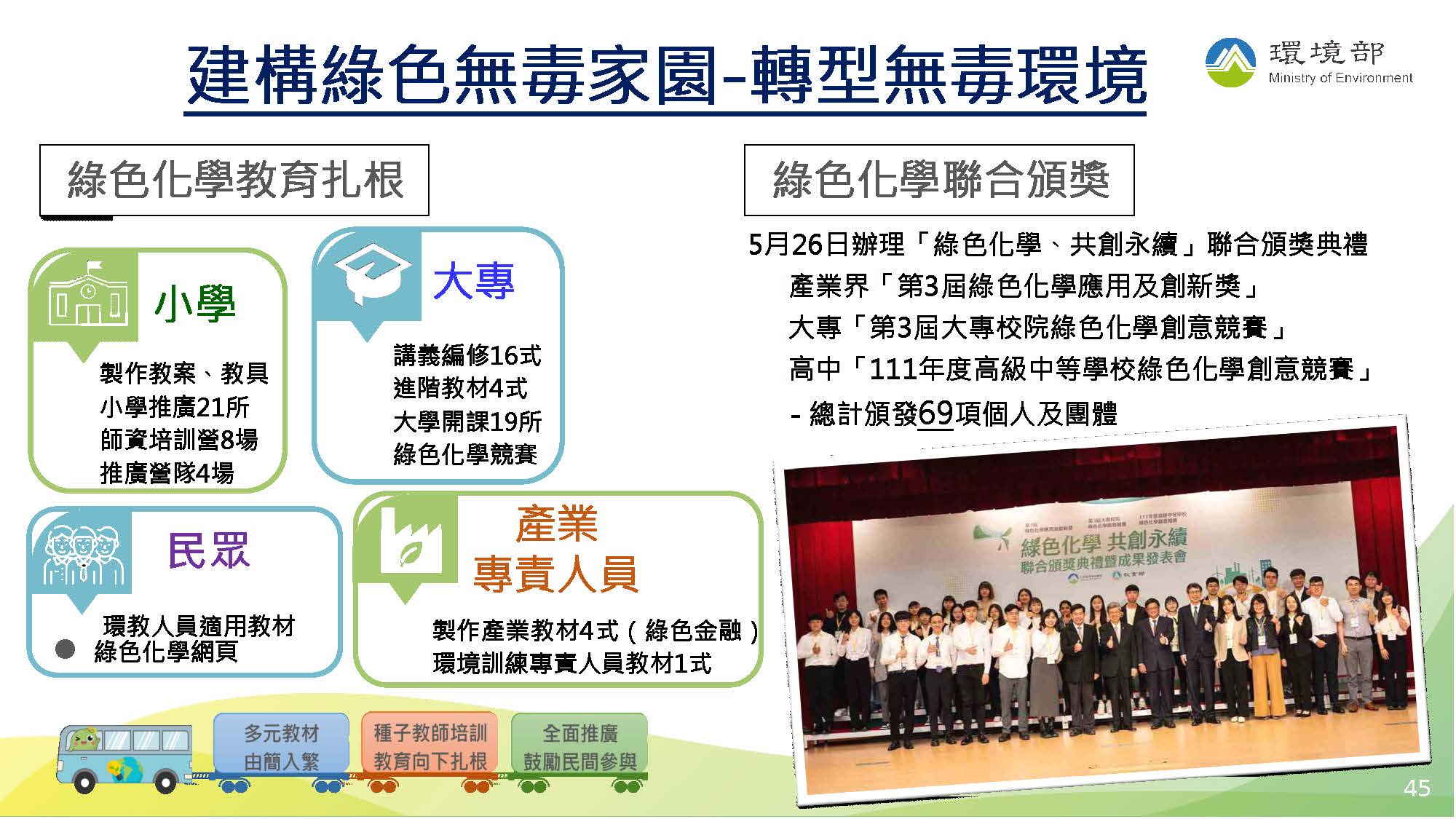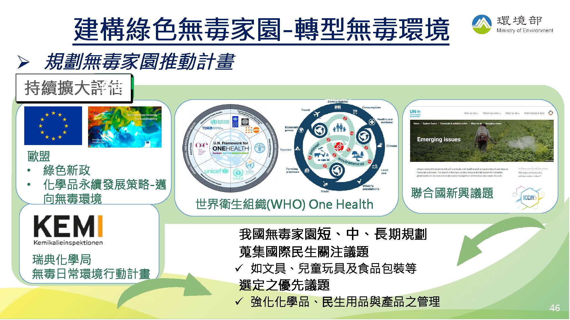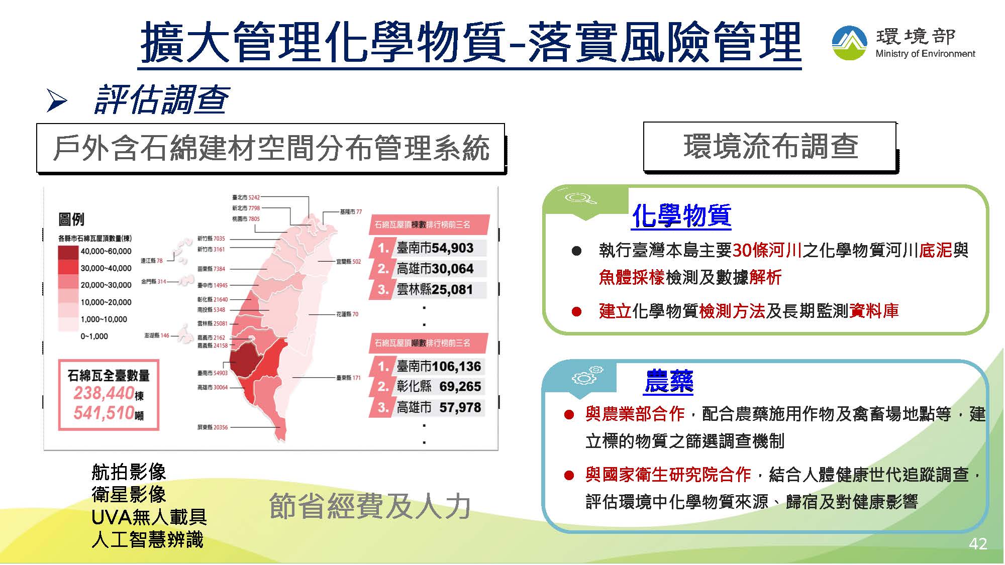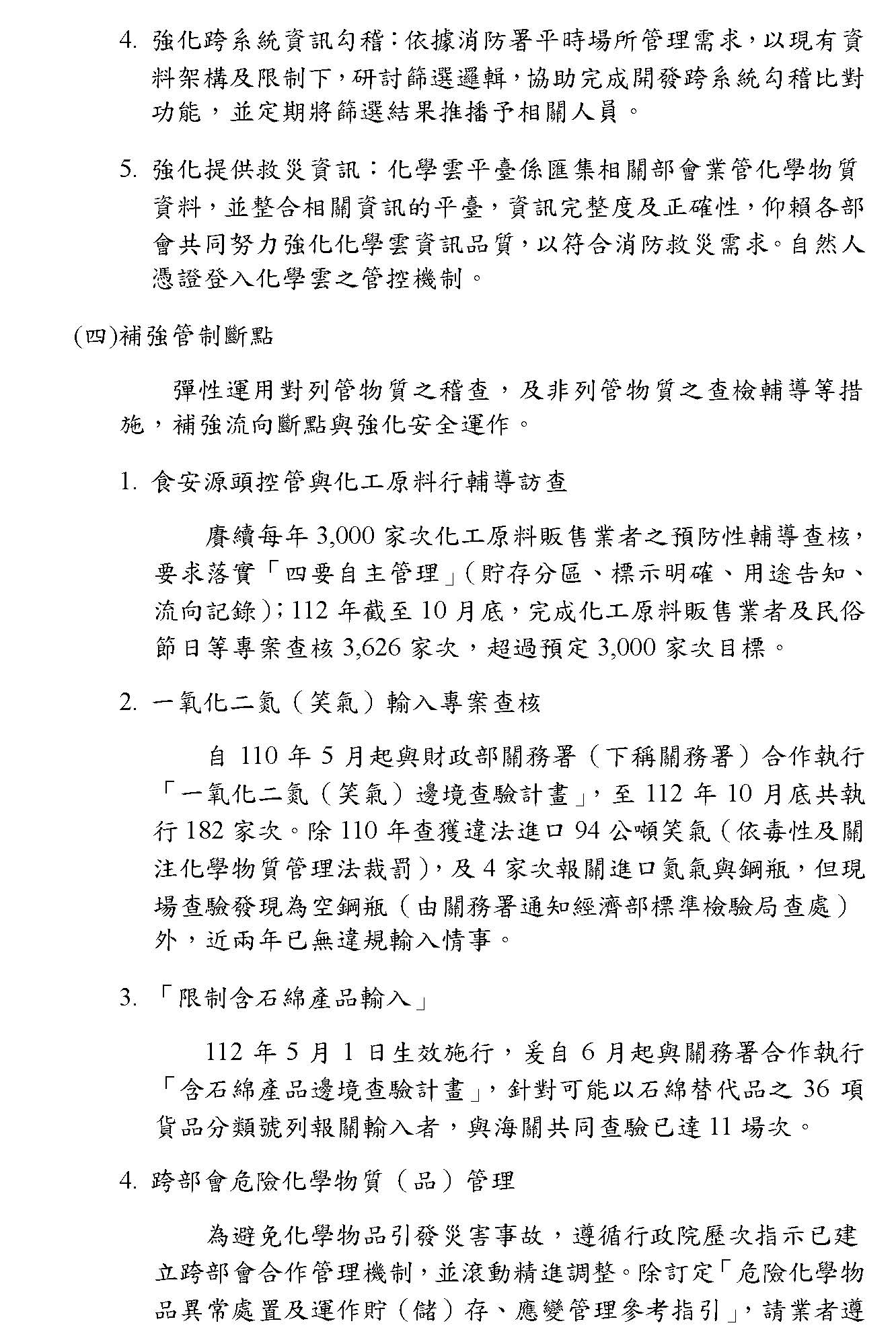 接下來跟各位報告的就是有關化學物質管制部分。我們希望推動健康無毒的家園,所以在化學管理署方面,我們現在也積極跨部會合作來充實化學雲的內容,這個化學雲是各個部會根據相關法規訂定每一種化學物質必須申報的包括時程、包括量能等等,由環境部來統整。今年明揚大火事實上給大家一個很大的教訓,我們也希望業者方面必須要能夠有自主管理的量能,同時它的資料必須隨時更新。也非常謝謝行政院政委吳政委作跨部會的協調,未來我們充實整個化學雲的資料,讓第一線救災人員隨時上網就可以得到最新的資料,這個對於未來在救災、防災方面可以產生很大的功能。