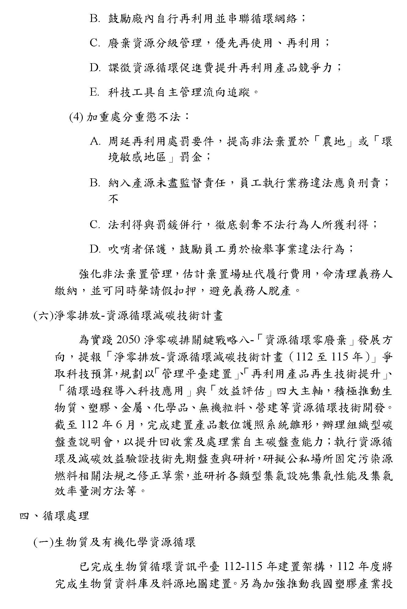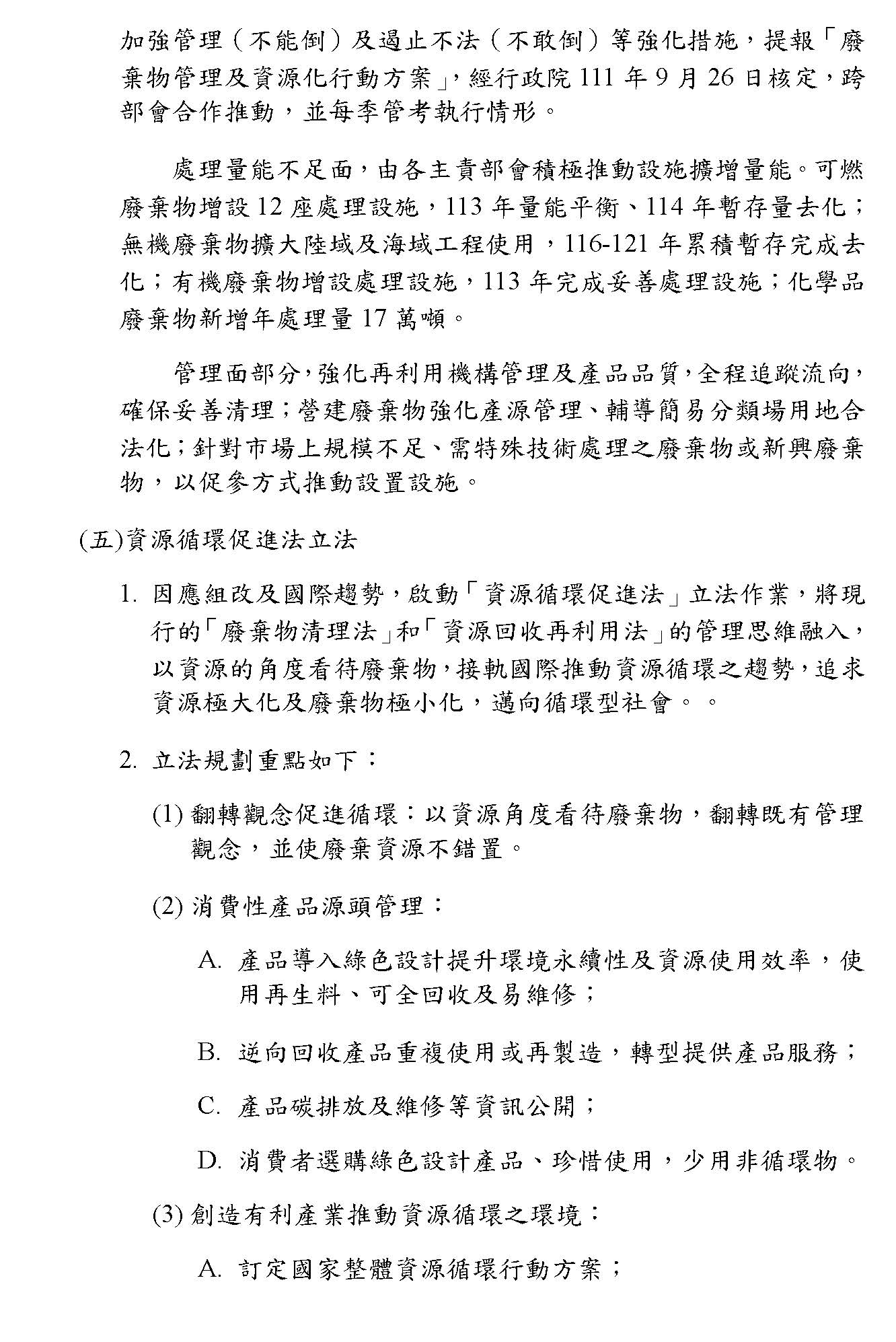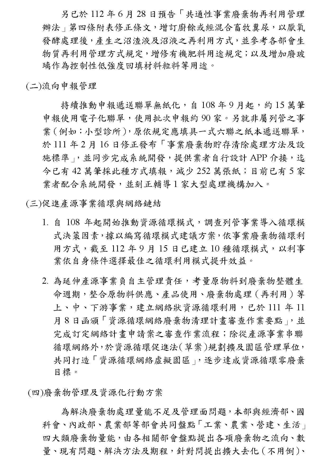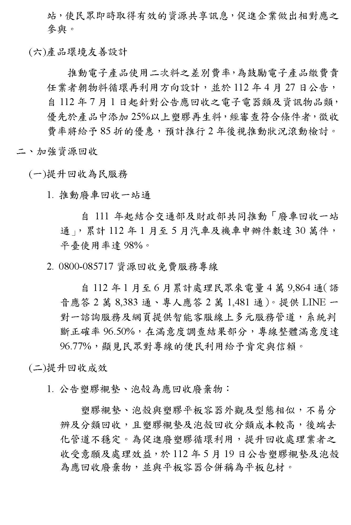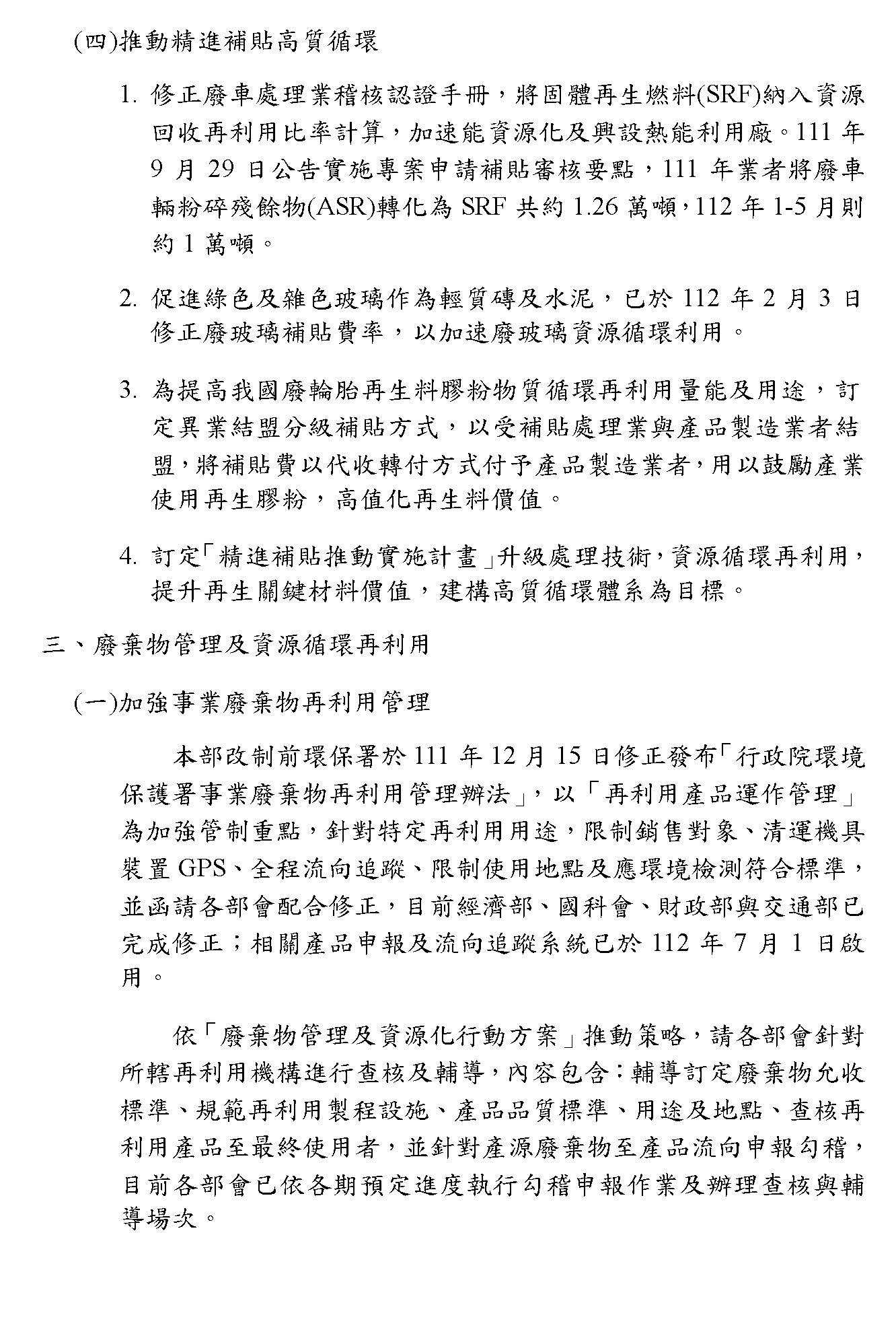 (三)行政院環境保護署函,為112年度中央政府總預算附屬單位預算決議,檢送環境保護基金決議第5項「資源回收管理計畫」預算凍結500萬元書面報告。