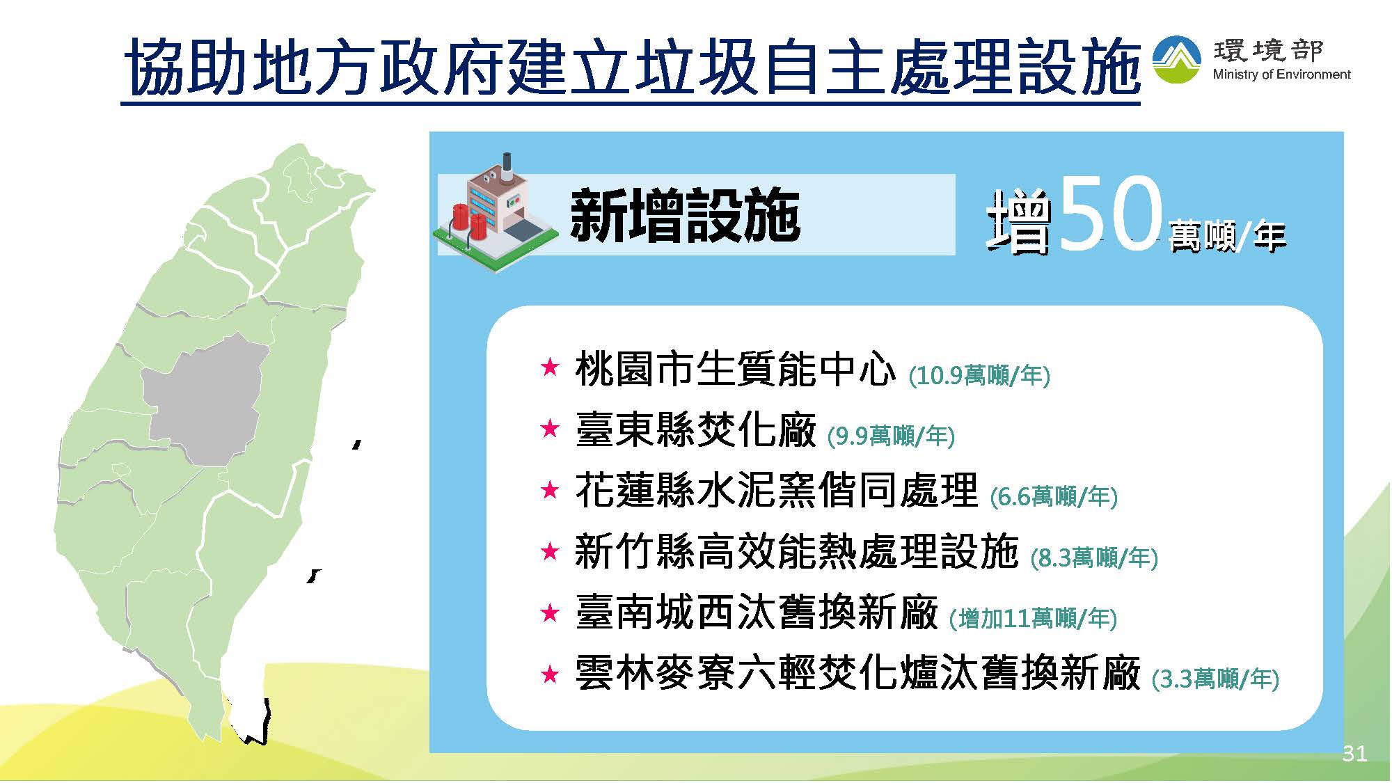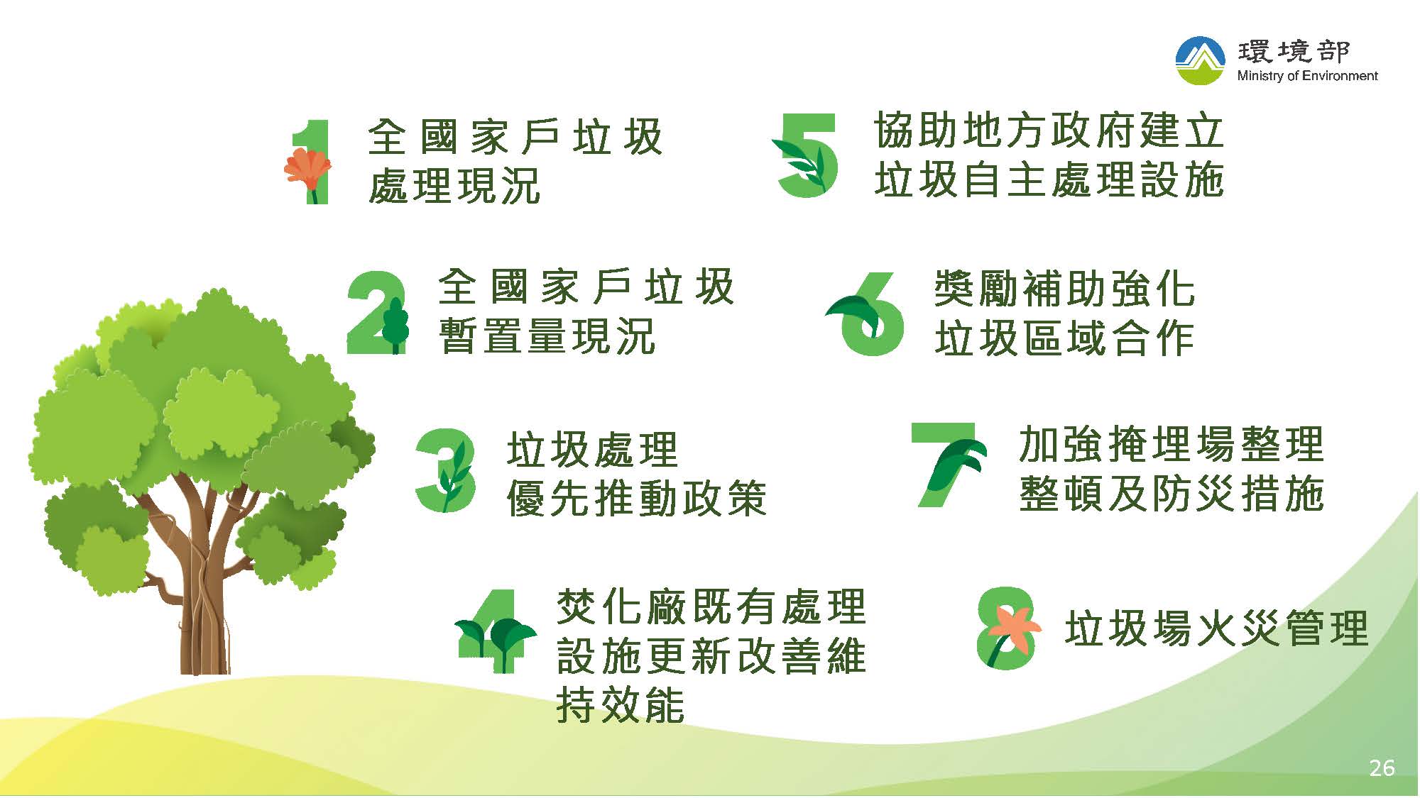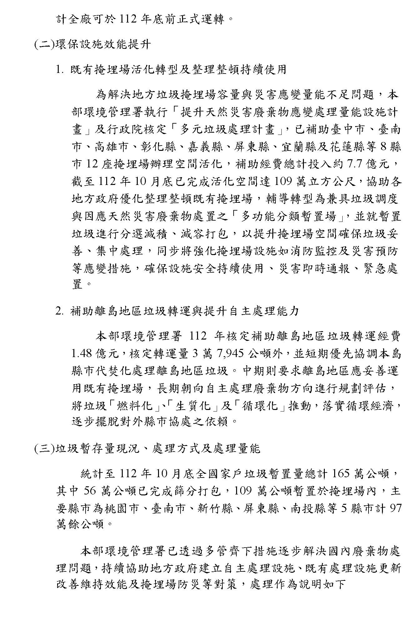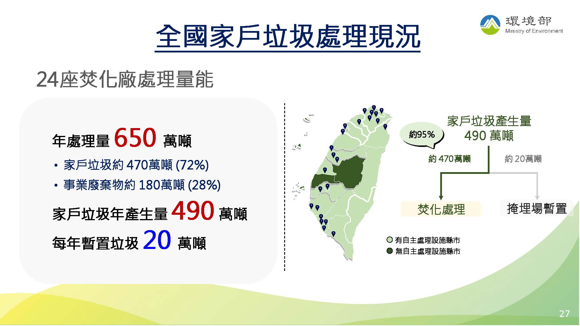 第三個跟各位委員報告的就是有關垃圾處理的問題。這個是大家非常關切的,垃圾處理的問題主要是各縣市環保局主責,環境部透過在中央的高度來協調,幫助各個縣市處理全國的垃圾。目前我們全國總共有24部焚化爐,事實上它的處理量能是650萬噸,理論上是足夠來處理現在一般的家庭廢棄物490萬噸,但是因為在過去有一段時間焚化爐量能有餘,所以協助做事業廢棄物的處理,每年180萬公噸,反而使得我們現在每年大概有20萬噸的家戶垃圾必須用暫置的處理方式。目前環境部積極協助各個縣市,特別是沒有焚化爐的縣市在臺灣本島大概就剩下南投,當然外島的情況是比較特殊,環境部也積極協助各縣市處理垃圾的部分。垃圾的處理當然需要各個縣市有長遠的規劃,環境部絕對會盡全力來協助。