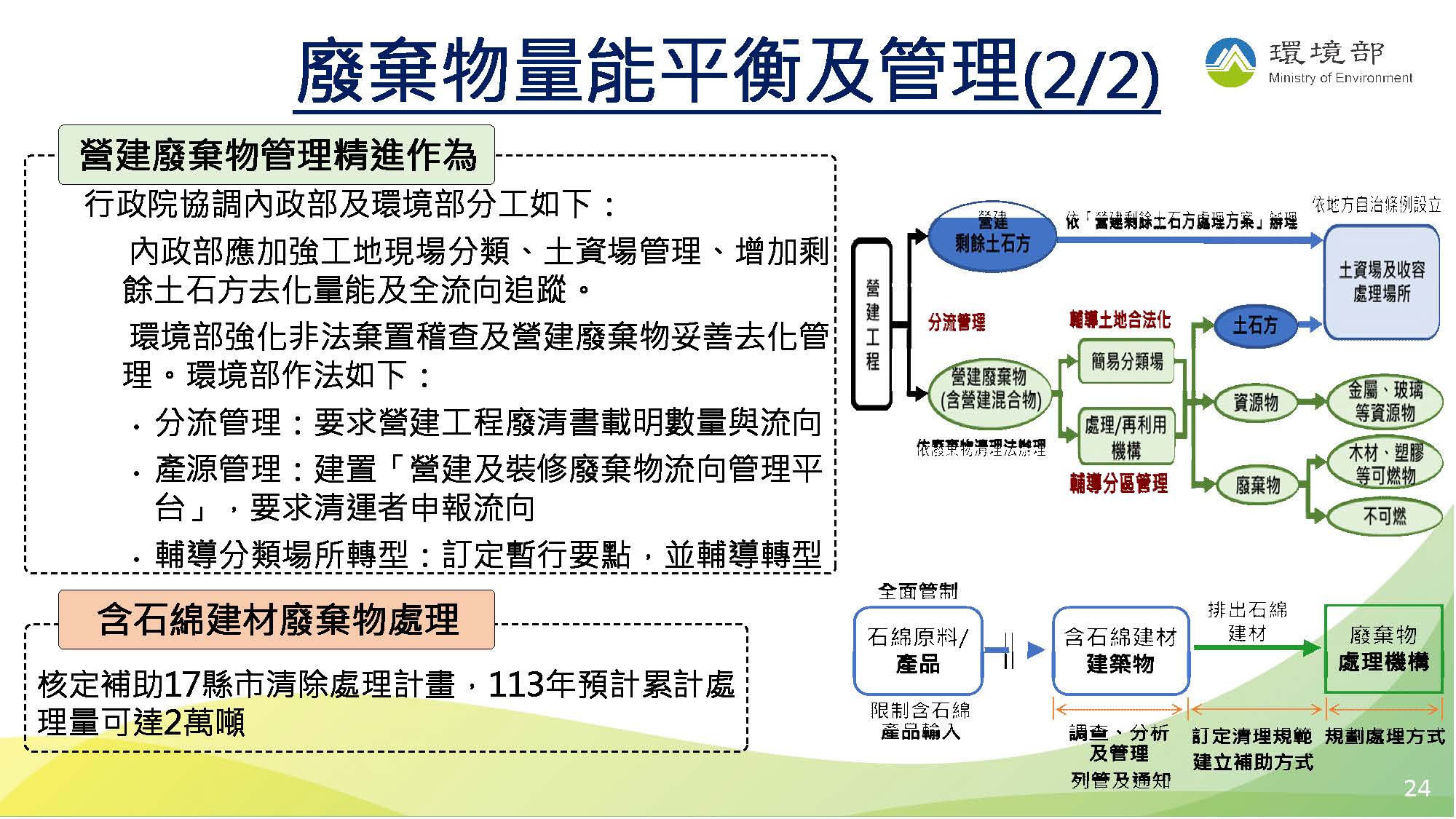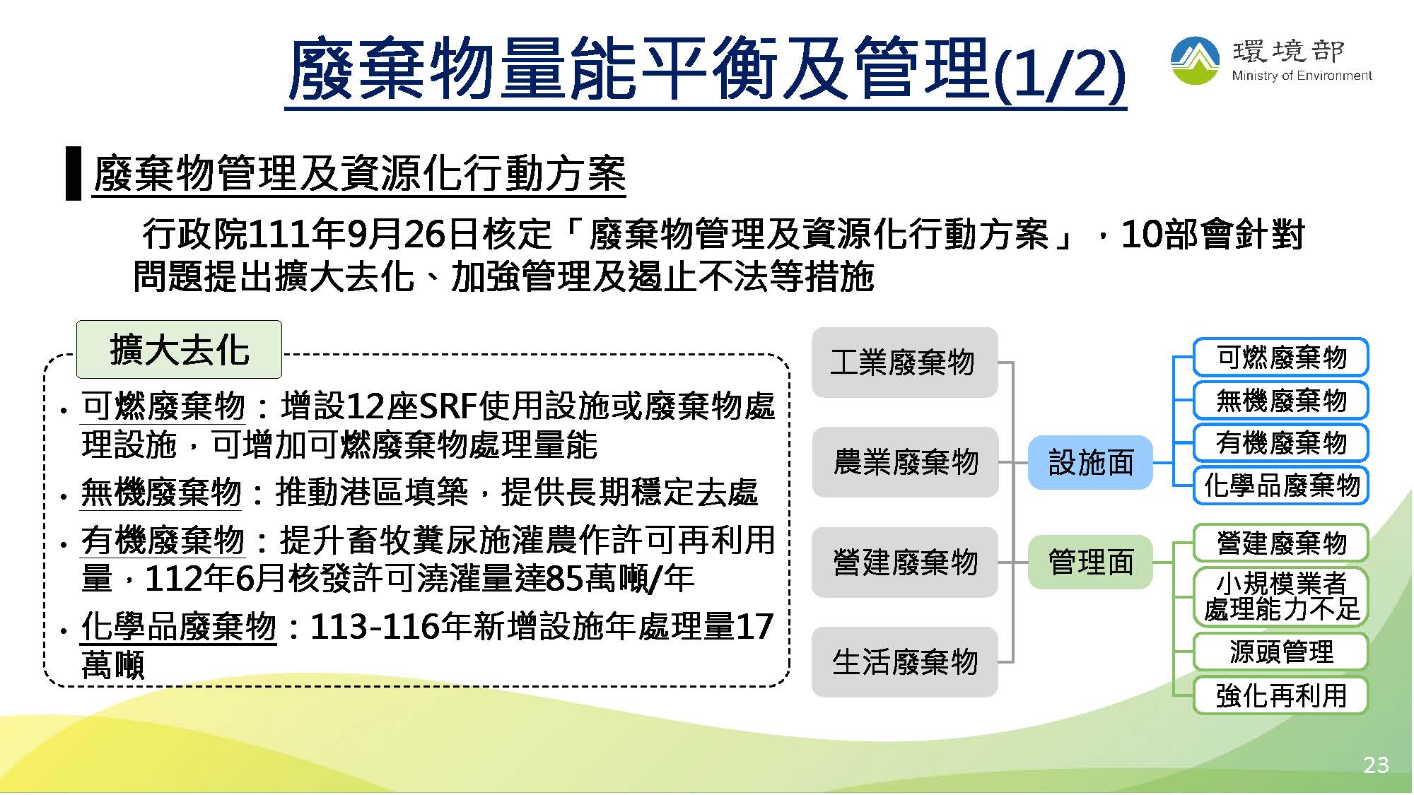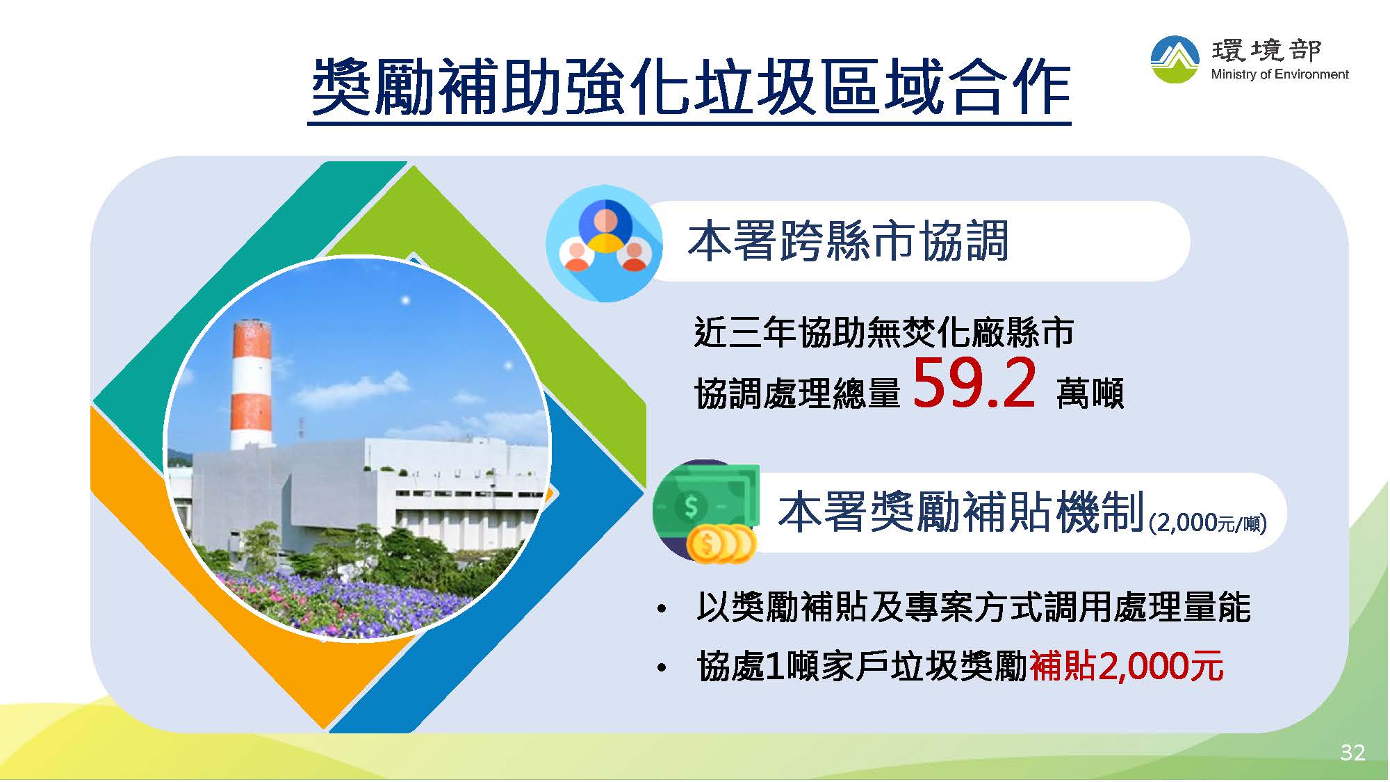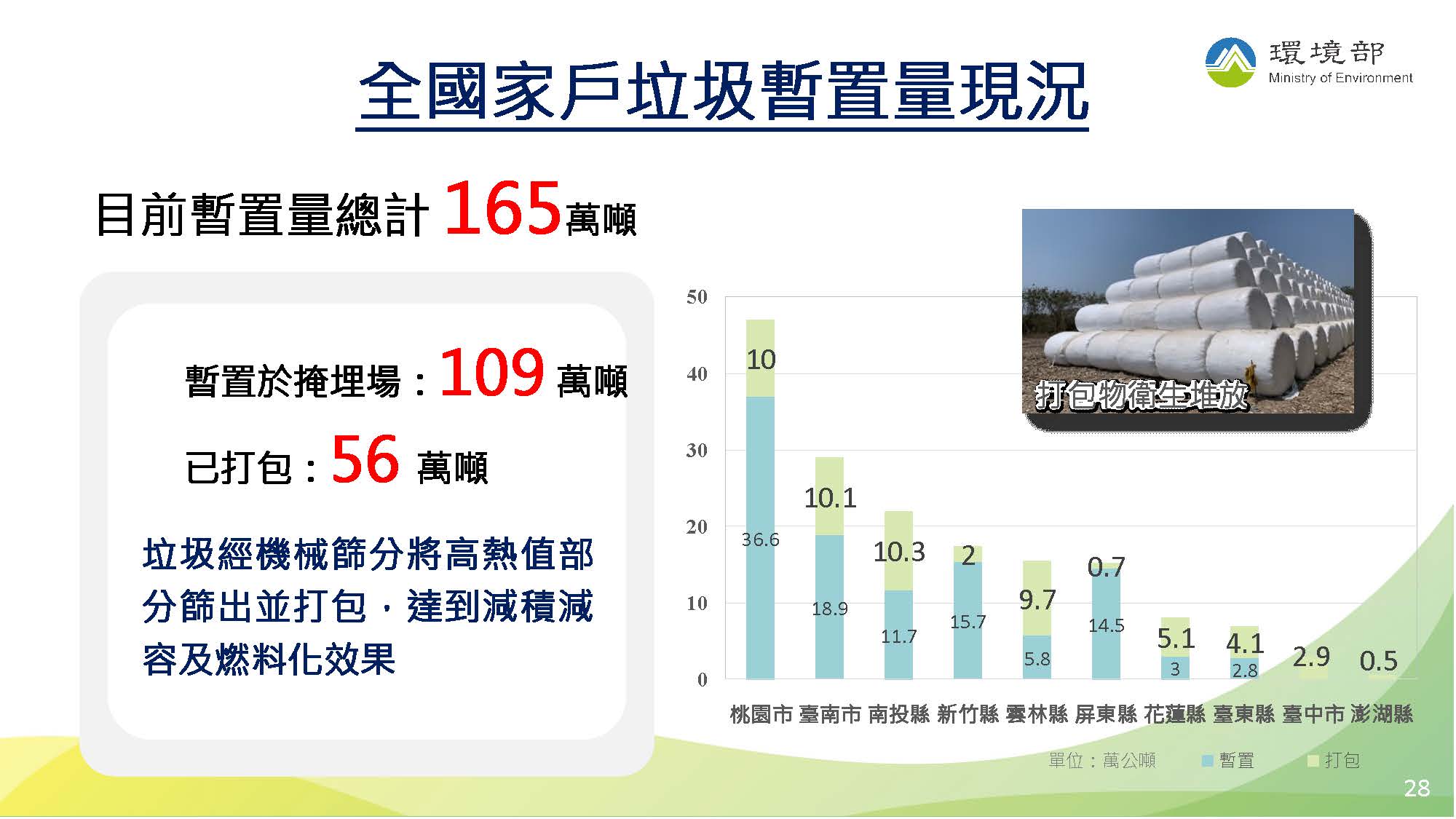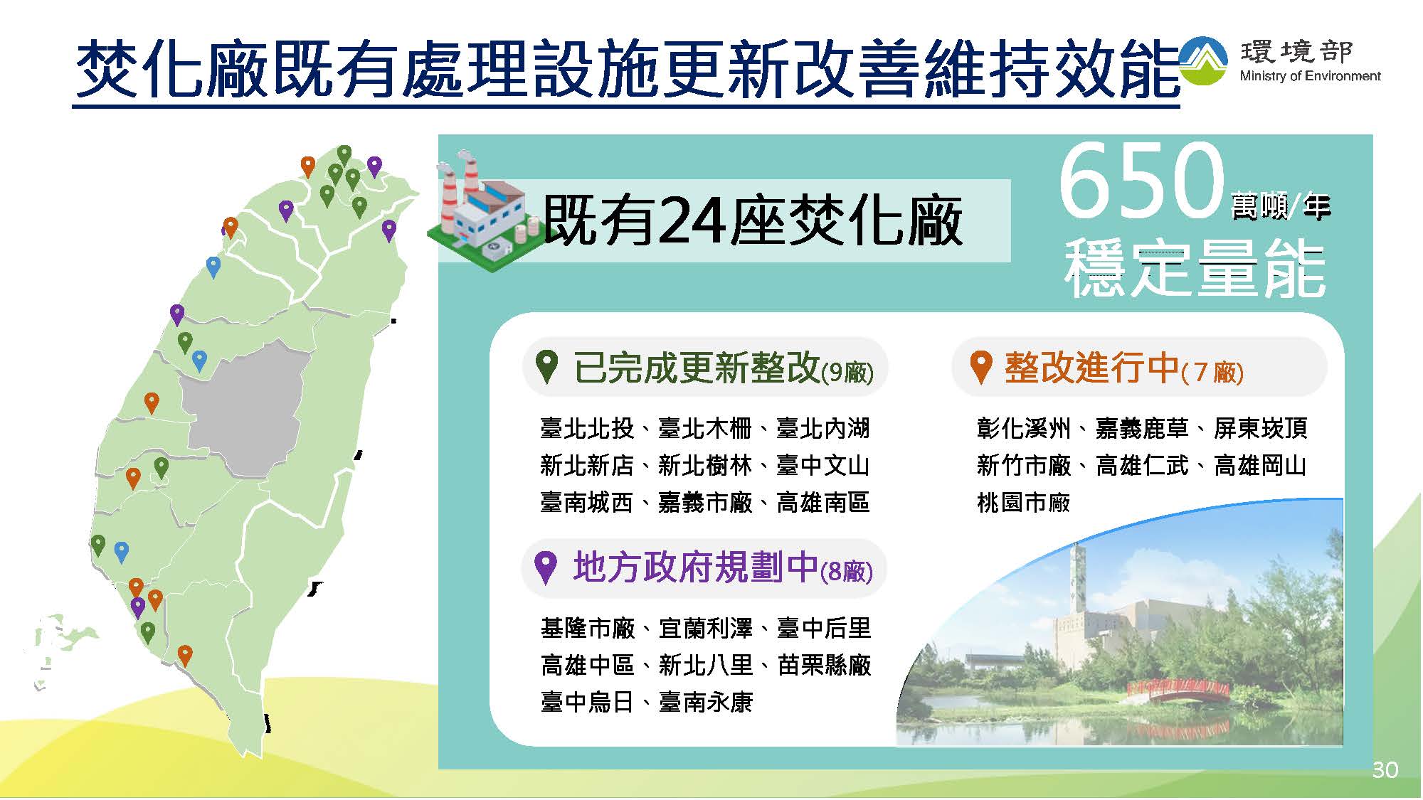 第三個跟各位委員報告的就是有關垃圾處理的問題。這個是大家非常關切的,垃圾處理的問題主要是各縣市環保局主責,環境部透過在中央的高度來協調,幫助各個縣市處理全國的垃圾。目前我們全國總共有24部焚化爐,事實上它的處理量能是650萬噸,理論上是足夠來處理現在一般的家庭廢棄物490萬噸,但是因為在過去有一段時間焚化爐量能有餘,所以協助做事業廢棄物的處理,每年180萬公噸,反而使得我們現在每年大概有20萬噸的家戶垃圾必須用暫置的處理方式。目前環境部積極協助各個縣市,特別是沒有焚化爐的縣市在臺灣本島大概就剩下南投,當然外島的情況是比較特殊,環境部也積極協助各縣市處理垃圾的部分。垃圾的處理當然需要各個縣市有長遠的規劃,環境部絕對會盡全力來協助。