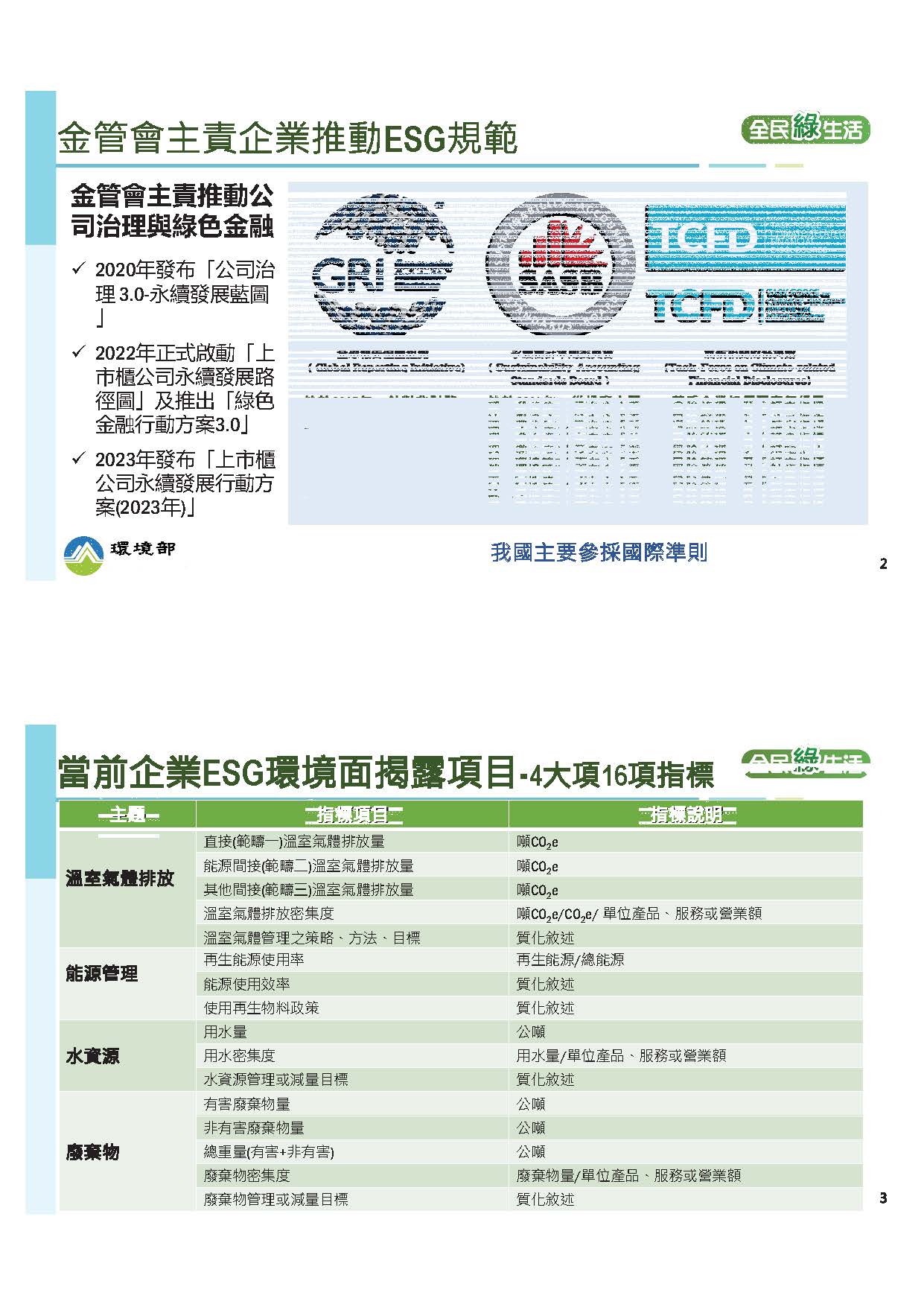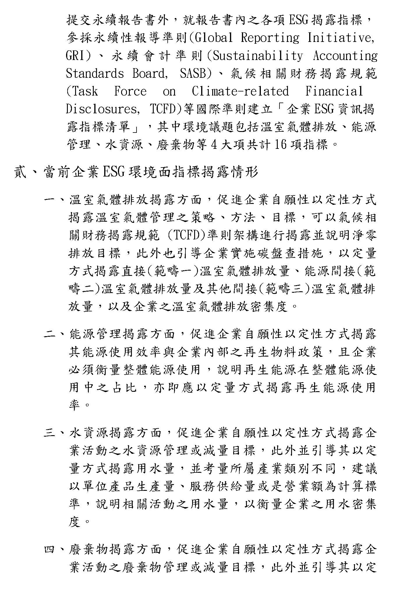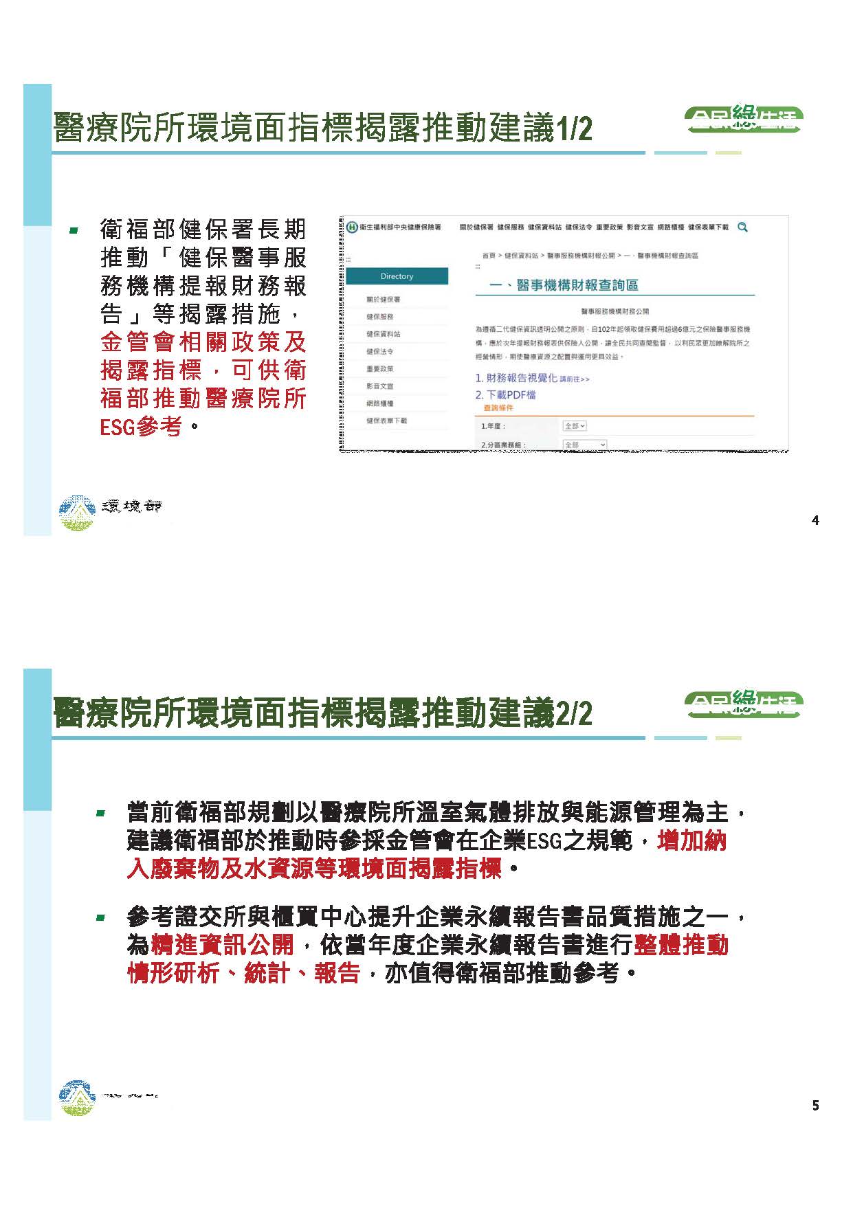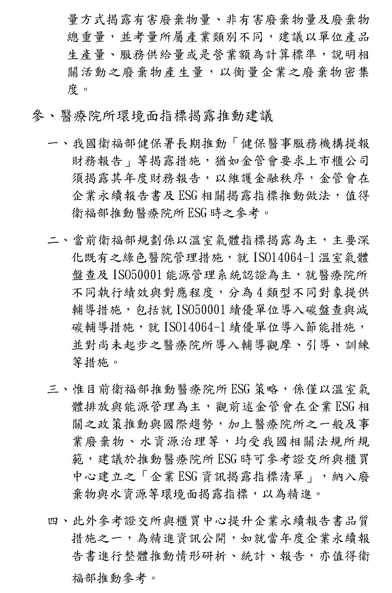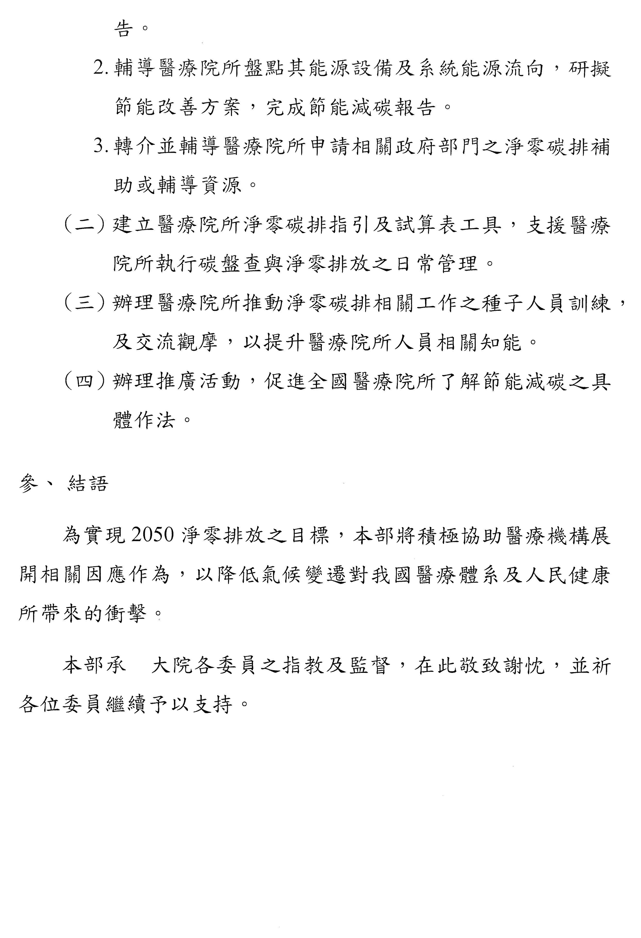 接下來我要報告有關醫療院所推動醫療ESG,當初我們談到有關淨零排放的推動,在醫療院所這一塊的確沒有被納入,在上一次大院的會議當中,希望衛福部跟環境部能夠積極推動醫療院所ESG的服務,我們覺得現階段可以做的就是金管會要求上市櫃公司都一定要做永續報告書的部分,他們必須對於整個醫療院所能量的使用以及廢棄物的處理,在永續報告書中能夠做清楚的交代。我想這就是第一步,未來在醫療院所,環境部可以提供協助的部分,希望未來衛福部在這一塊也可以告知醫療院所,我們共同來推動永續報告書的撰寫,讓醫療院所可以對淨零排放這一塊有初步的盤點,接下來我們就可以按照國家整體的淨零排放路徑,大家共同來推動,朝向2050淨零排放的目的。