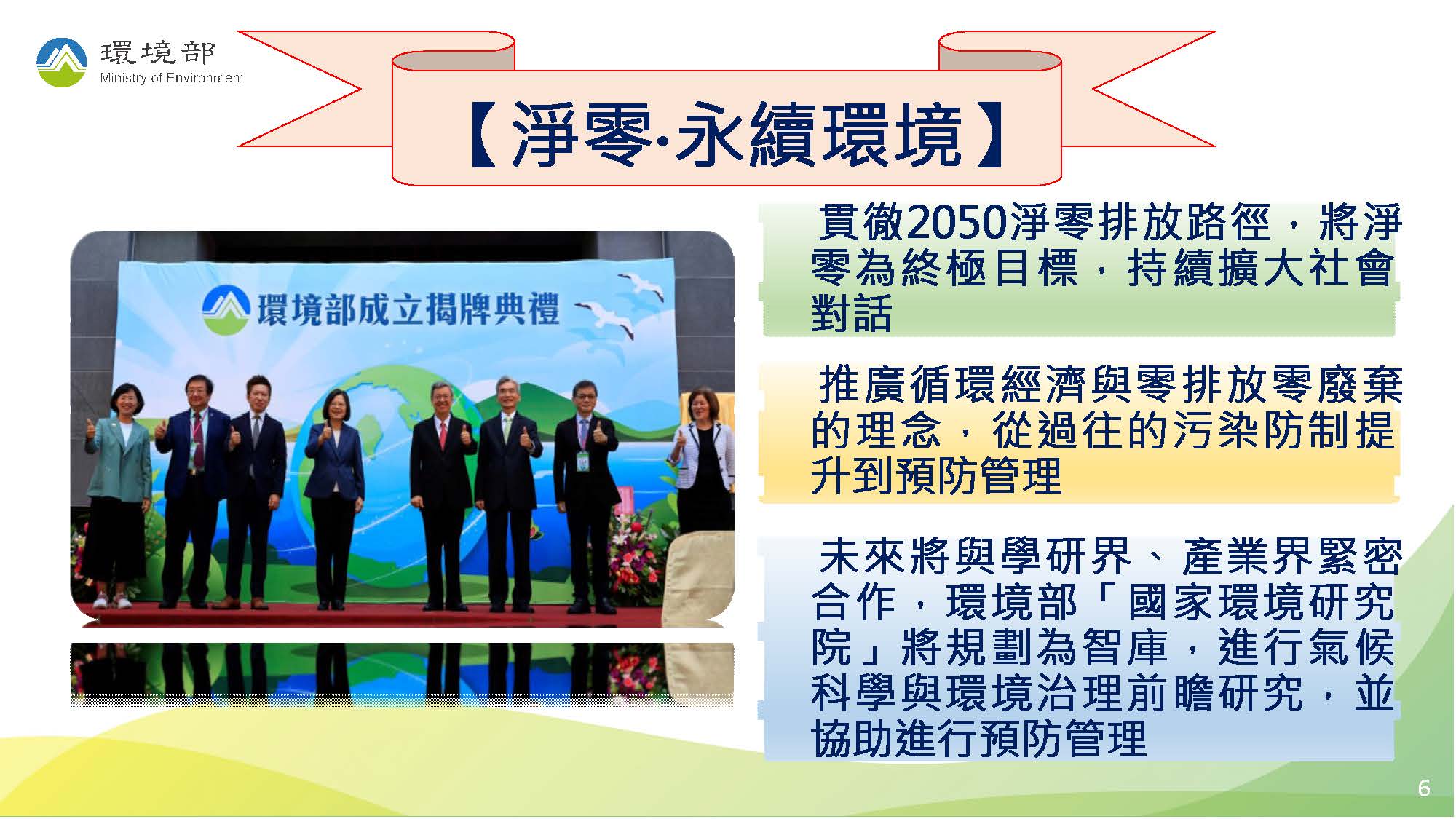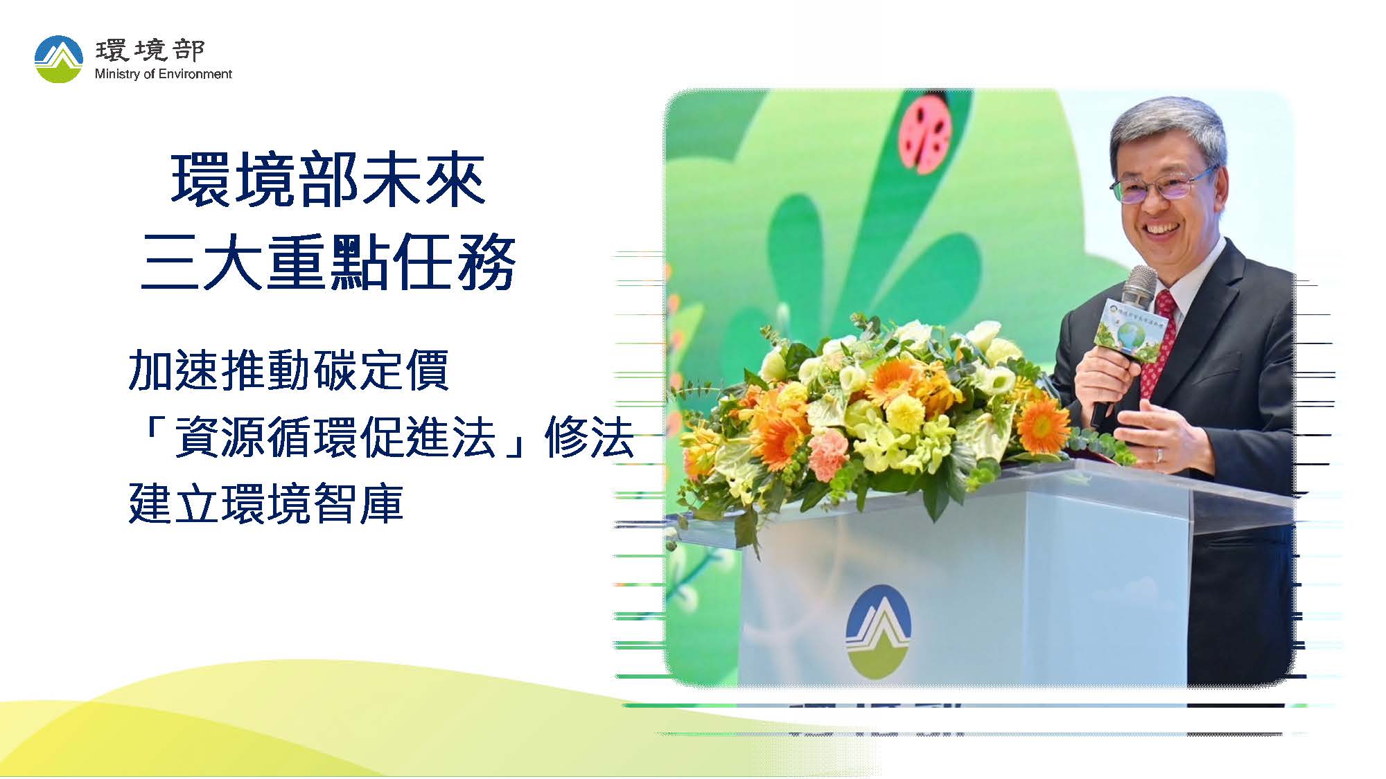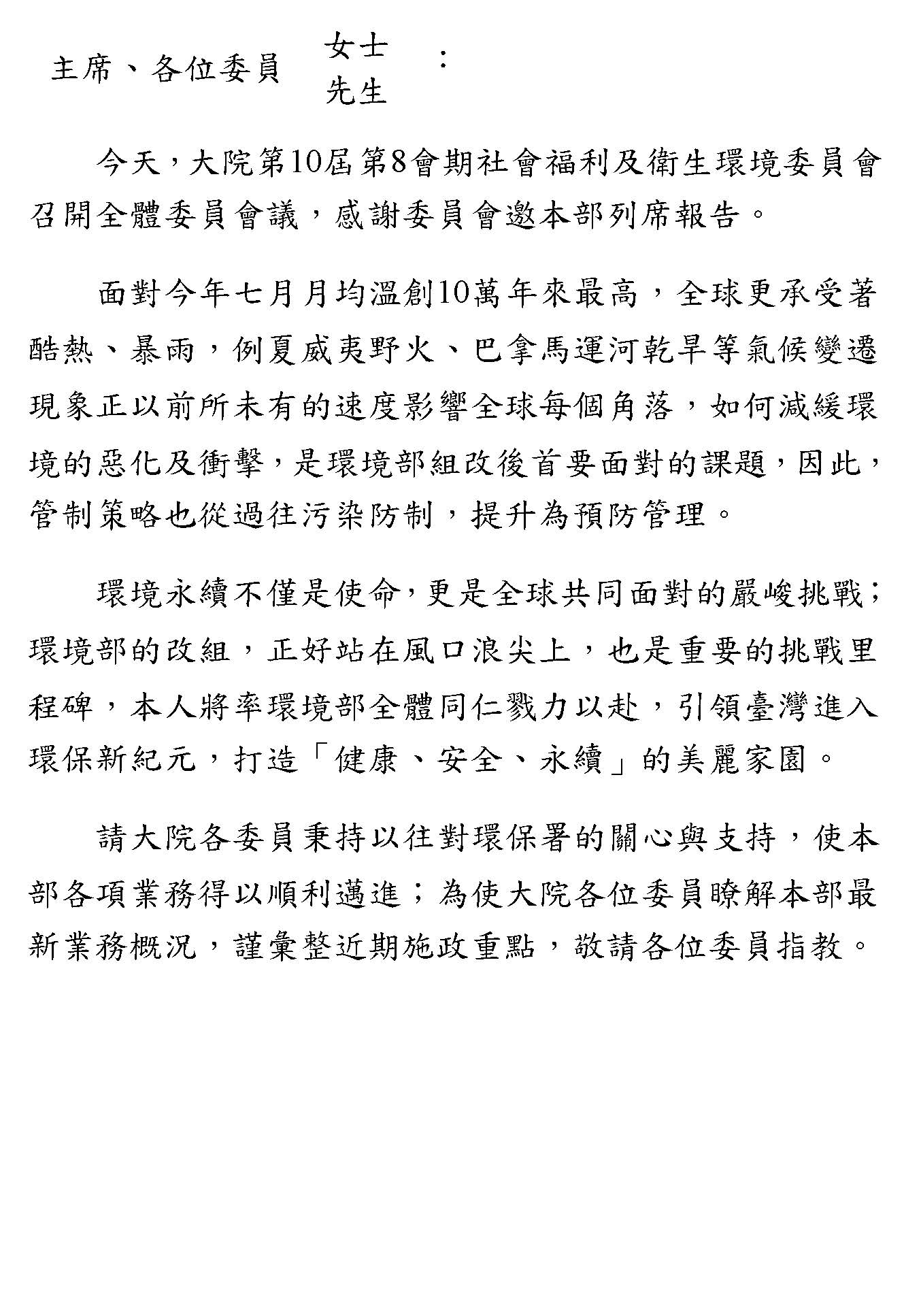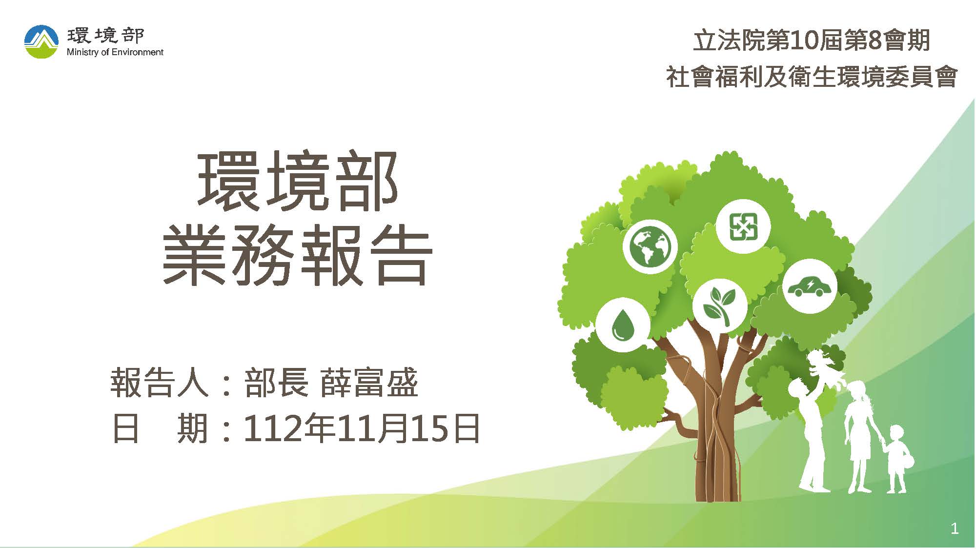 薛部長富盛:主席、各位委員,以及各位女士、各位先生。環境部就環境部業務作簡短報告,環境部在今年8月22號由環保署升格為環境部,包括蔡總統、包括陳院長,對環境部都有很高的期許,特別是針對三大重要的任務,包括氣候變遷的議題,臺灣要跟國際同步,另外就是在資源循環的部分,我們希望未來可以達到零廢棄的目的,也新增設了國家環境研究院,希望可以成為環境部未來推動整個臺灣環境治理的一個智庫。