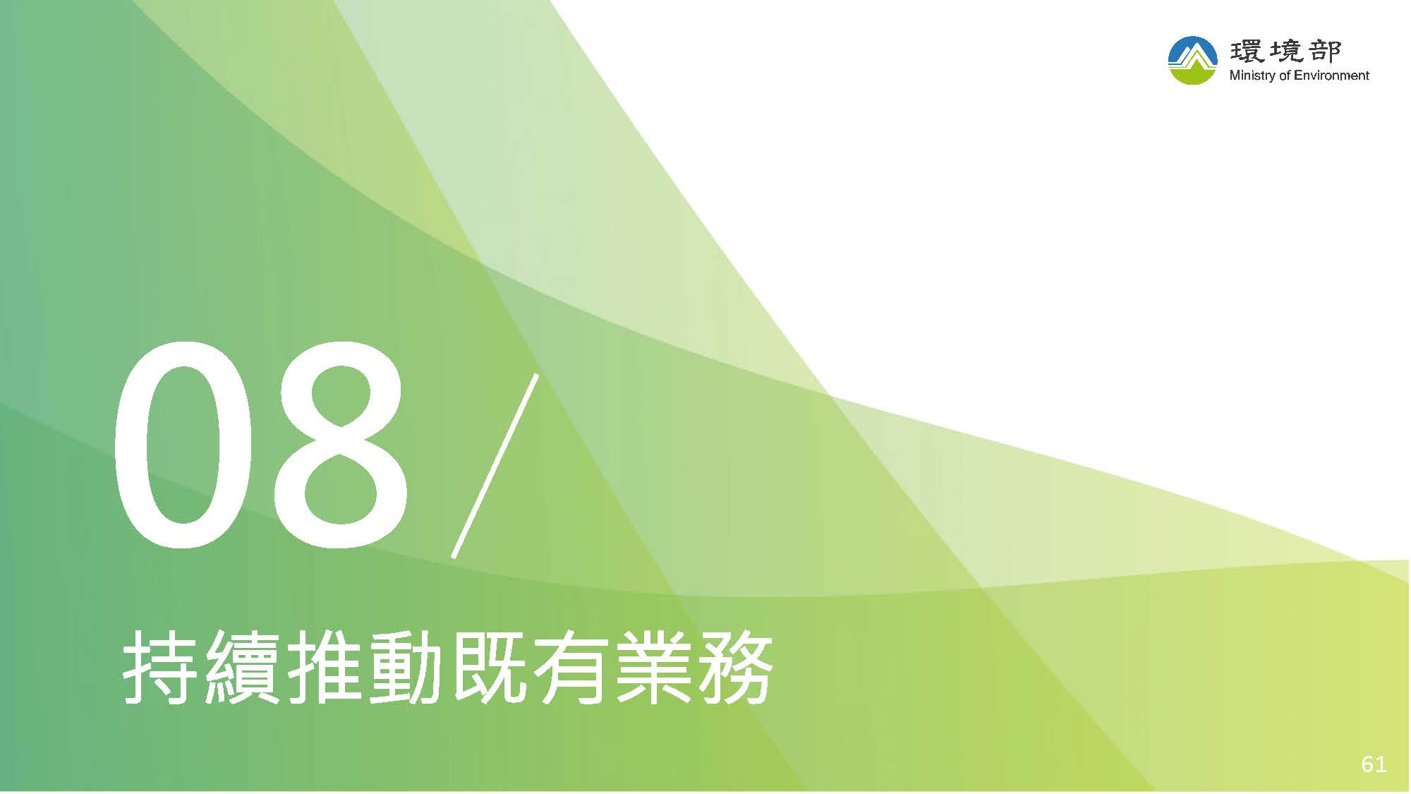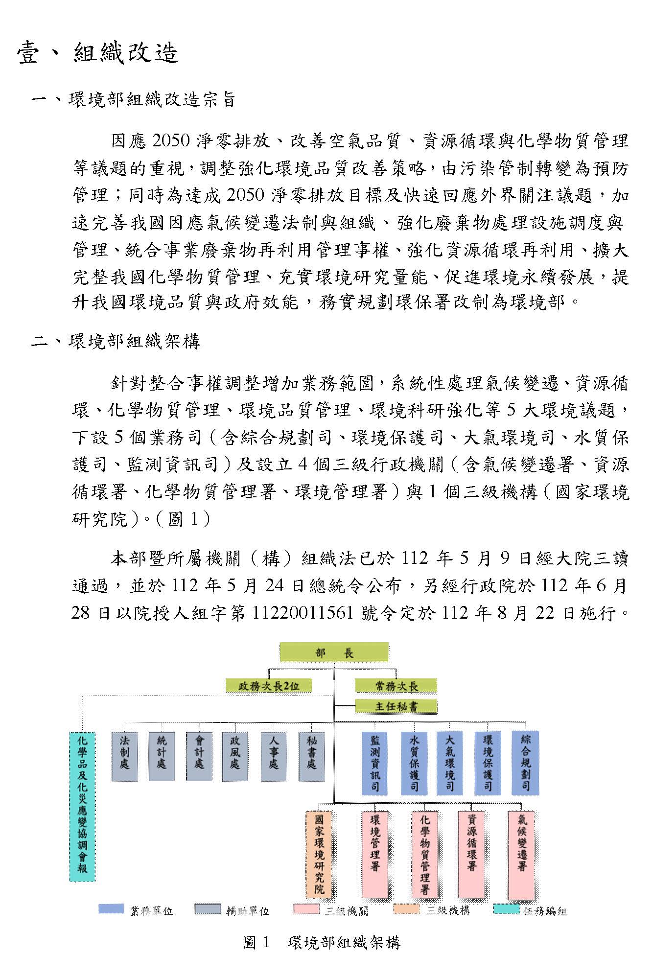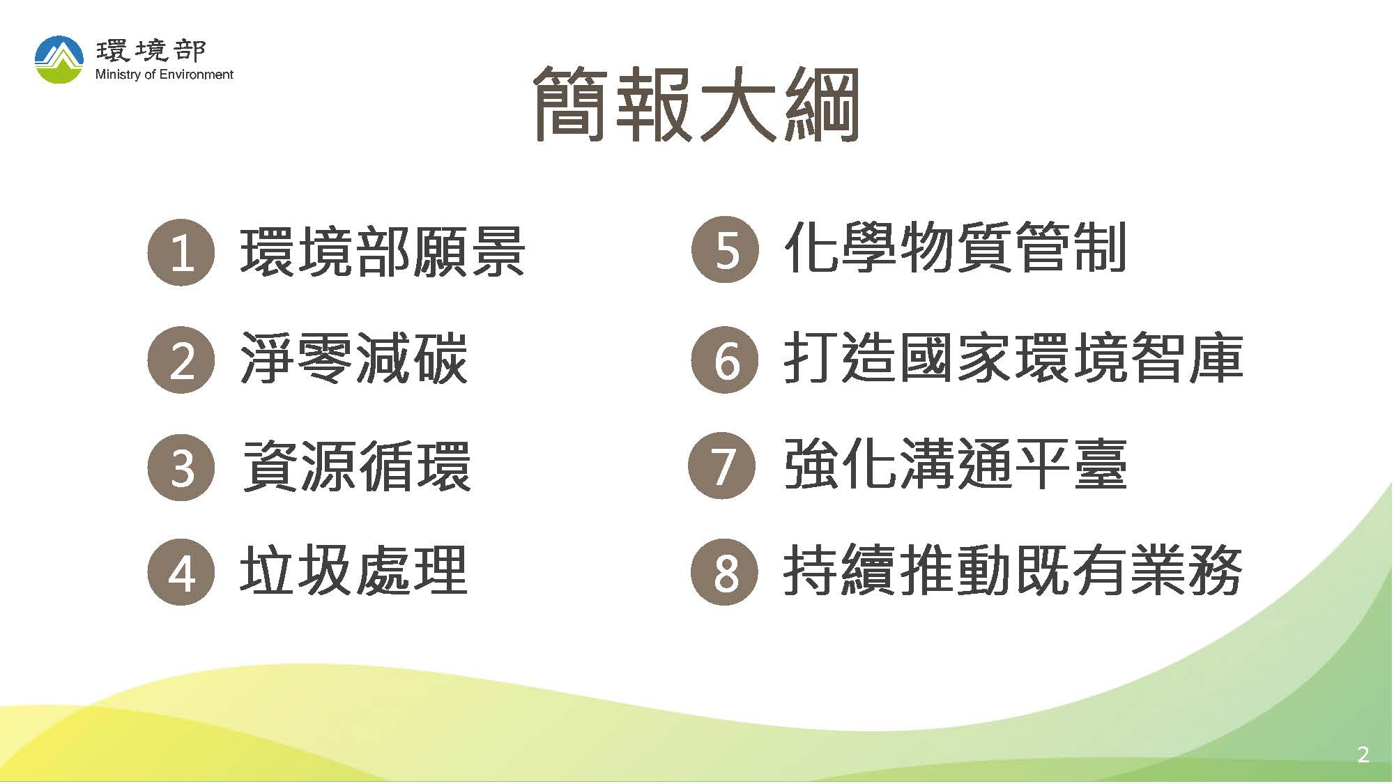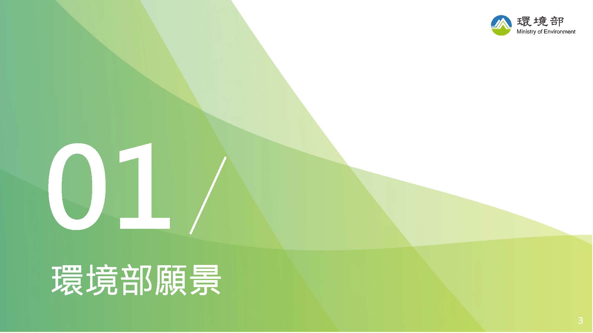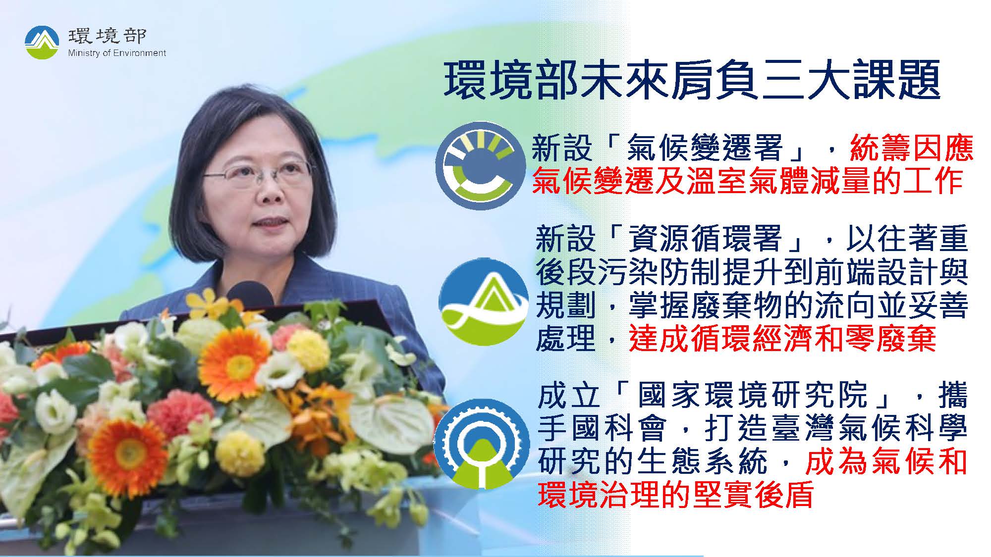 薛部長富盛:主席、各位委員,以及各位女士、各位先生。環境部就環境部業務作簡短報告,環境部在今年8月22號由環保署升格為環境部,包括蔡總統、包括陳院長,對環境部都有很高的期許,特別是針對三大重要的任務,包括氣候變遷的議題,臺灣要跟國際同步,另外就是在資源循環的部分,我們希望未來可以達到零廢棄的目的,也新增設了國家環境研究院,希望可以成為環境部未來推動整個臺灣環境治理的一個智庫。