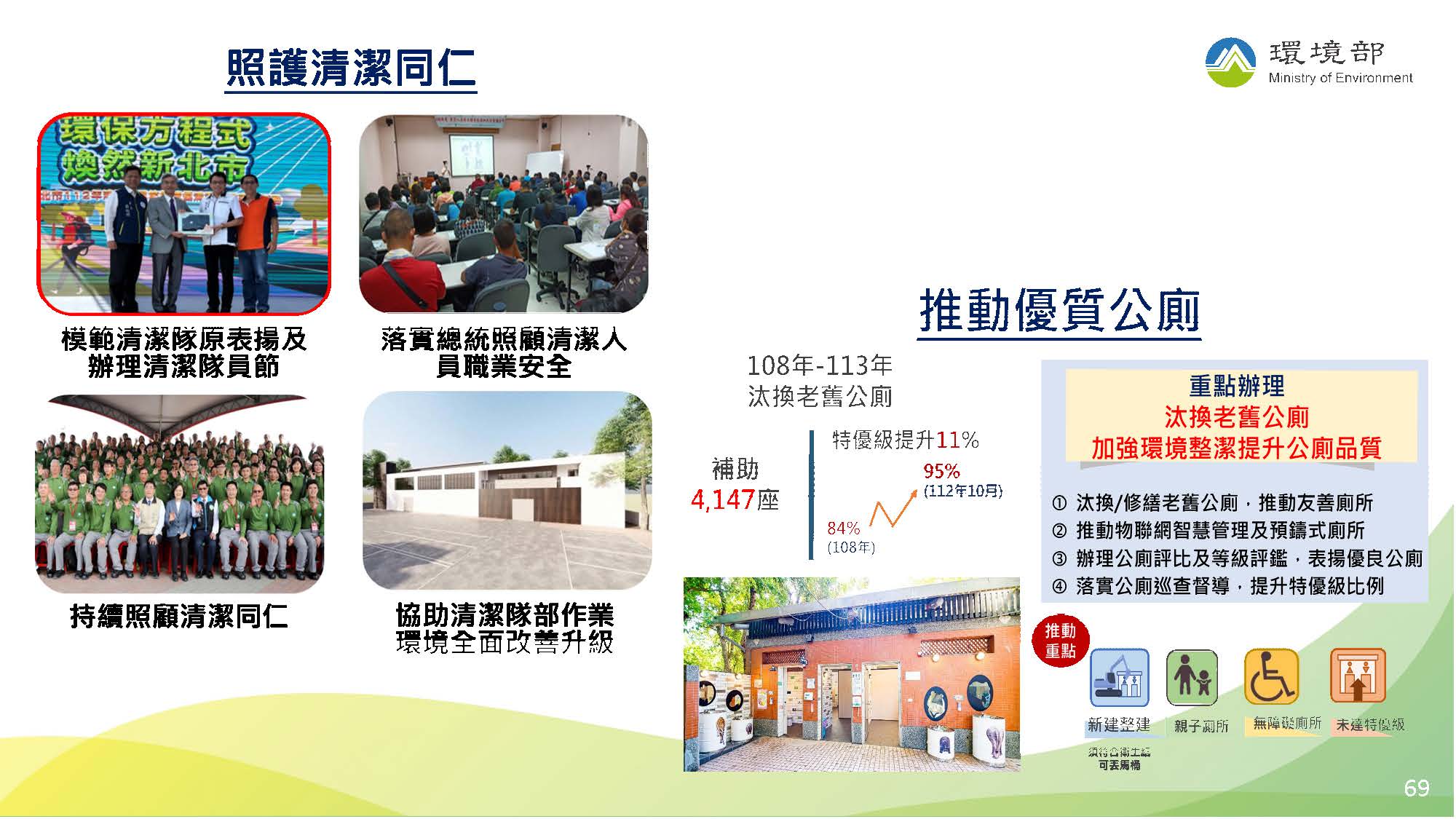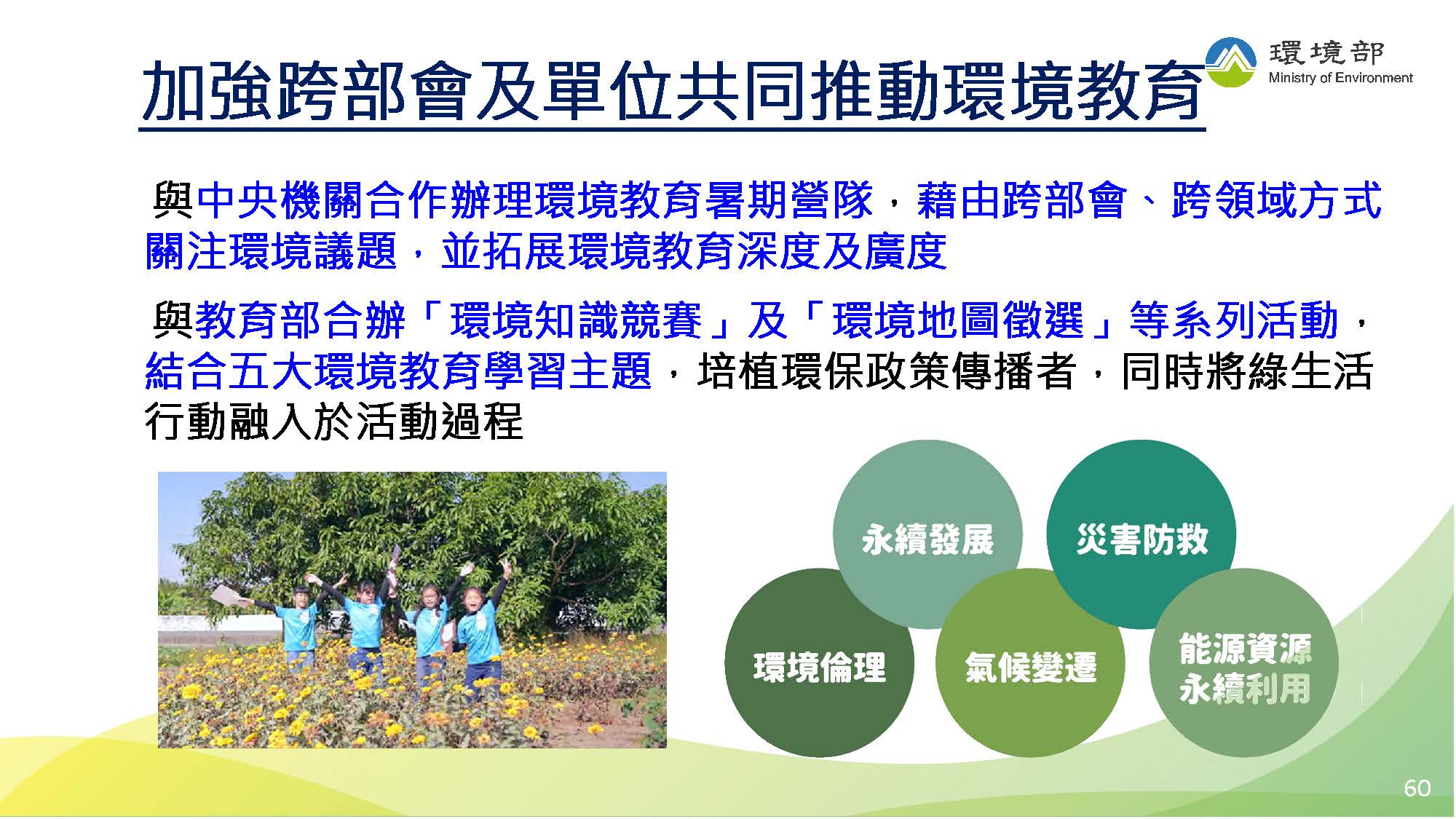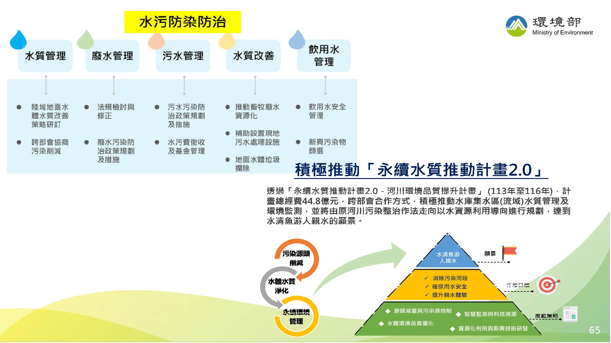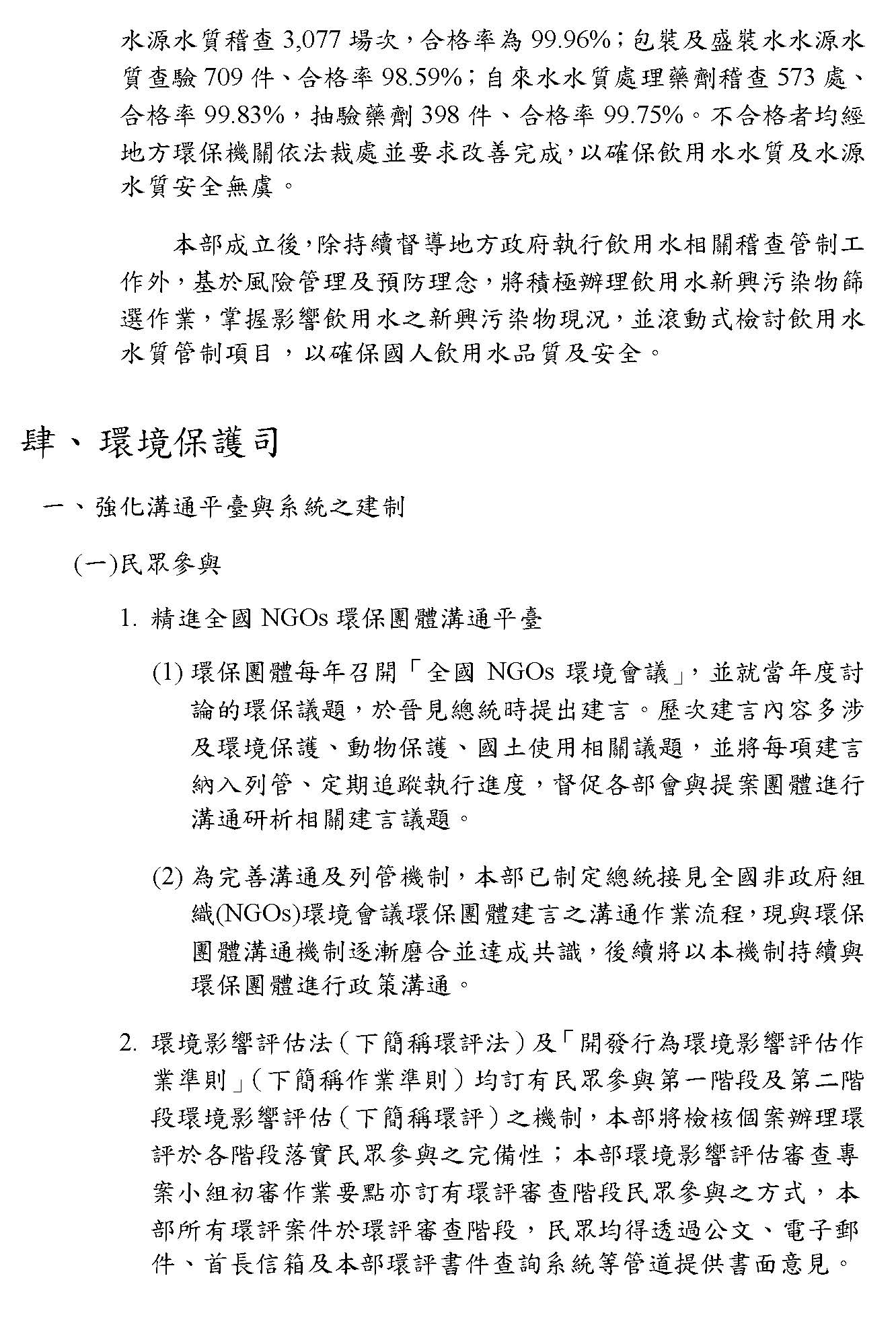 薛部長富盛:主席、各位委員,以及各位女士、各位先生。環境部就環境部業務作簡短報告,環境部在今年8月22號由環保署升格為環境部,包括蔡總統、包括陳院長,對環境部都有很高的期許,特別是針對三大重要的任務,包括氣候變遷的議題,臺灣要跟國際同步,另外就是在資源循環的部分,我們希望未來可以達到零廢棄的目的,也新增設了國家環境研究院,希望可以成為環境部未來推動整個臺灣環境治理的一個智庫。