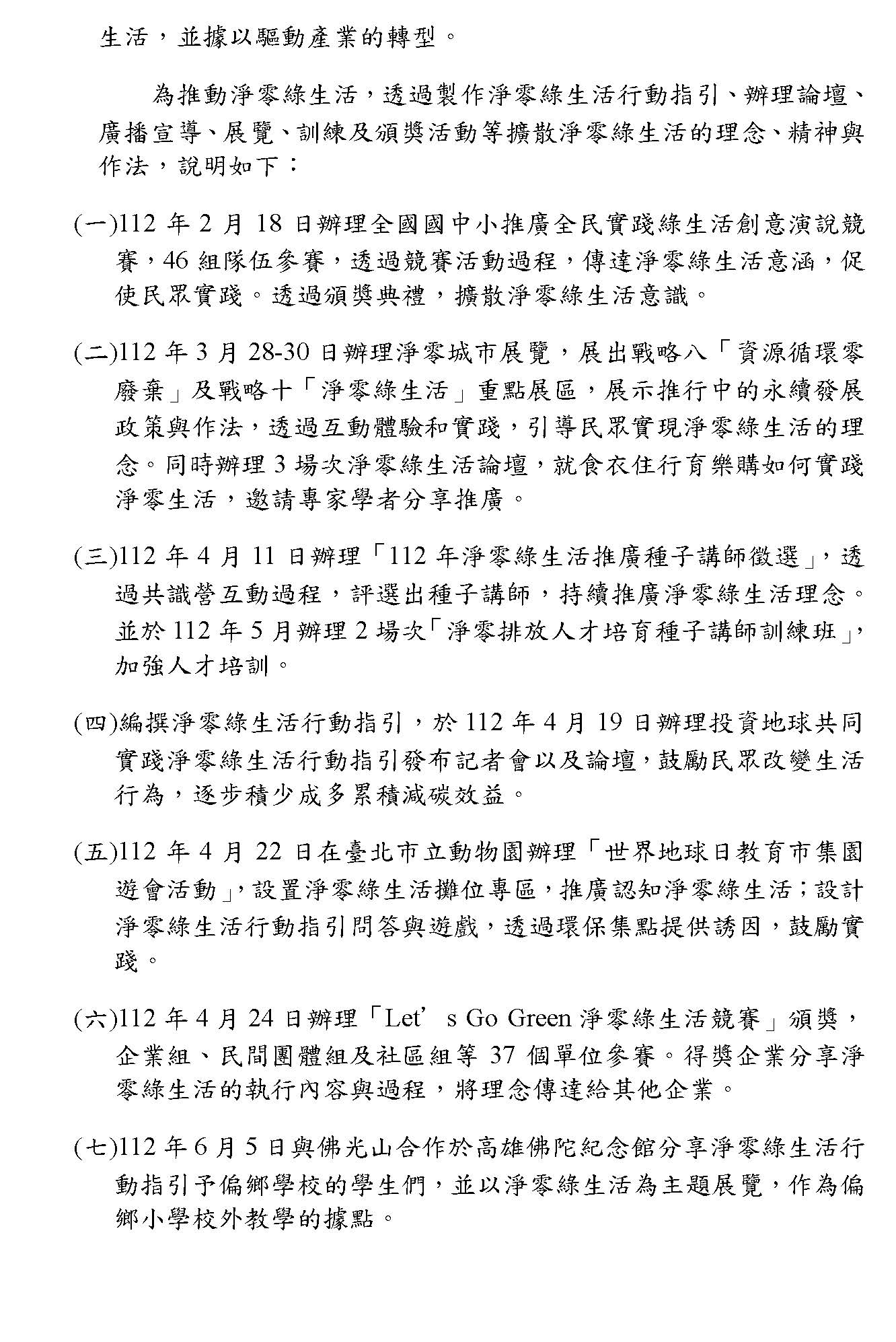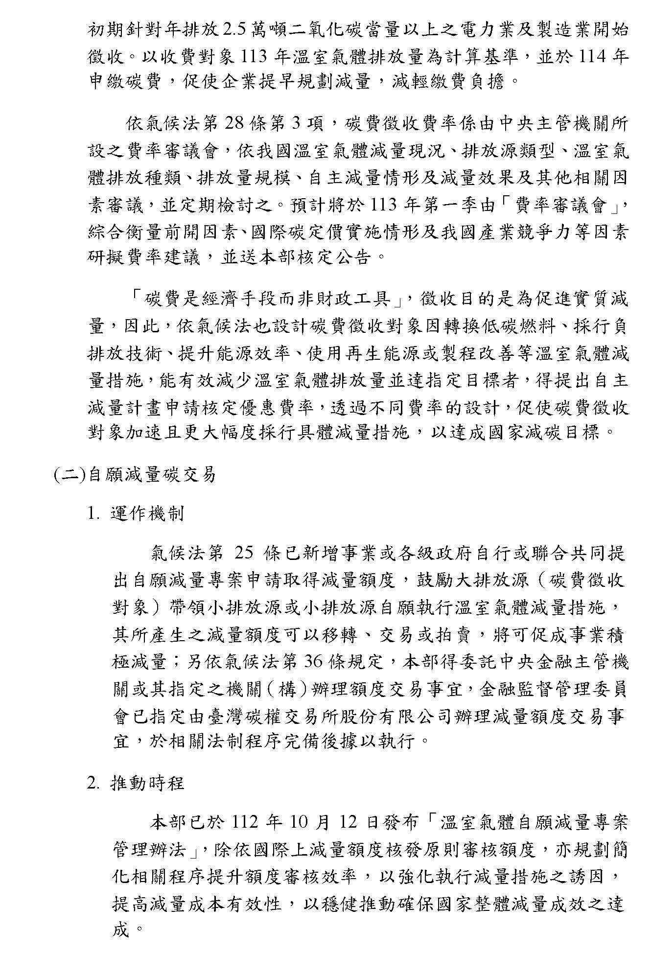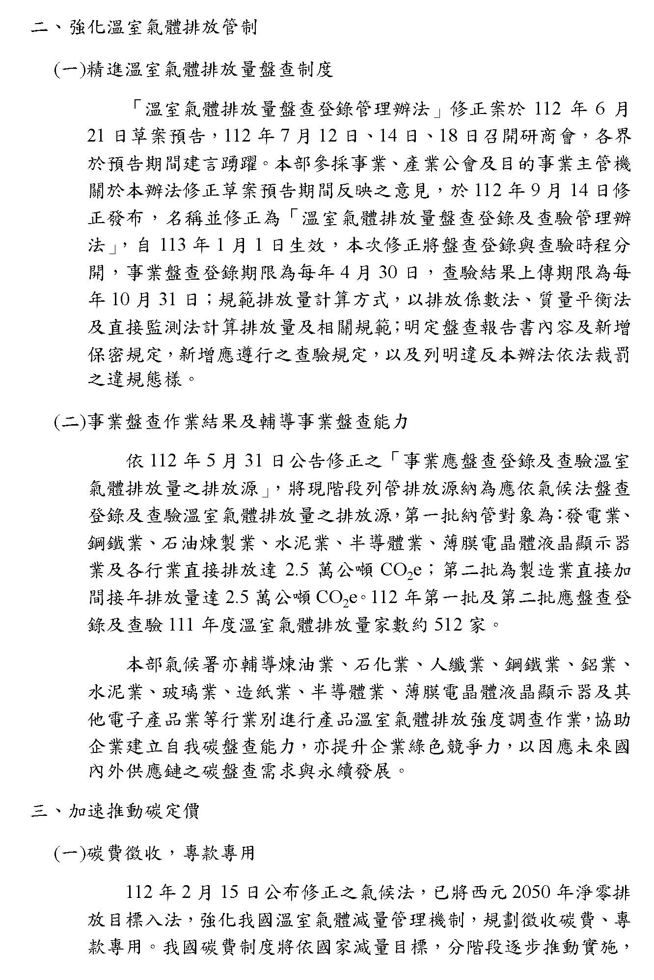 (二)行政院環境保護署函,為112年度中央政府總預算附屬單位預算決議,檢送環境保護基金決議第12項「溫室氣體排放管理」預算凍結100萬元專案報告。