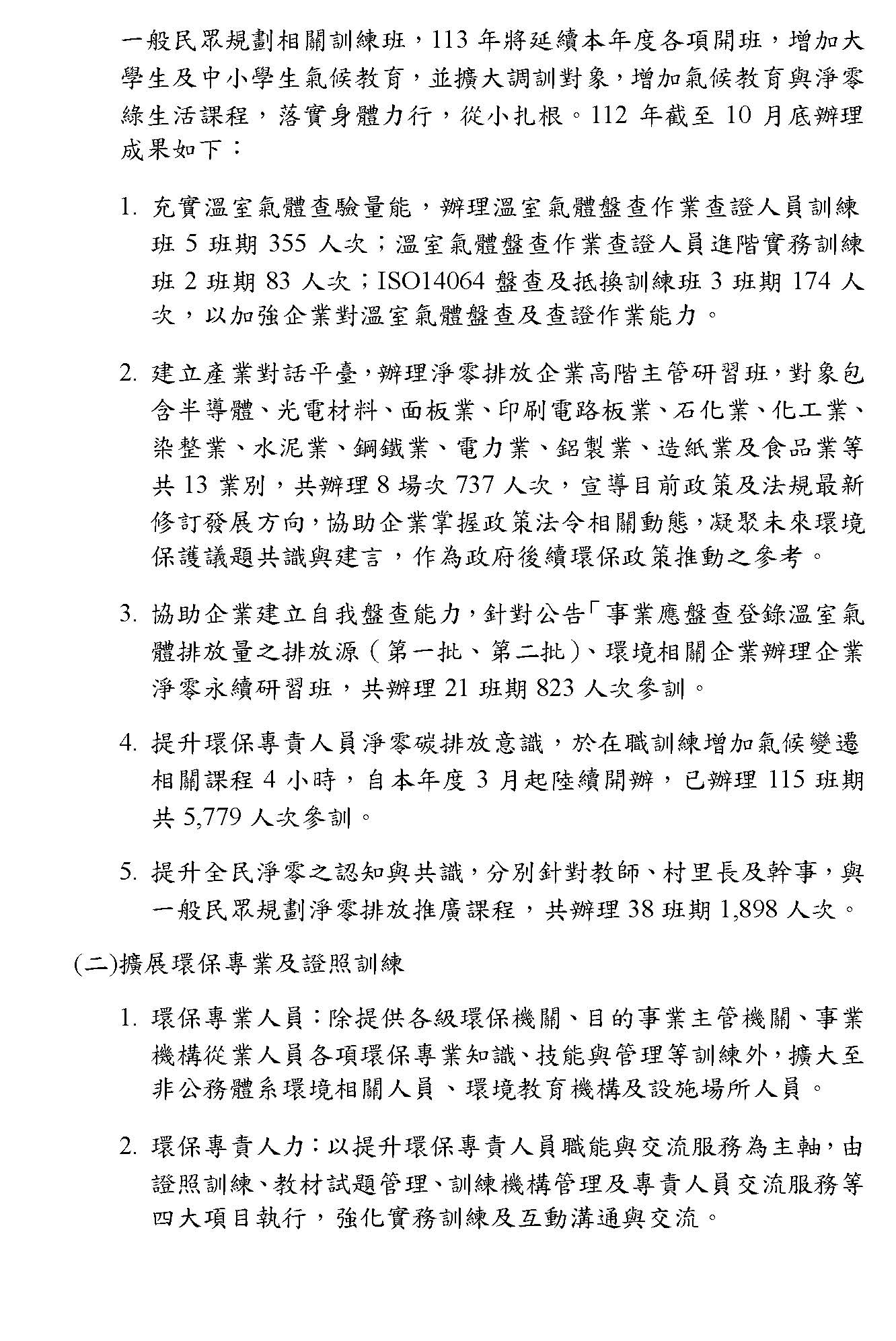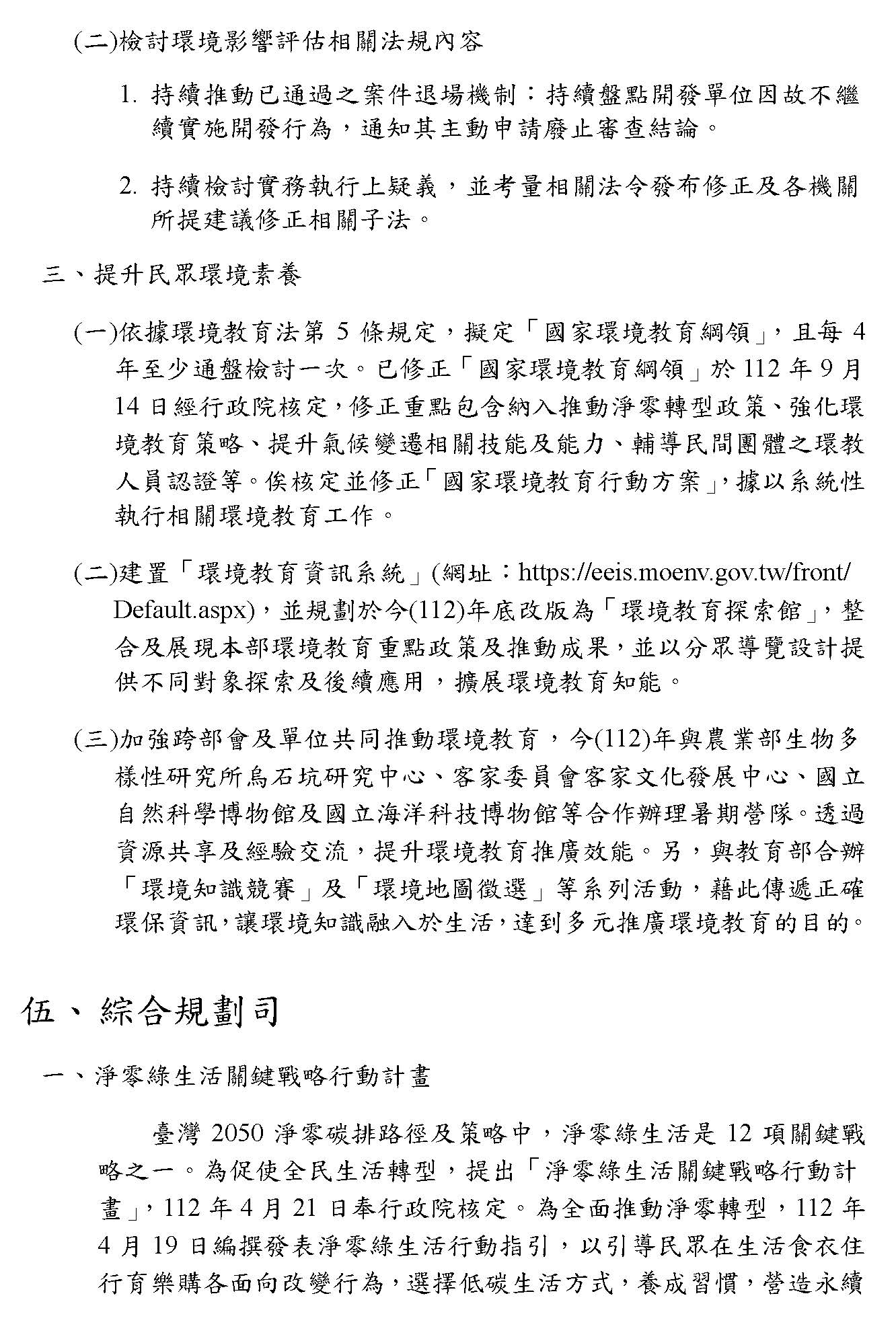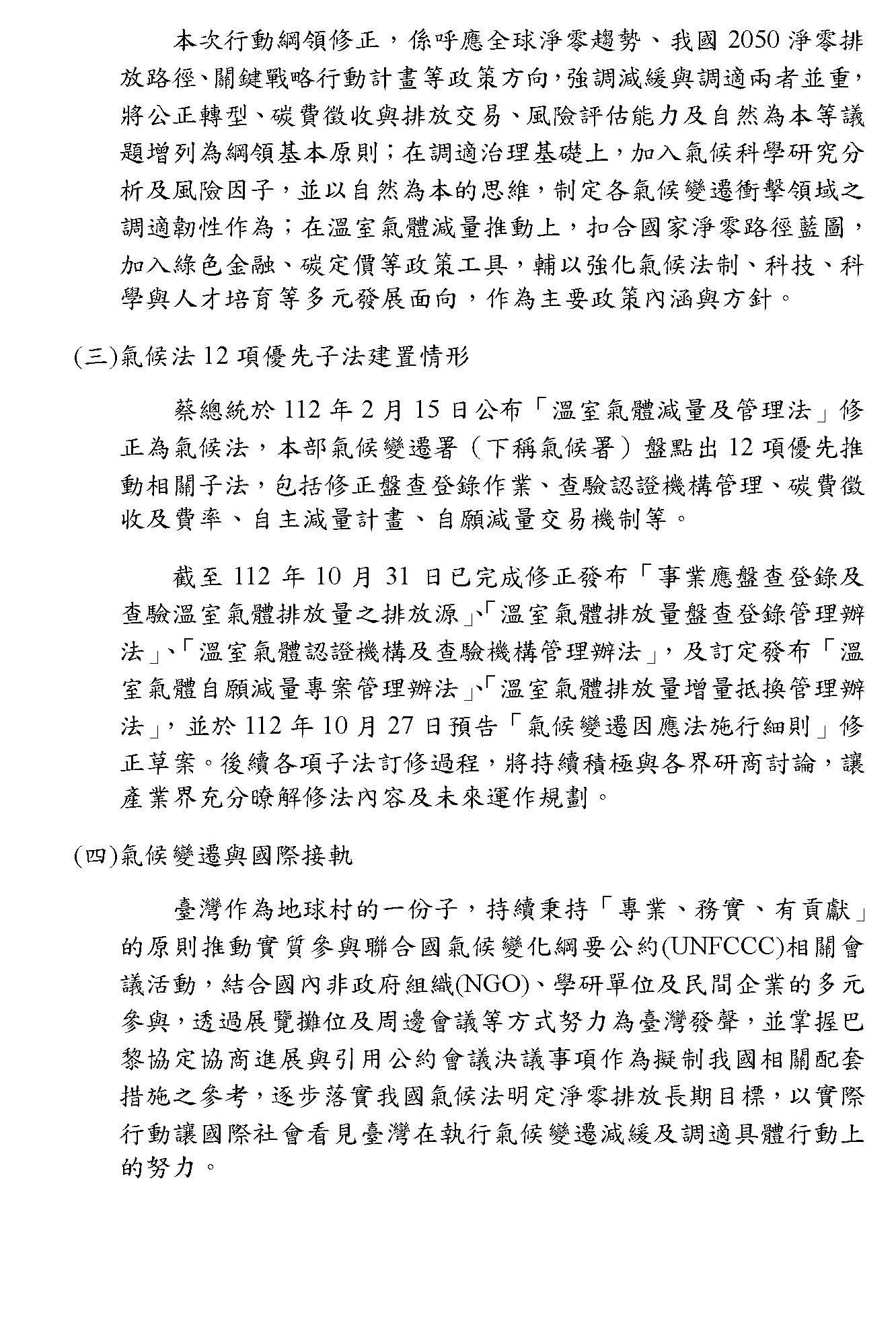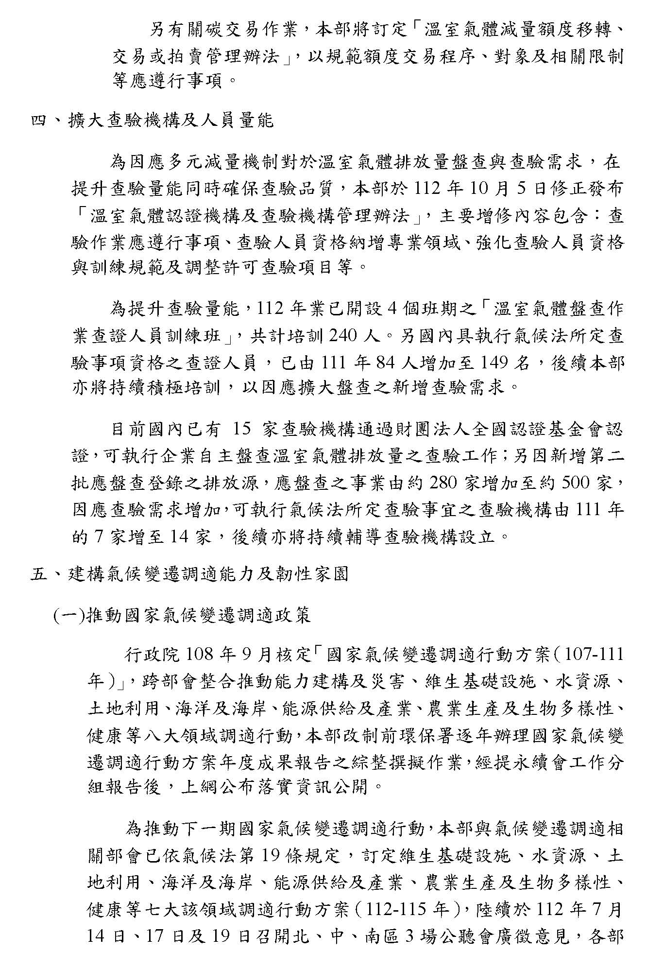 (二)行政院環境保護署函,為112年度中央政府總預算附屬單位預算決議,檢送環境保護基金決議第12項「溫室氣體排放管理」預算凍結100萬元專案報告。
